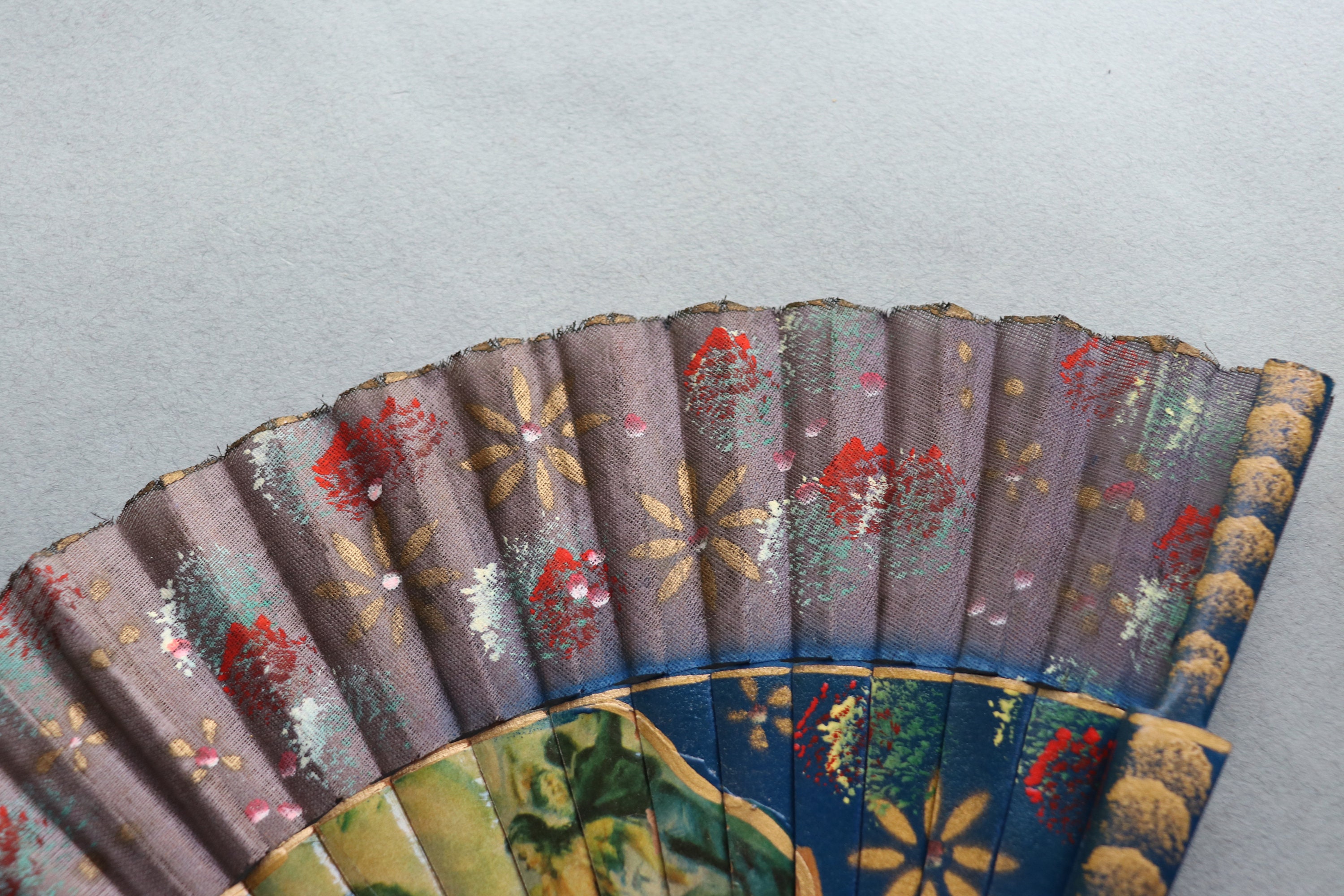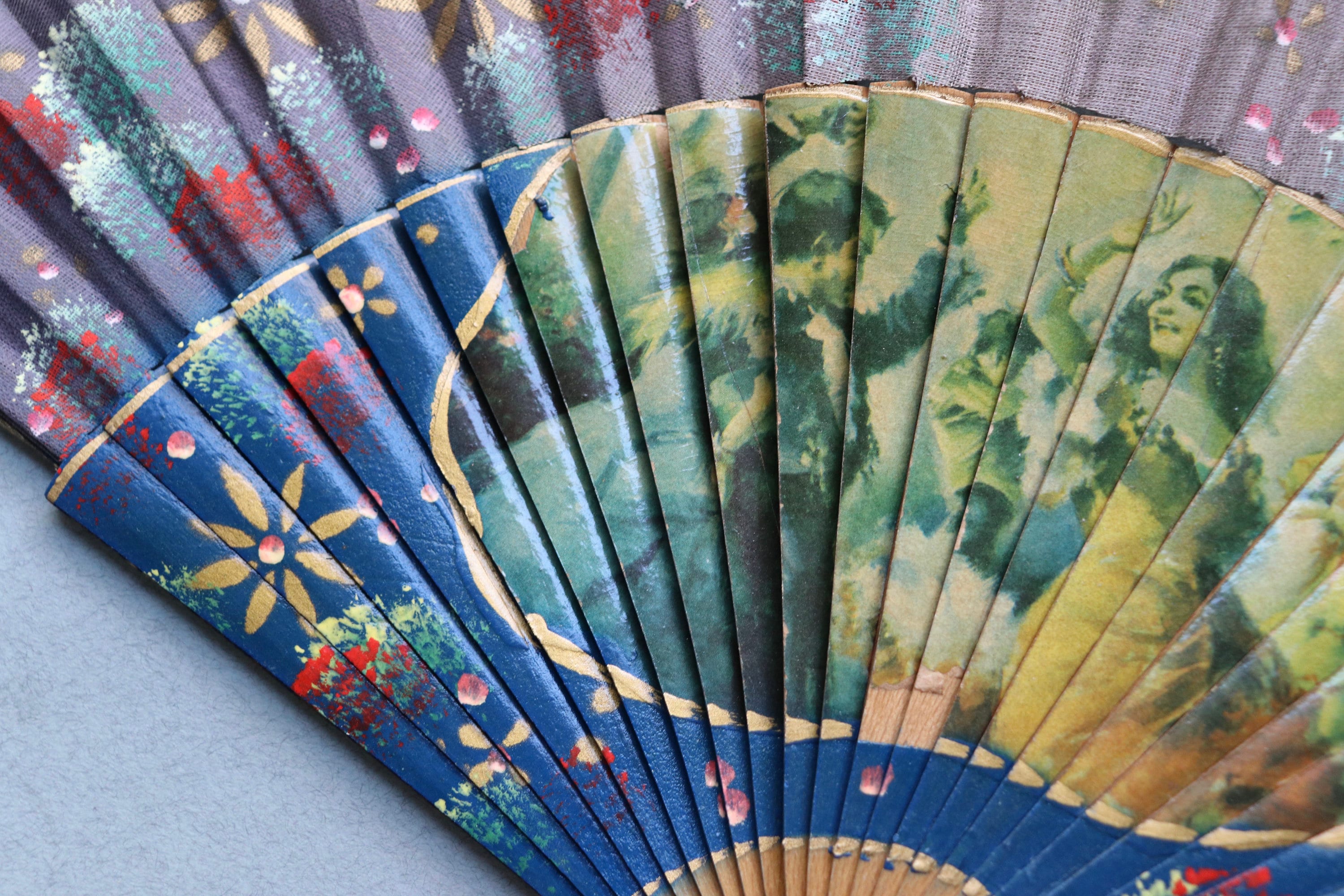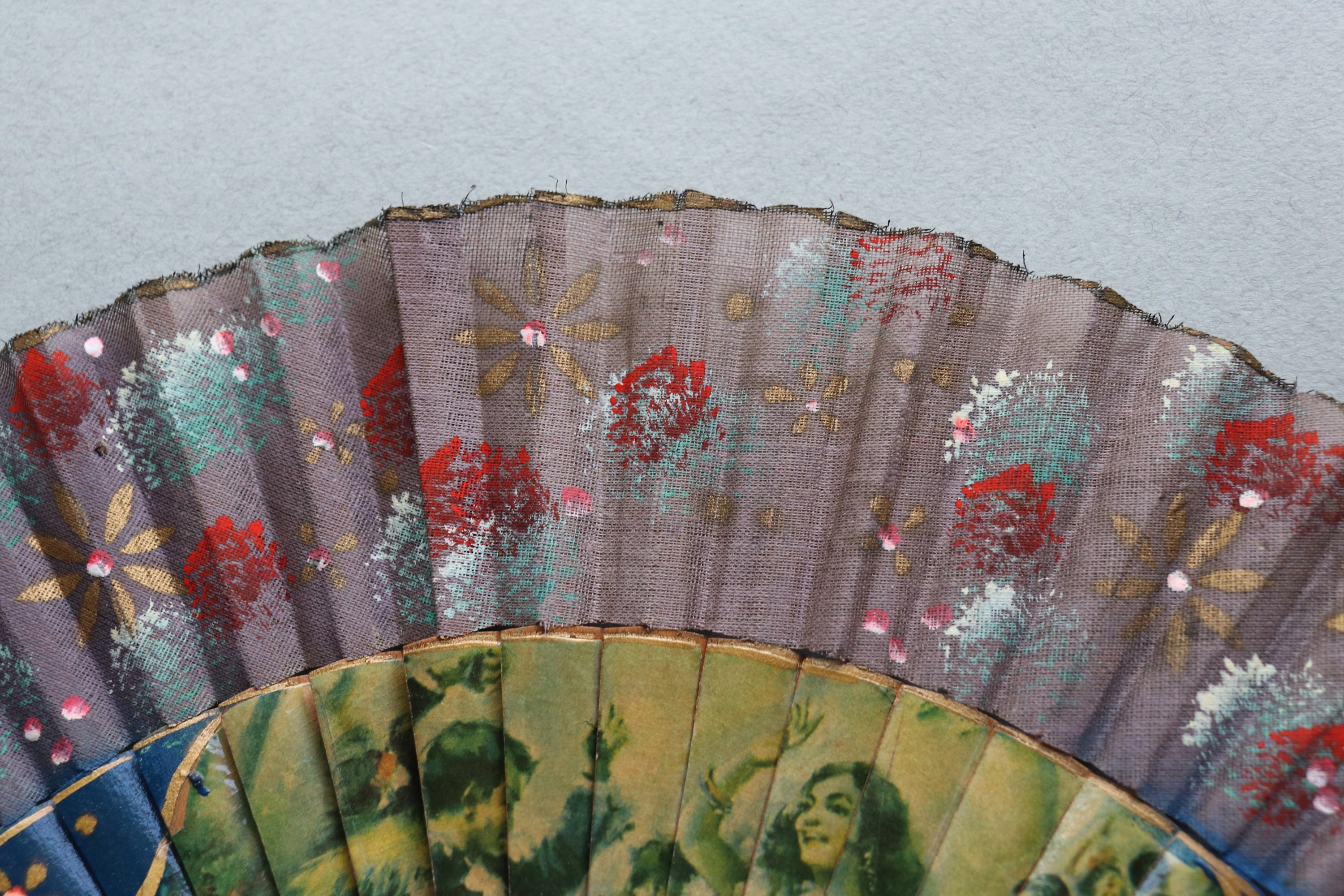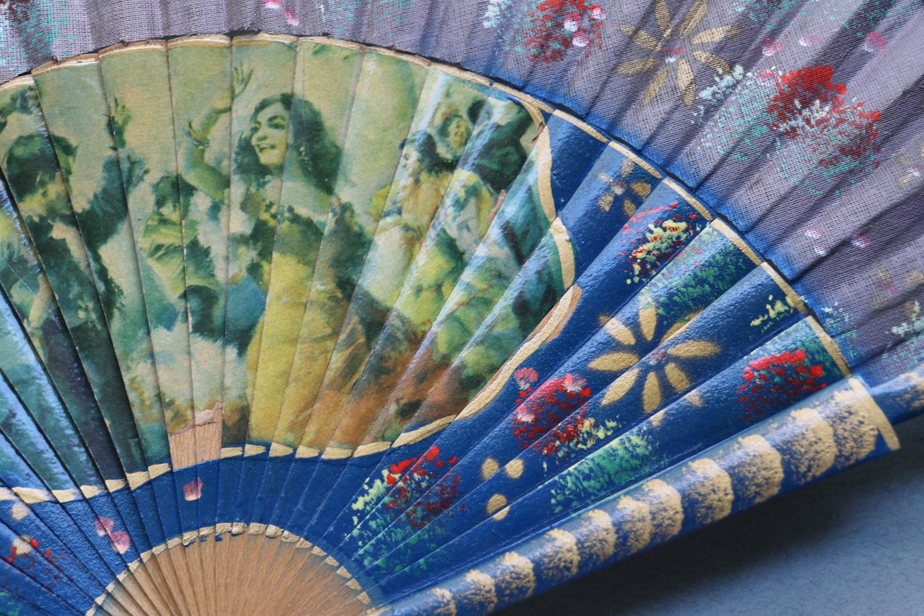 This vintage fan from Spain measures 16" end to end when open and a tad over 9" in length when closed. It is comprised of wood with decoupaged images on the front depicting dancing. There is a hand-painted floral pattern on the ribs of the fan as well as the leaf portion (the fabric at the tips of the ribs) on the front of the fan.