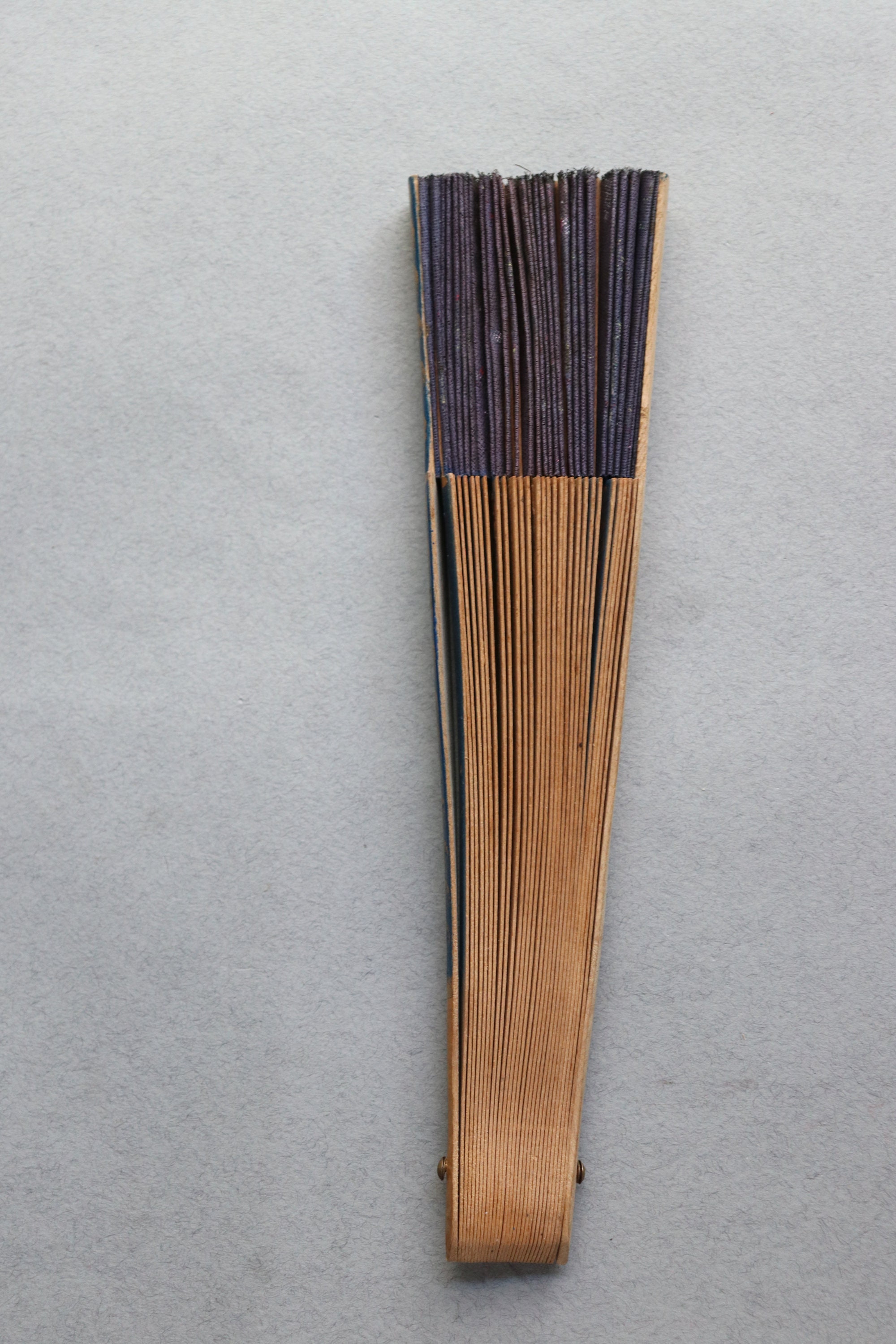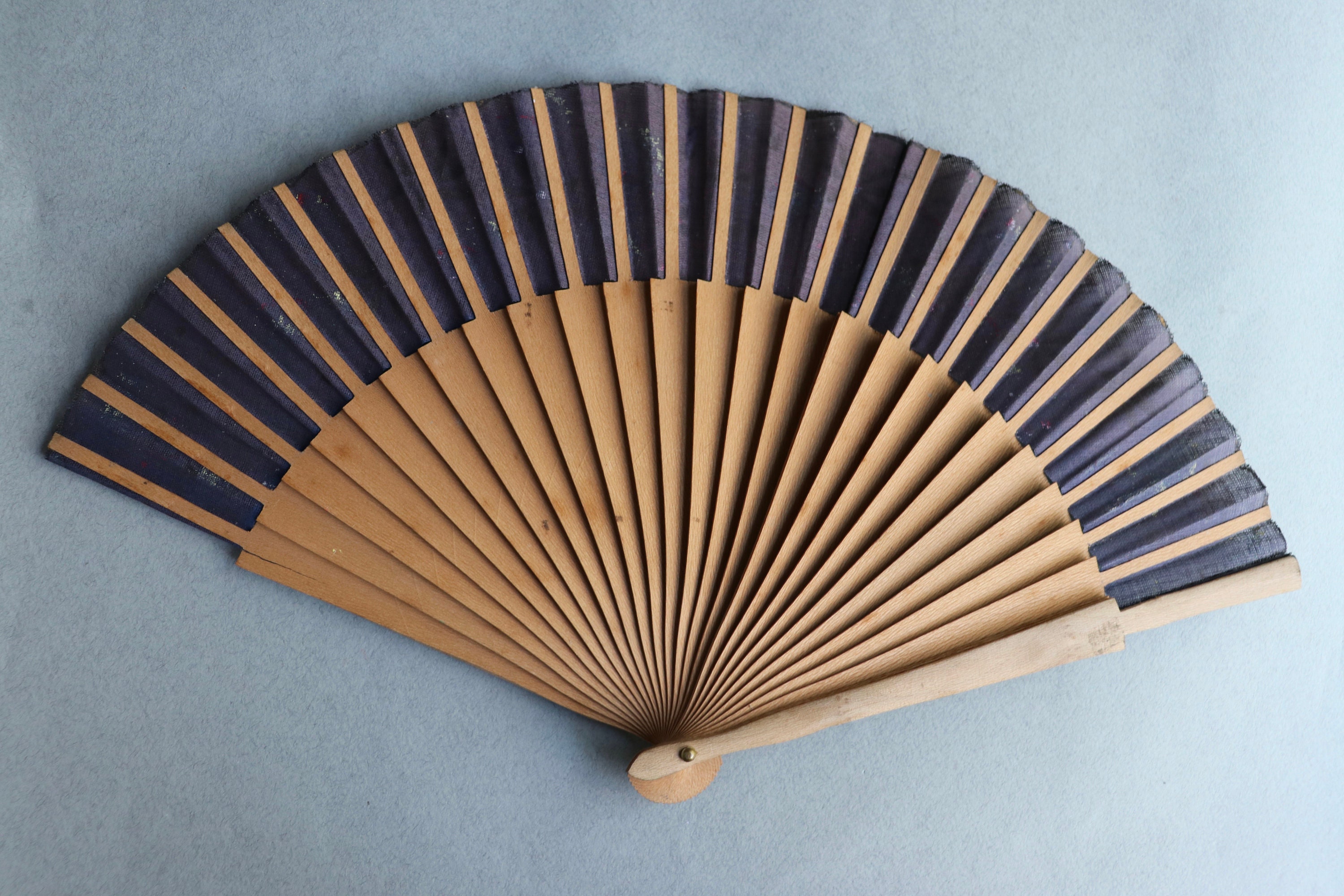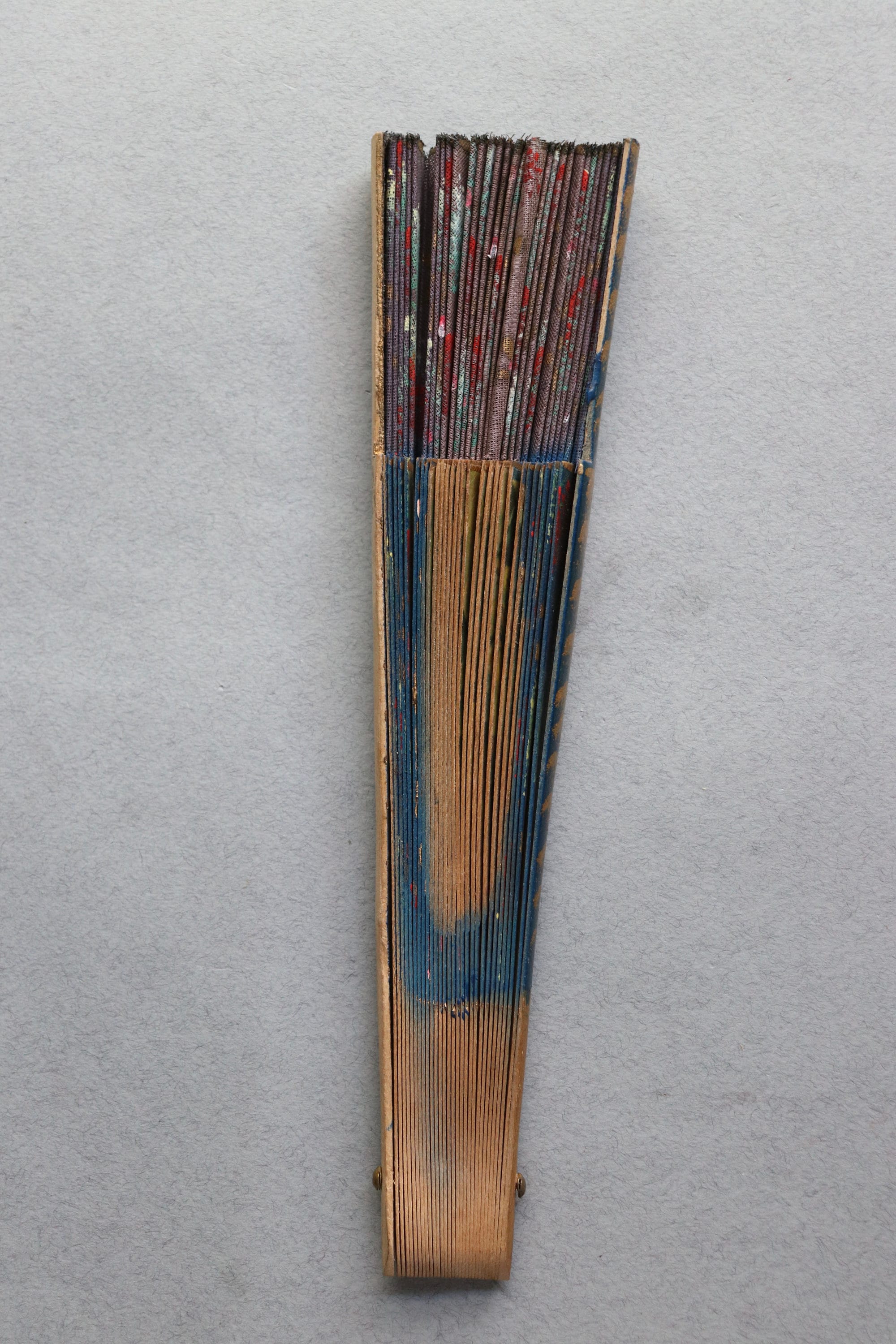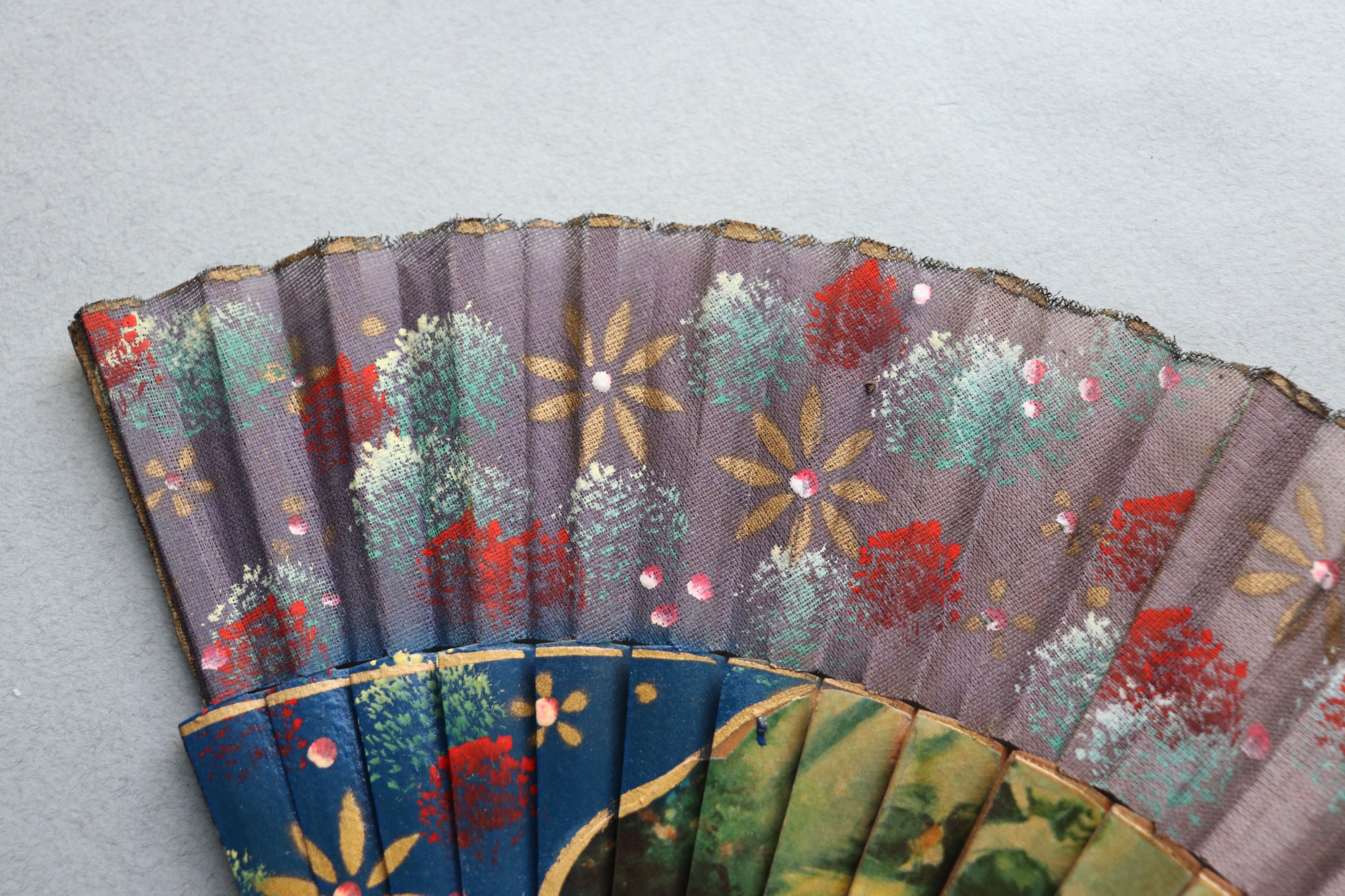 This vintage fan from Spain measures 16" end to end when open and a tad over 9" in length when closed. It is comprised of wood with decoupaged images on the front depicting dancing. There is a hand-painted floral pattern on the ribs of the fan as well as the leaf portion (the fabric at the tips of the ribs) on the front of the fan.