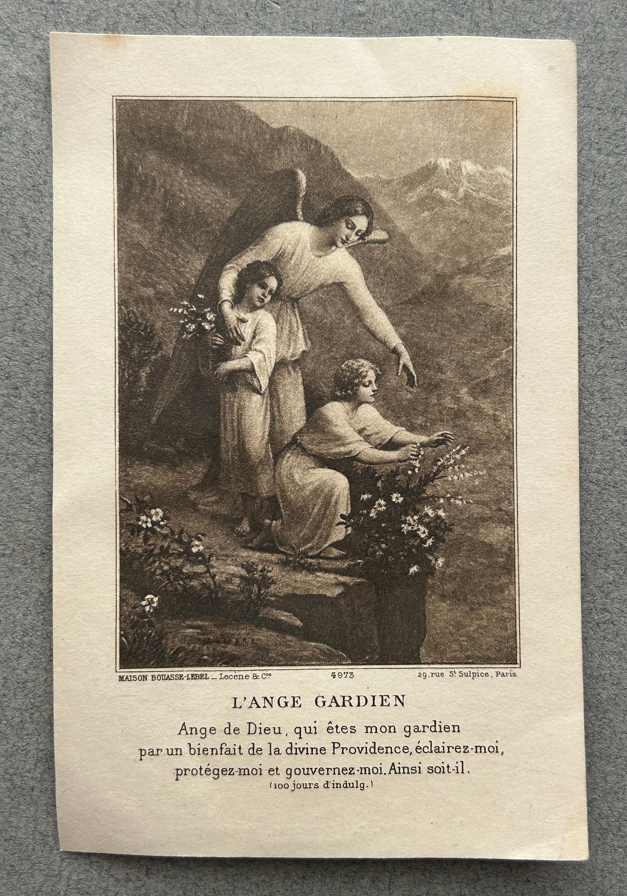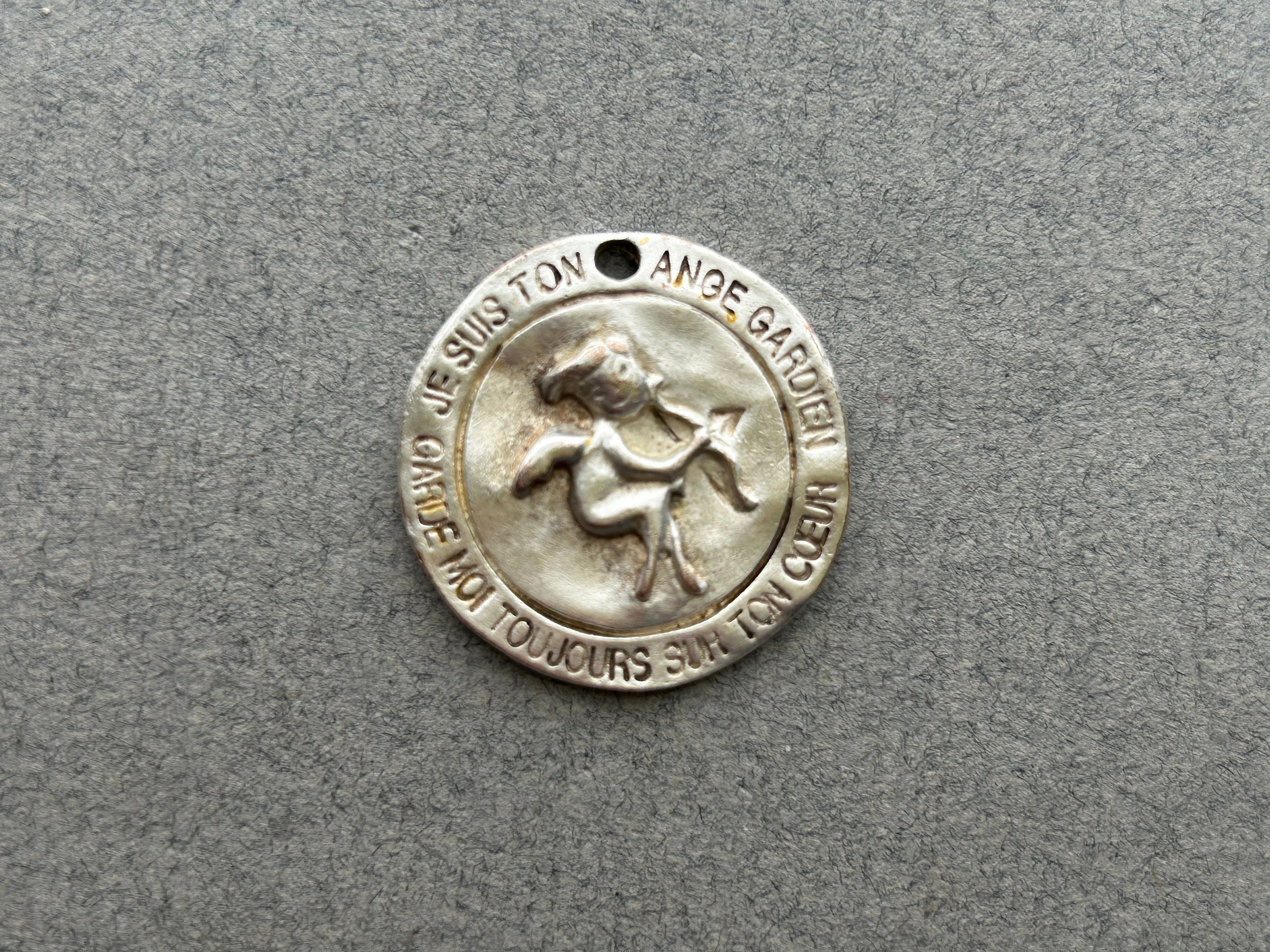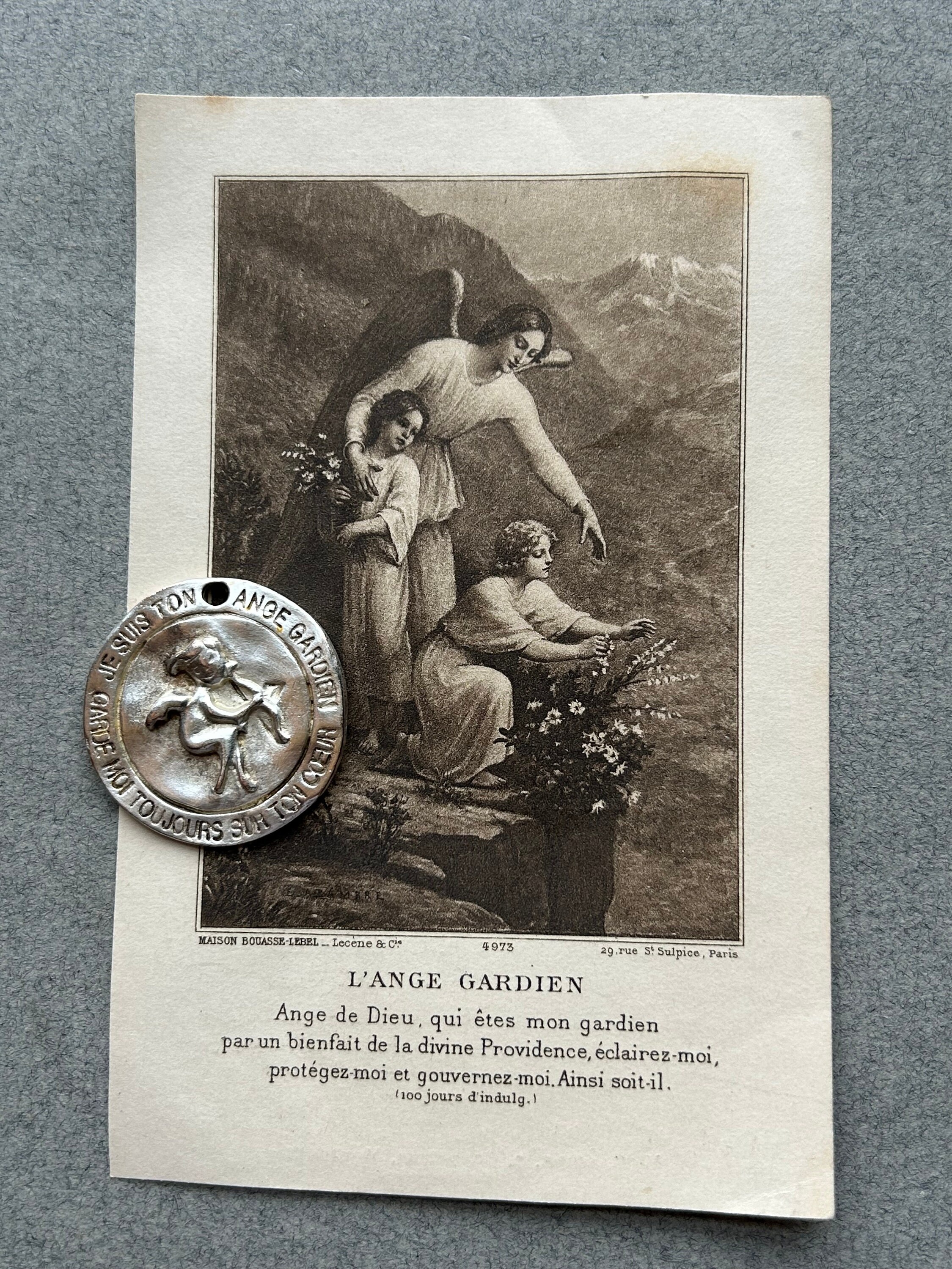 This listing is for both items: a vintage, guardian angel medal by Biche de Bere of Paris and an antique, French guardian angel holy card dated 1916 on the reverse.