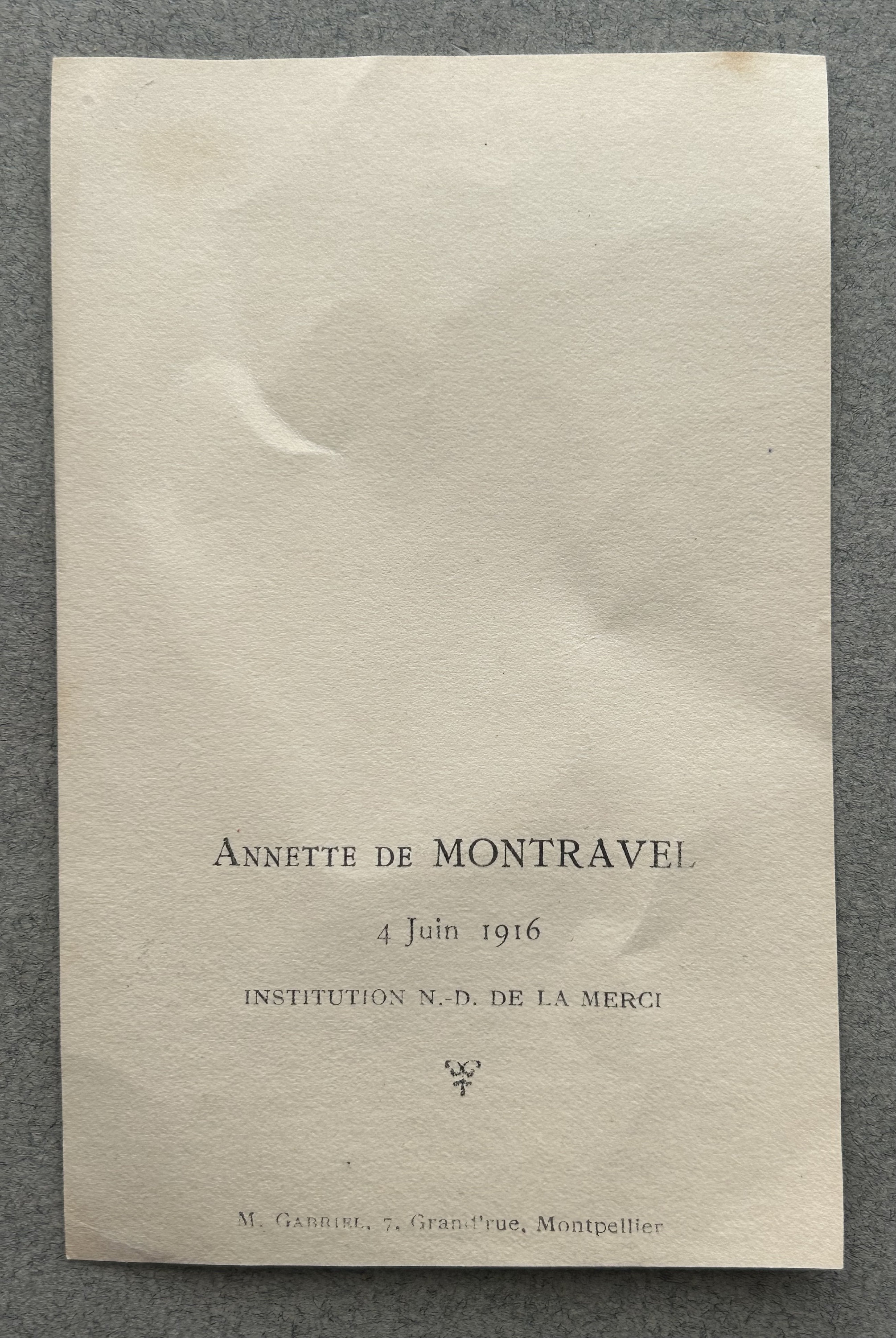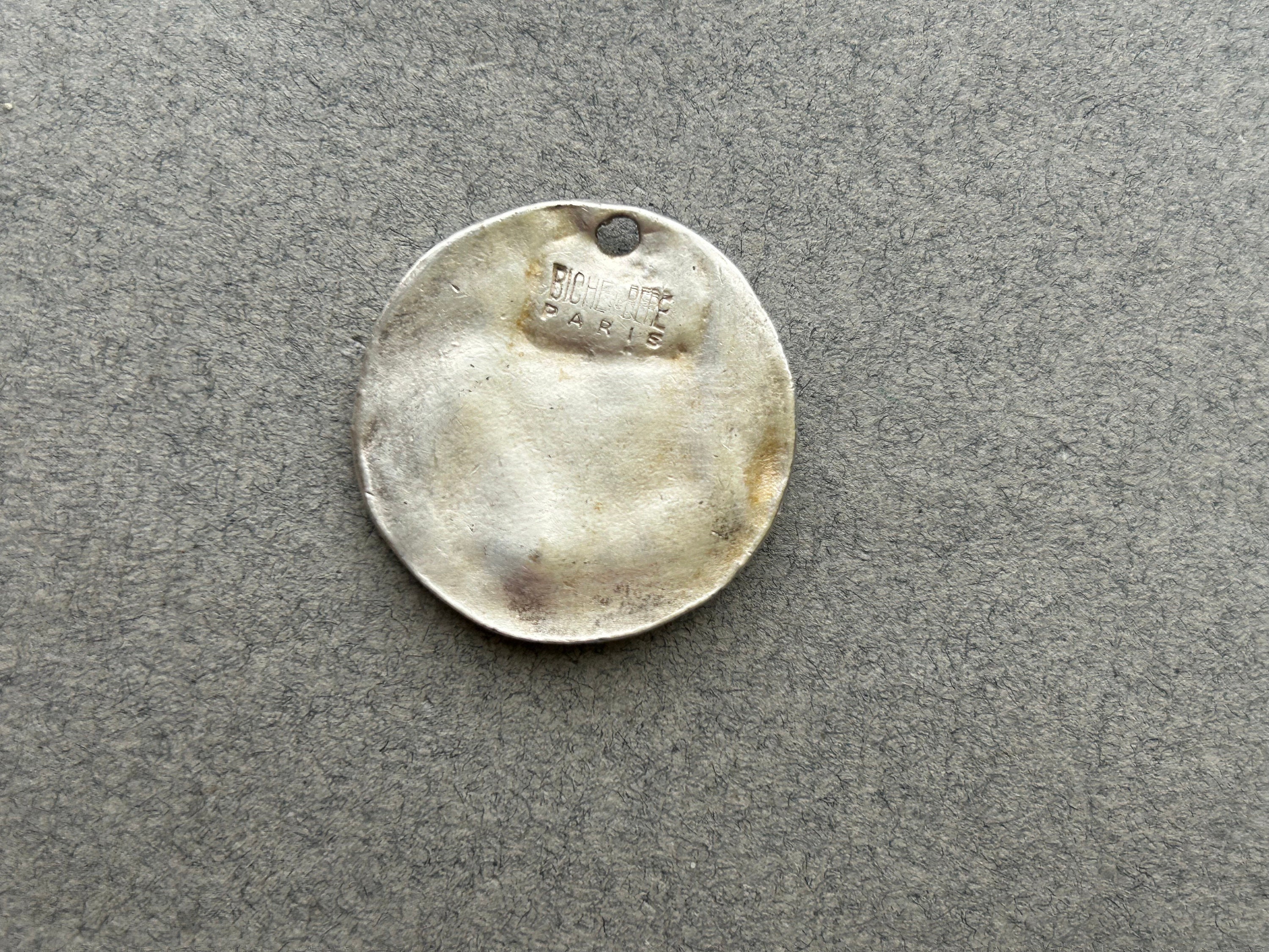 The pendant has discoloration and is of an unknown metal (no hallmarks). It is stamped "Biche de Bere" and "Paris" on the reverse. The holy card has creasing and discoloration.
