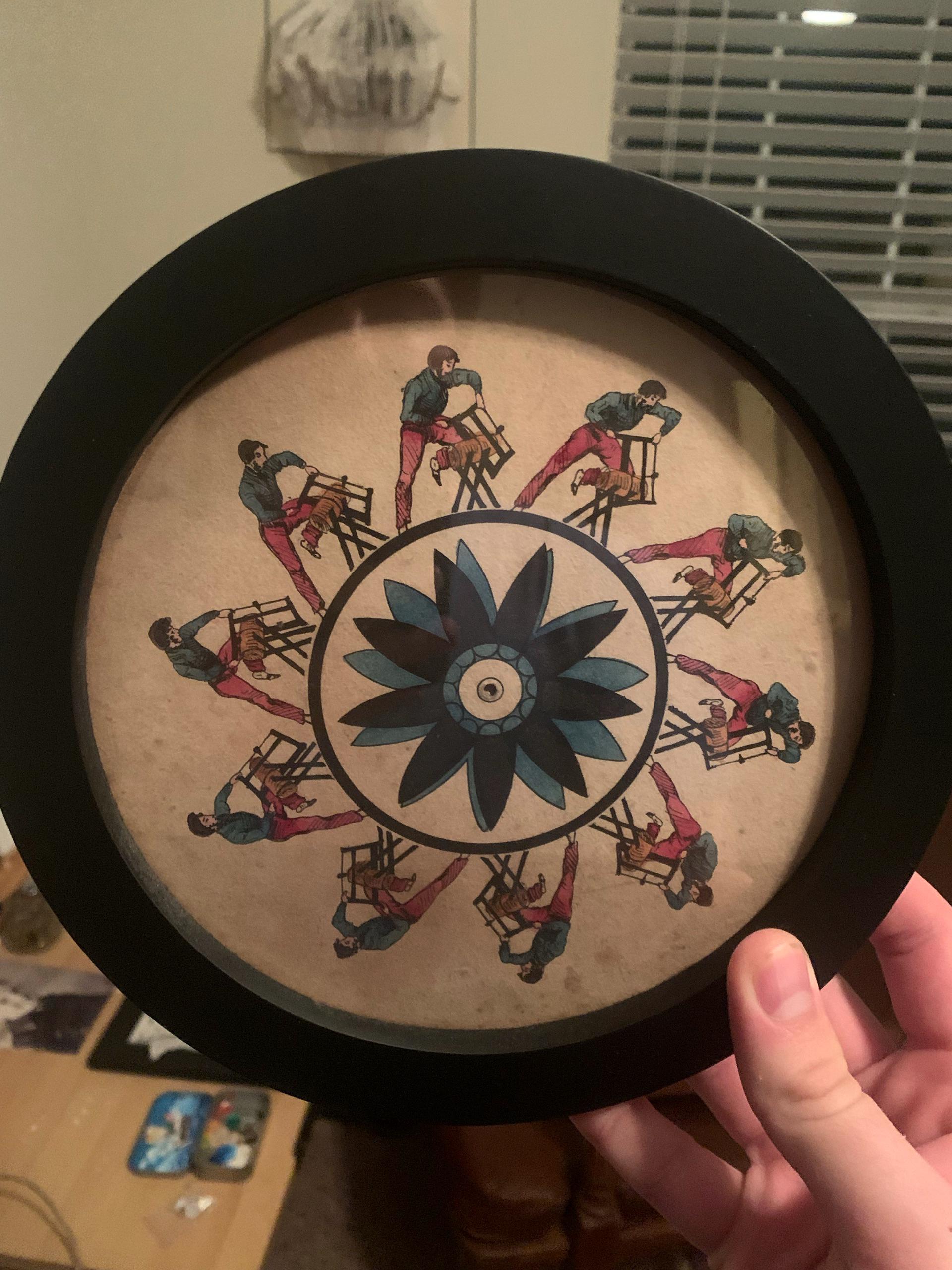 This rare, hand-colored phenakistoscope disc from France measures 6 ¾" across and is circa 1830s. It is one of the earliest forms of animation and pre-dates cinema. This disc could possibly be attributed to Alphonse Giroux.
