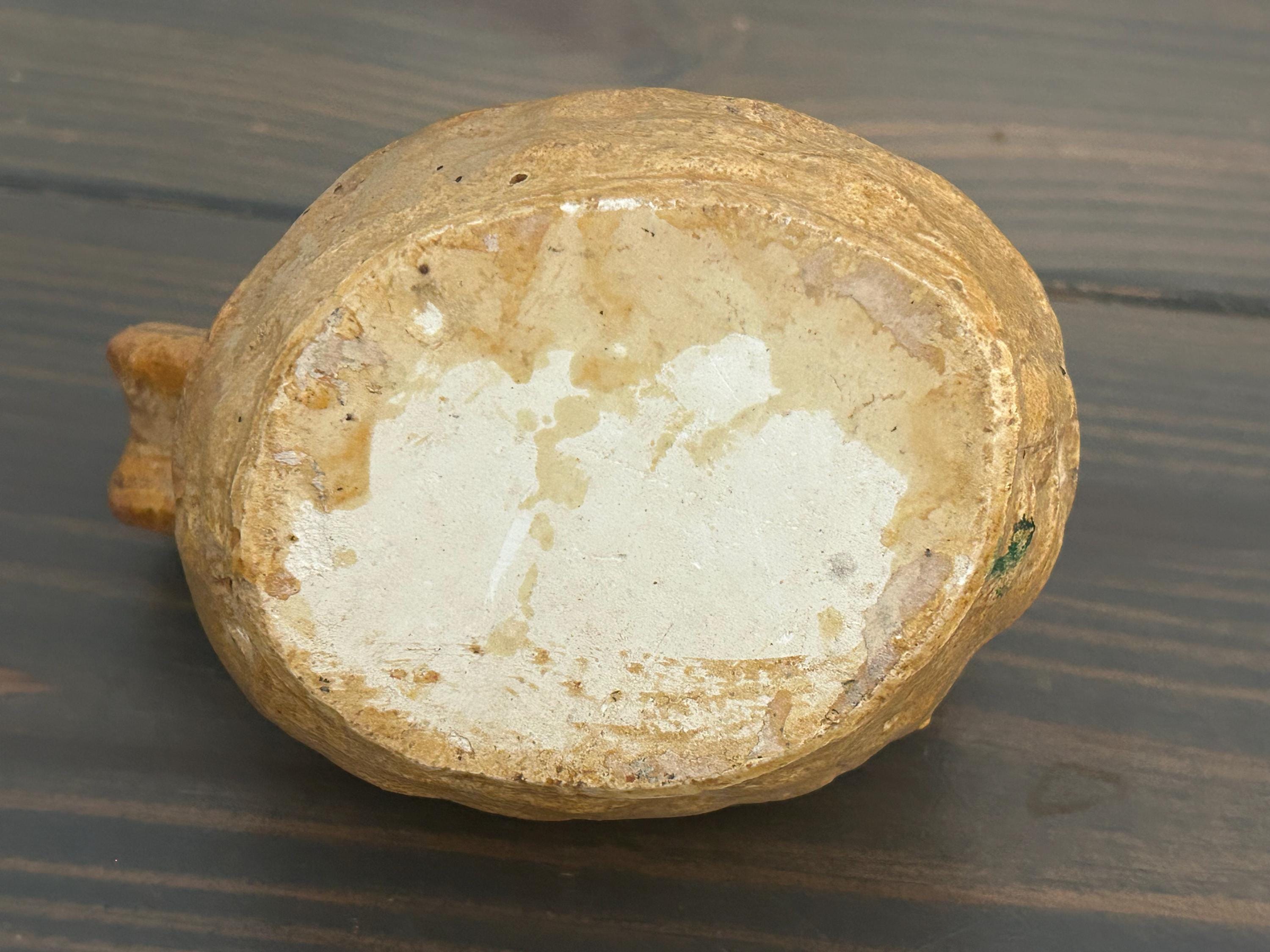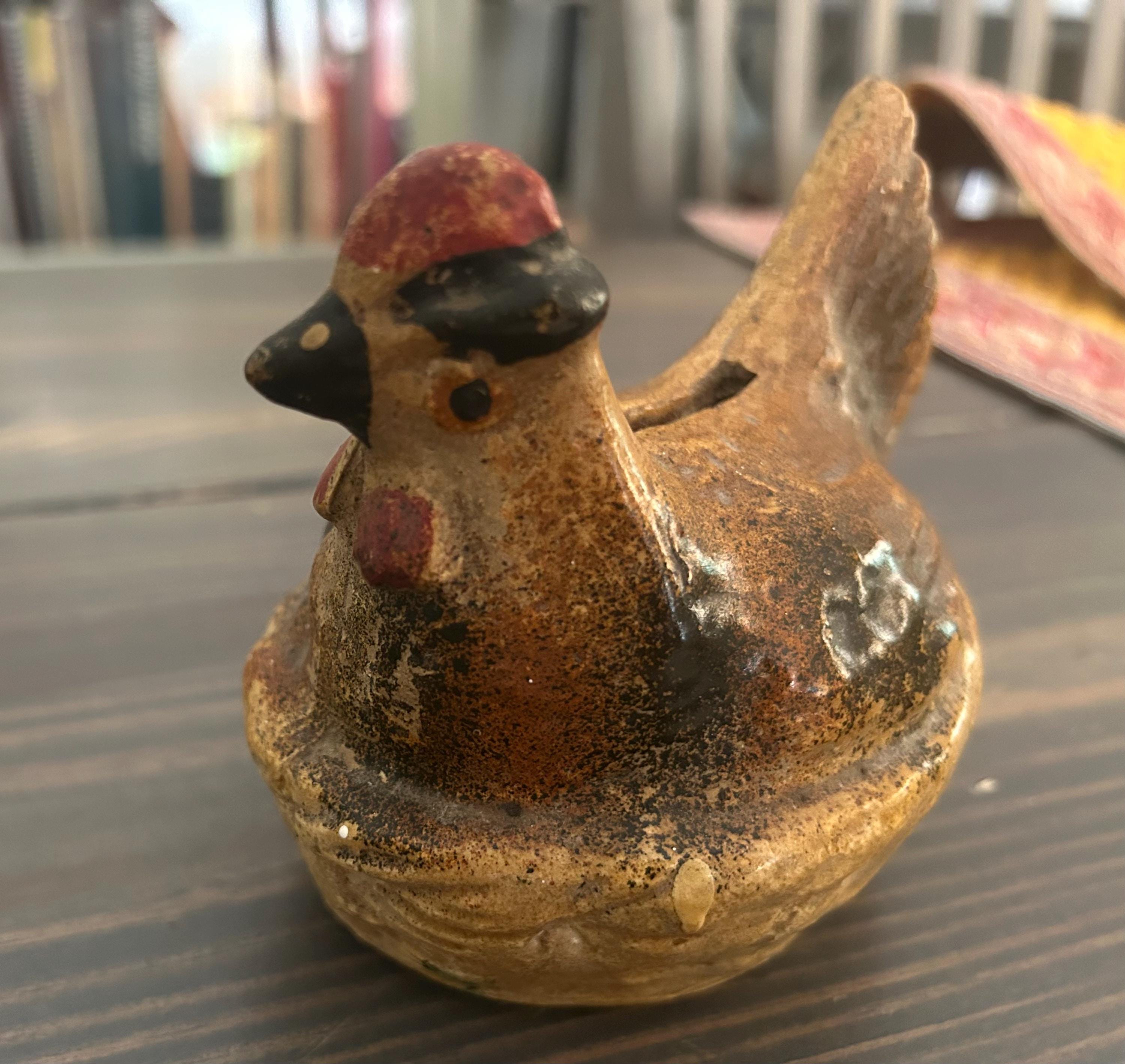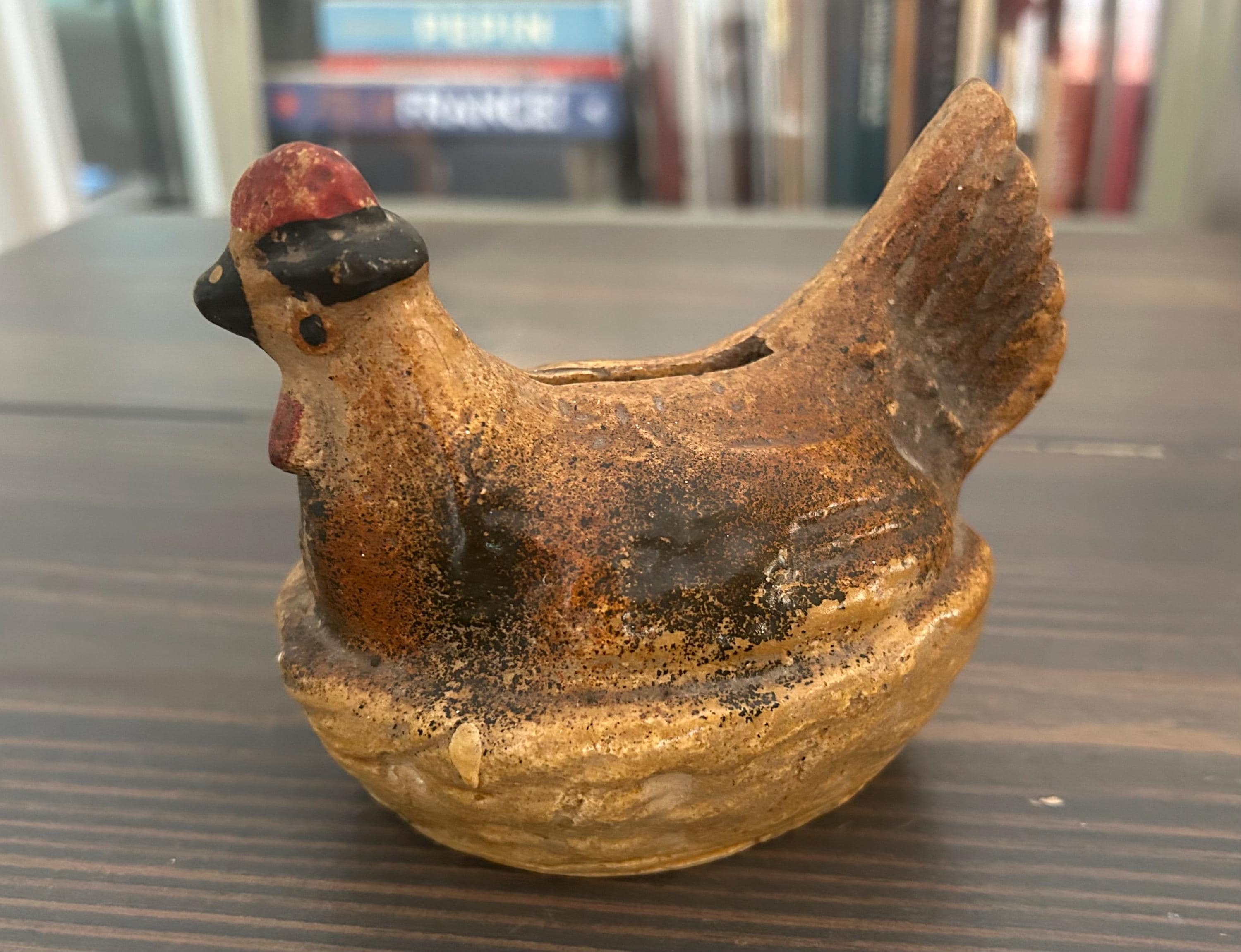This chalk ware still bank of a hen sitting on her nest is from France. The base measures 3" x 2 ⅜". It is 5" from the hen's beak to her tail feathers and approximately 4" in height from the tip of her tail feathers to the base. The mold lines are partially visible. Chalk ware is created by pouring plaster into a mold. Since chalk ware is not fired, the pieces are painted with paint and not glaze, the latter of which needs firing. This piece is circa early to mid-1900s.