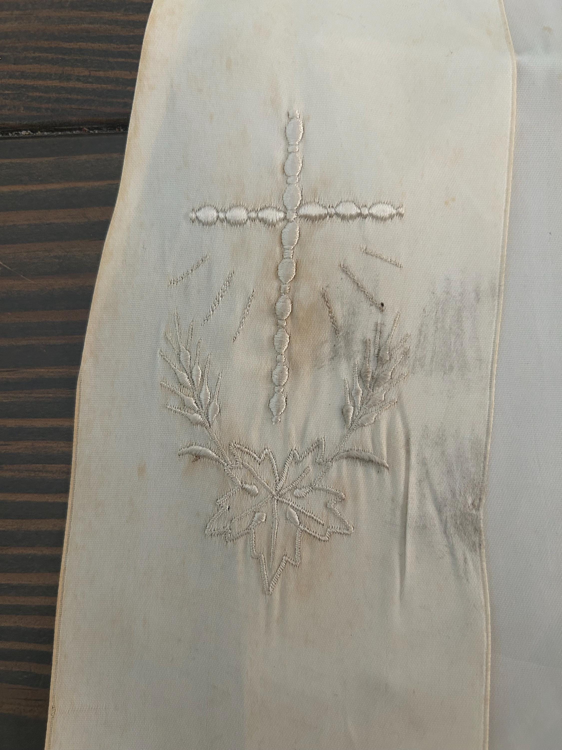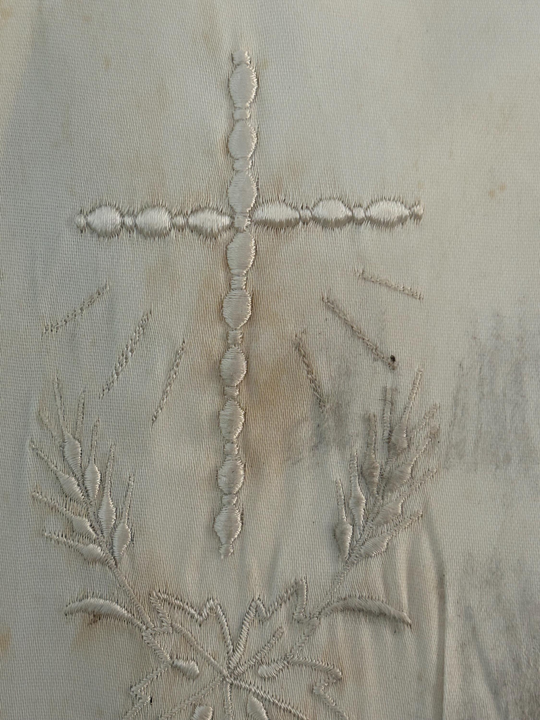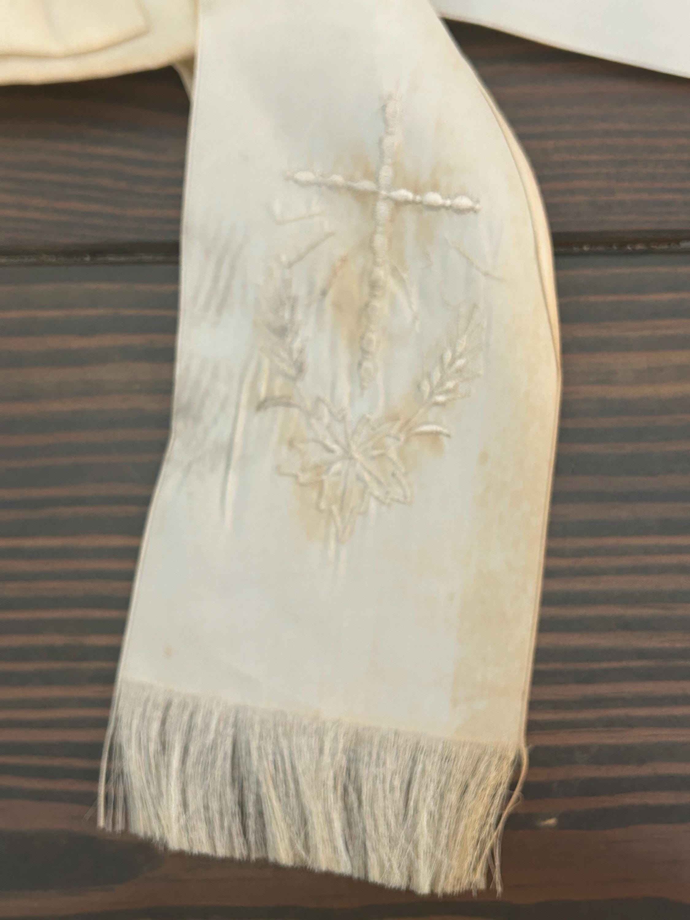*****CONDITION: The silk does have discoloration owing to age, especially around the cross and other embellishments as seen most clearly in the fifth, sixth, seventh, and eighth photos. The fringe also has marked discoloration. The piece is fragile owing to the material and age. Please examine all of the photos carefully, and do let me know if you need more photos as I'll be happy to oblige.