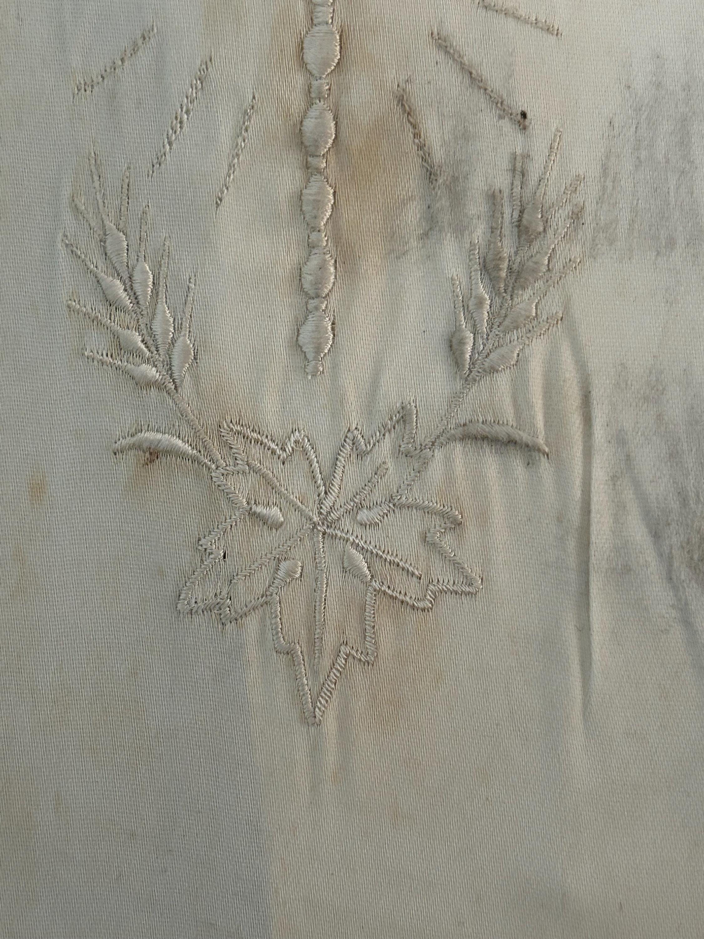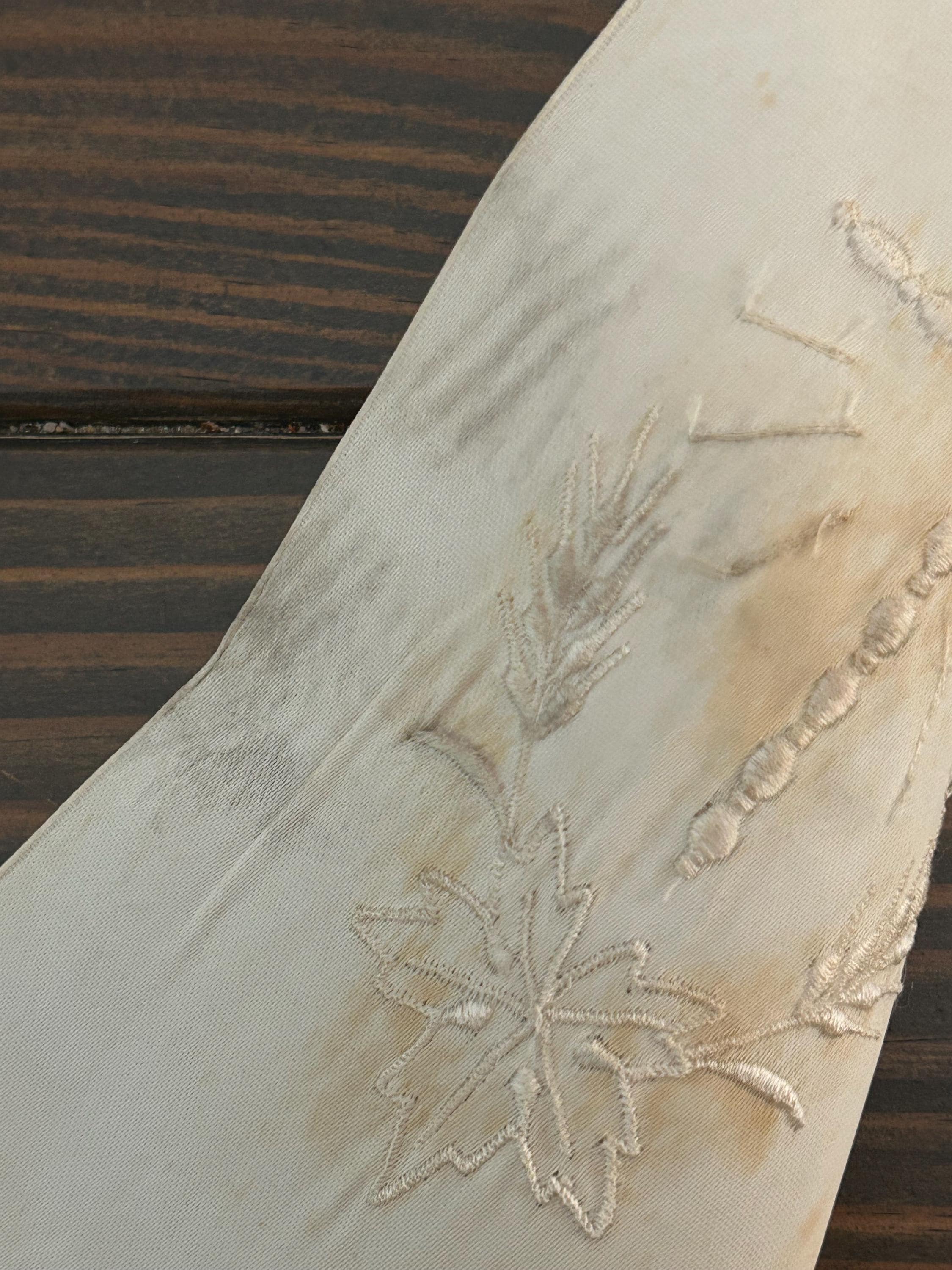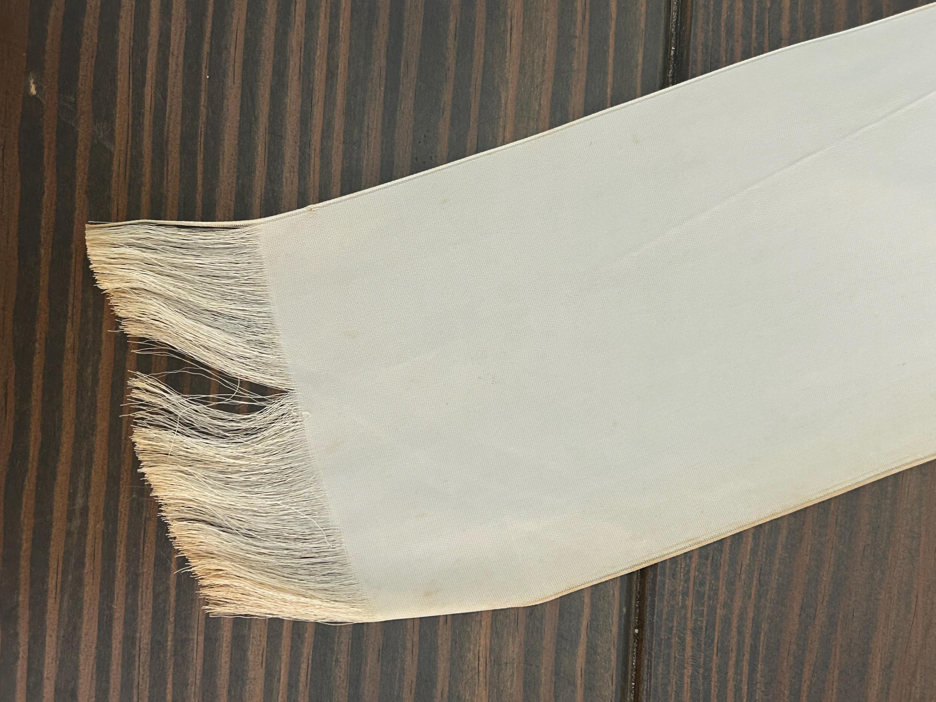 *****CONDITION: The silk does have discoloration owing to age, especially around the cross and other embellishments as seen most clearly in the fifth, sixth, seventh, and eighth photos. The fringe also has marked discoloration. The piece is fragile owing to the material and age. Please examine all of the photos carefully, and do let me know if you need more photos as I'll be happy to oblige.