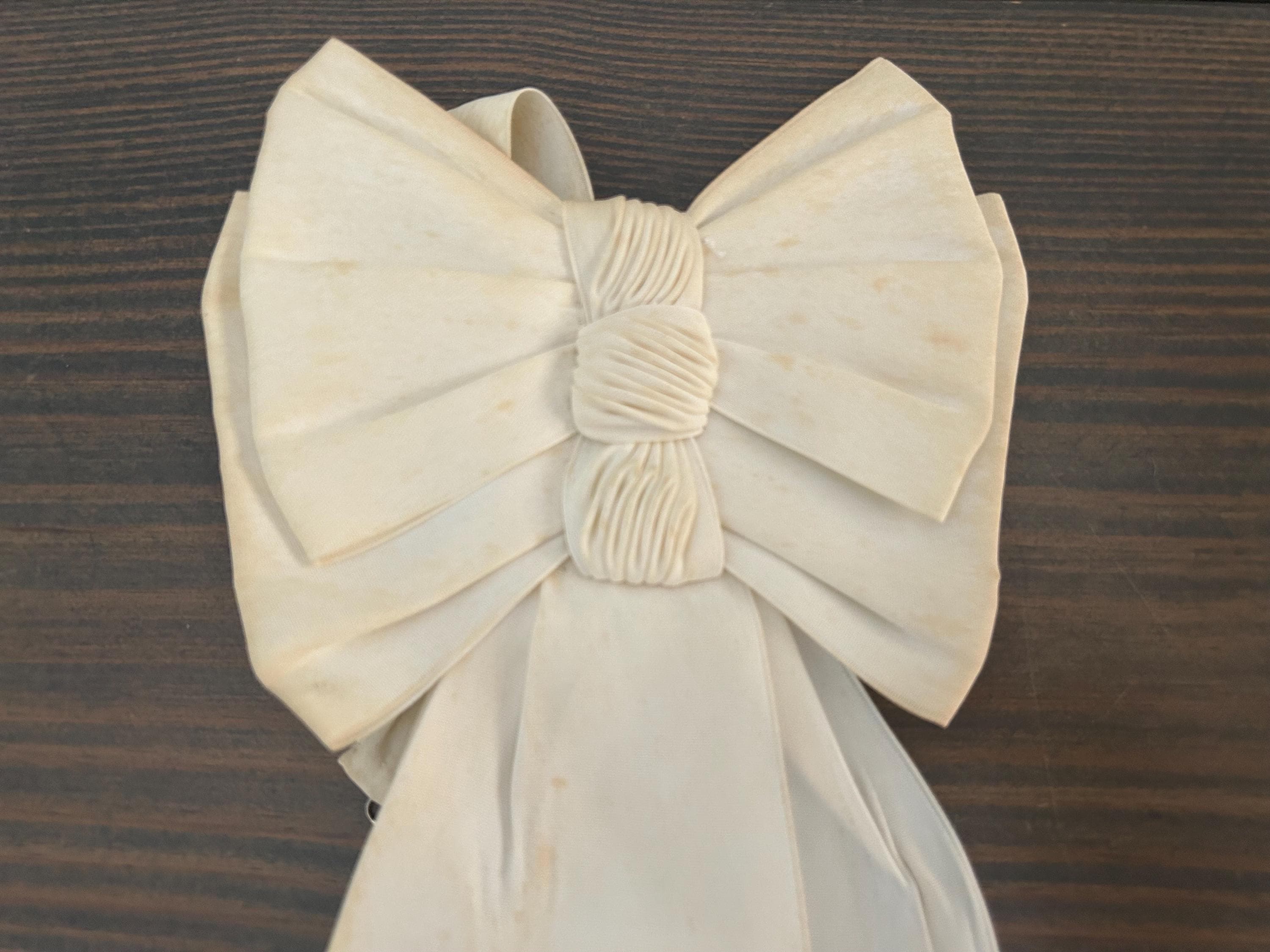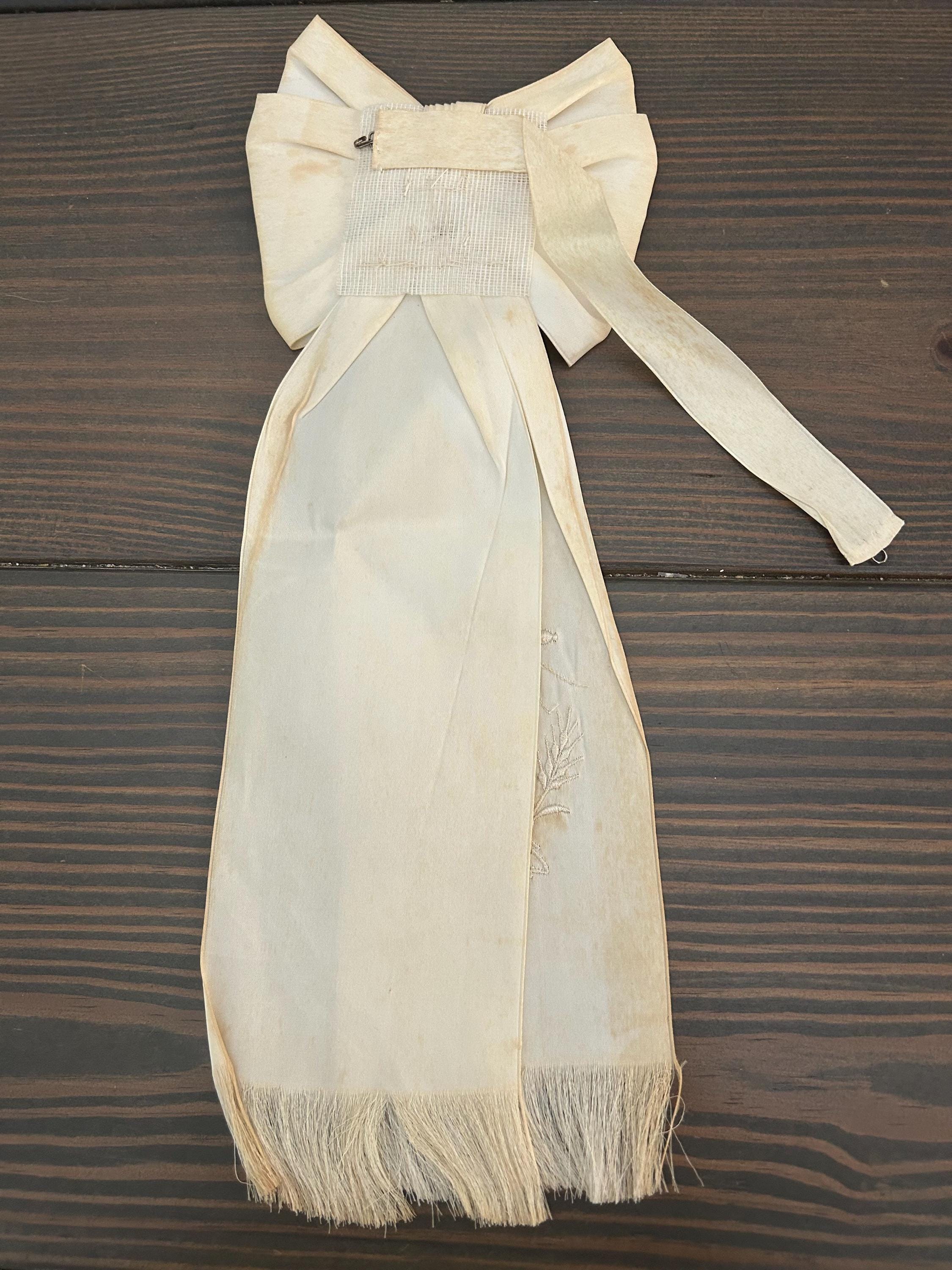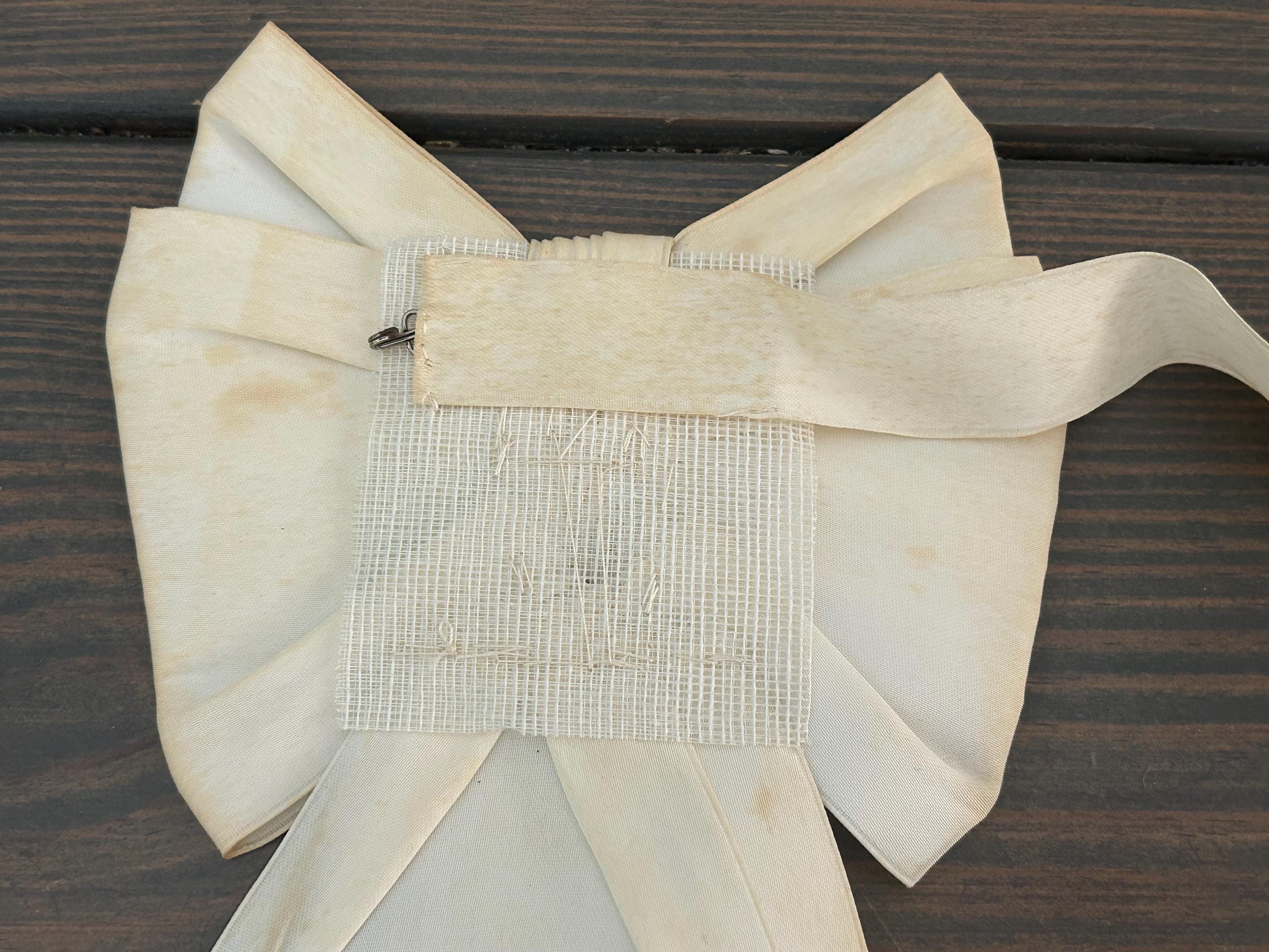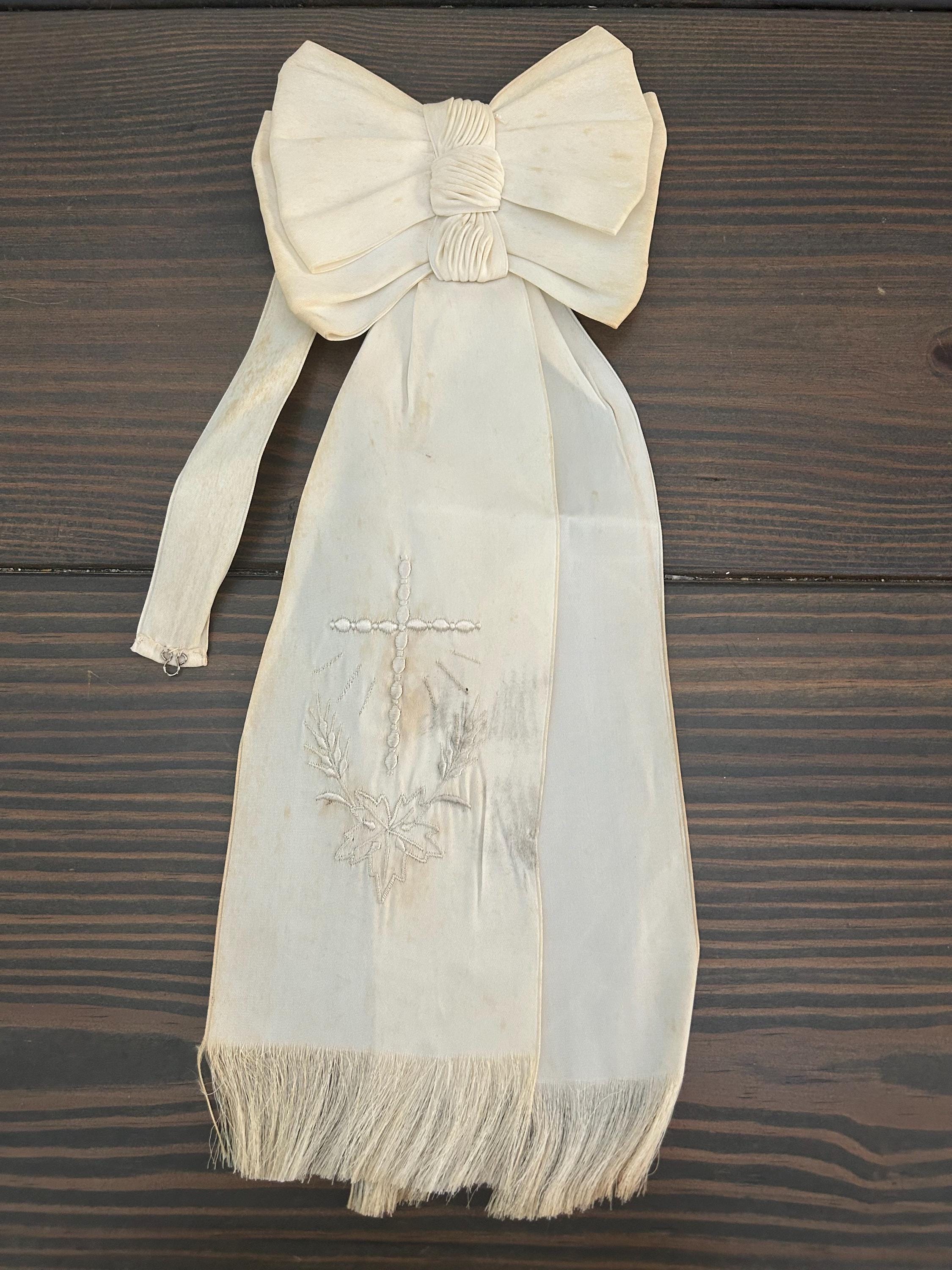 This approximately 14" (from uppermost portion of bow to end of tassels) silk First Communion, boy's armband or brassard is circa early 1900s and from France. The bow measures 5.5" across at the center point. Please note I have not attempted to clean the armband but will leave this up to the discretion of the new owner.
