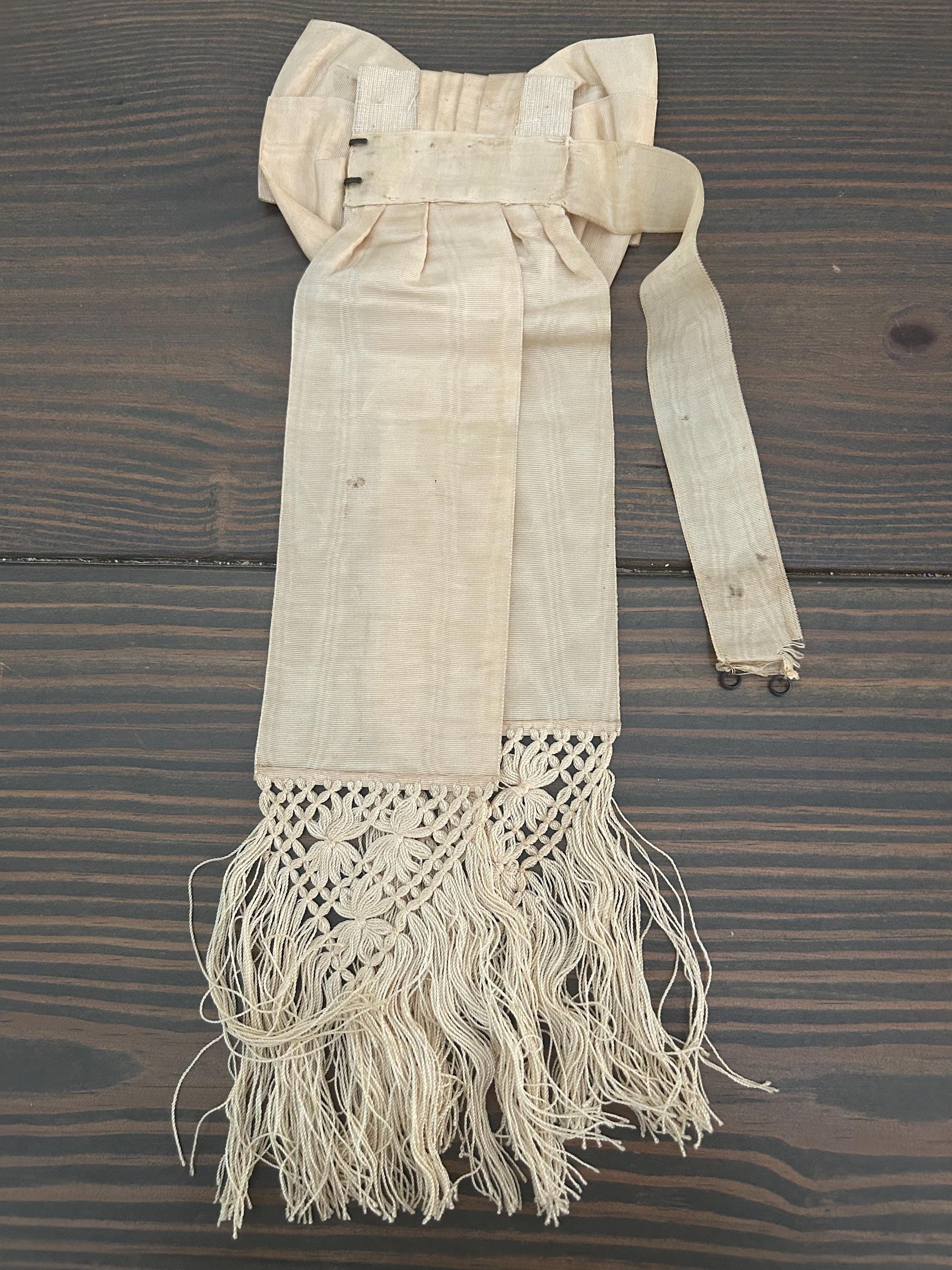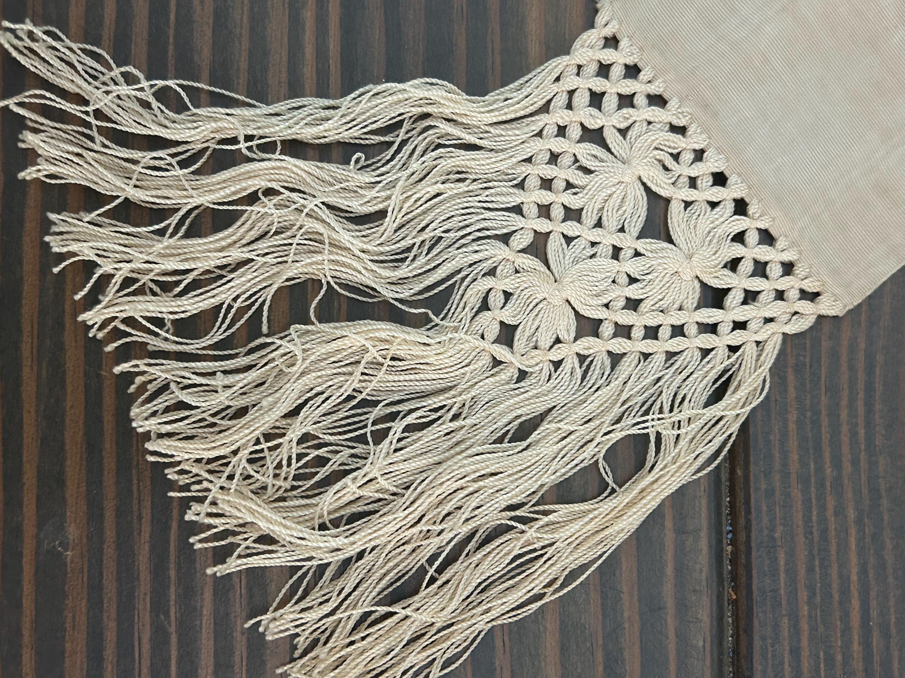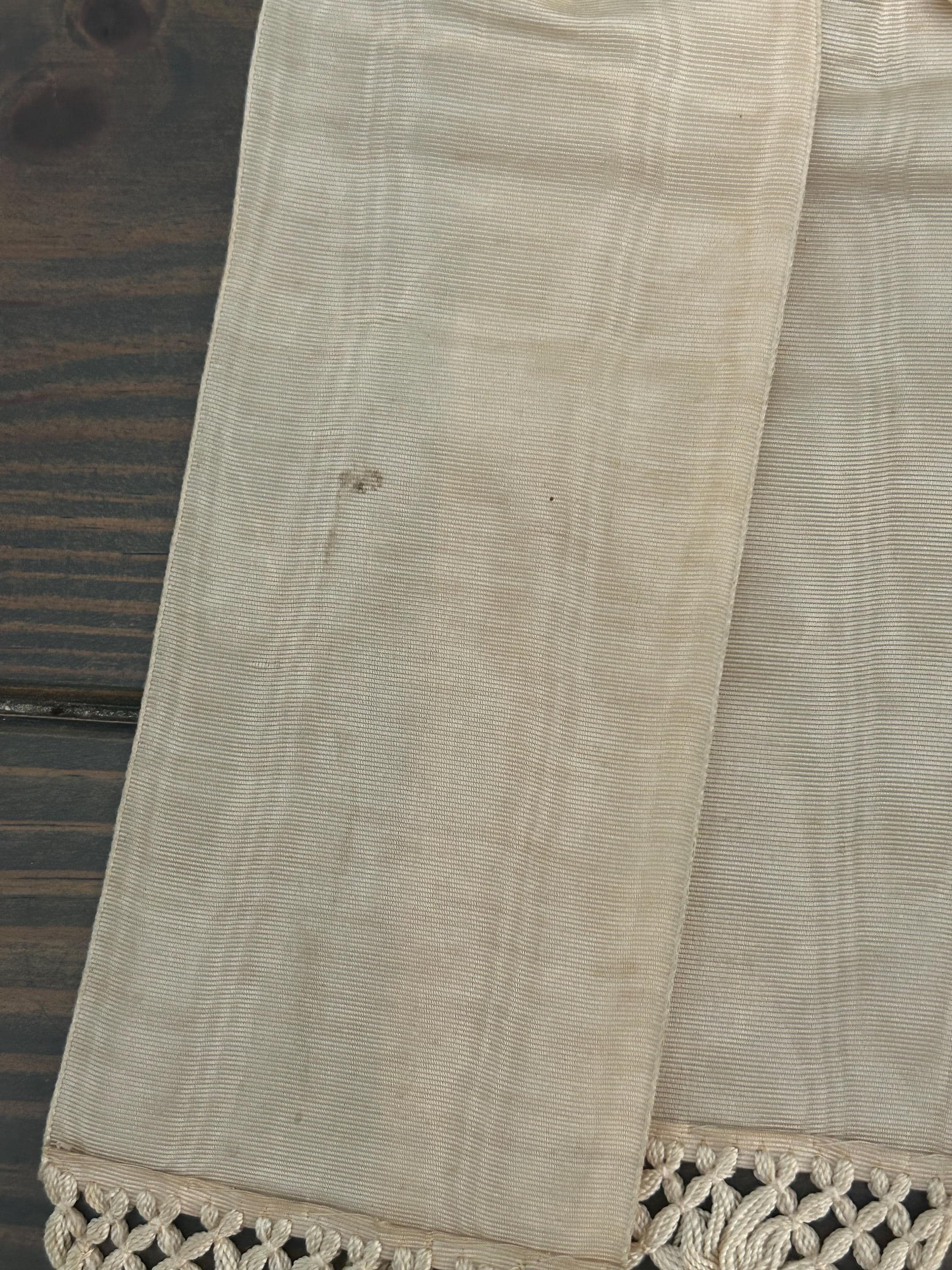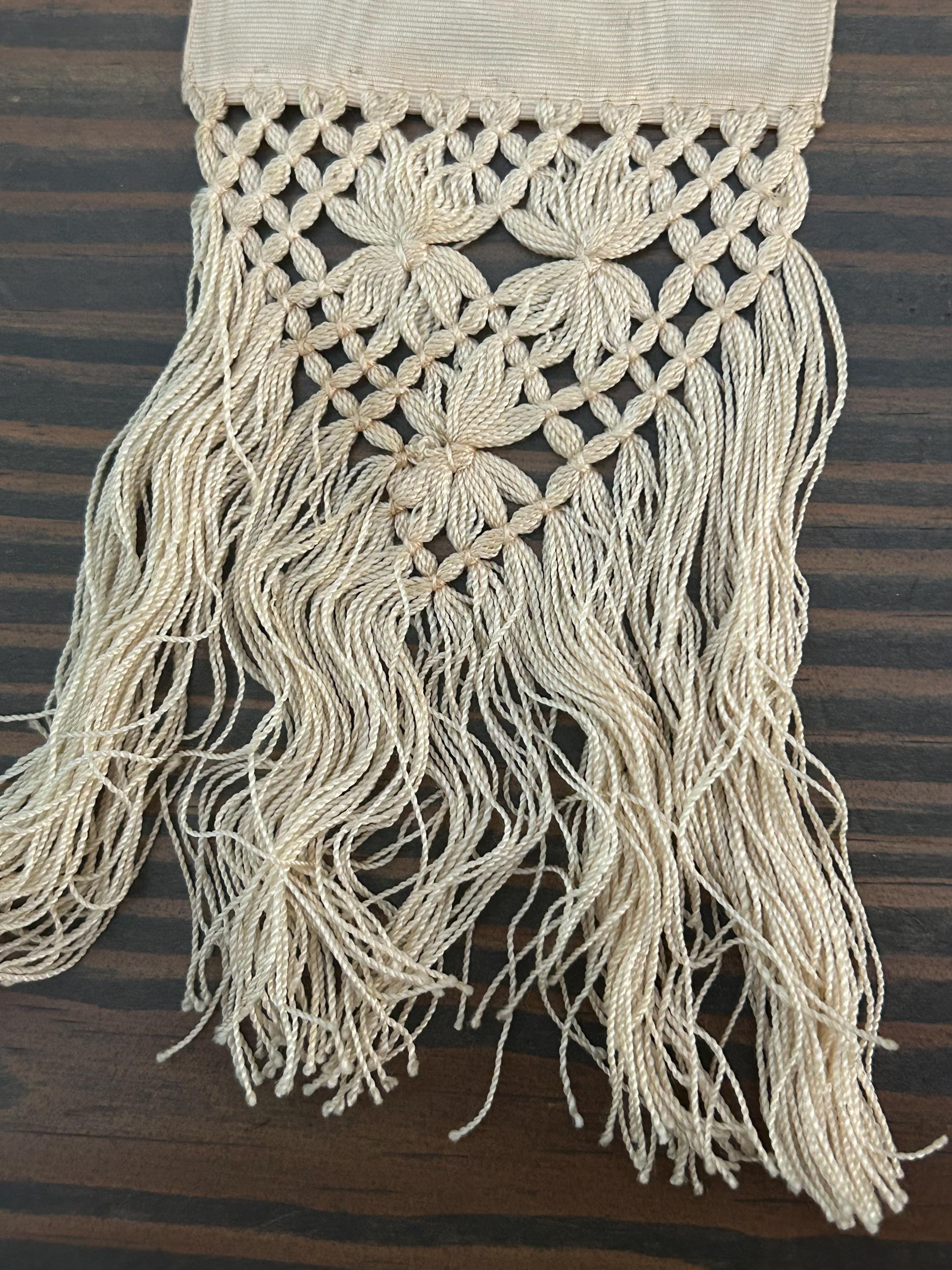 *****CONDITION: The silk does have discoloration owing to age. The tasseled ends are unkempt, and while this may be able to be remedied, I've not attempted to do so and will leave this up to the discretion of the new owner. The piece is fragile owing to the material and age. Please examine all of the photos carefully, and do let me know if you need more photos as I'll be happy to oblige.