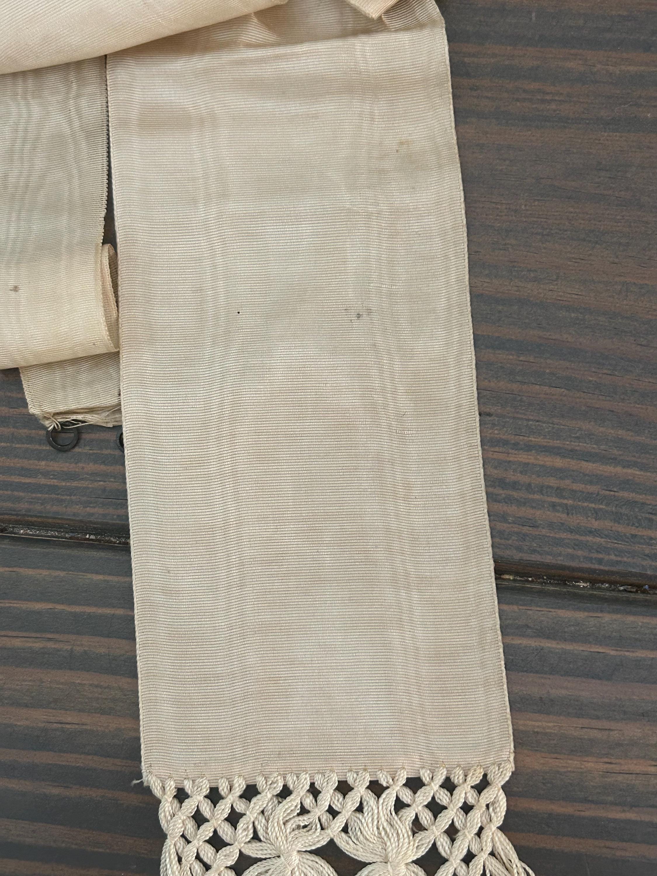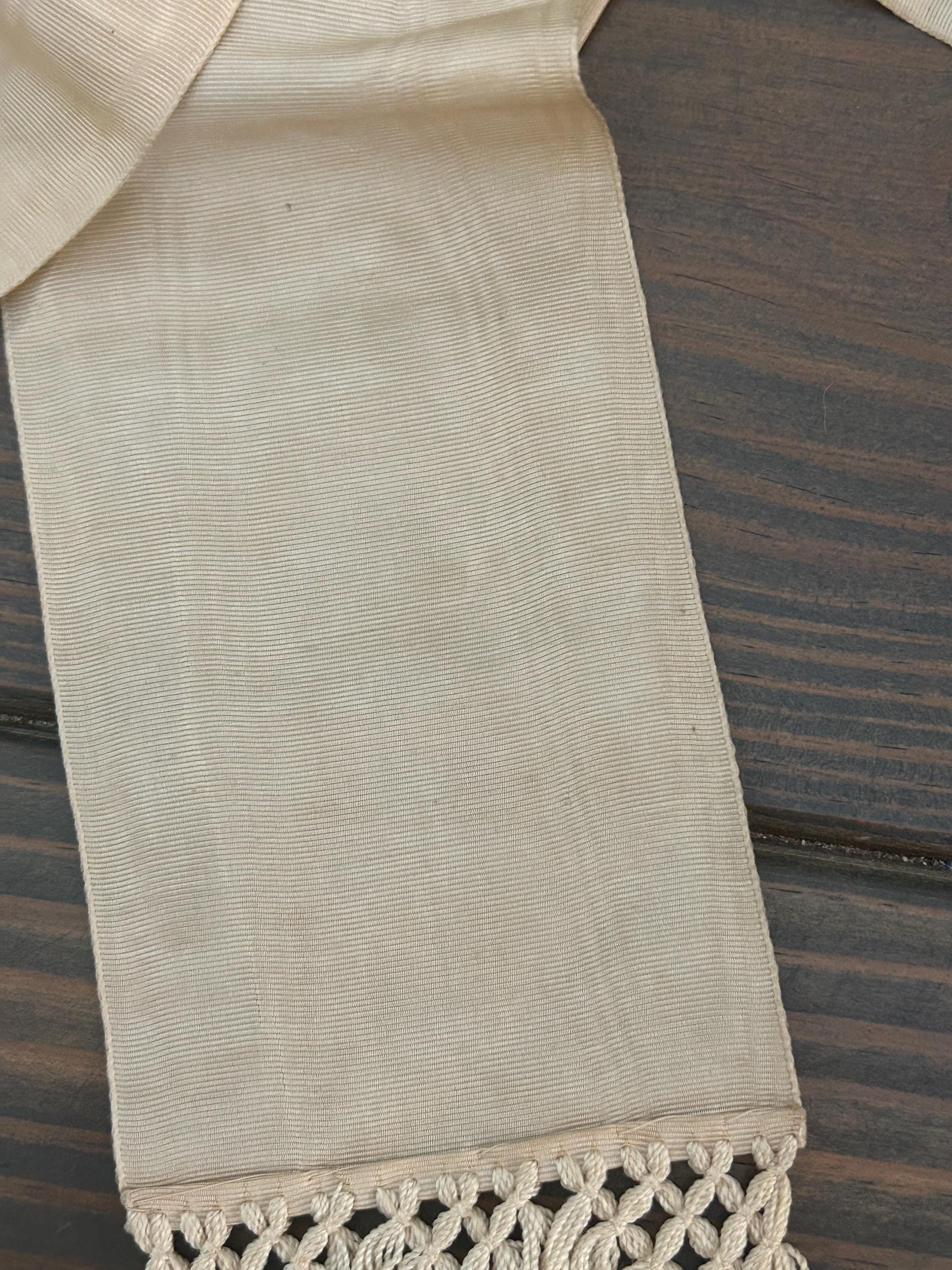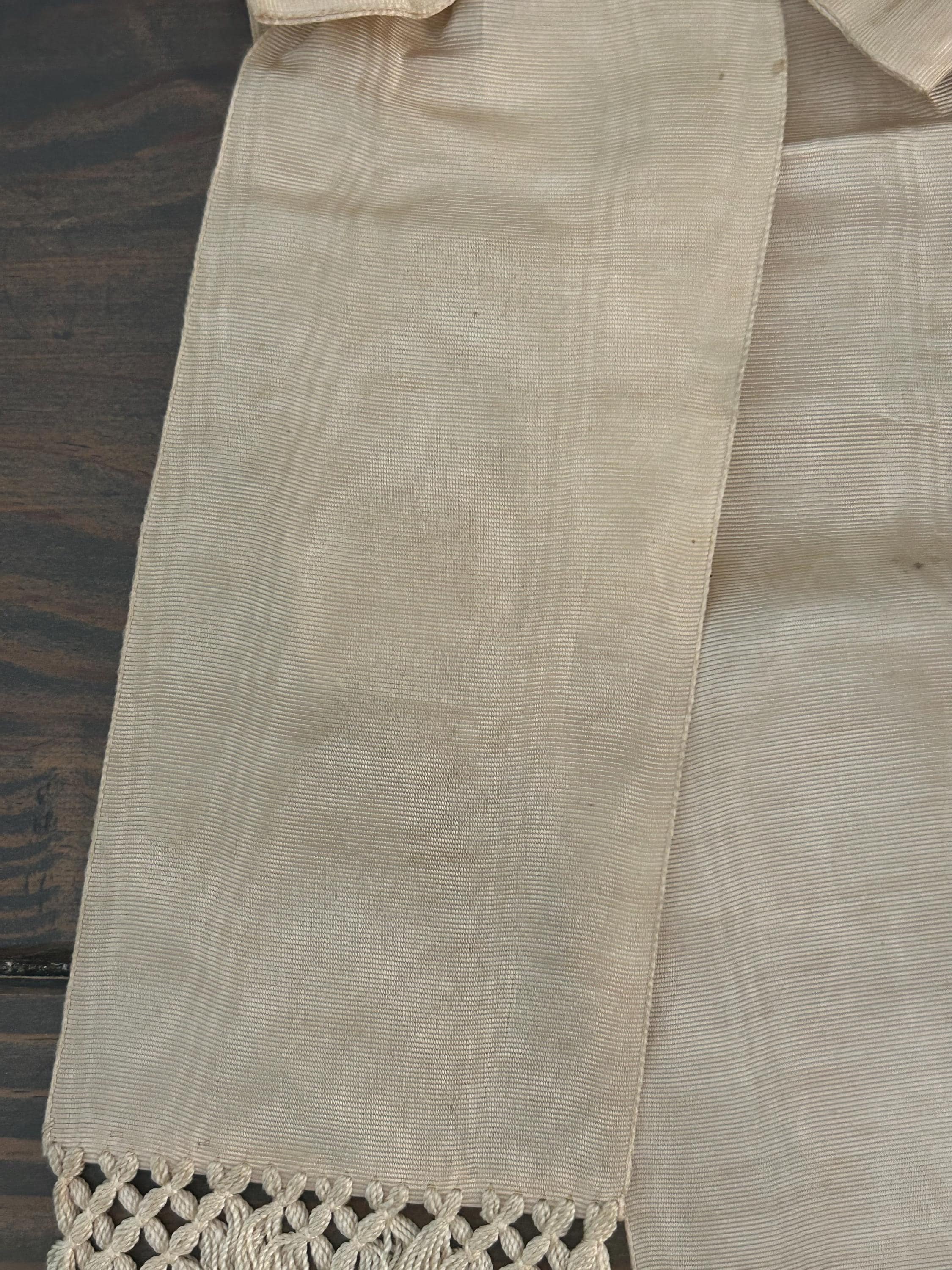 This approximately 14" (from uppermost portion of bow to end of tassels) silk moire First Communion, boy's armband or brassard is circa early 1900s and from France. The bow is approximately 5" across. Please note I have not attempted to clean the armband but will leave this up to the discretion of the new owner.