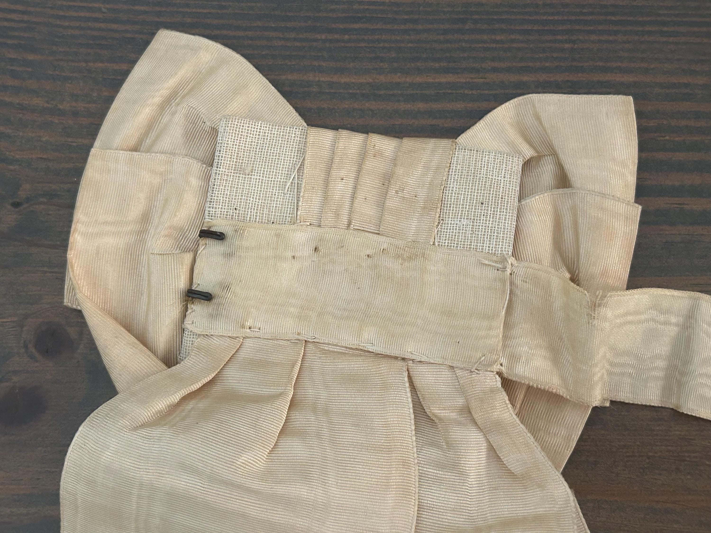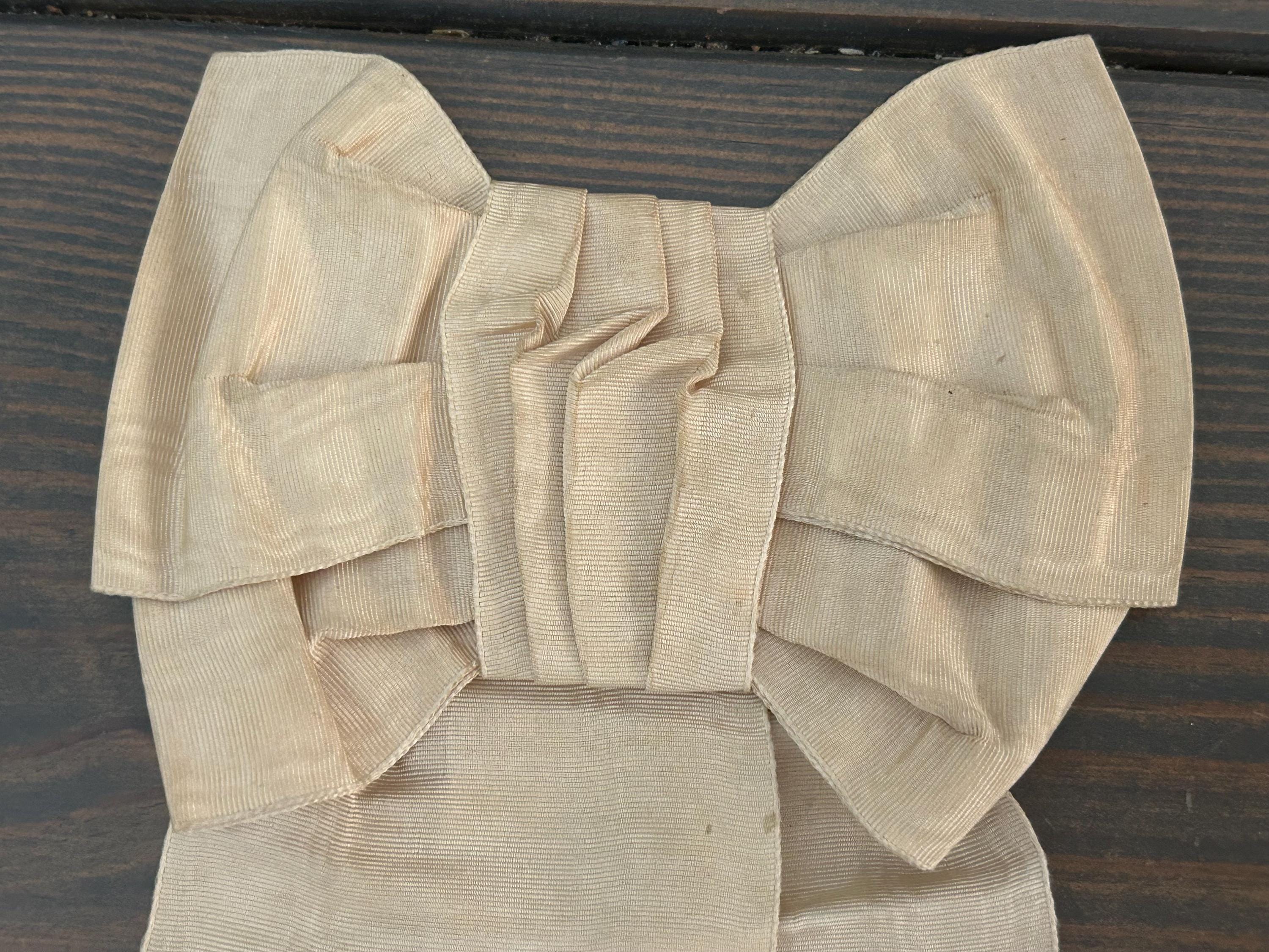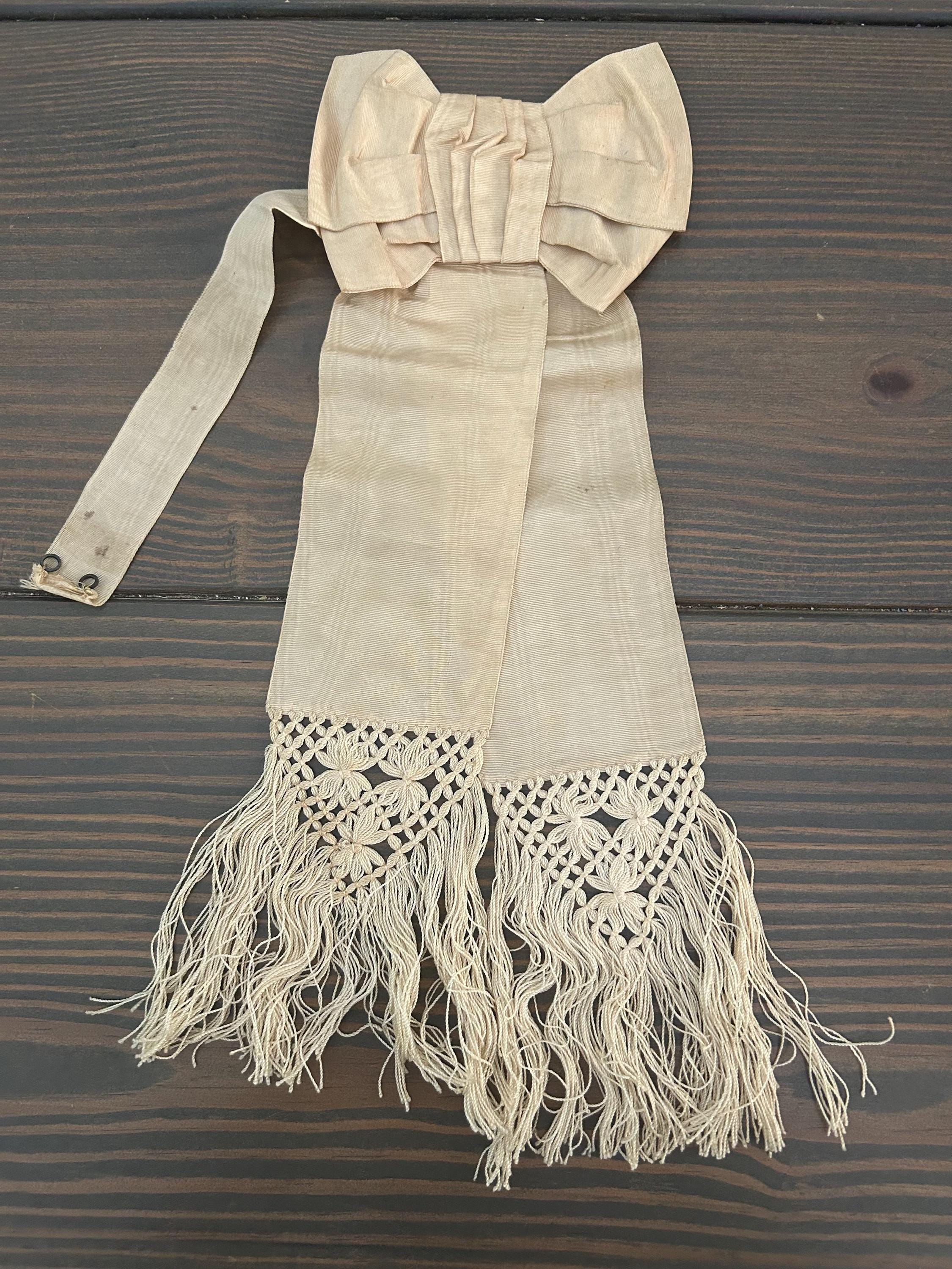 This approximately 14" (from uppermost portion of bow to end of tassels) silk moire First Communion, boy's armband or brassard is circa early 1900s and from France. The bow is approximately 5" across. Please note I have not attempted to clean the armband but will leave this up to the discretion of the new owner.
