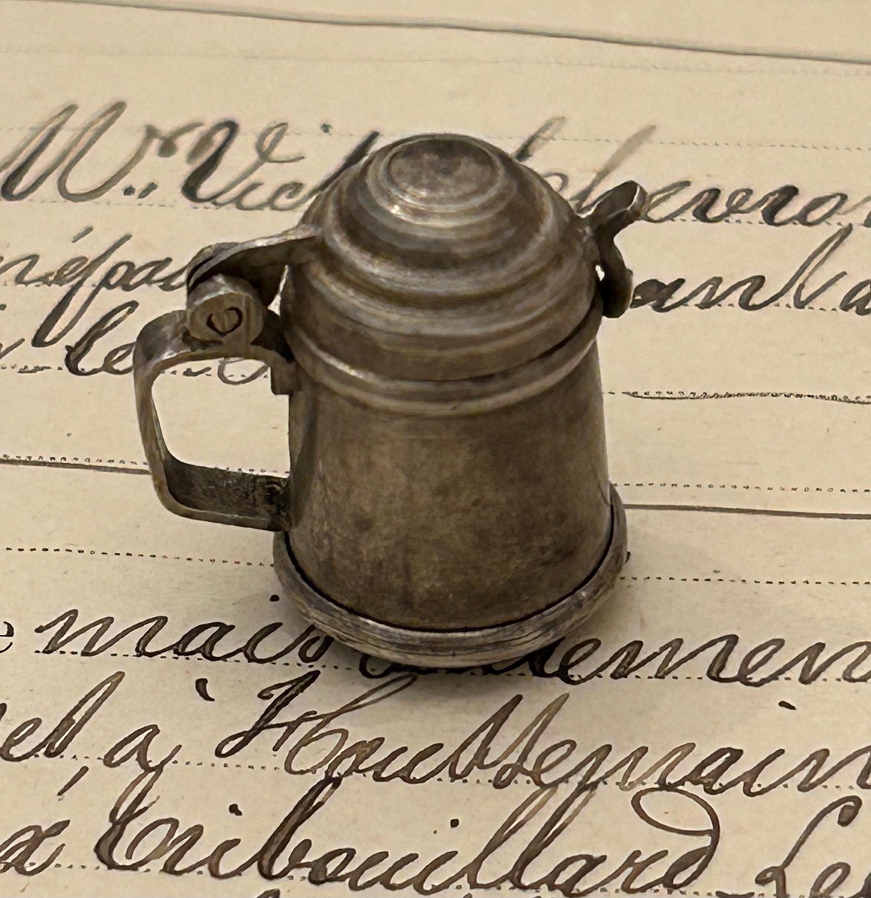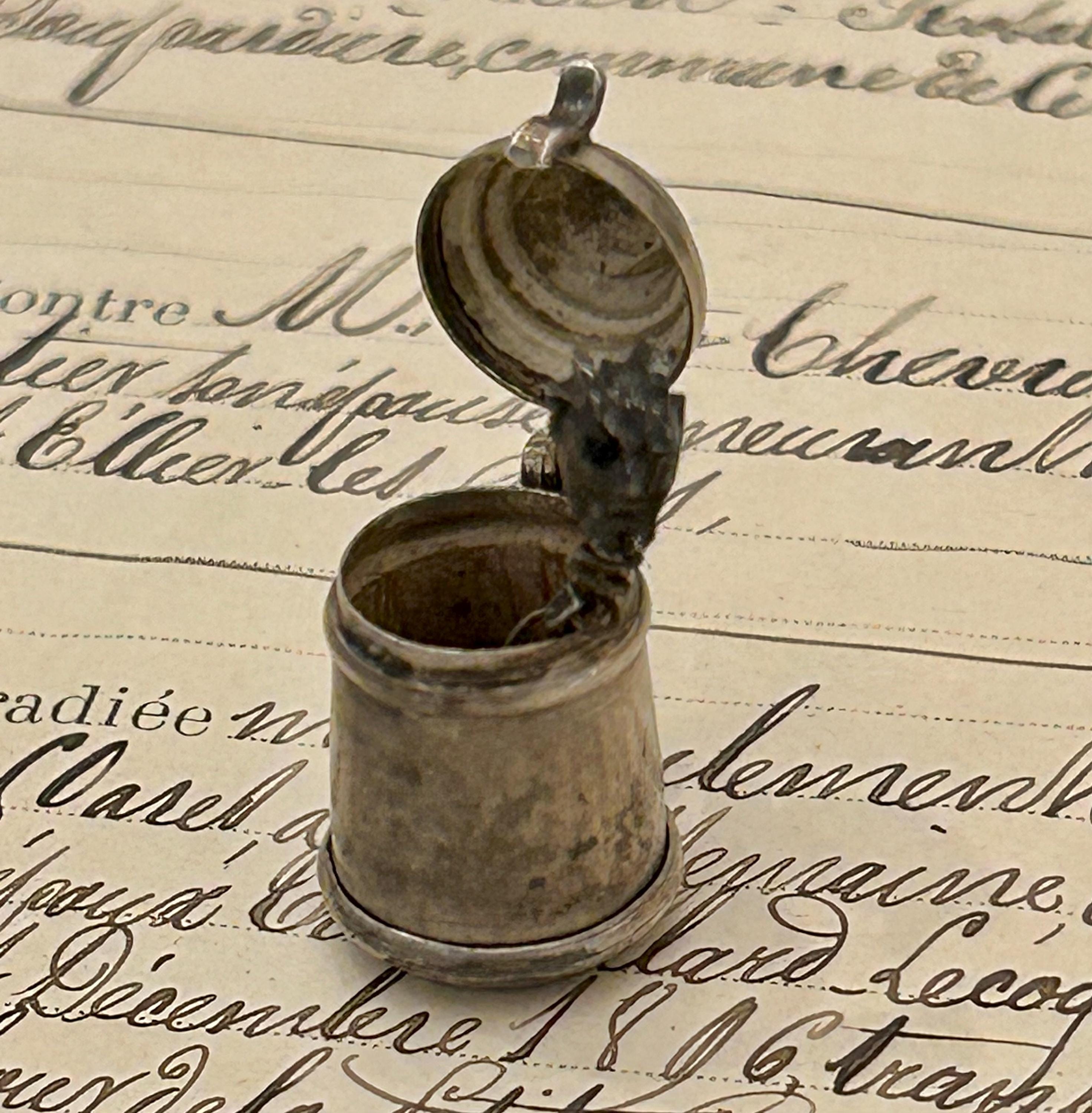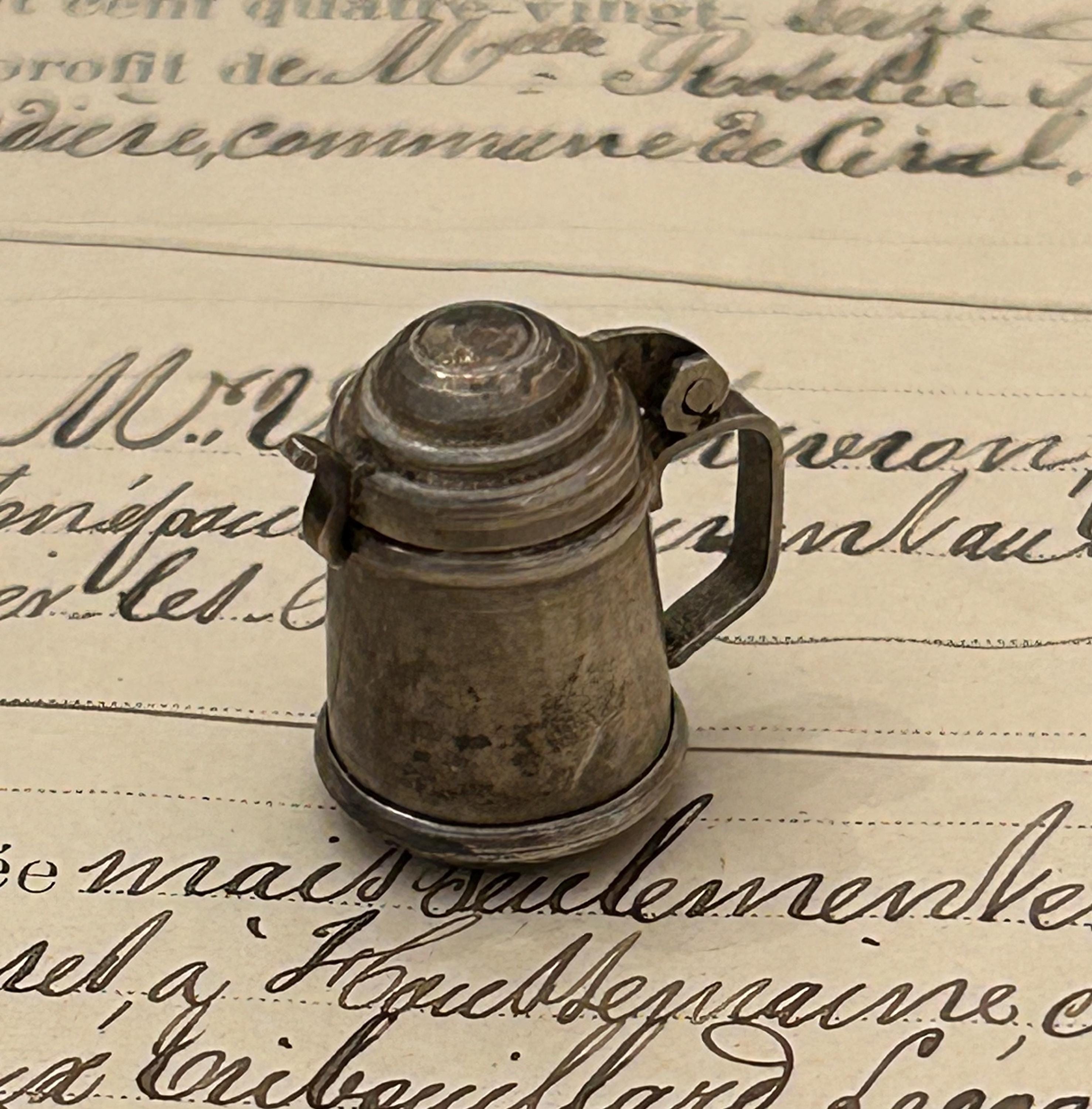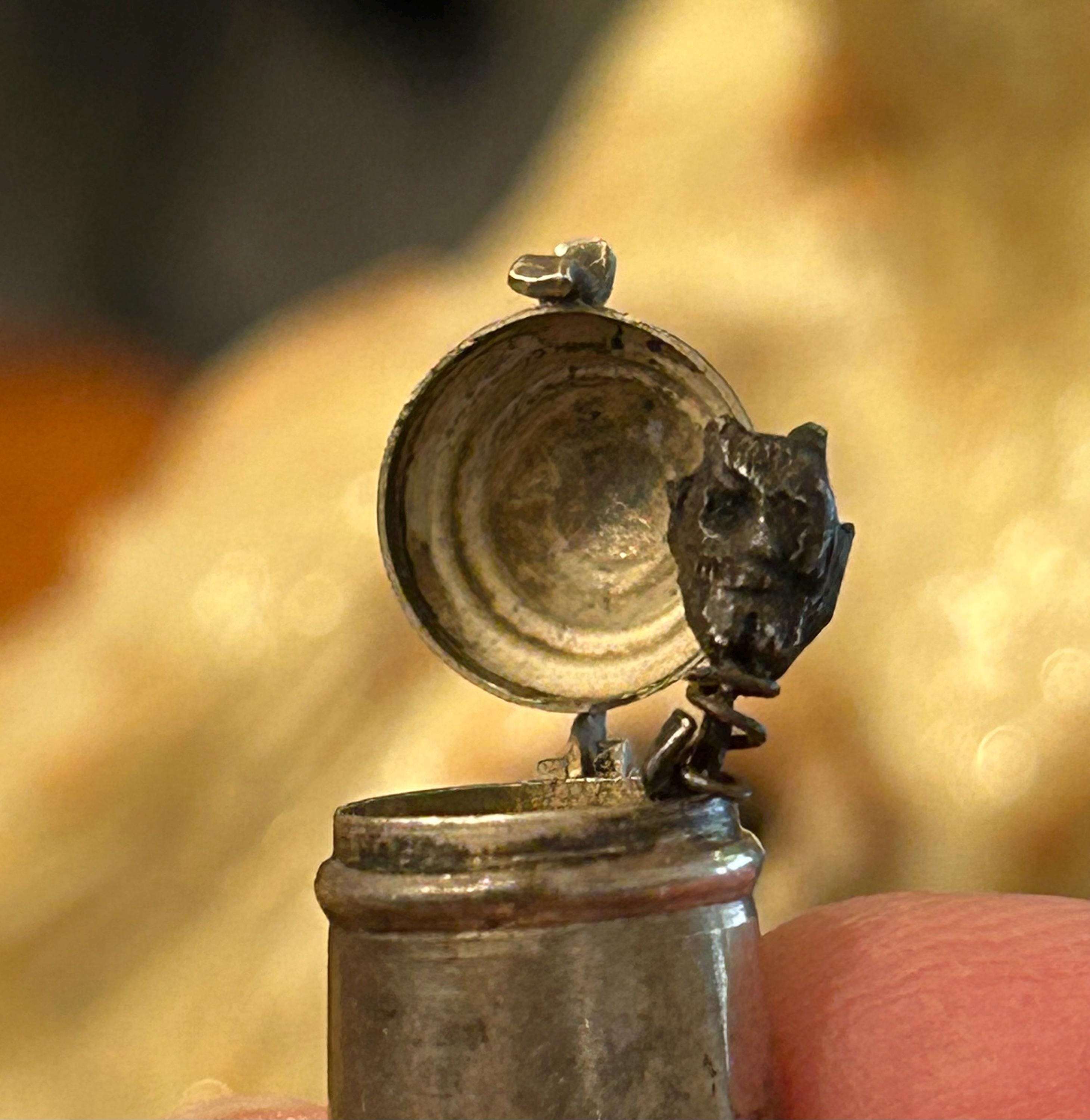 This rare miniature from France, which could possibly be worn as a charm (with a chain threaded through the stein's handle), features a hidden devil who springs up when the clasp on the stein is opened. The clasp and the spring function are in good working order. Dimensions are 2 cm x 1.8 cm. Please note there are no visible hallmarks or maker's mark so I don't know the silver, if any, composition. It could be comprised of only base medal, but my guess would be that it contains some silver.