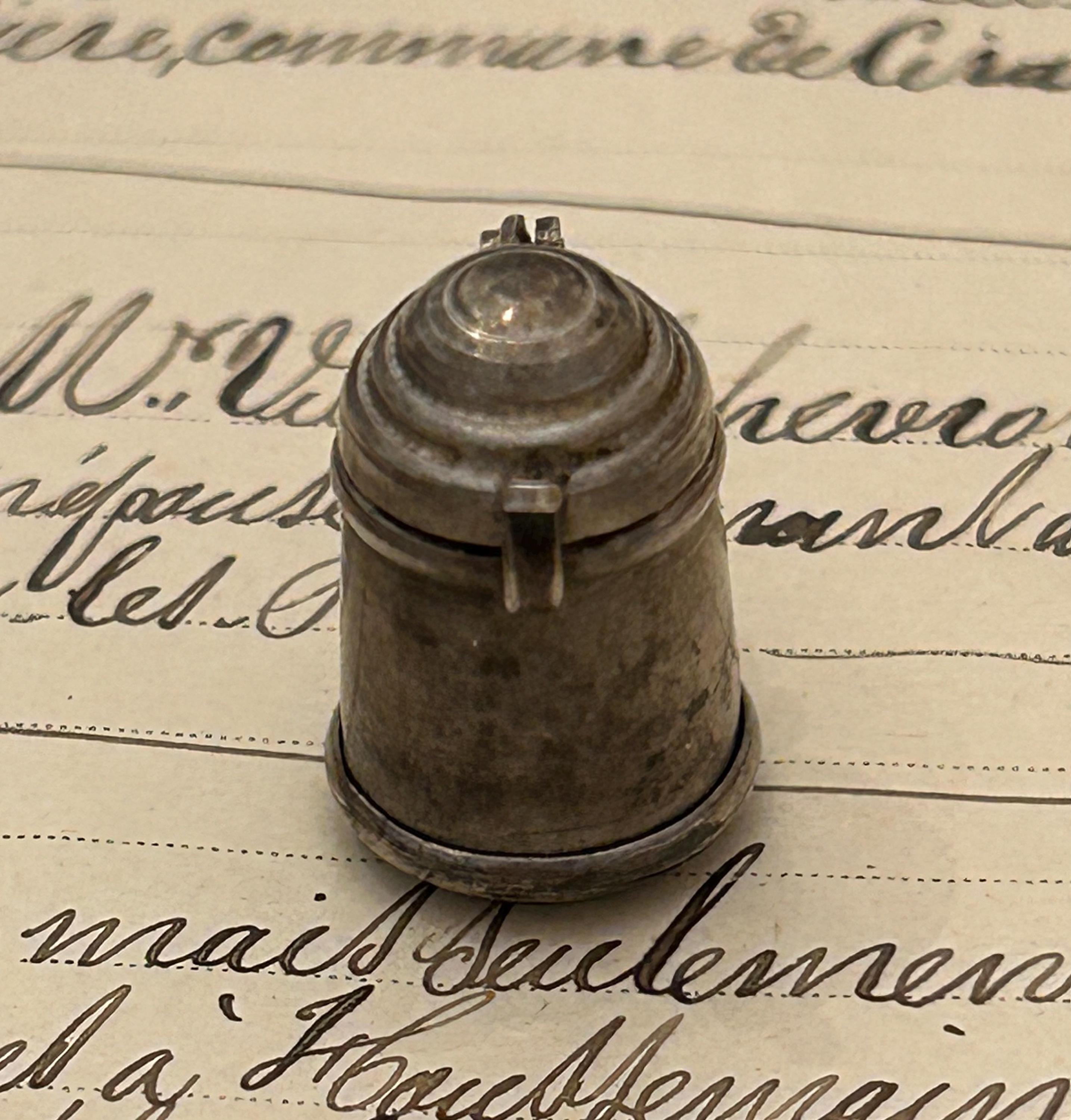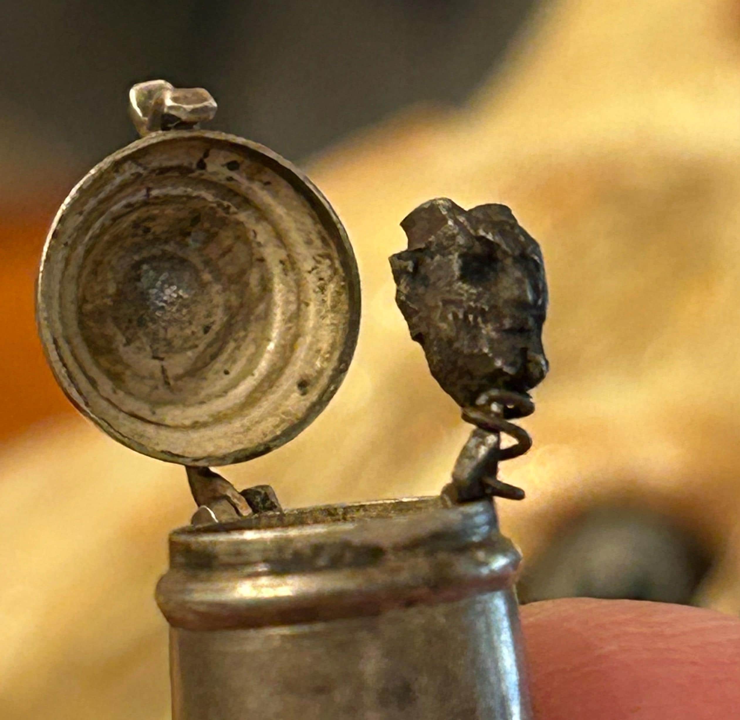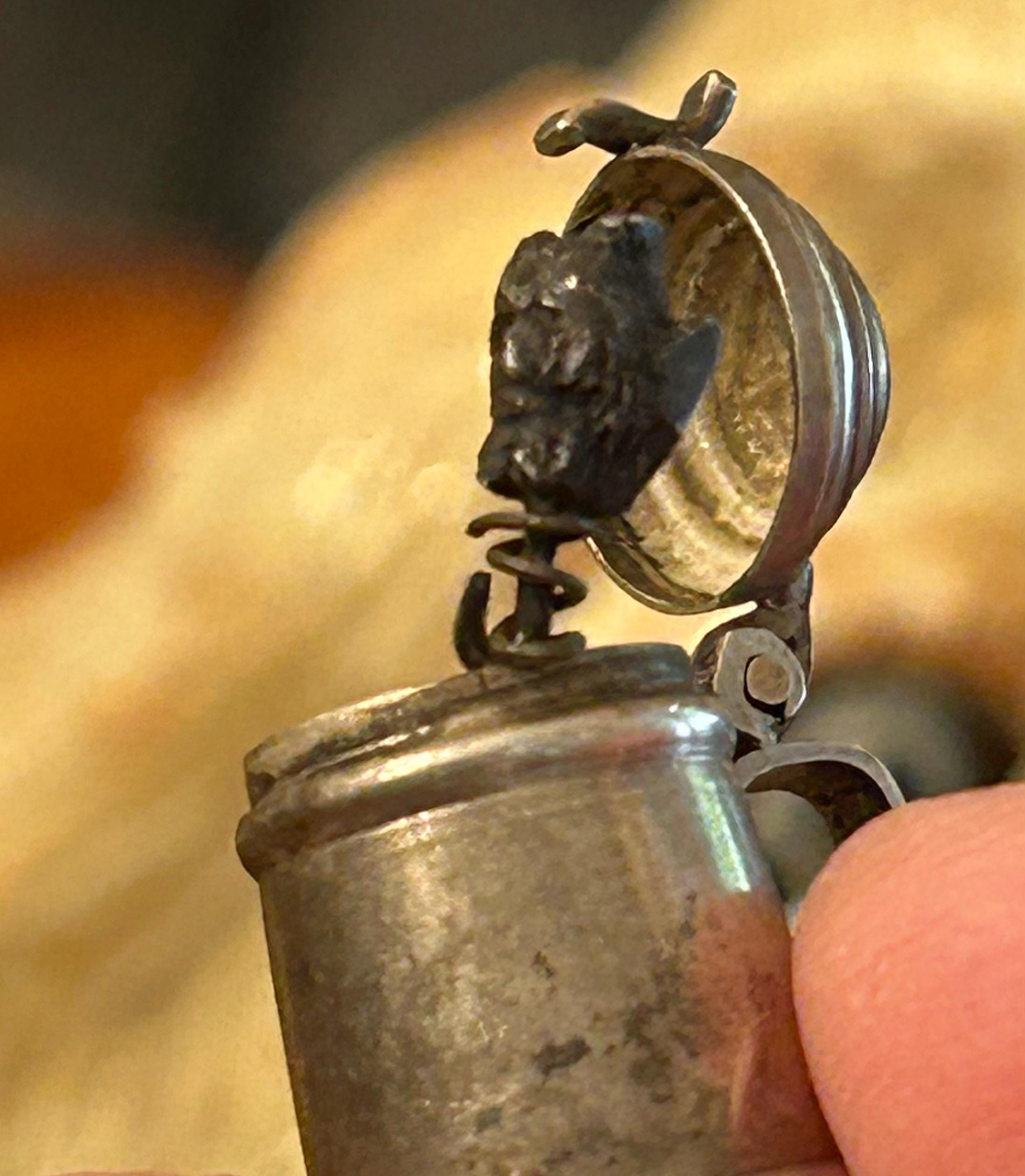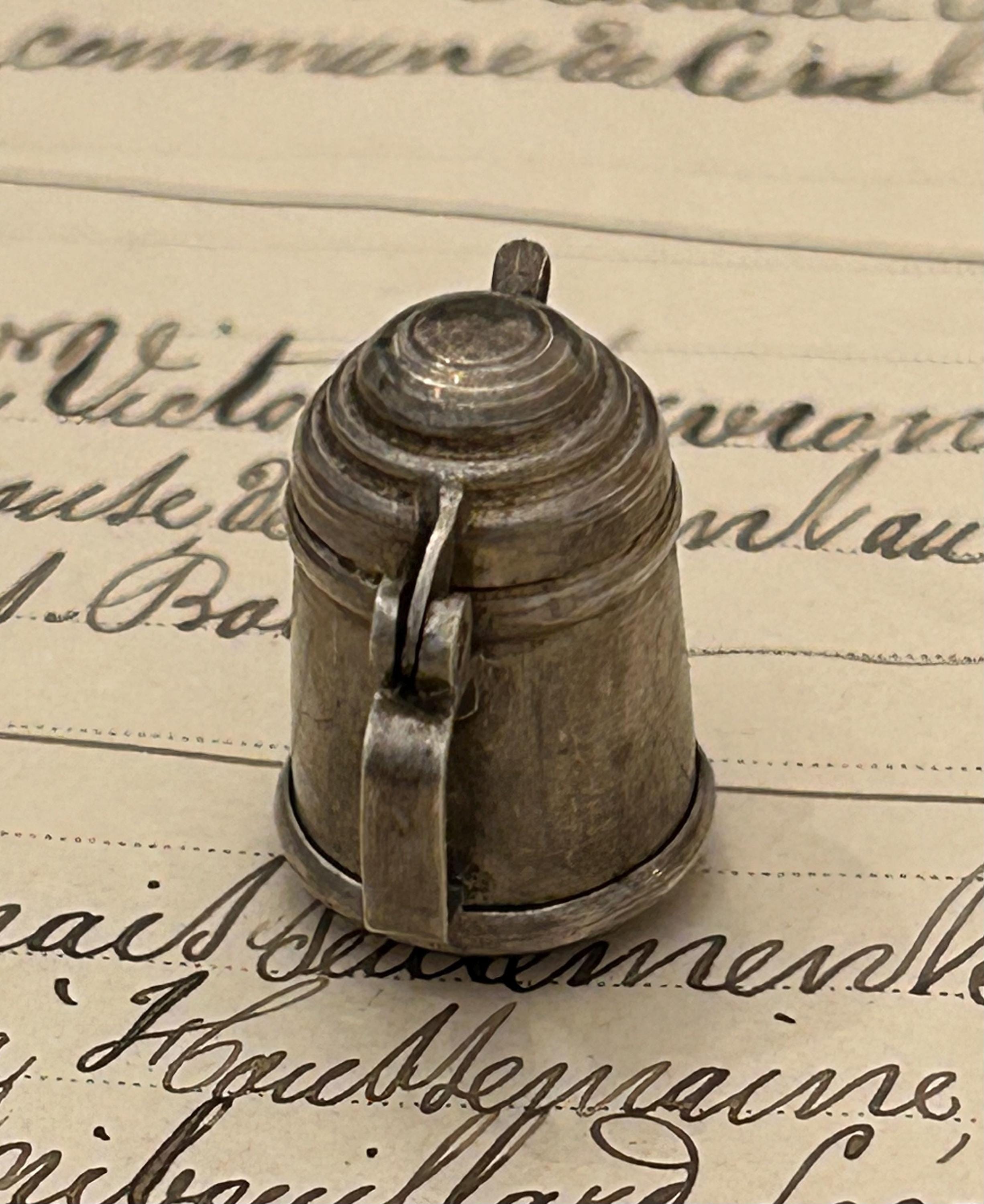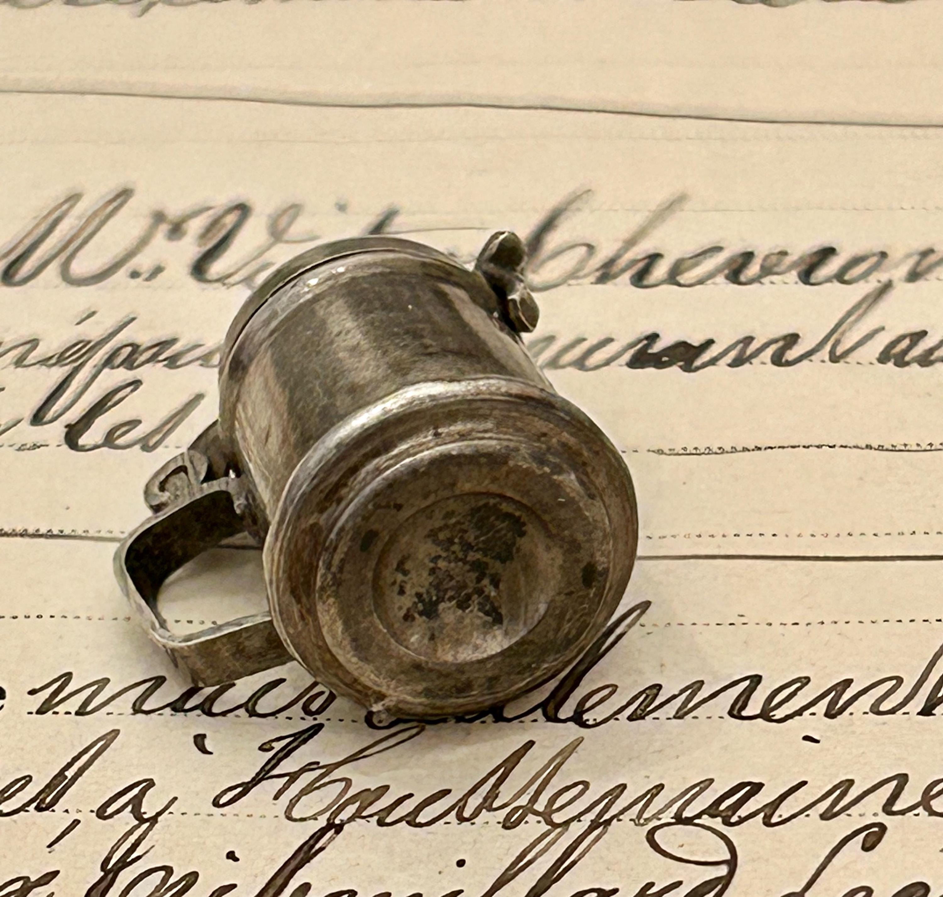 This rare miniature from France, which could possibly be worn as a charm (with a chain threaded through the stein's handle), features a hidden devil who springs up when the clasp on the stein is opened. The clasp and the spring function are in good working order. Dimensions are 2 cm x 1.8 cm. Please note there are no visible hallmarks or maker's mark so I don't know the silver, if any, composition. It could be comprised of only base medal, but my guess would be that it contains some silver.