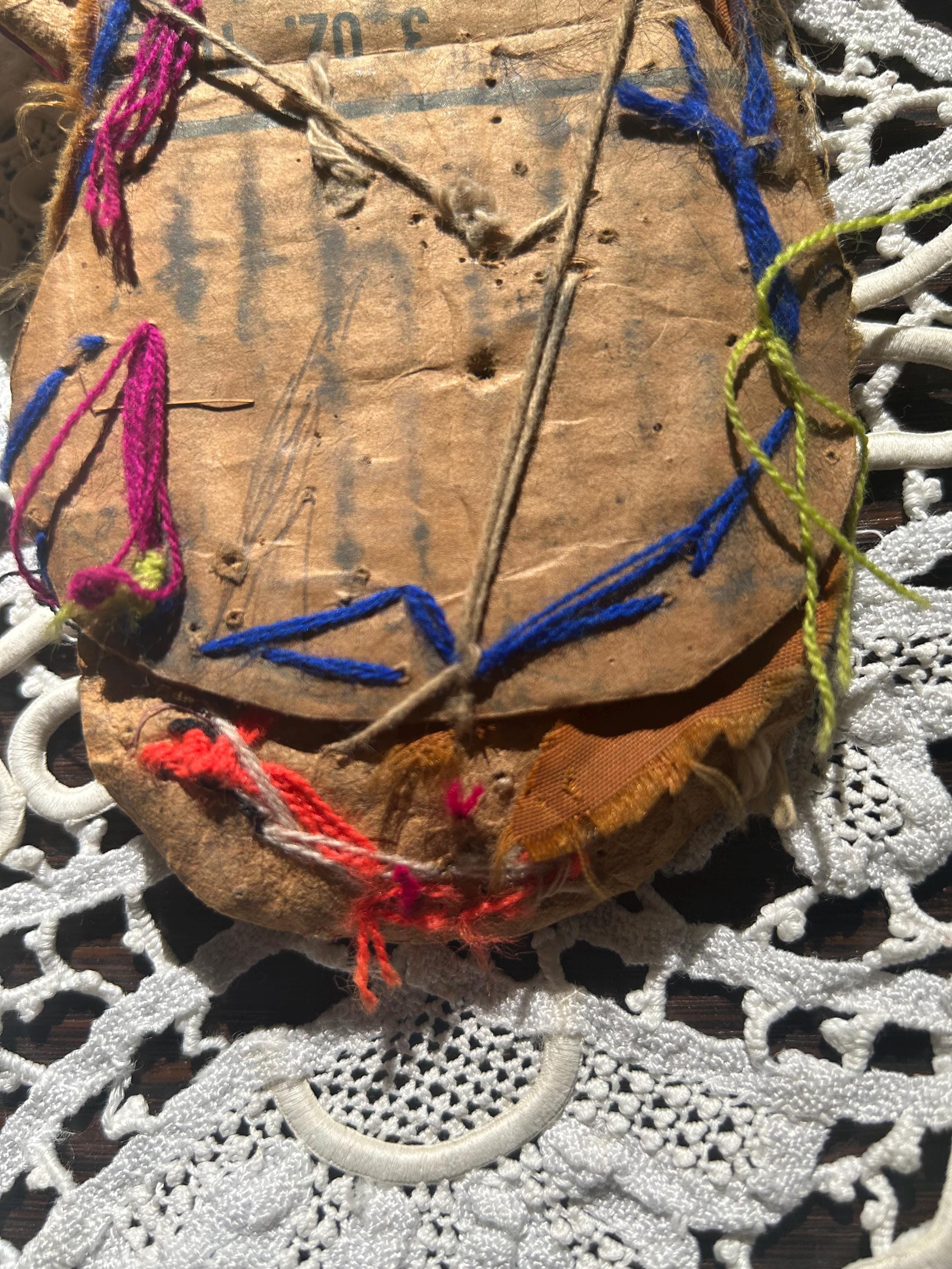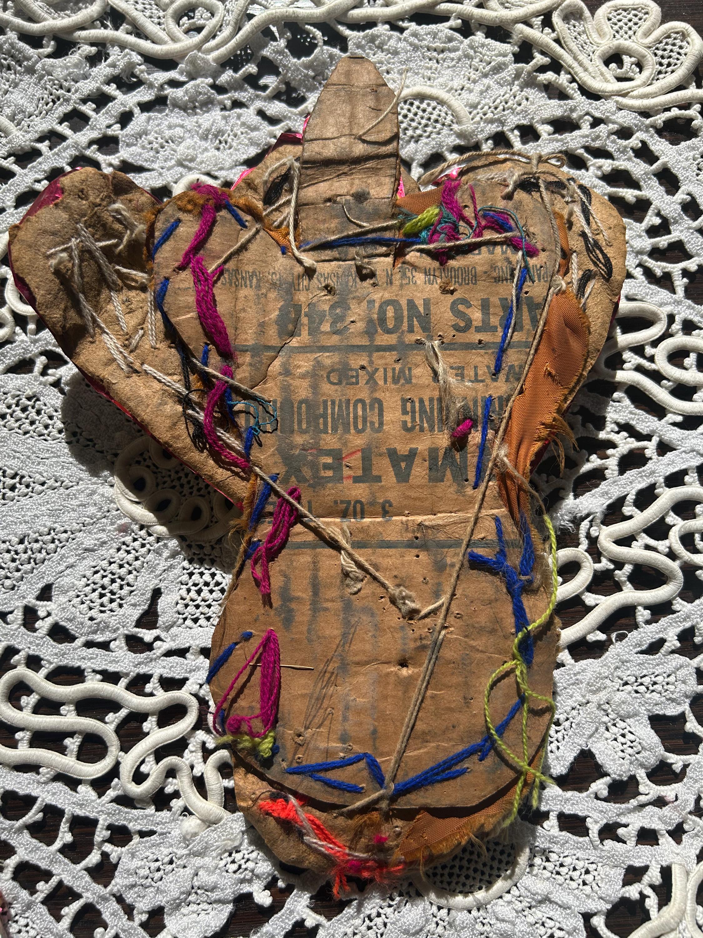 The piece is comprised of metal, plastic, fabric, paper, cardboard, and string.