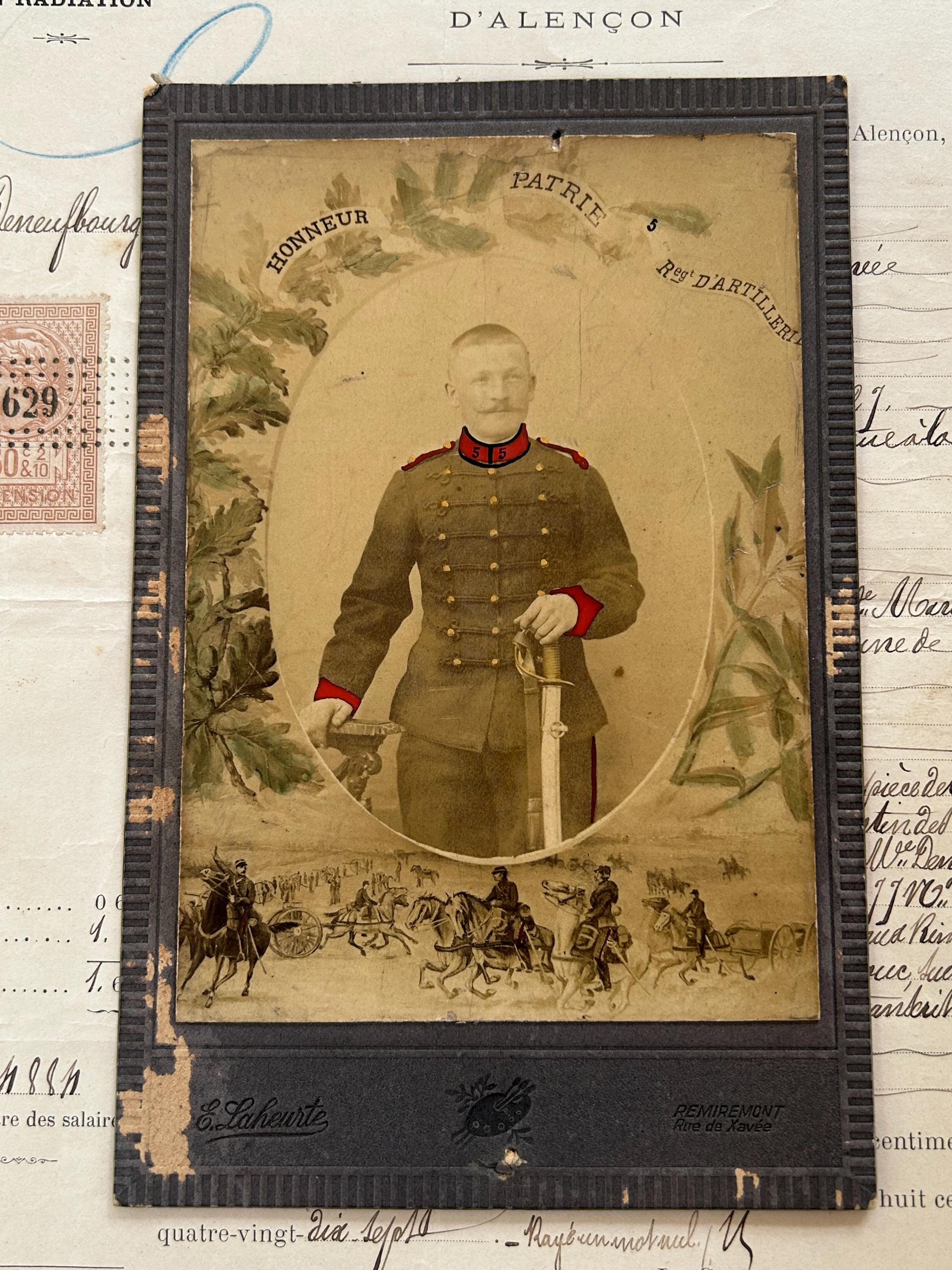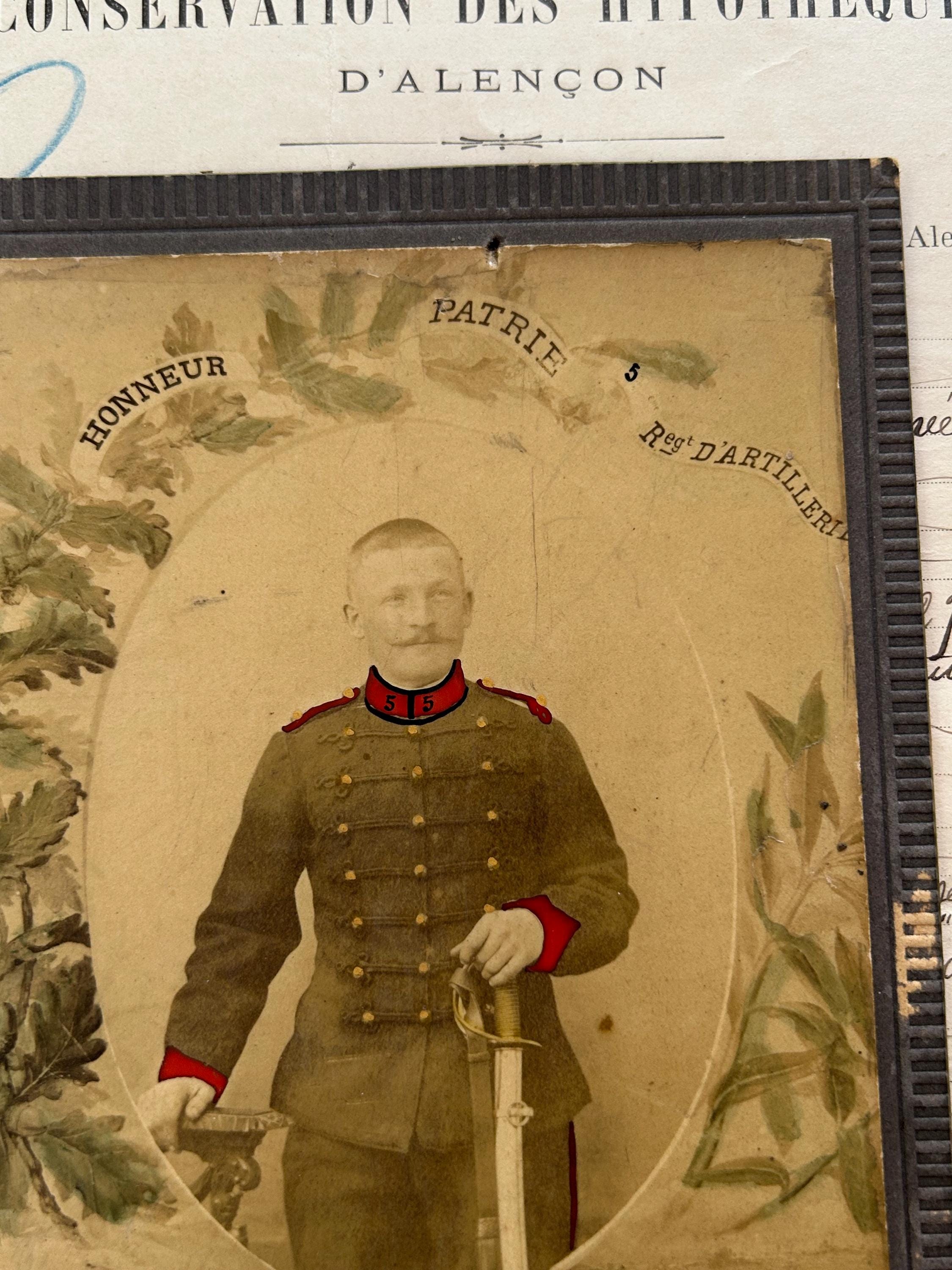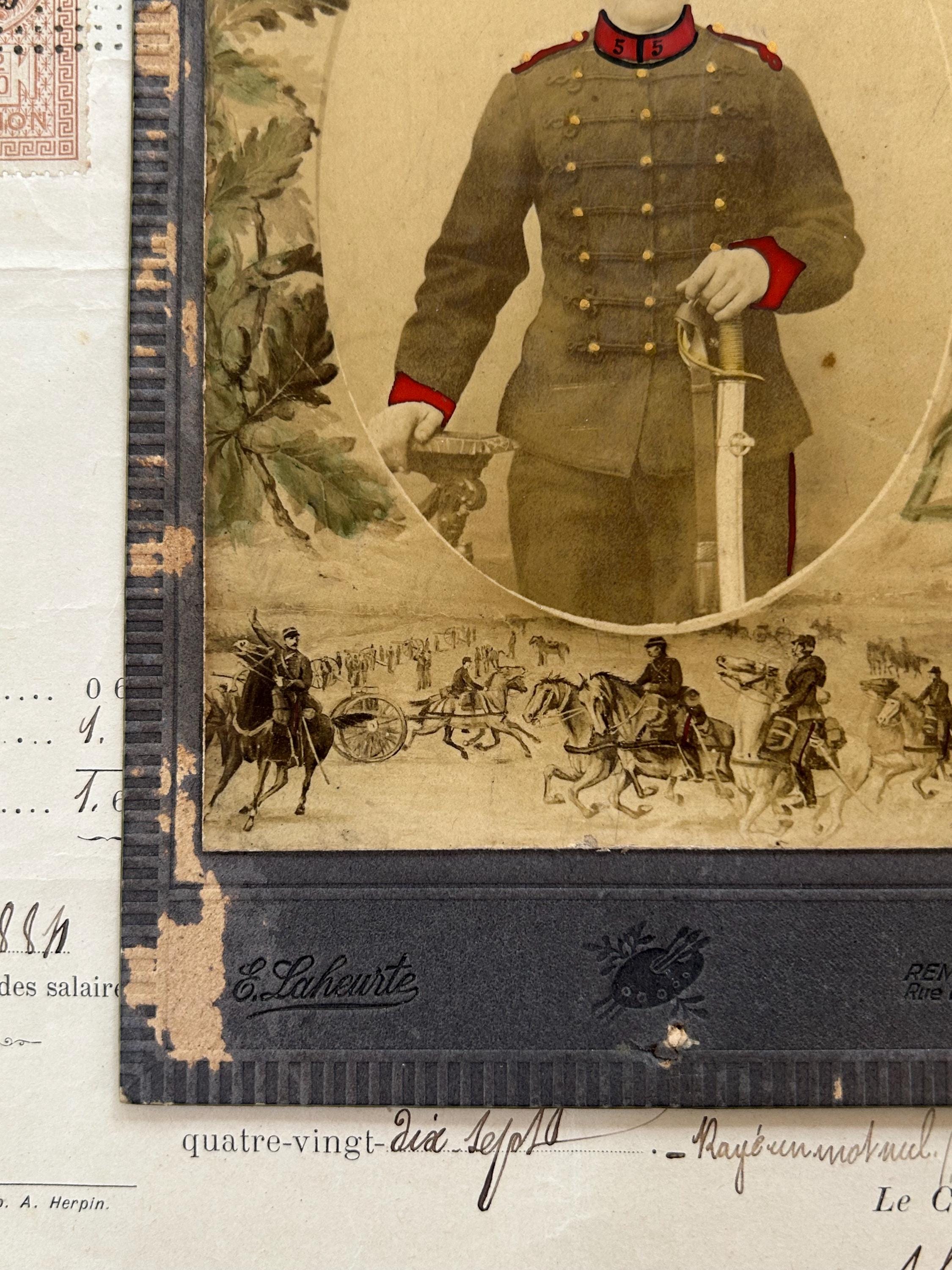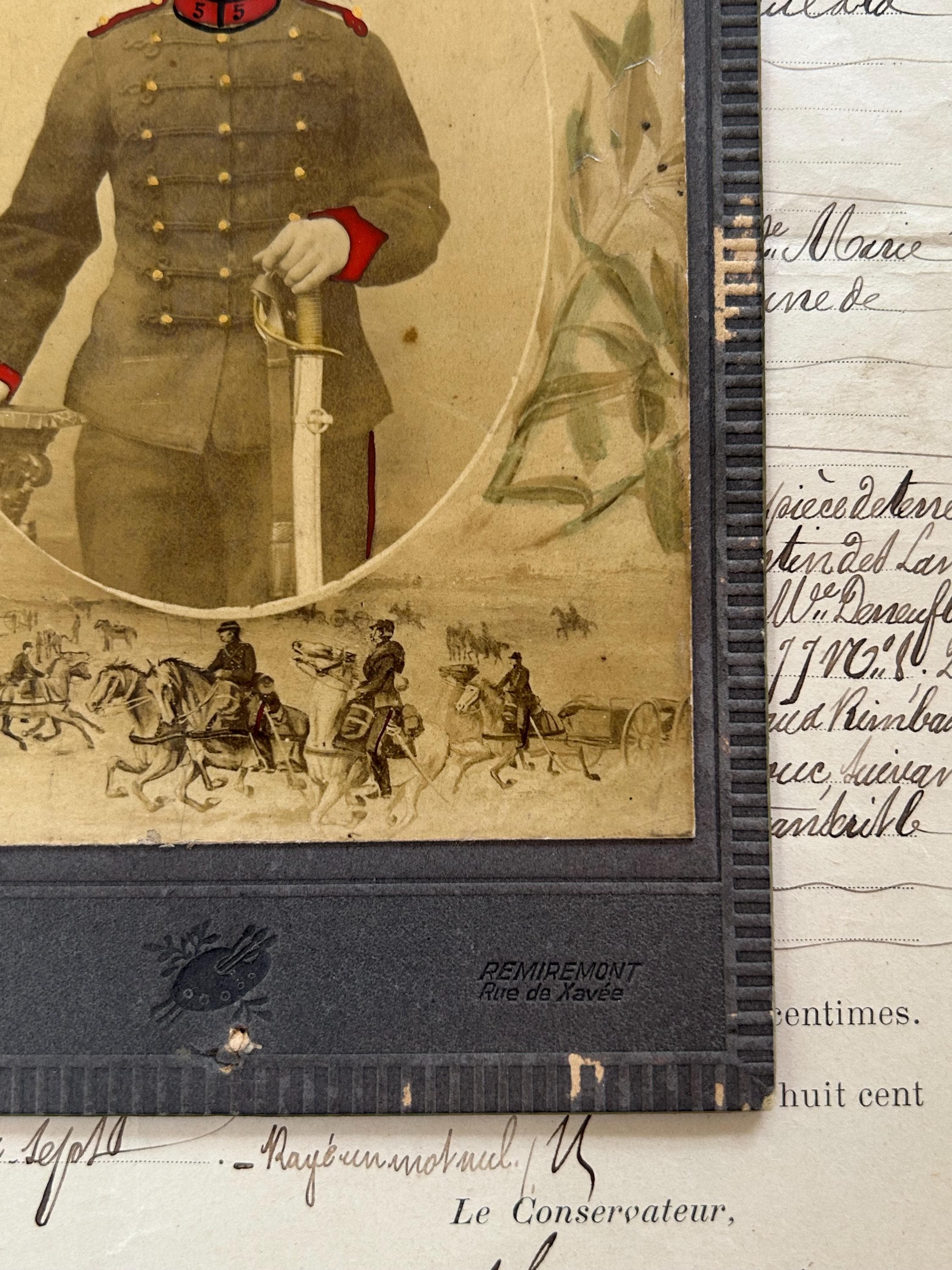 This 19th century cabinet card by E. Laheurte of Remiremont, France is hand-colored and depicts a French soldier of the 5th Artillery Regiment. While the photo is in fair condition, please note the damage to the surrounding border.