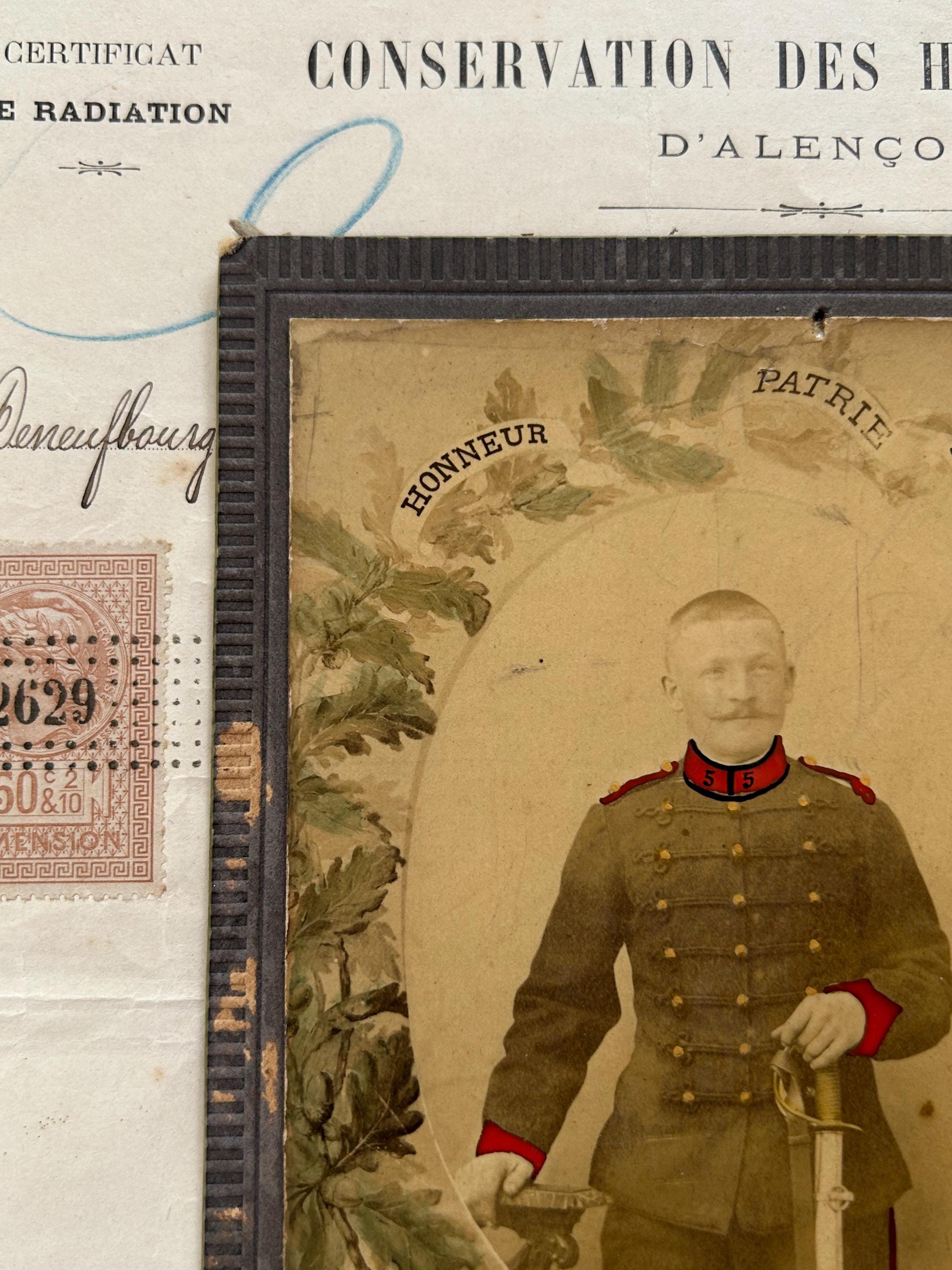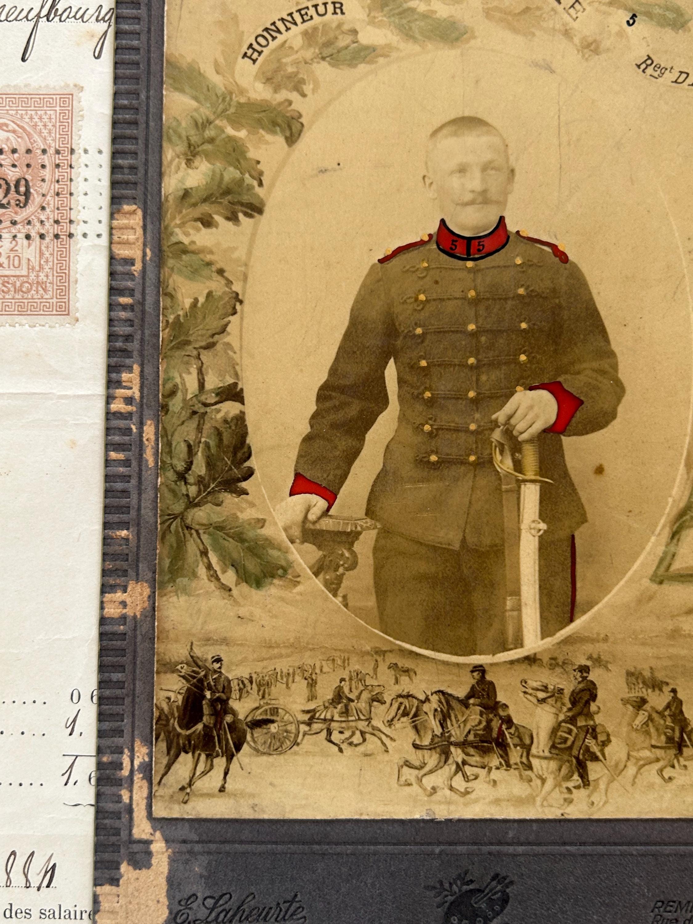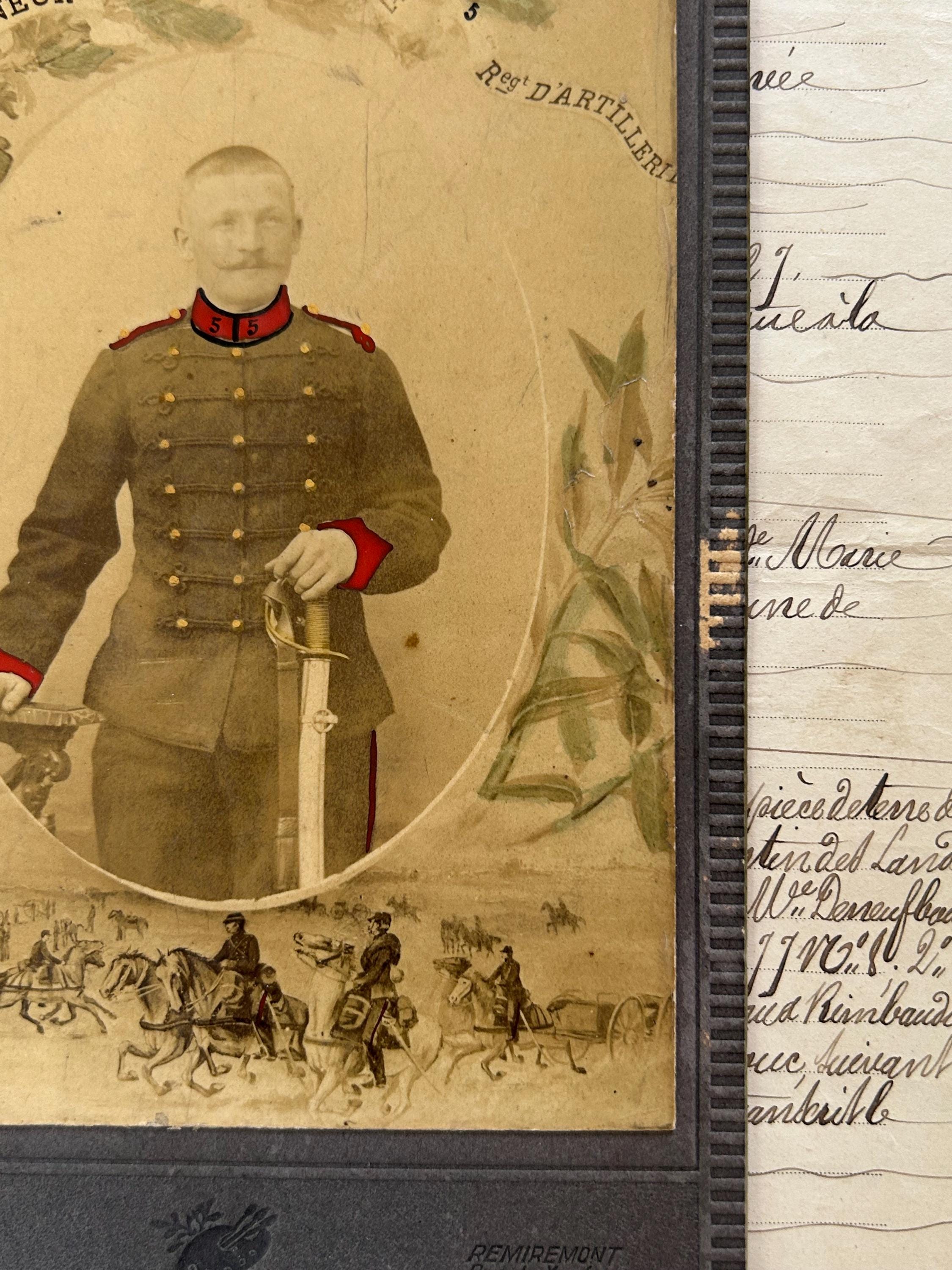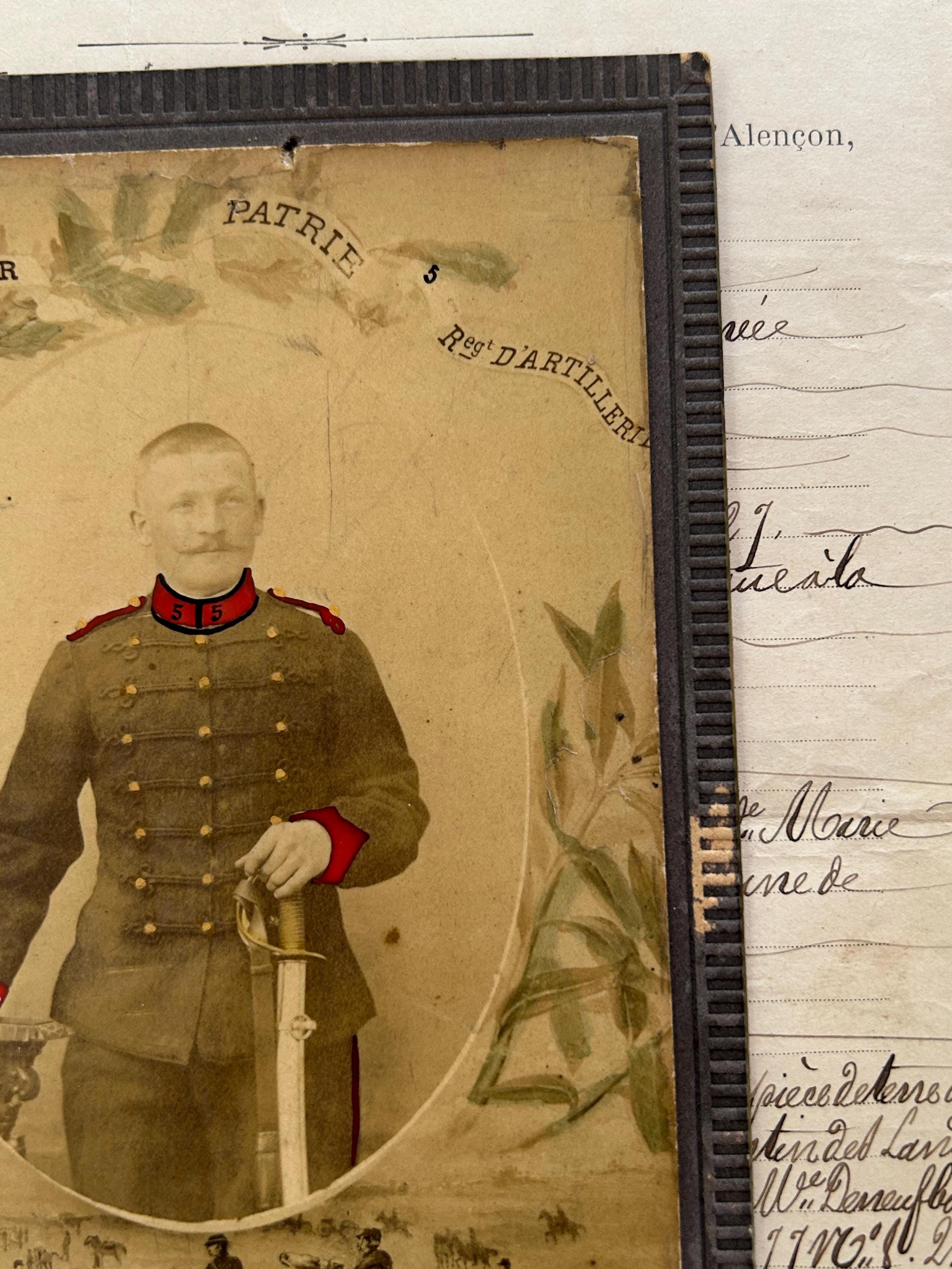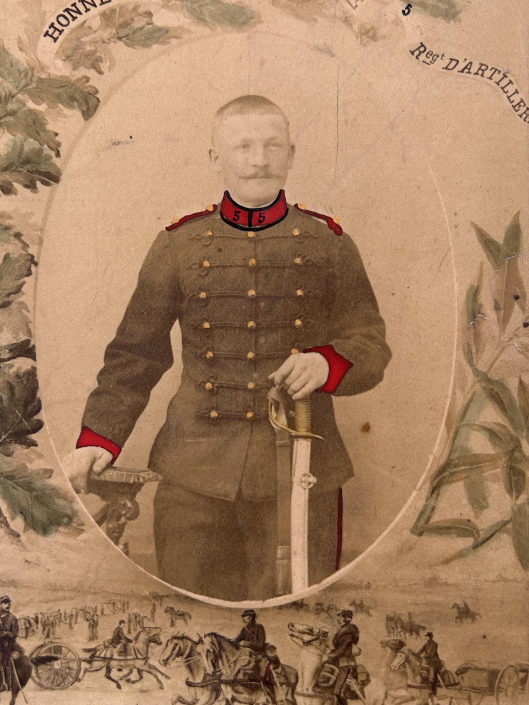 This 19th century cabinet card by E. Laheurte of Remiremont, France is hand-colored and depicts a French soldier of the 5th Artillery Regiment. While the photo is in fair condition, please note the damage to the surrounding border.