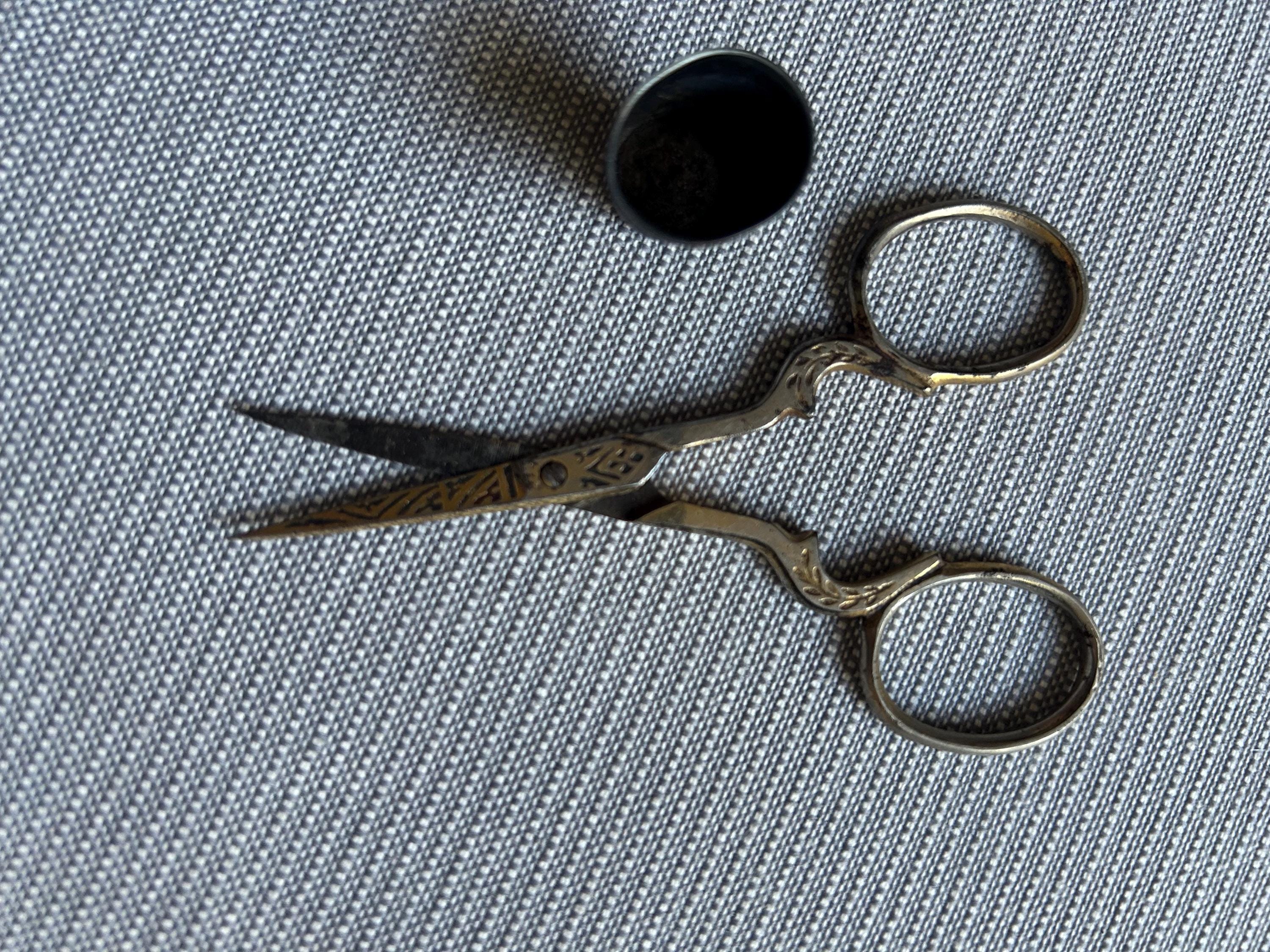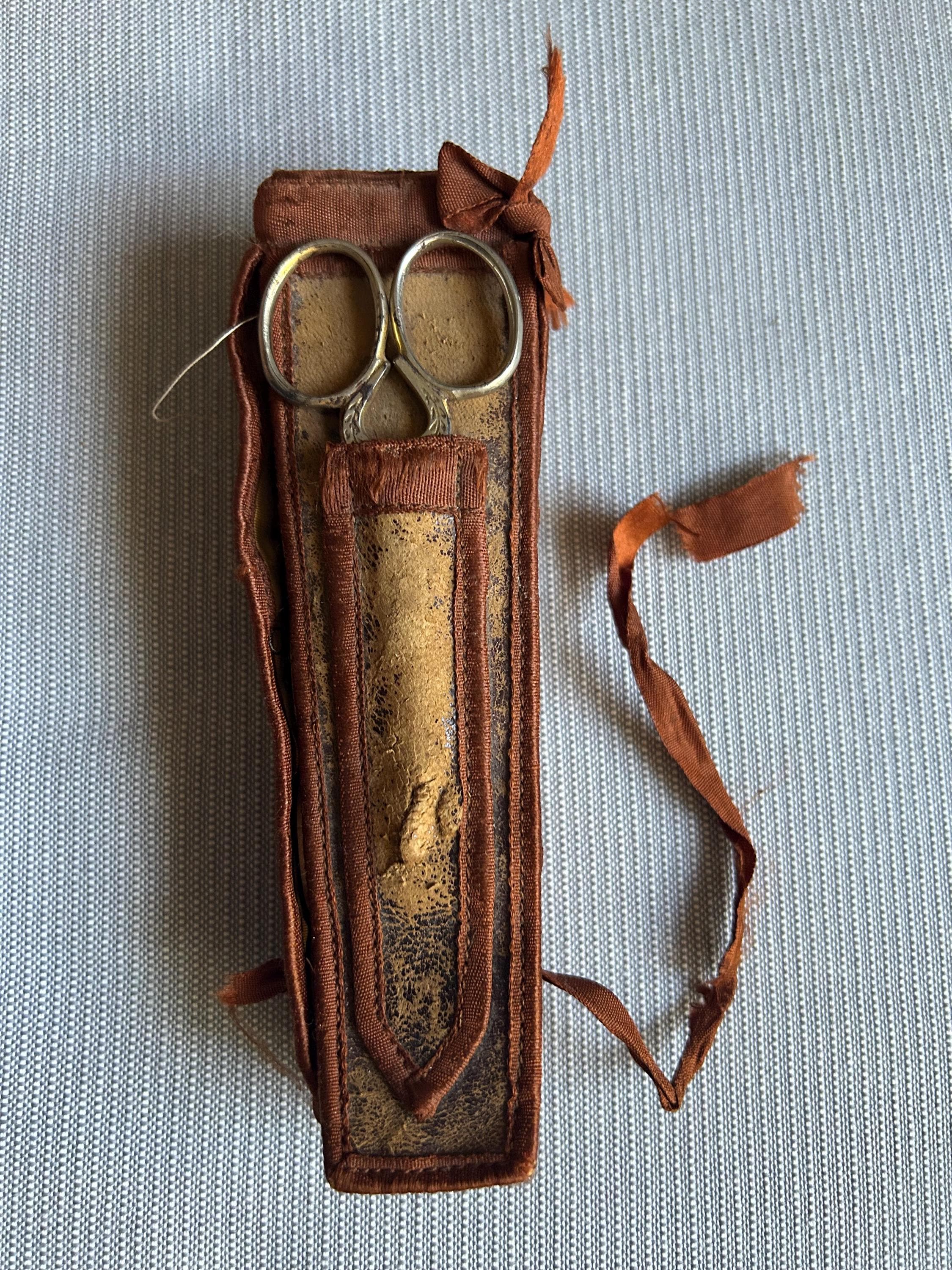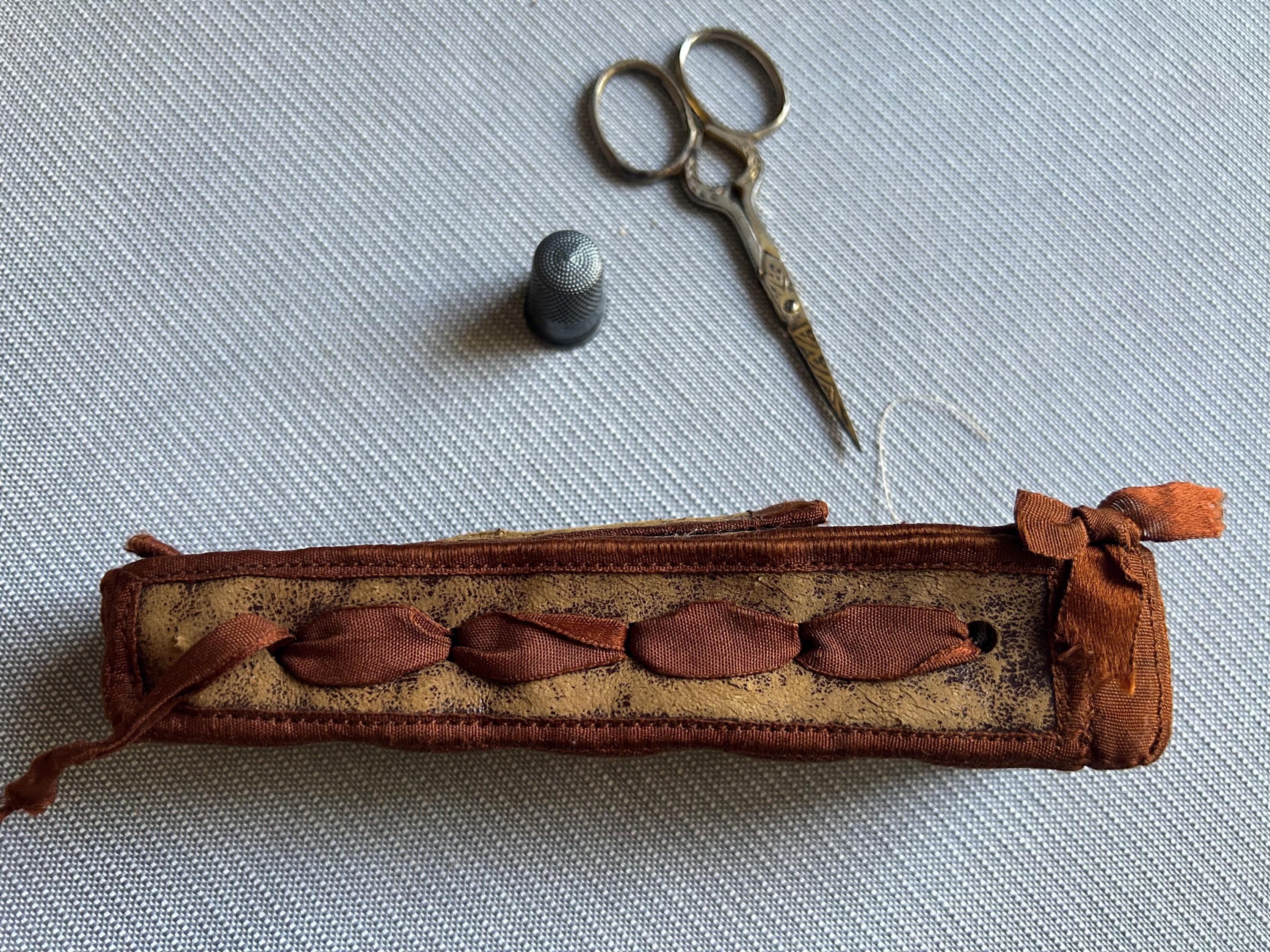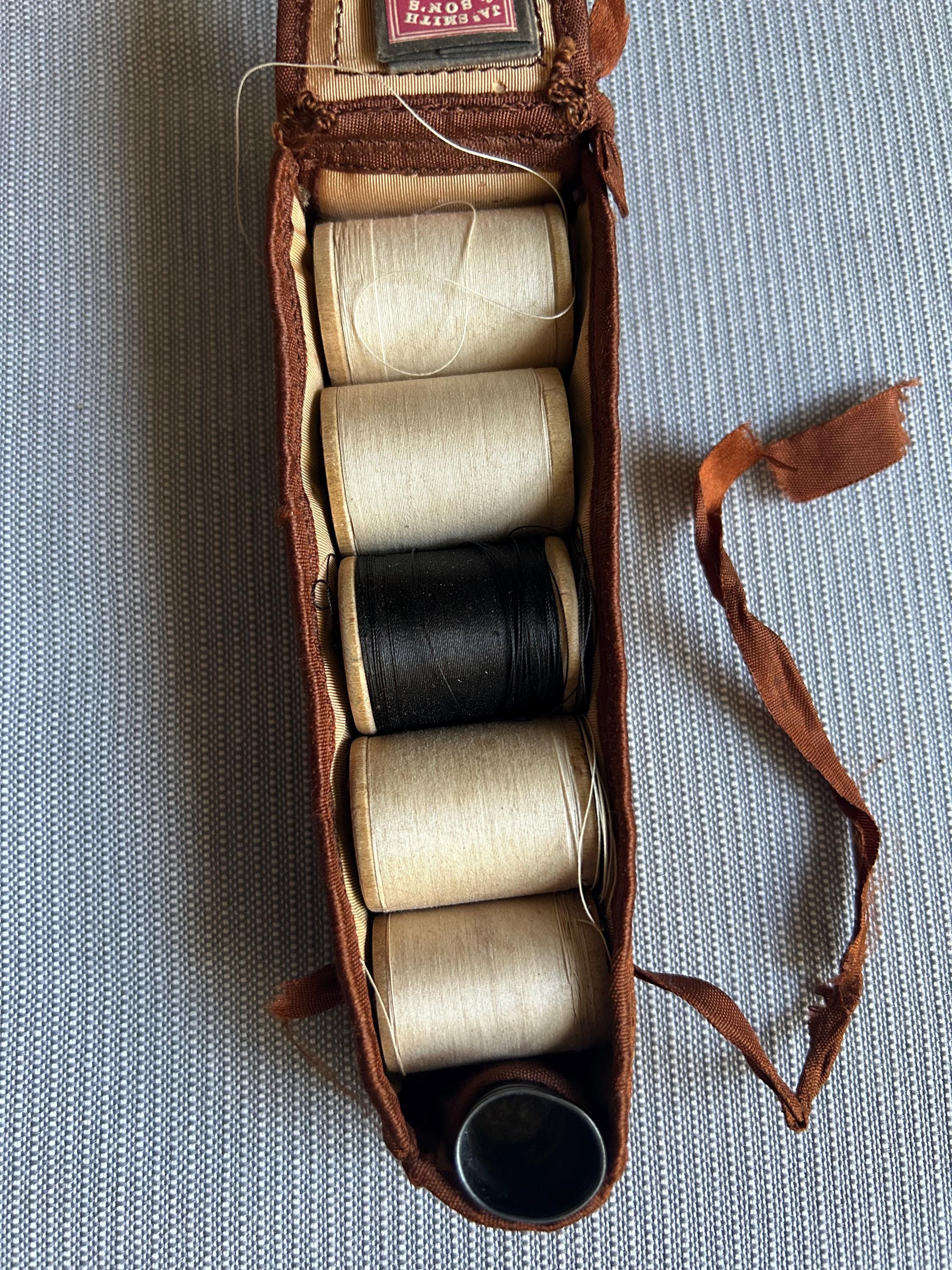 *****Condition: Please note that the leather exhibits heavy wear and discoloration. The last two photos show an area of the front of the casket (the scissors pocket) where the leather has a tear. The ribbon is frayed and worn, and a portion is missing where one end could have been tied with the other. The Toledo brand scissors have wear and pitting, and the thimble is misshapen. There are two packets of what appear to be unopened needles, sizes 7 and 8. The 9 pocket is empty. The spools have some unwound thread, which could be snipped or rolled back onto the spool, if one wishes to undertake this.