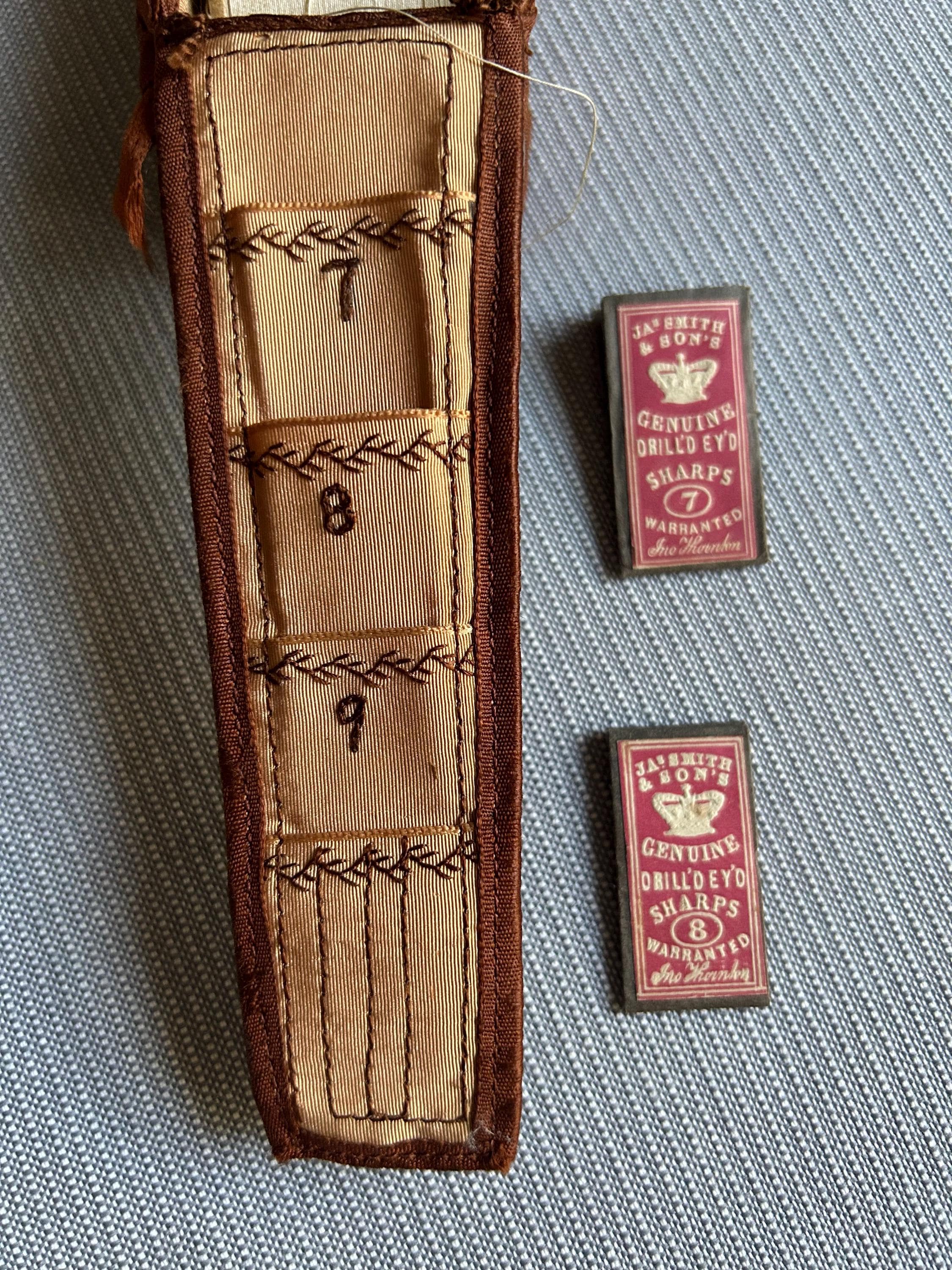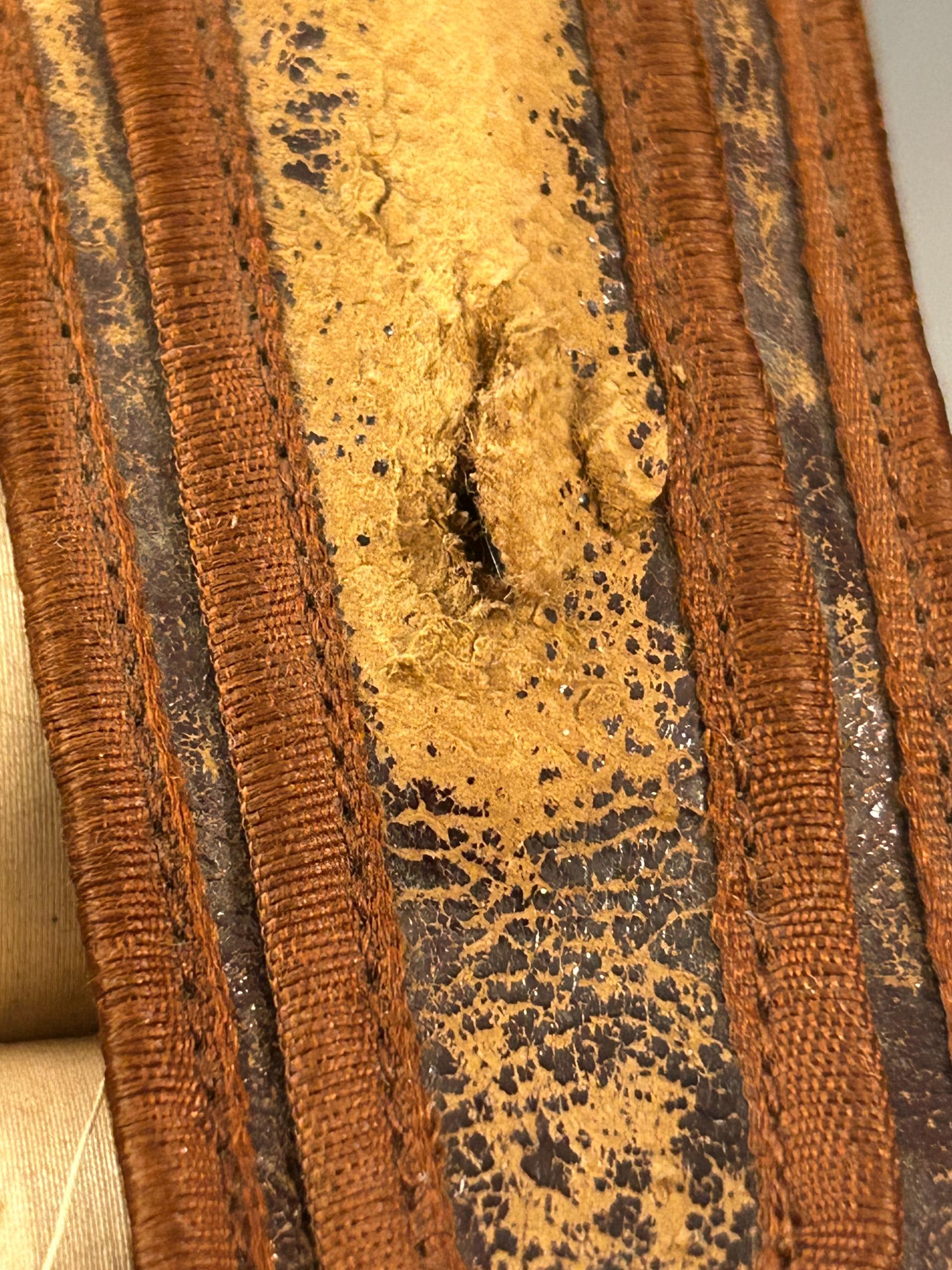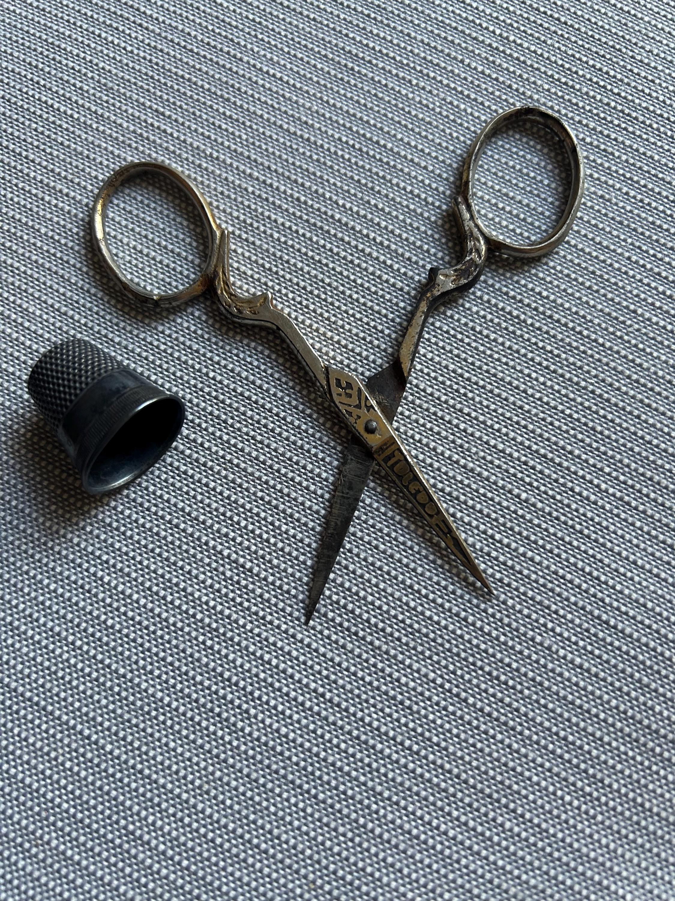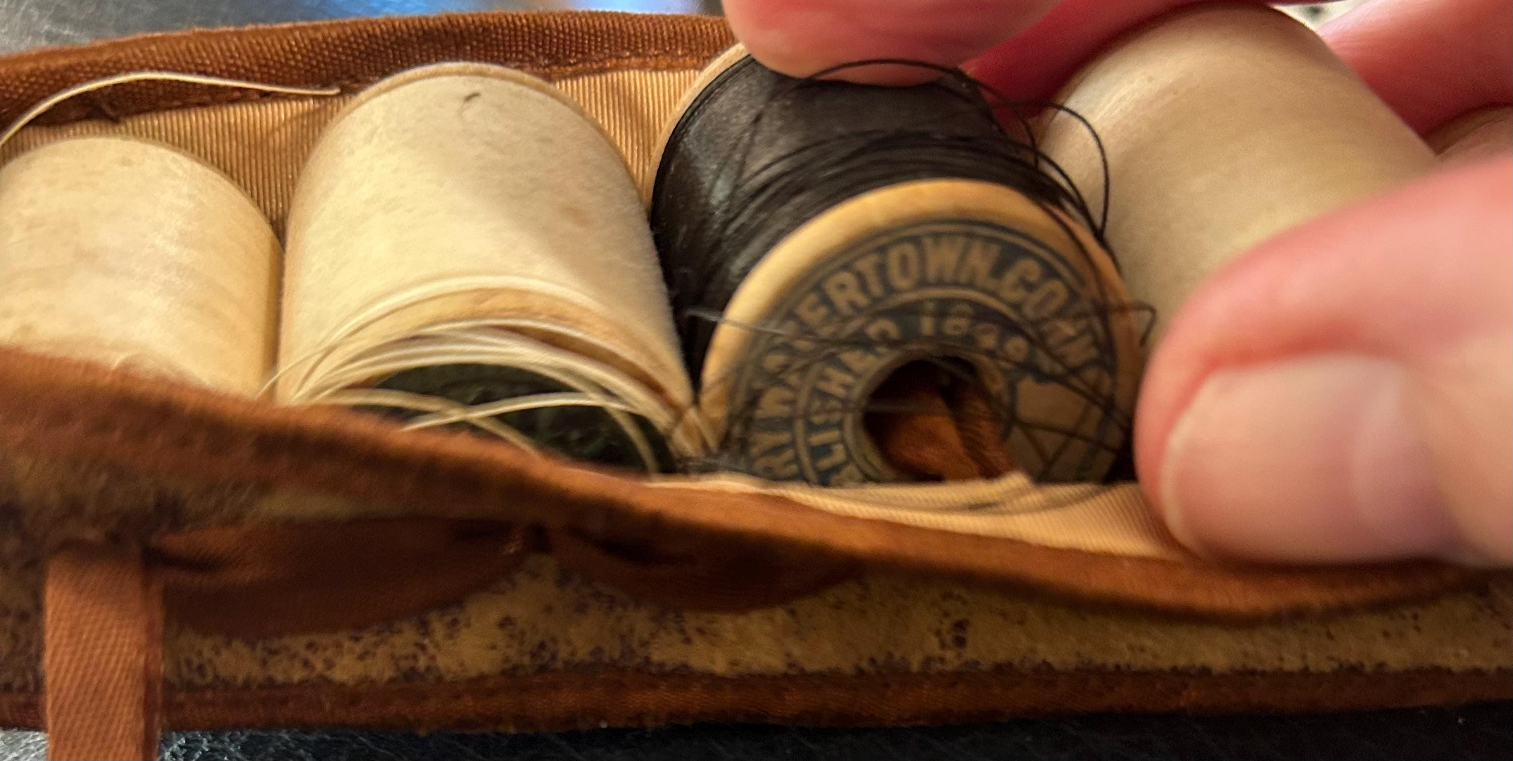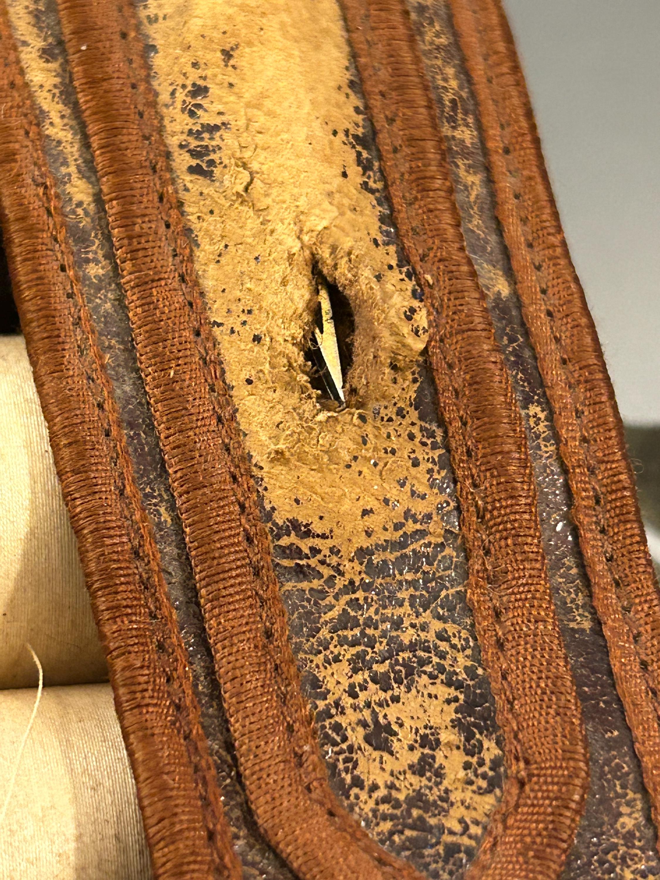 *****Condition: Please note that the leather exhibits heavy wear and discoloration. The last two photos show an area of the front of the casket (the scissors pocket) where the leather has a tear. The ribbon is frayed and worn, and a portion is missing where one end could have been tied with the other. The Toledo brand scissors have wear and pitting, and the thimble is misshapen. There are two packets of what appear to be unopened needles, sizes 7 and 8. The 9 pocket is empty. The spools have some unwound thread, which could be snipped or rolled back onto the spool, if one wishes to undertake this.