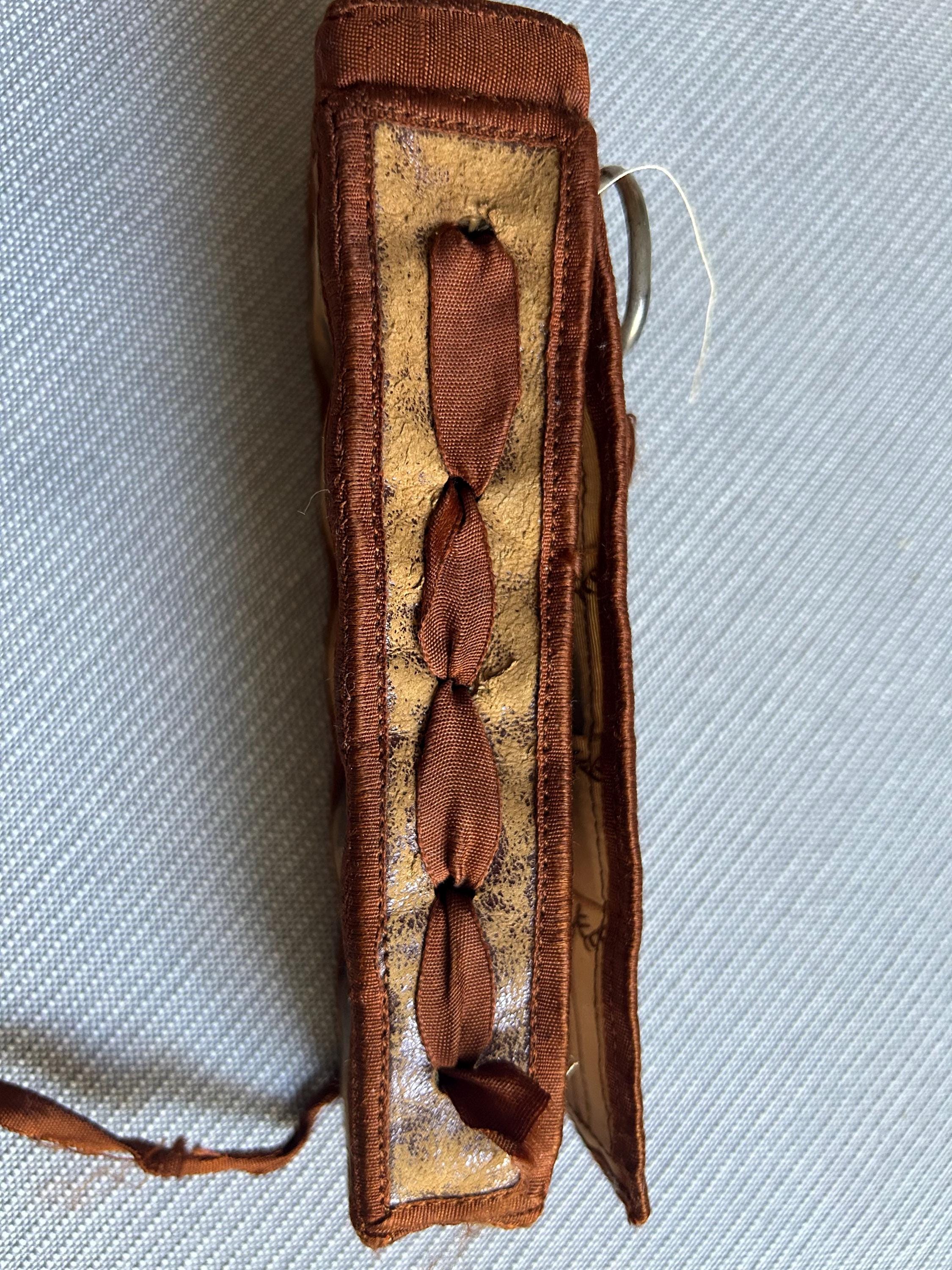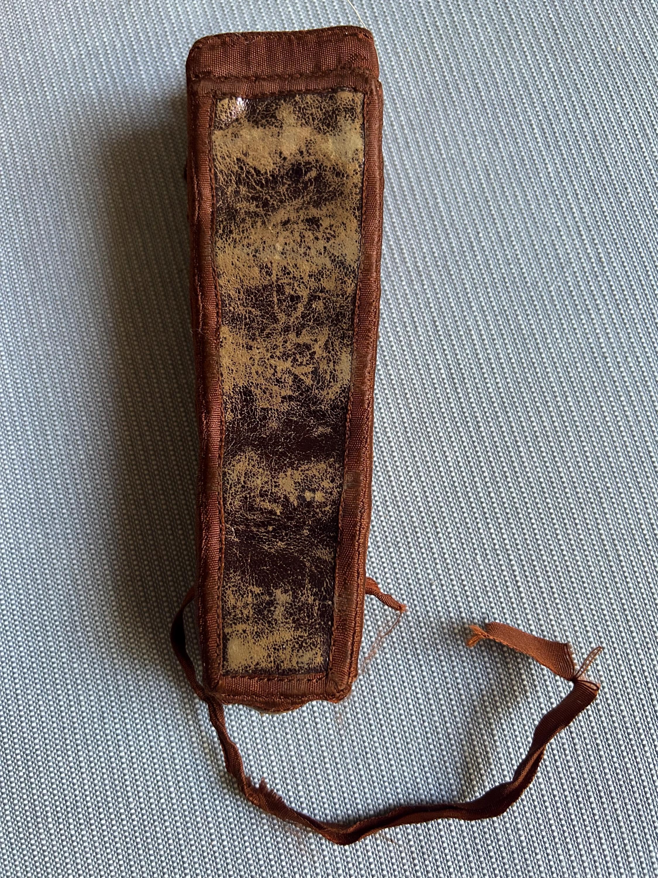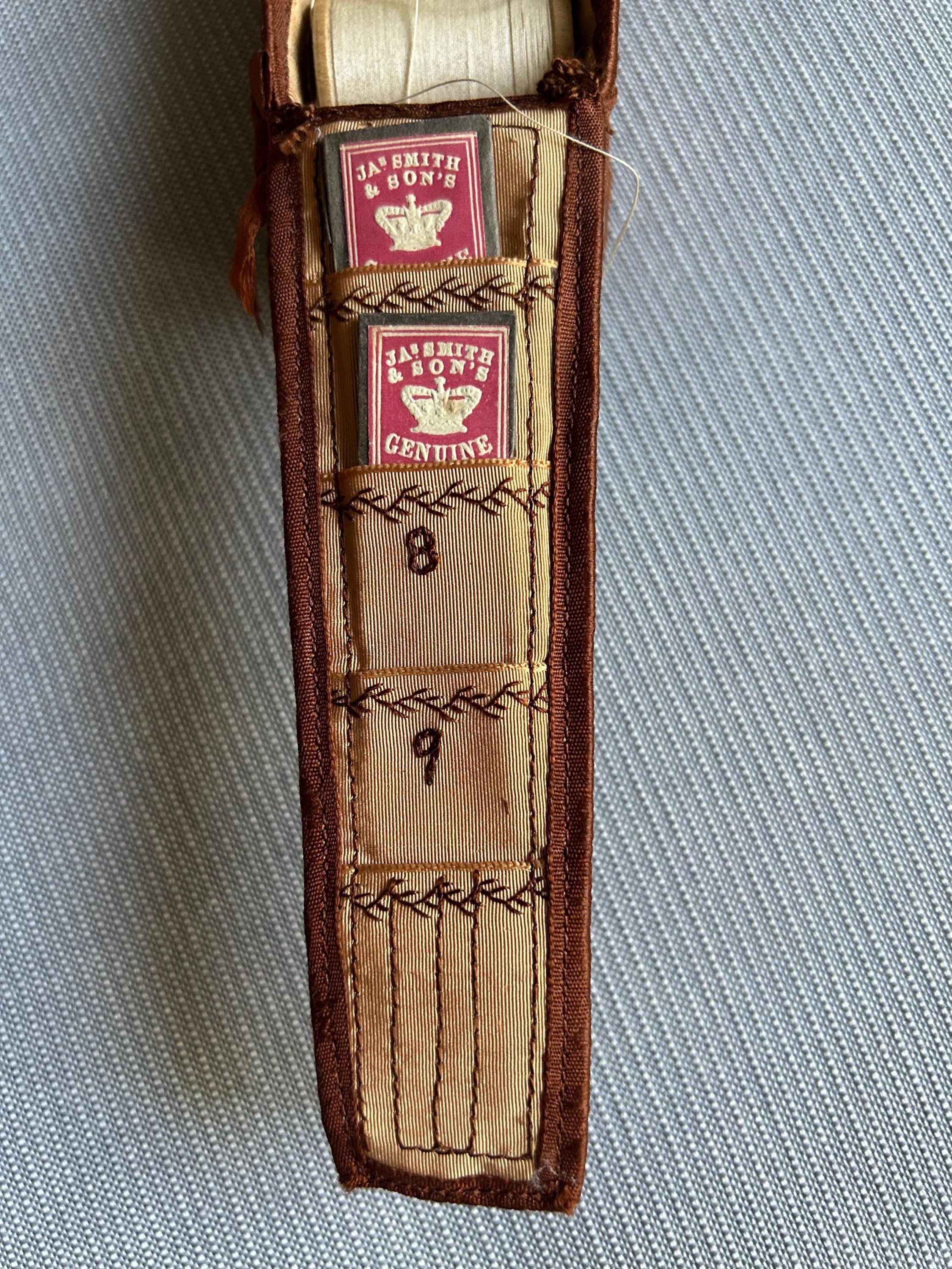 This antique leather sewing casket with hand-sewn interior embellishments on the fabric portion that holds needle packets is late 19th, early 20th century. It measures approximately 6" x 1.75" at its widest. The craftsmanship is a hallmark of Shaker design. The five spools of thread are ingeniously attached to the threaded ribbons on both exterior sides so that all one has to do to sew is pull the end of thread and not remove the entire spool.