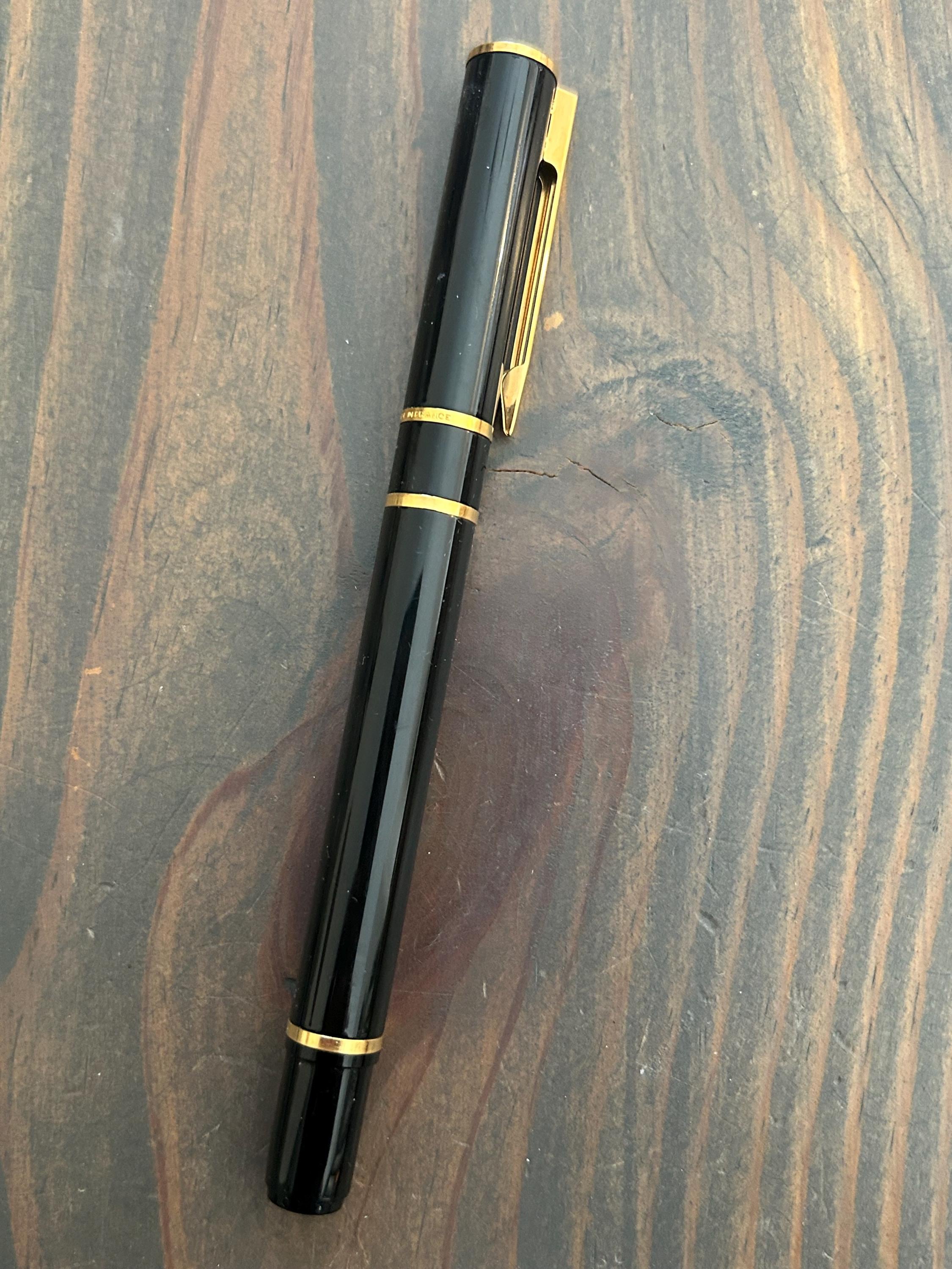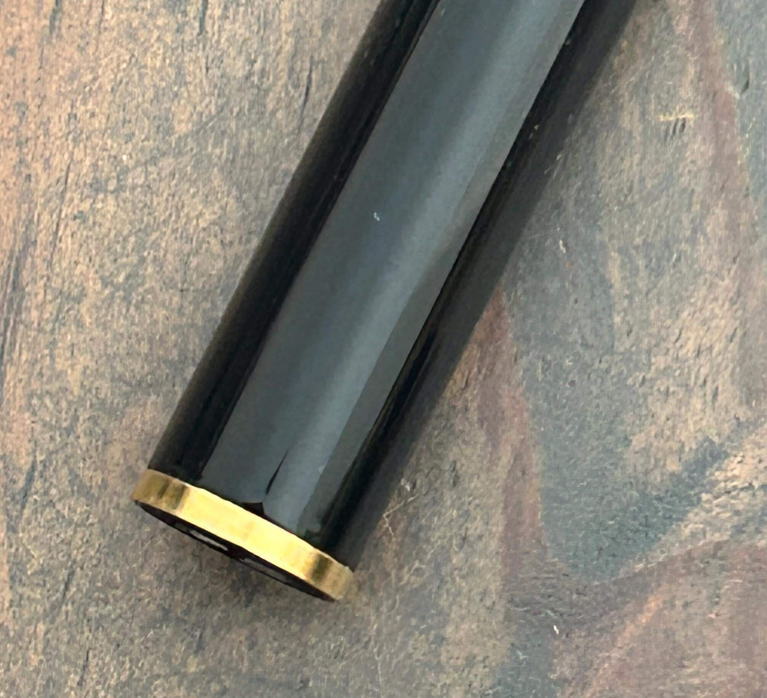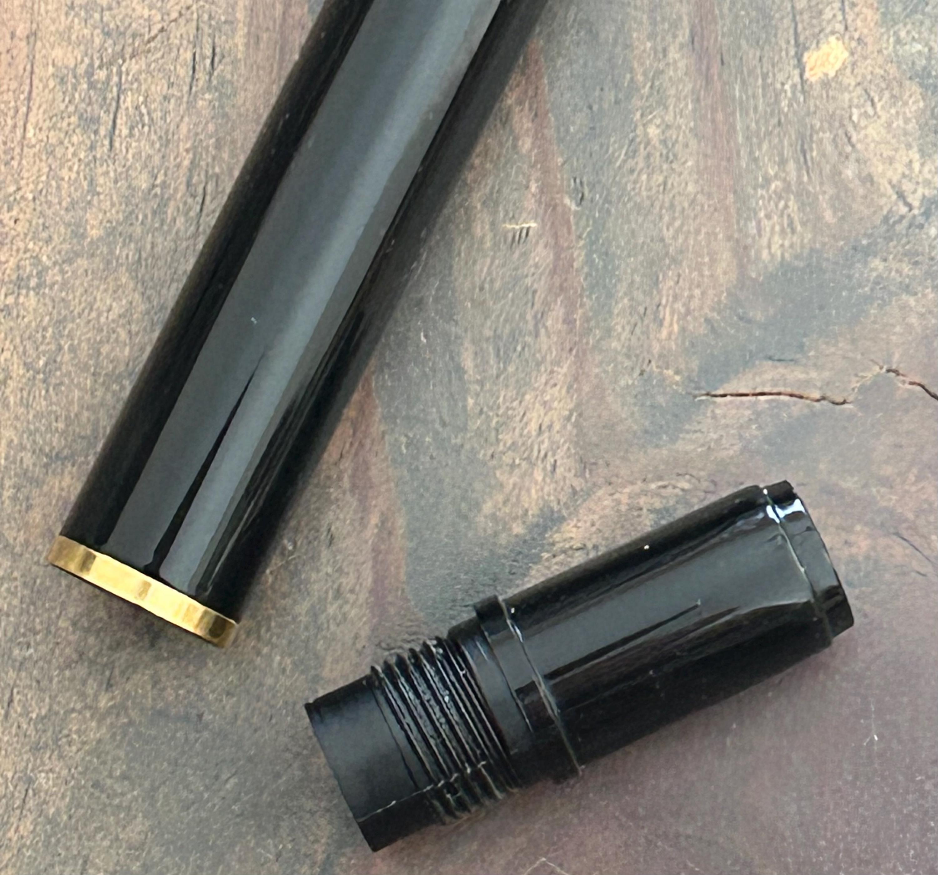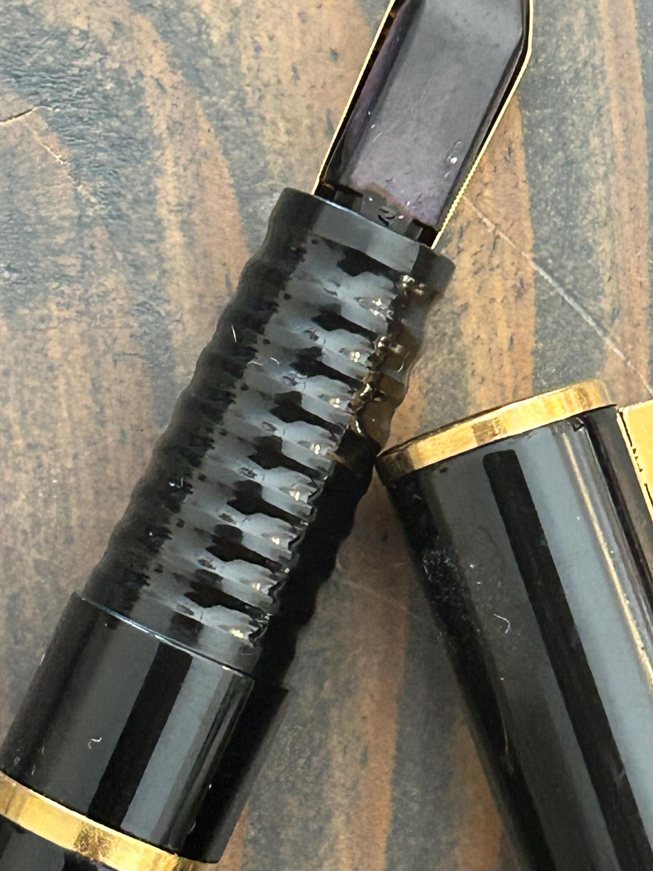 The pen has a snap on/off cap. The cap does spin freely after it is clipped, and this is a feature (and not a sign of damage) of the Laureat I. The Laureat II has a cap that snaps on and off but does not spin. Still, the cap on this Laureat I is secure once it is snapped on. It will not loosen, and the pen does not leak. The clip has the Waterman logo. The first cap band has "Waterman" and "Made in France" engraved on it. The body of the pen is brass covered black lacquer. The blind cap on the end of the barrel unscrews but this doesn't expose a filling mechanism, as some blind caps do. It is only to be able to see within the barrel of the pen, which takes a Waterman cartridge or cartridge converter, if you prefer to use bottled ink. The blind cap underside has the Waterman logo and "France" imprinted on it. The nib is gold-plated steel with "Waterman," "France" and "F" (for fine) on it. The section is black plastic with black concentric rings, and an ink cartridge or cartridge converter is inserted in the section. The feed of the pen on the Laureat I is smooth and ridged on the Laureat II.