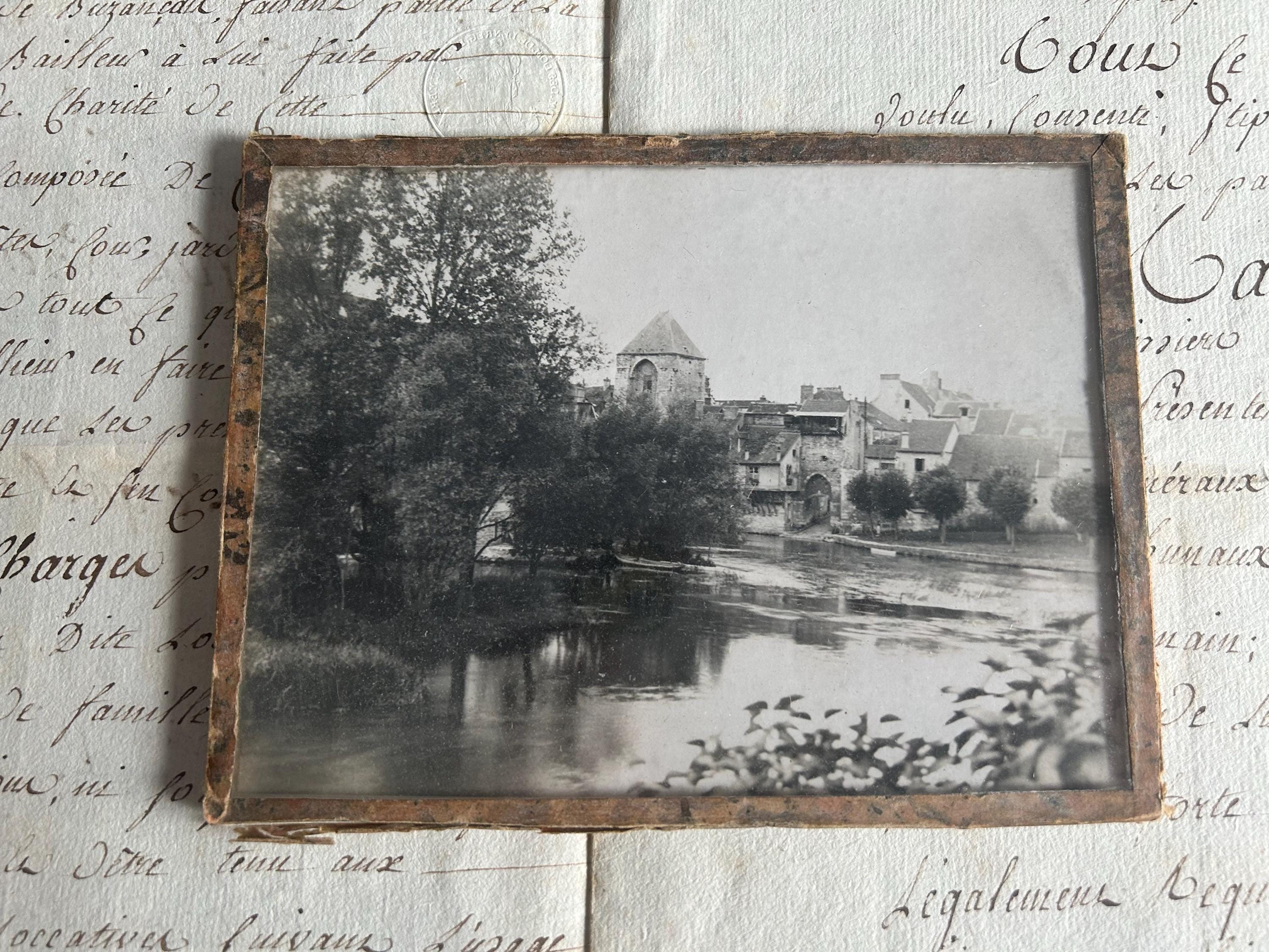 This vintage, possibly antique, photo behind glass with what look to be taped edges could be of Moret-sur-Loing, a French medieval town located in the Seine-et-Marne department. The photo was purchased at the Marché aux Puces de Vanves and measures 6.5" x 5".