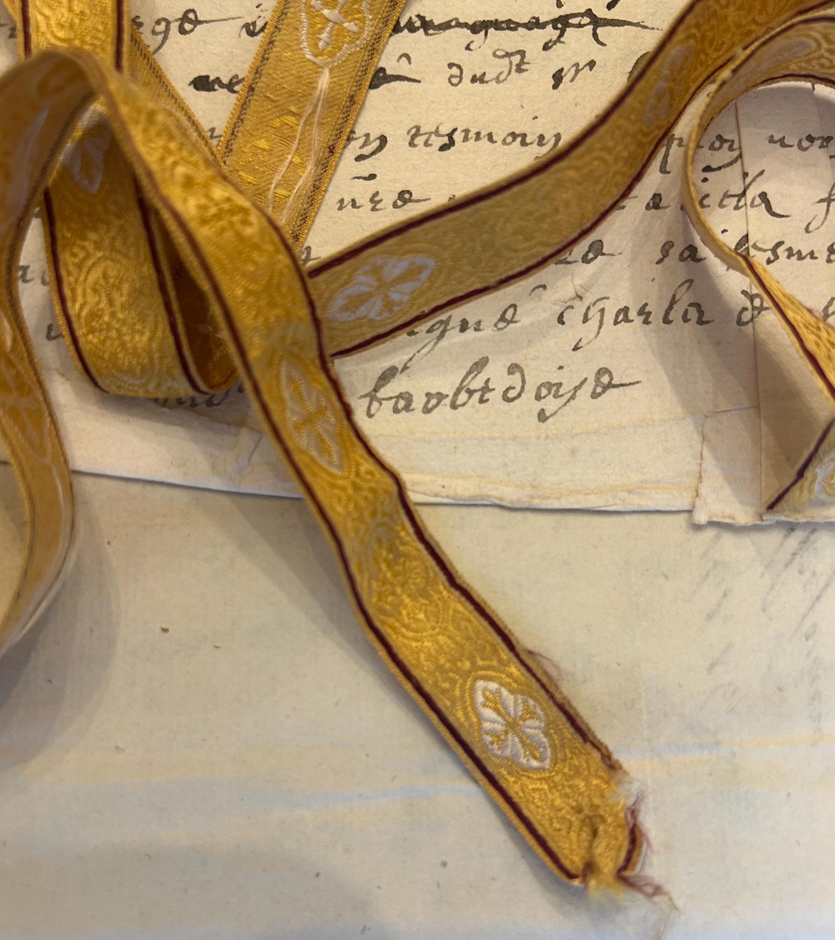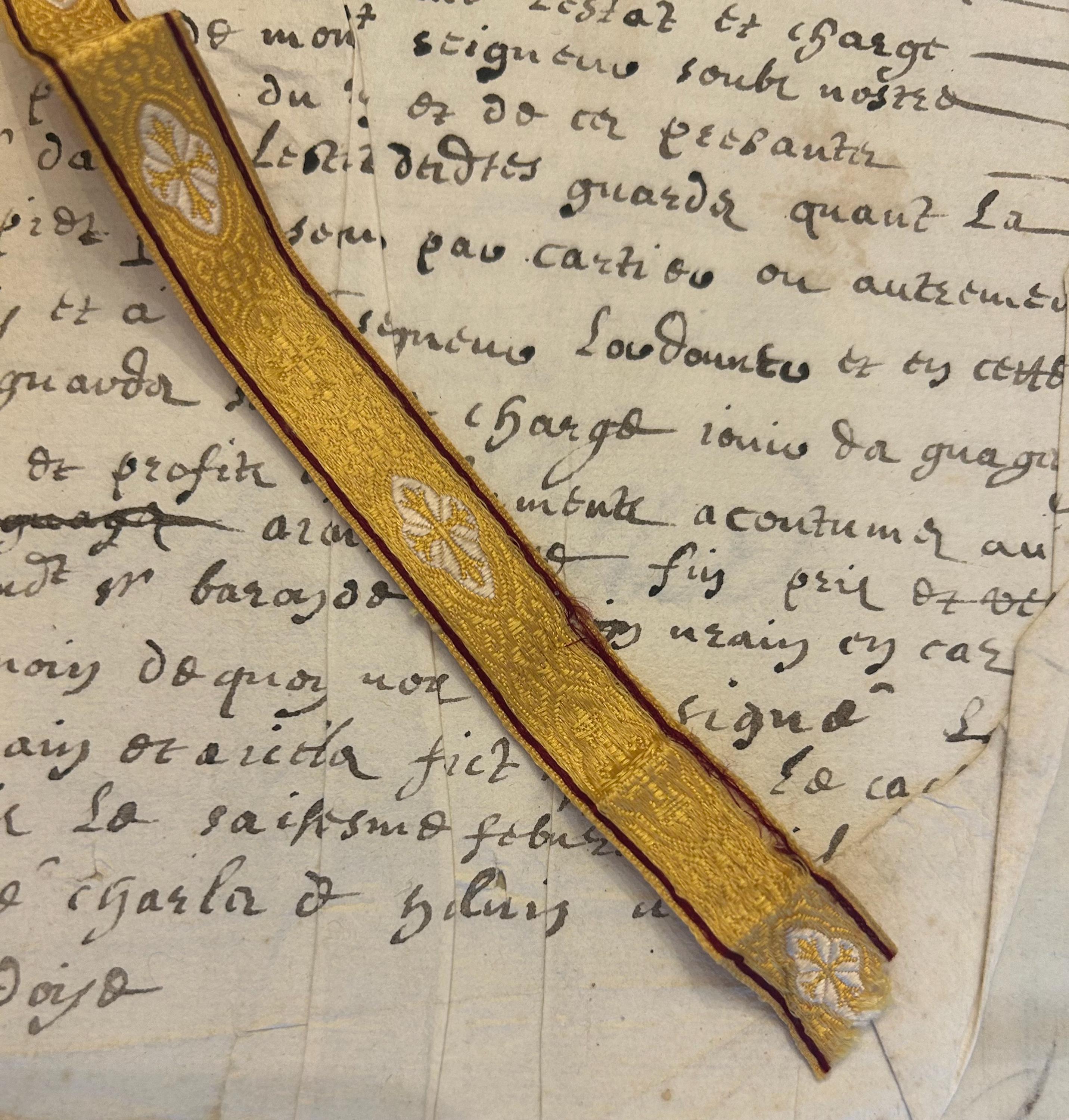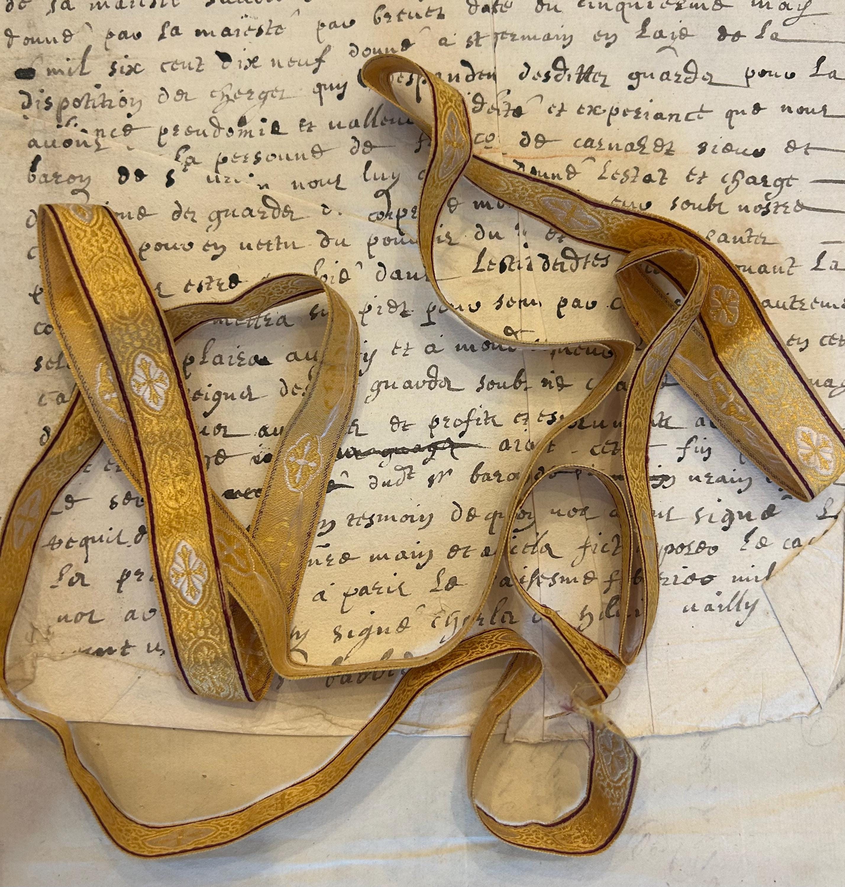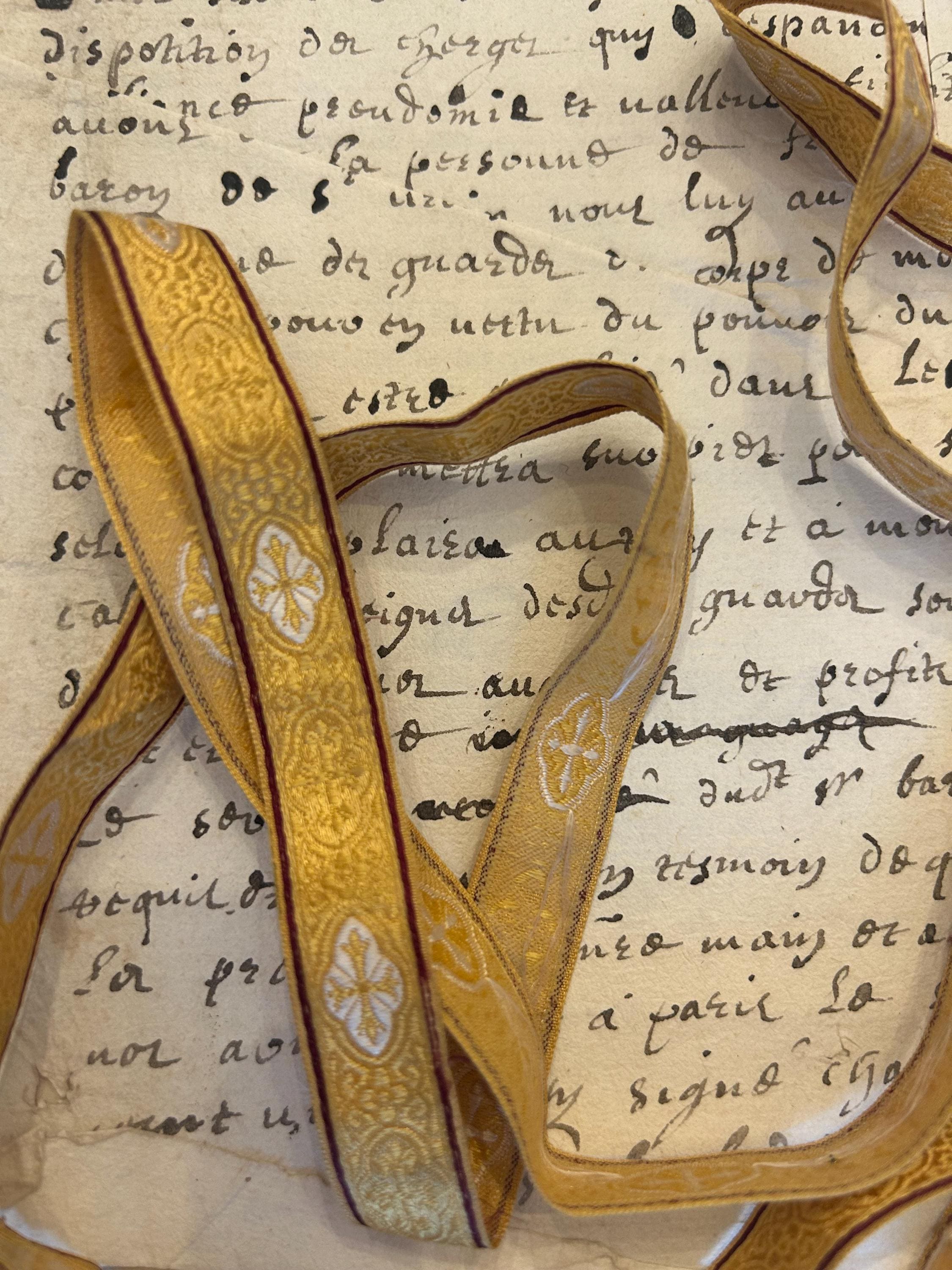 This passementerie from France measures 1.3 m x 1 cm. It is in good condition with a bit of fraying on each end. I believe it to be silk. Colors are gold, white, and red.