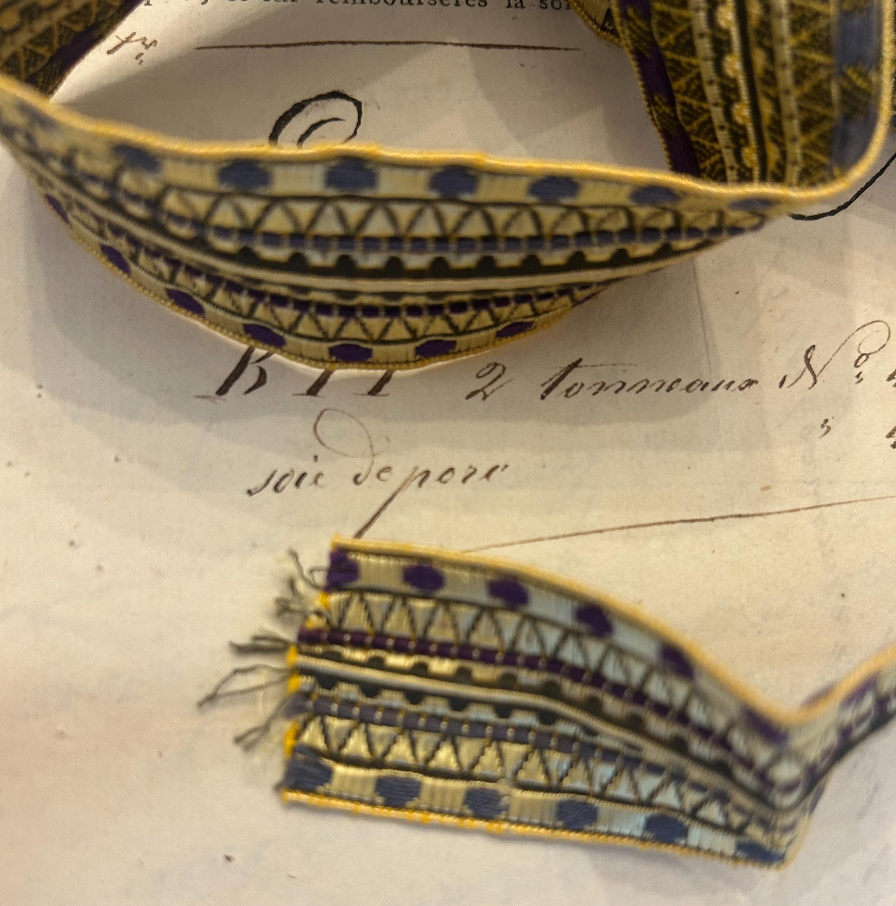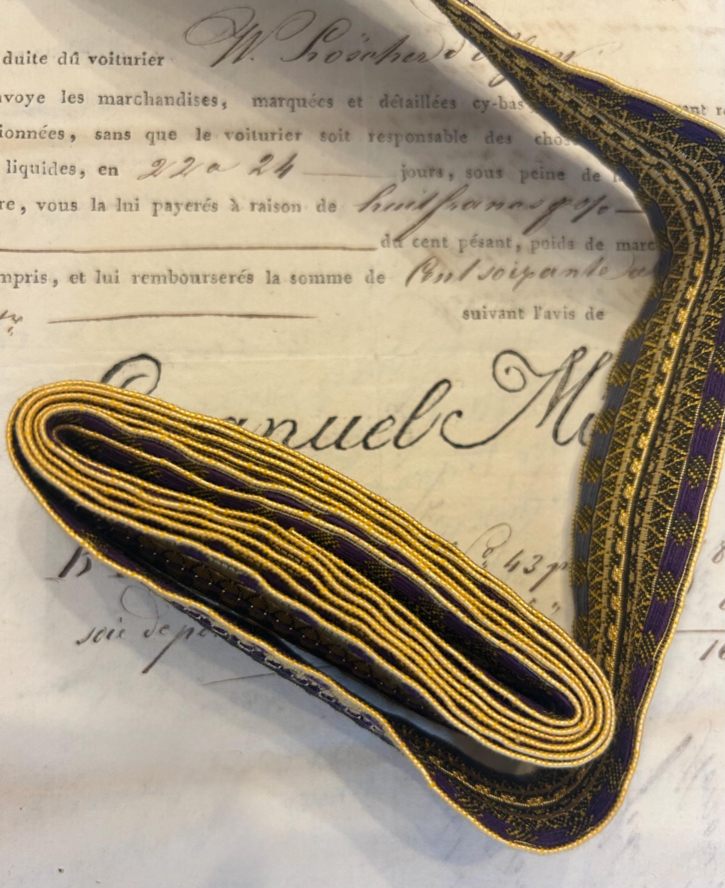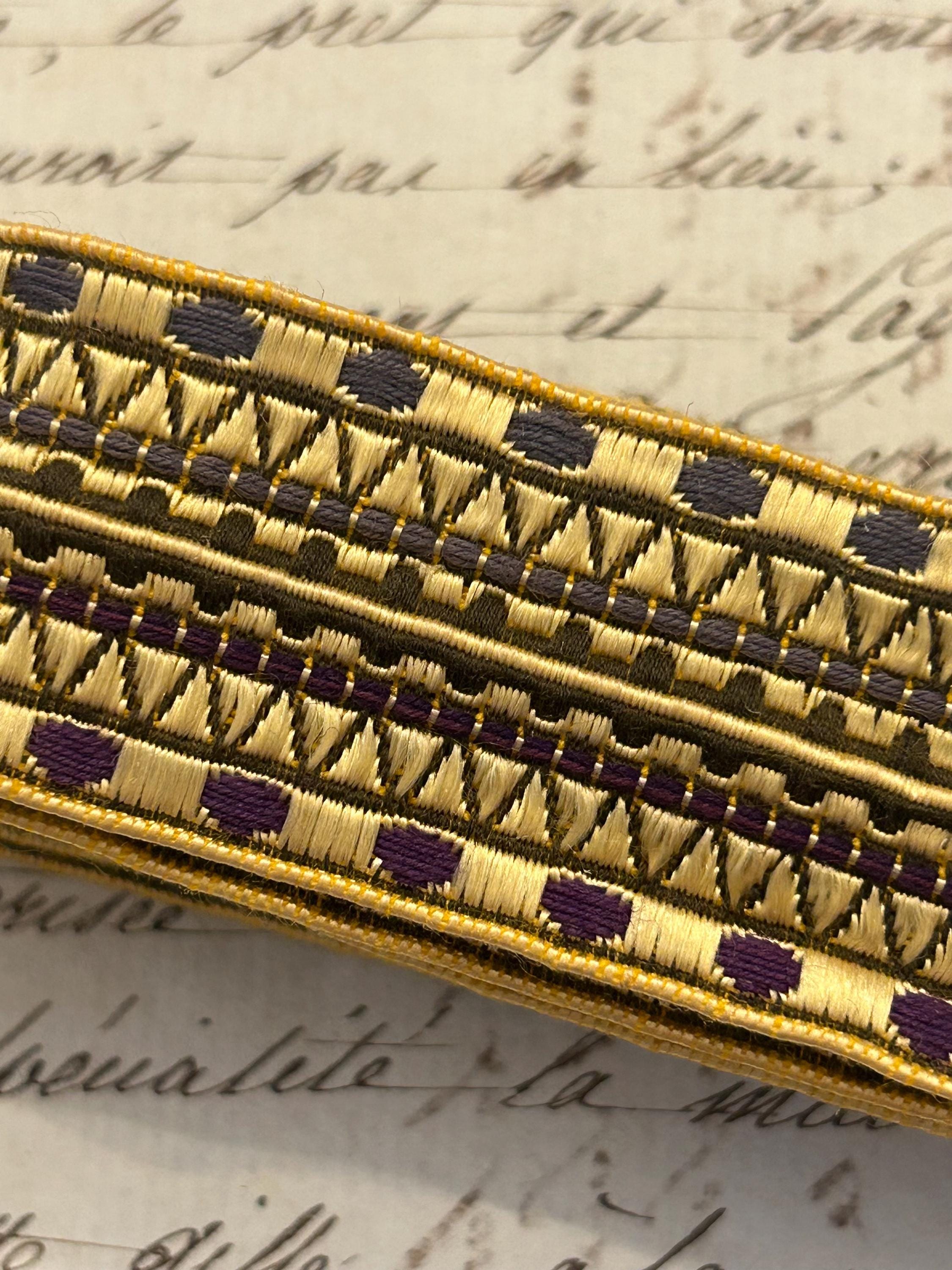 This passementerie from France measures 1.3 m x 3 cm. It is in very good condition with a bit of fraying on each end. The colors are purple, blue, and gold.