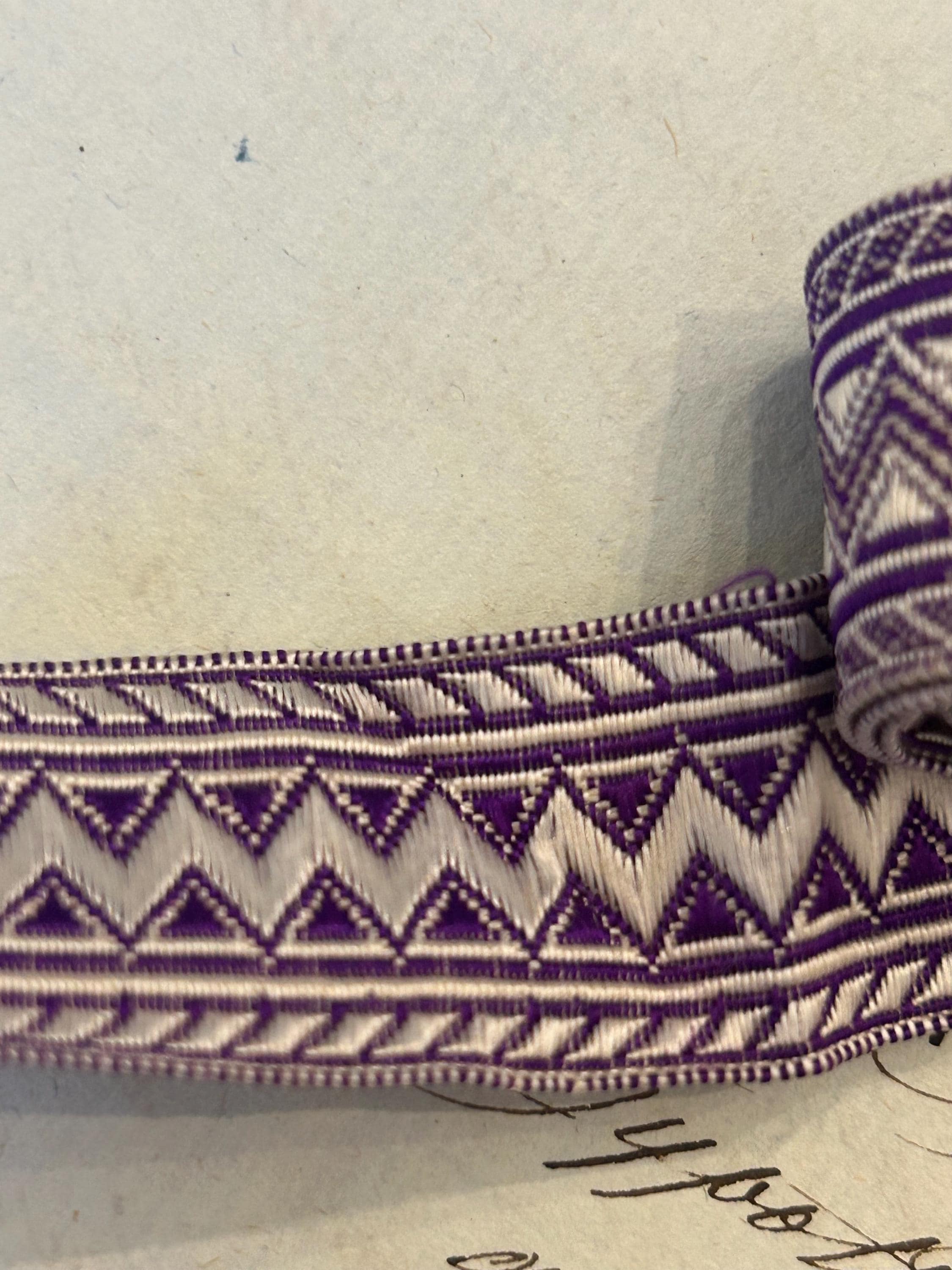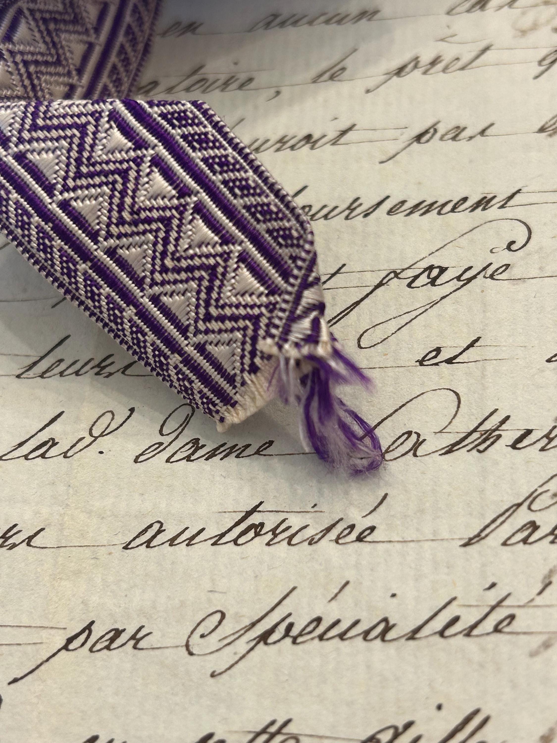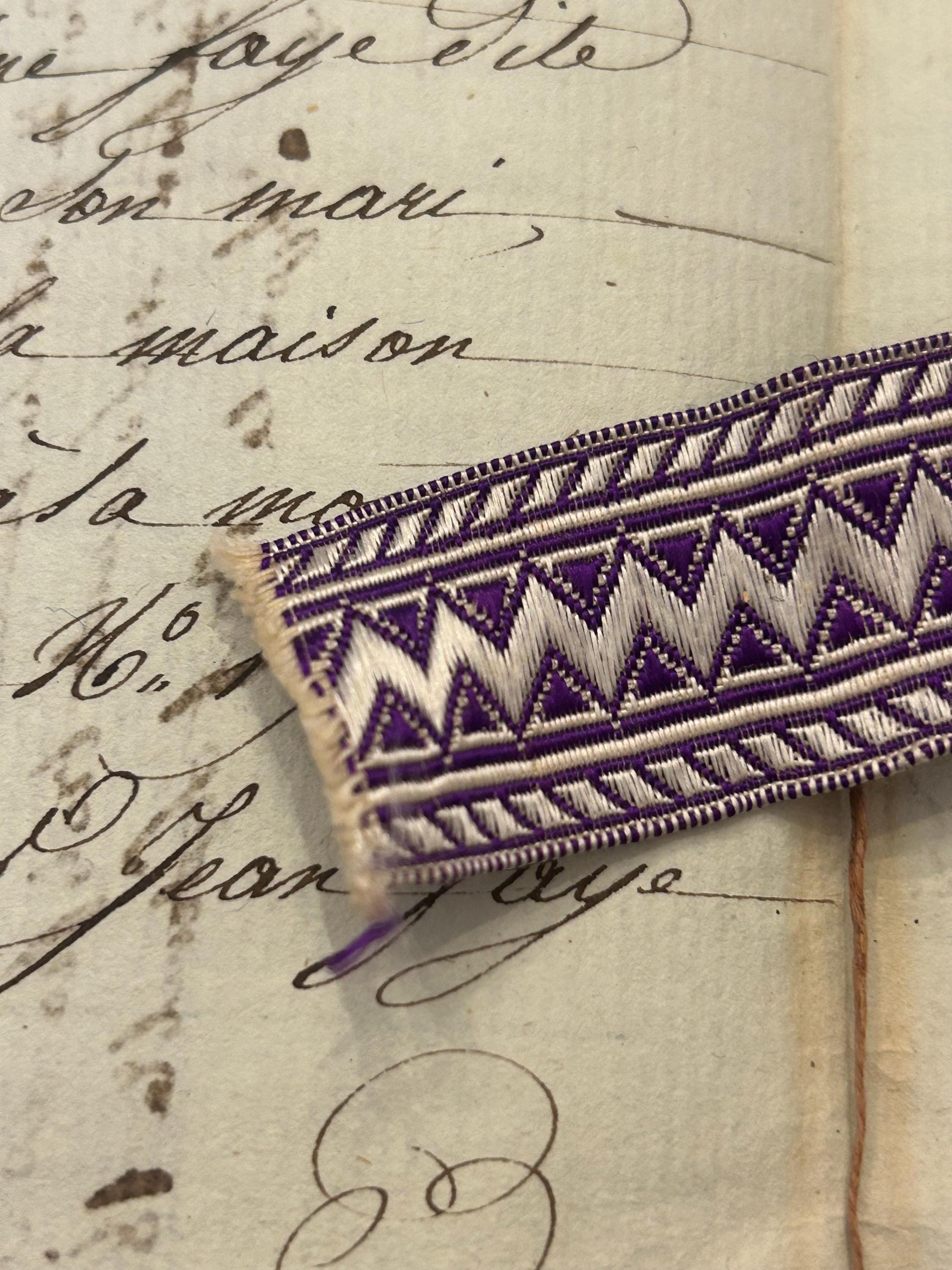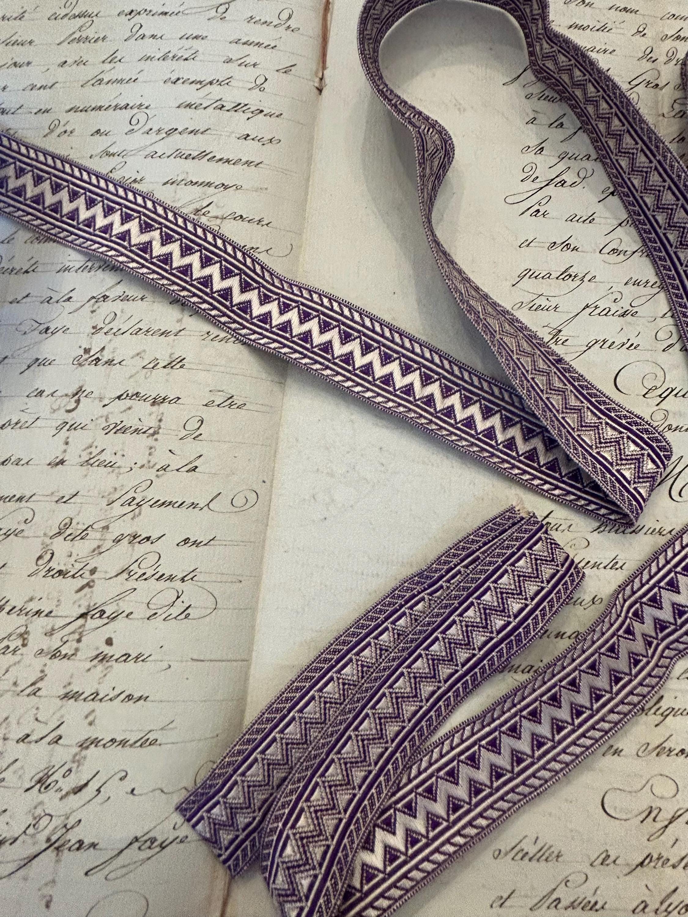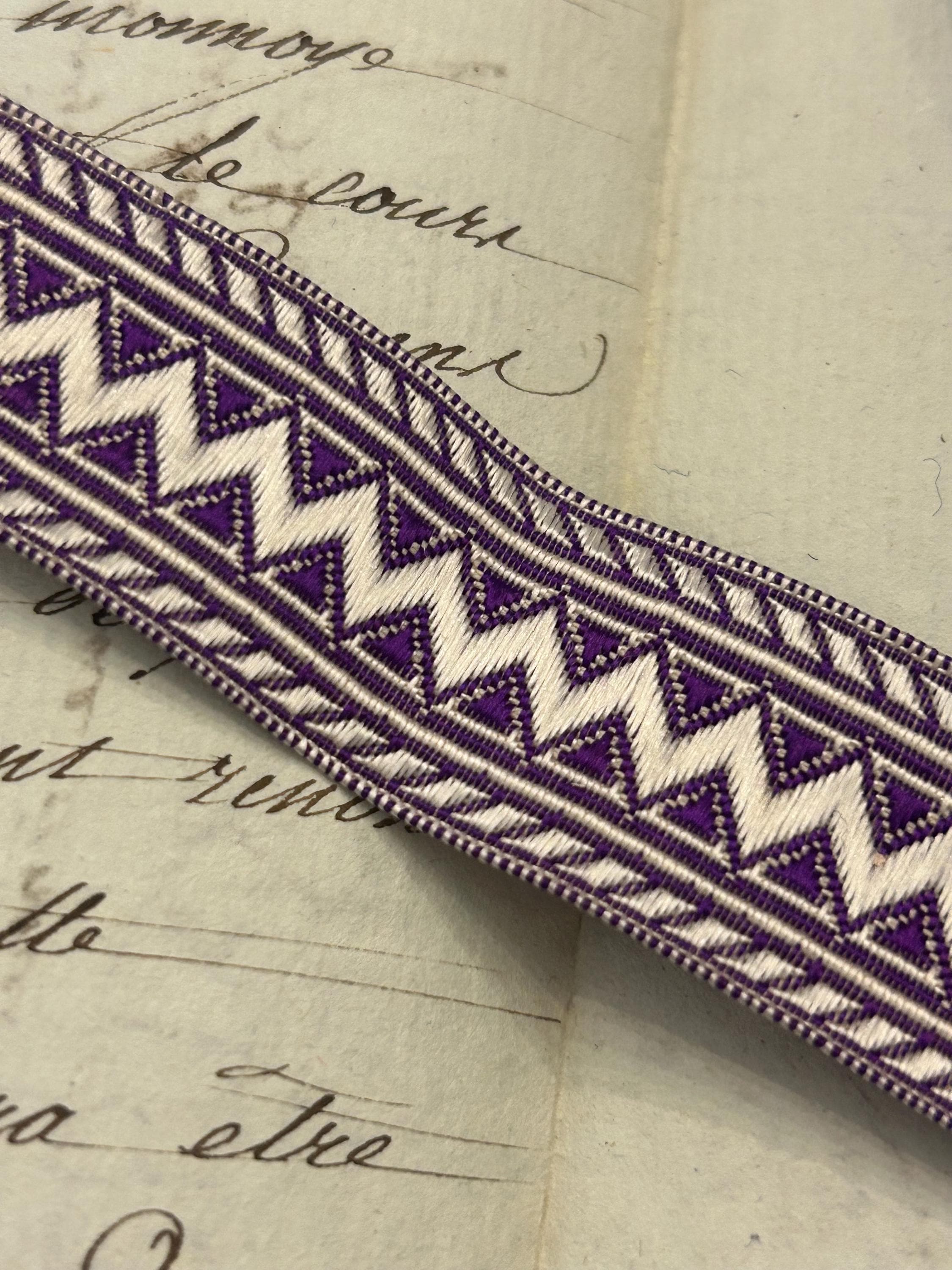 This passementerie from France measures 1.5 m x 2 cm. It is in very good condition with a bit of fraying on each end. The colors are purple and white.