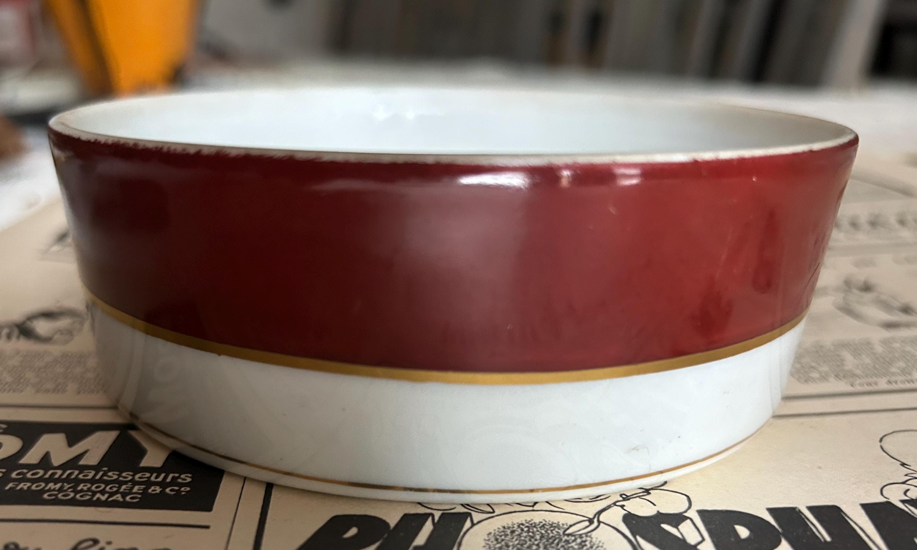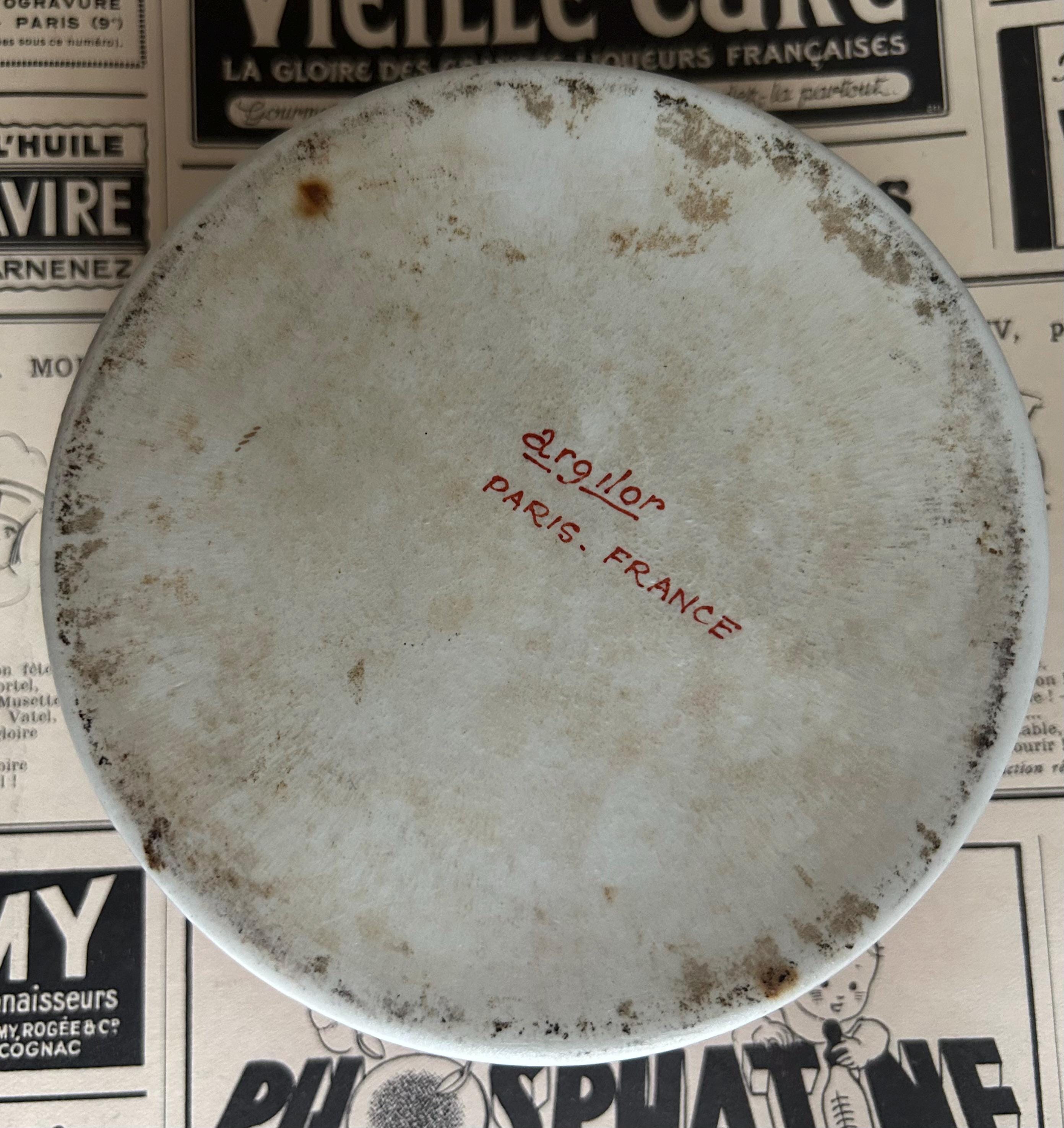 This Art Deco era powder box was made by Argilor of Paris, France, circa 1920s-1930s. It is in very good condition with minimal imperfections. The lid measures 5" in diameter, and the opening of the box as well as the underside of the box both measure 4.75" across. The depth measures 1.5".