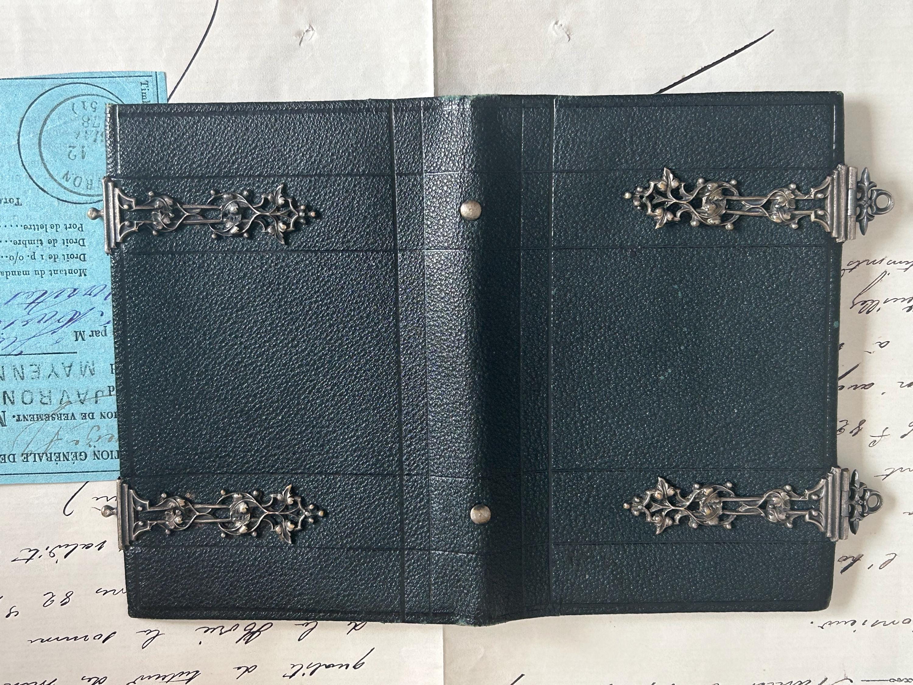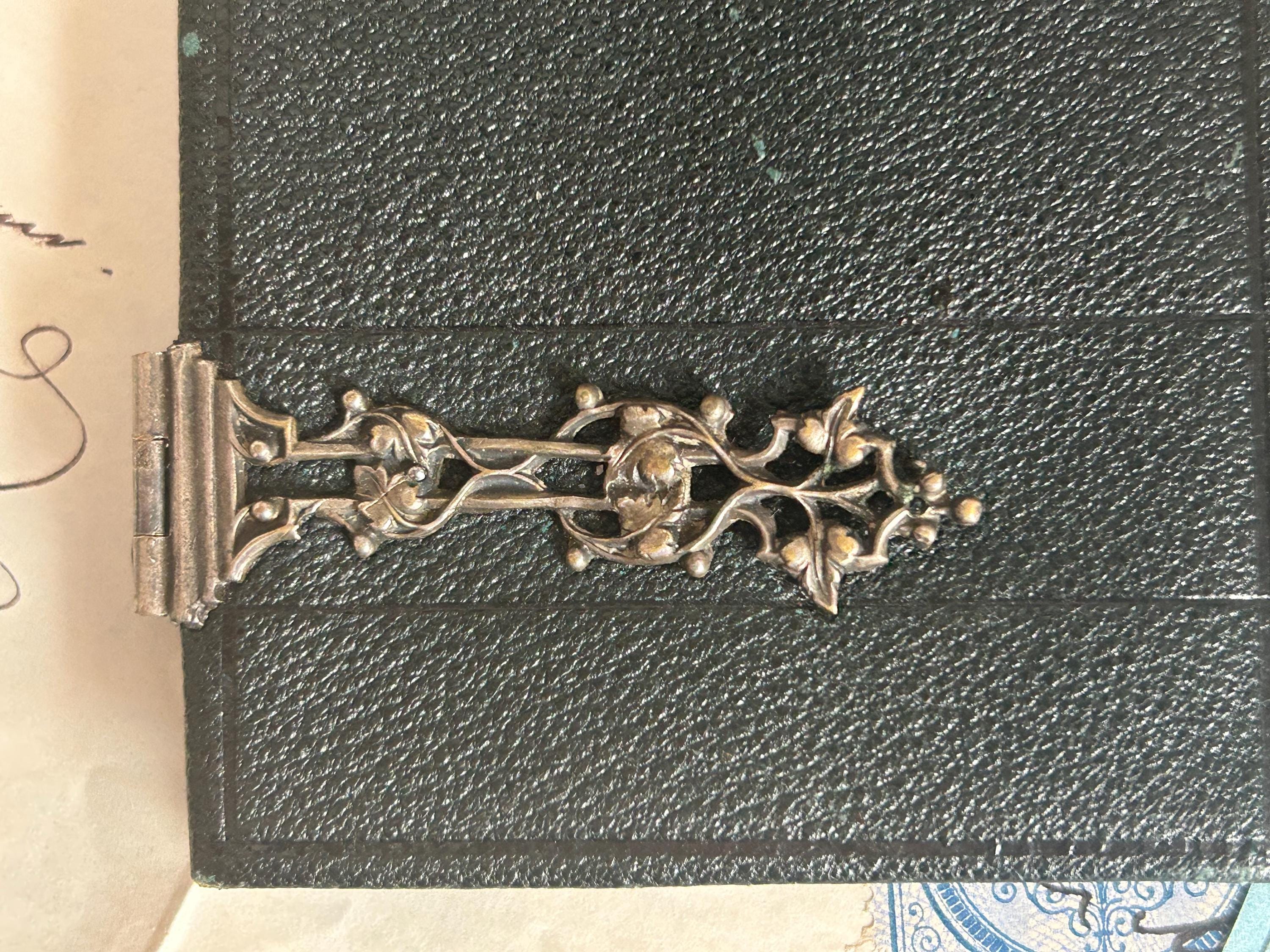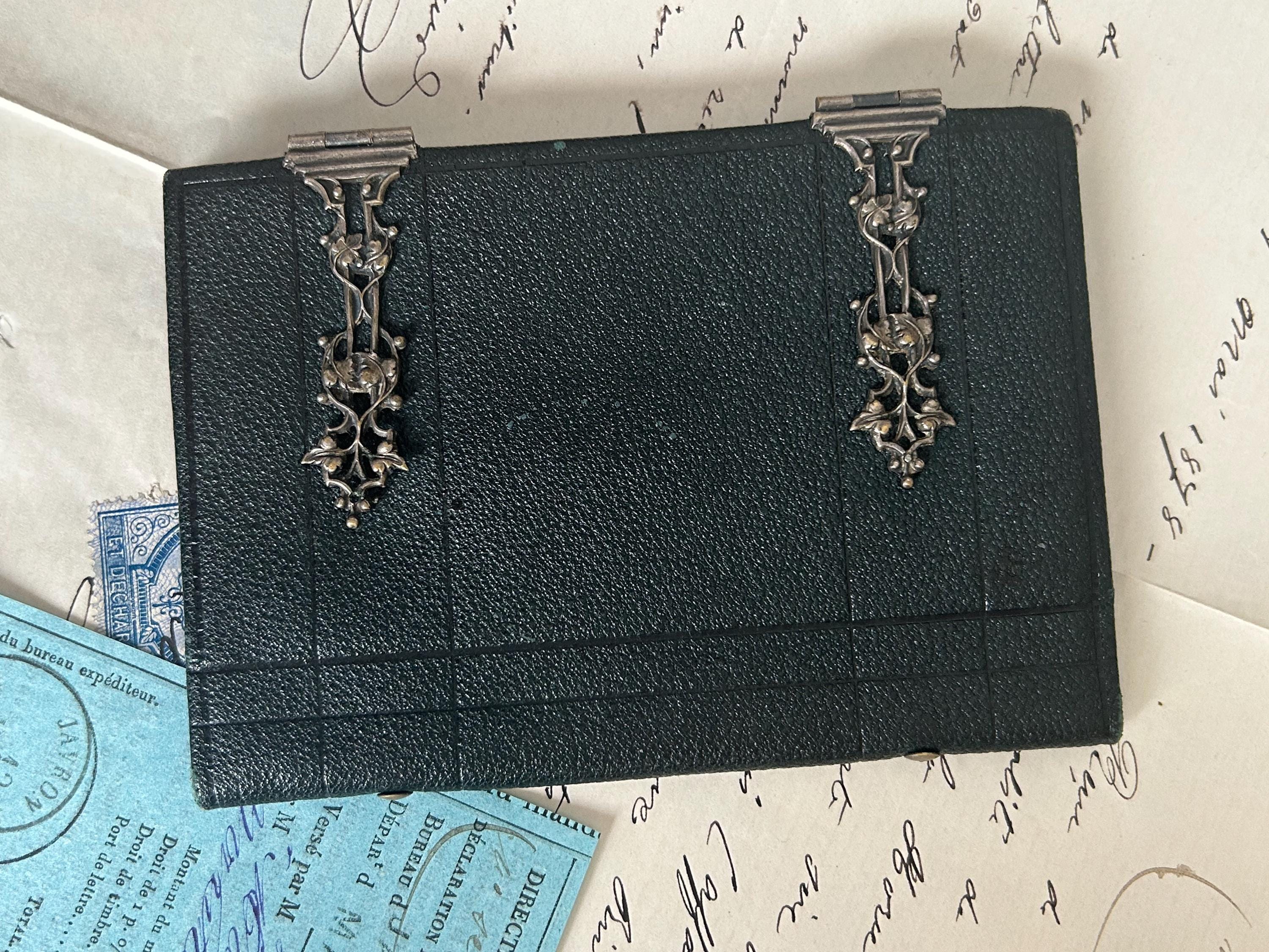 This antique carnet de bal or aide-memoire is from France and Art Nouveau in design. It's circa late 1800s to early 1910s. The folio is leather with a metal piece through the center interior to hold paper. There is a pocket on either side of the interior. The interior is lined with what looks to be moire. The metal closures are probably not silver since there is no hallmark. There is an area to hold a small writing instrument in the interior, and there is a small pencil within.