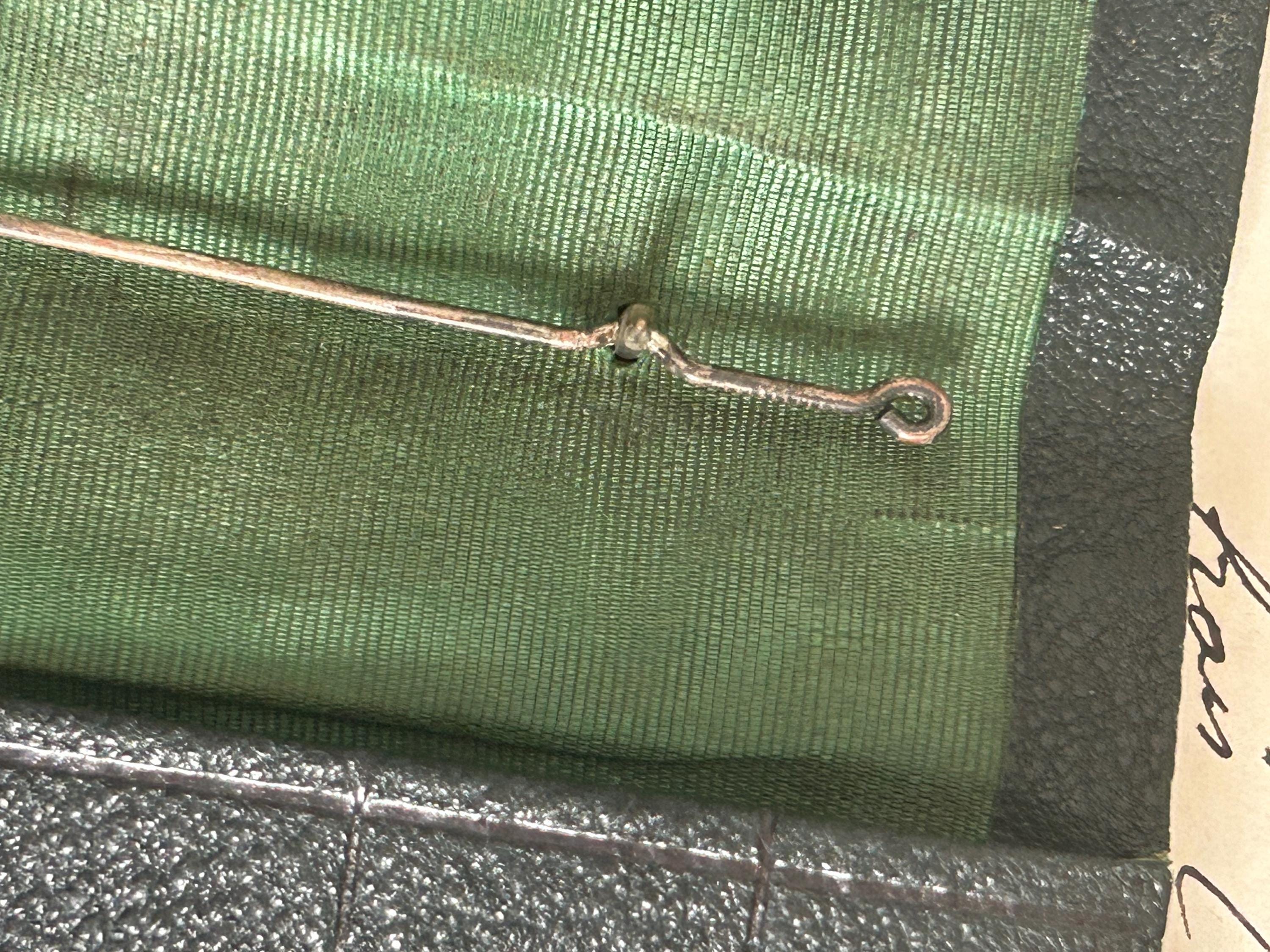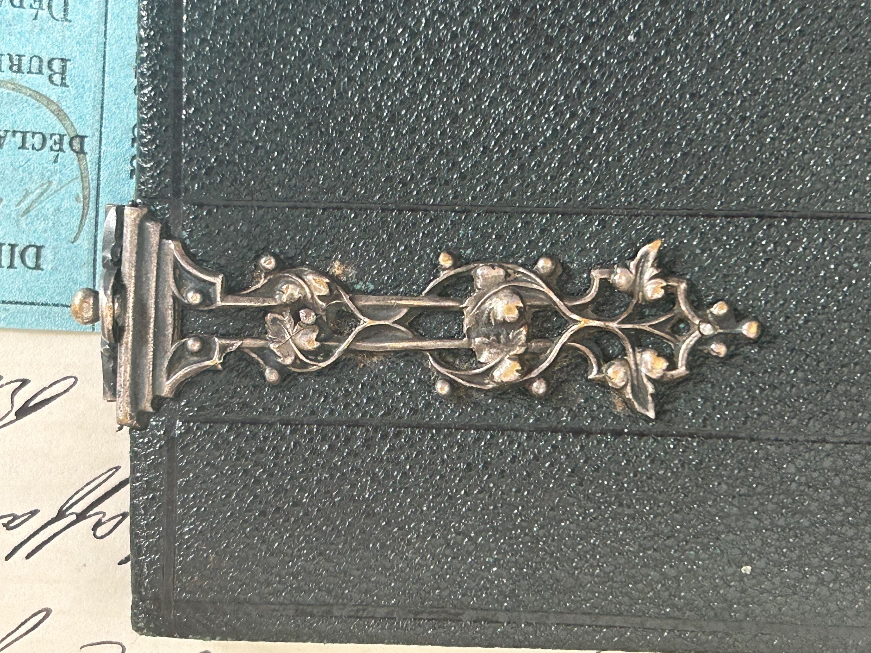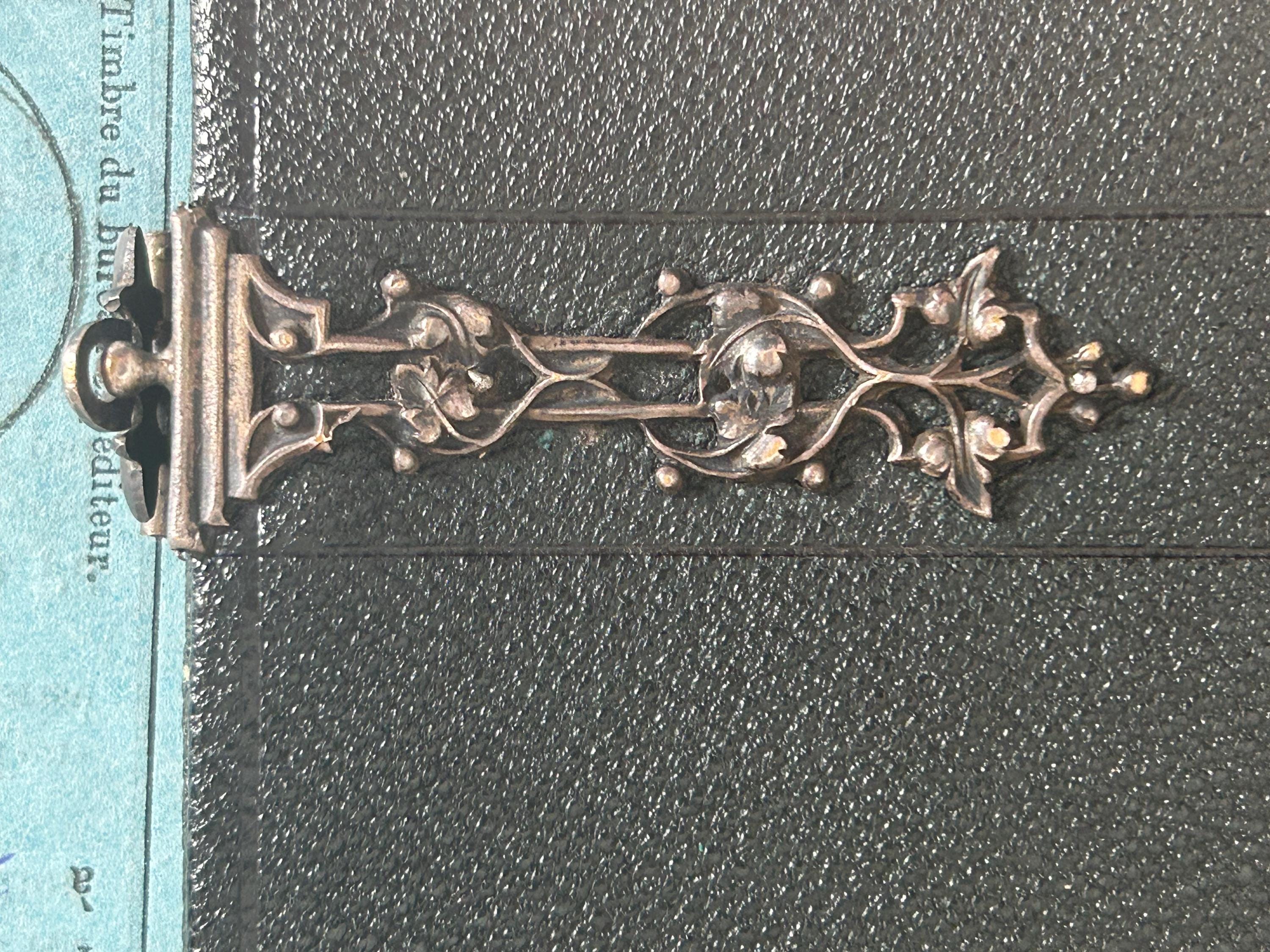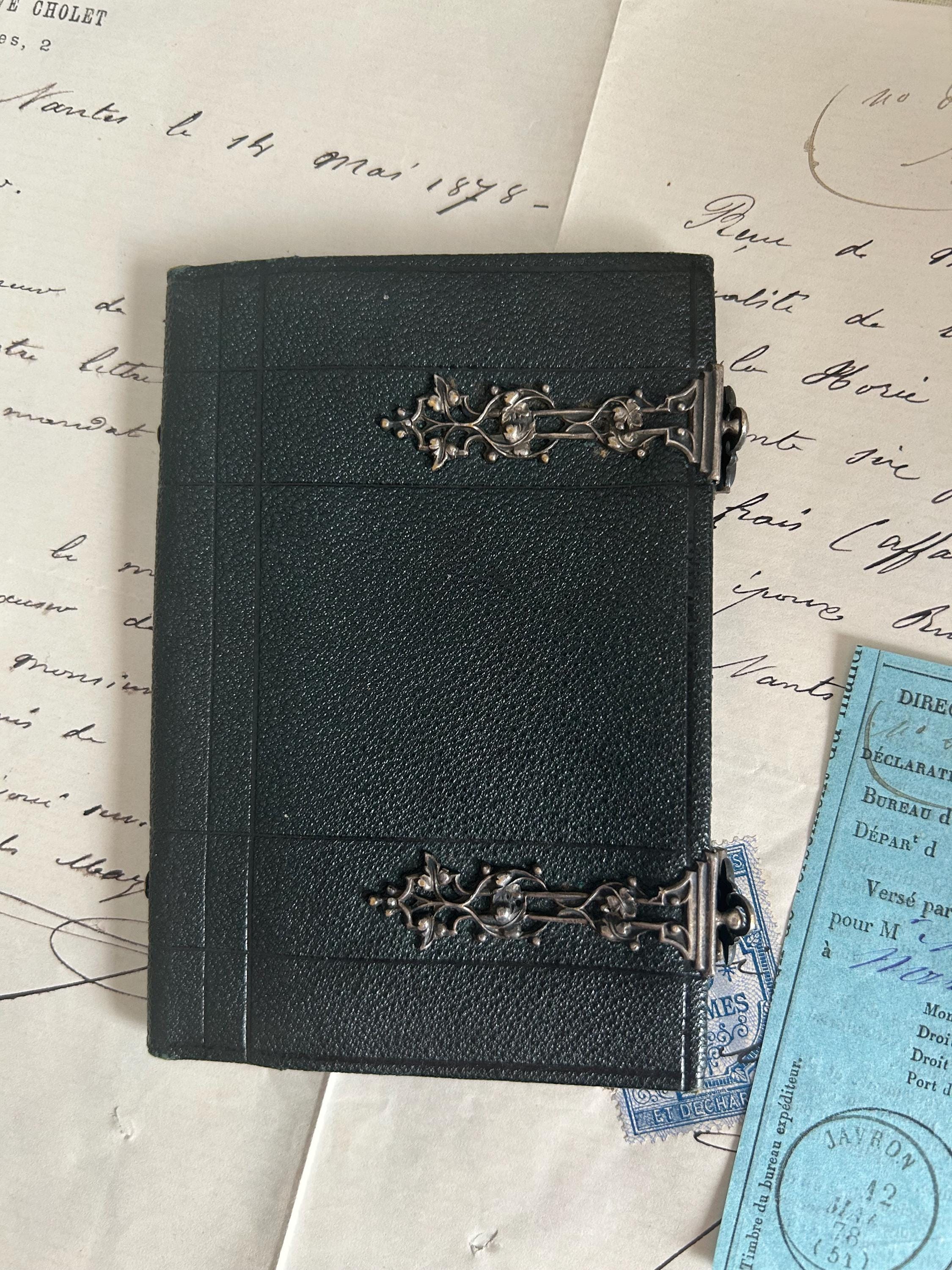 This antique carnet de bal or aide-memoire is from France and Art Nouveau in design. It's circa late 1800s to early 1910s. The folio is leather with a metal piece through the center interior to hold paper. There is a pocket on either side of the interior. The interior is lined with what looks to be moire. The metal closures are probably not silver since there is no hallmark. There is an area to hold a small writing instrument in the interior, and there is a small pencil within.