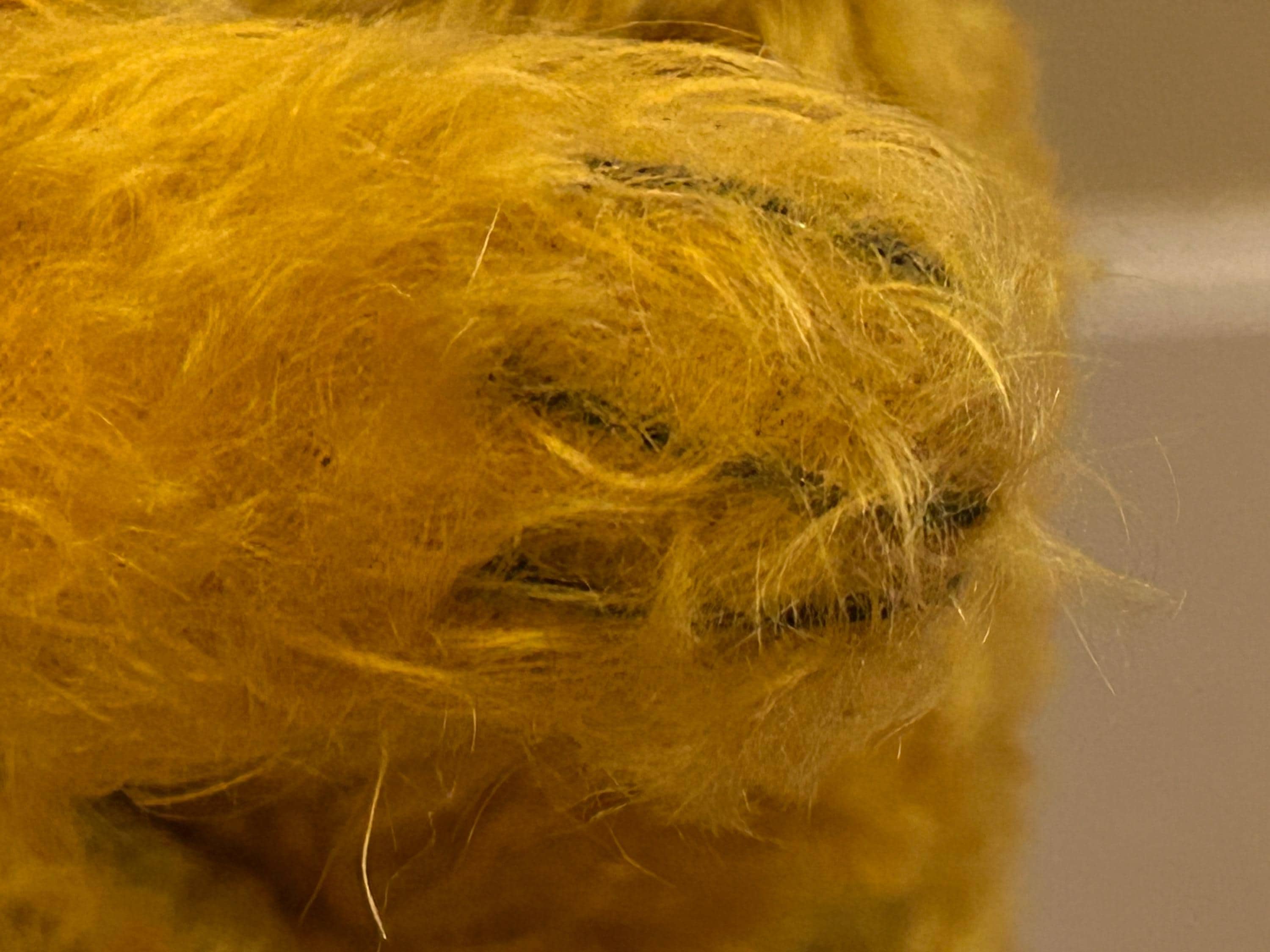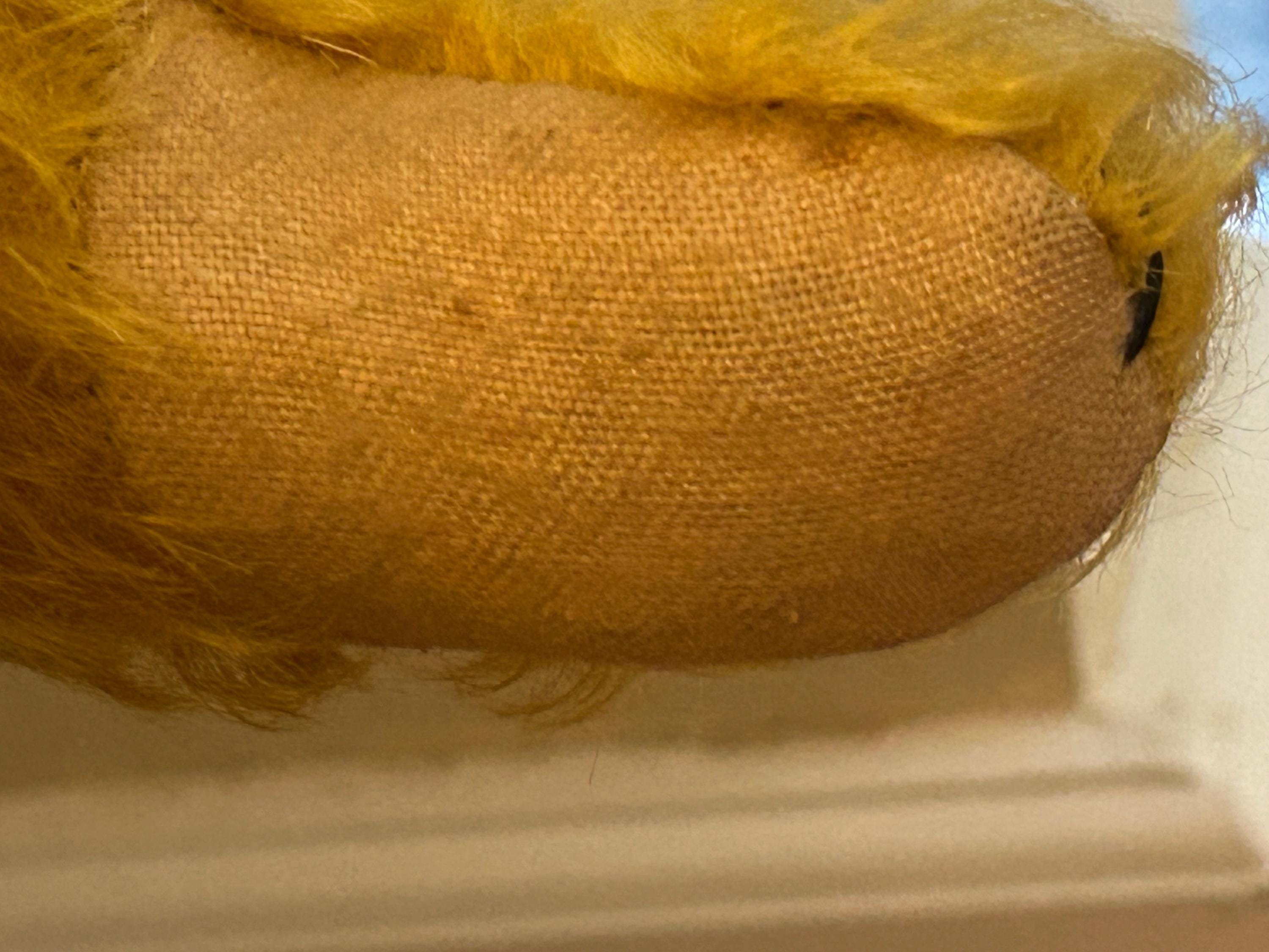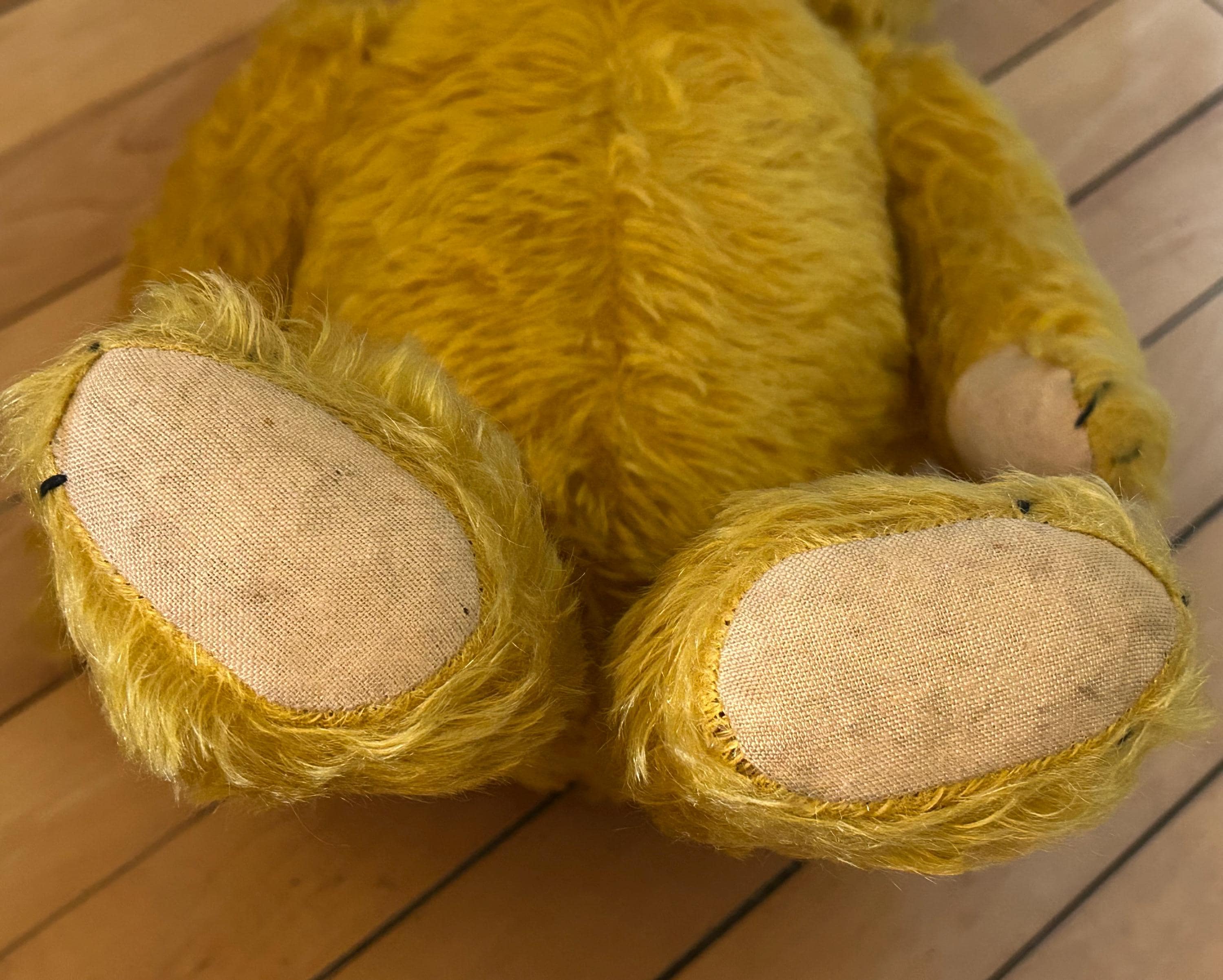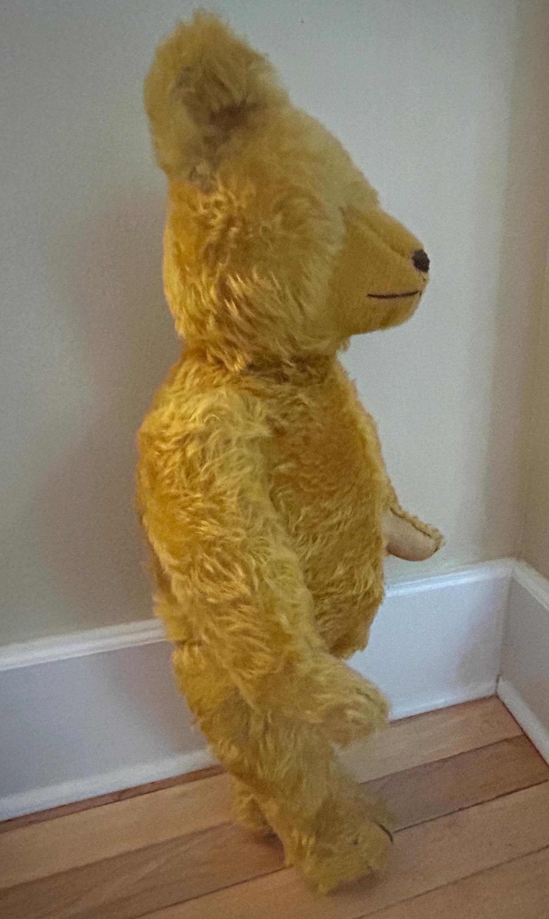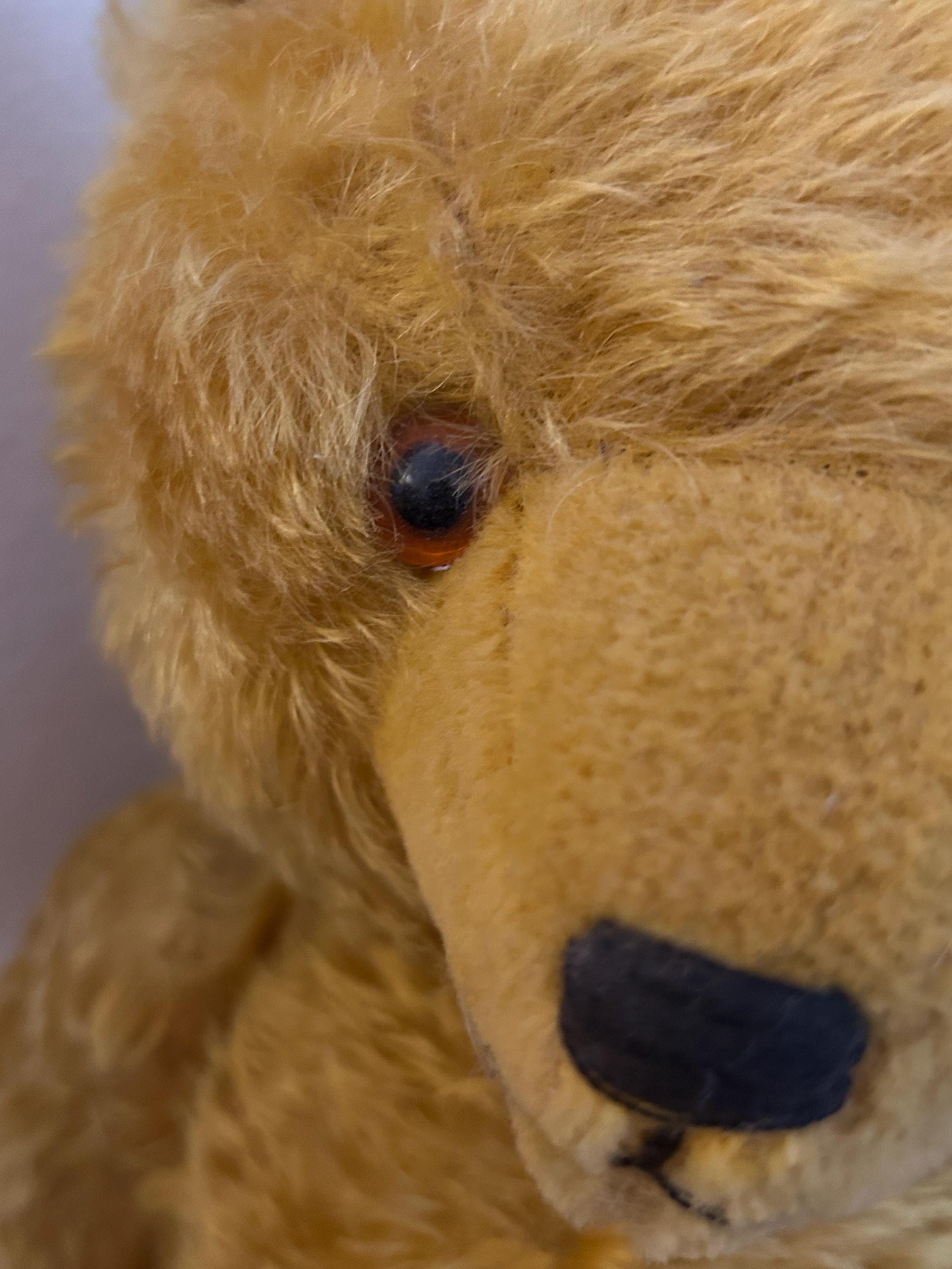This circa 1950s-1960s, 20" Gebrüder Hermann teddy bear is in very good condition with much of his original golden mohair, glass eyes, and horizontally stitched, oval nose. The felt pads are worn thin, but there are three, intact, black claws on each paw. His inset muzzle is short mohair and is comprised of three separate pieces. Excelsior (wood wool) stuffed. Jointed five ways.