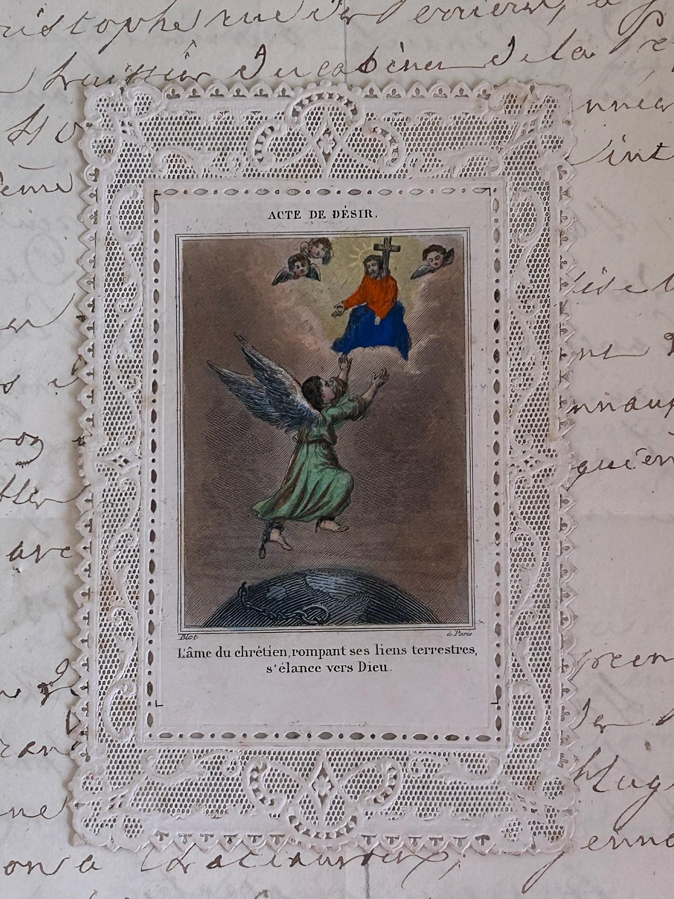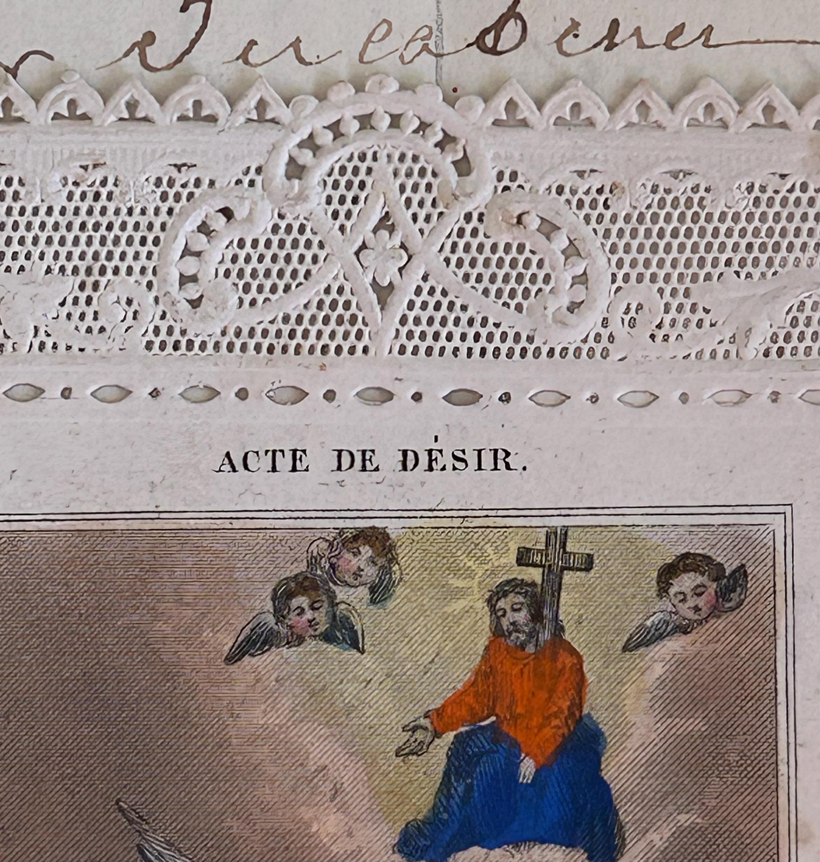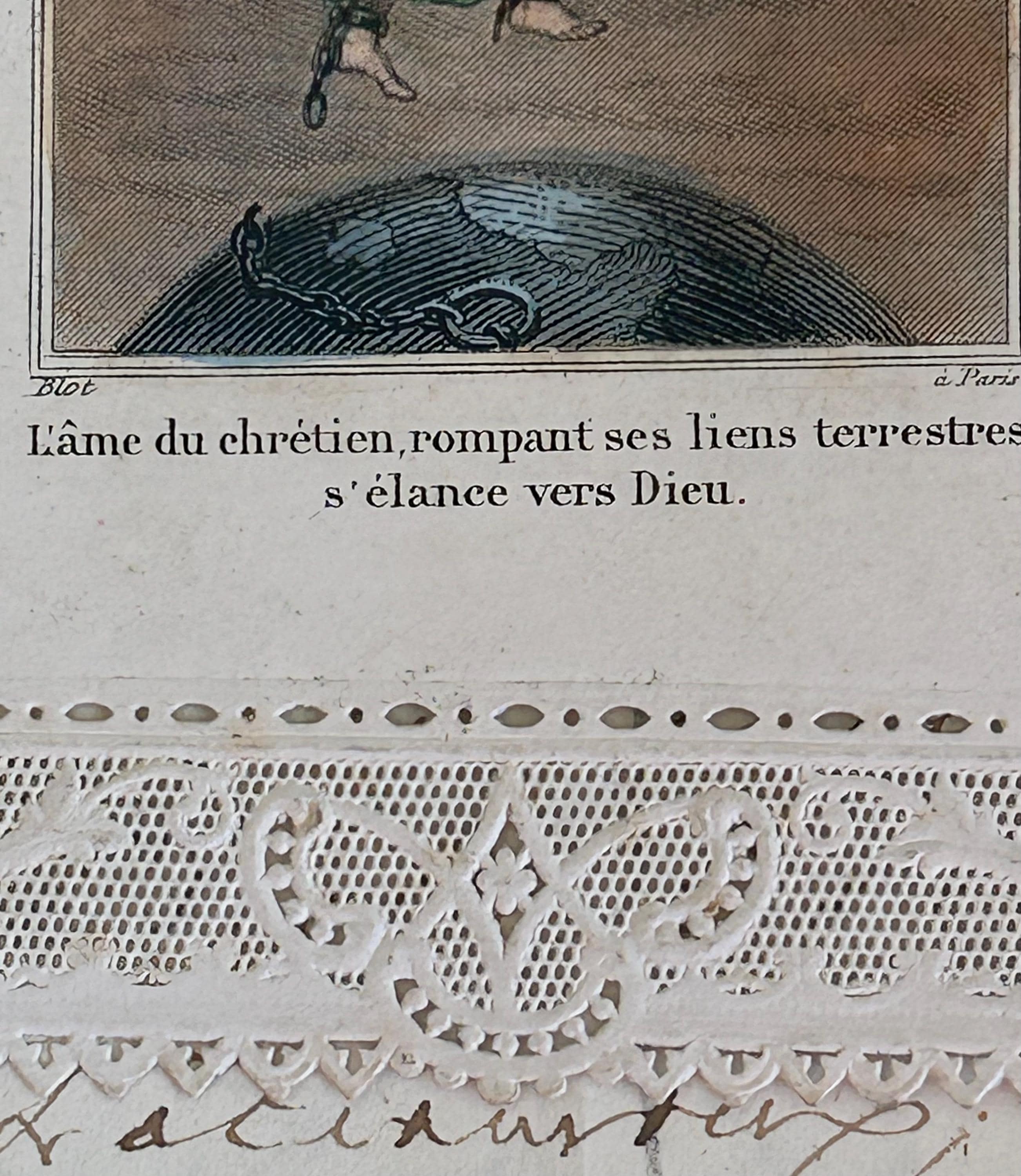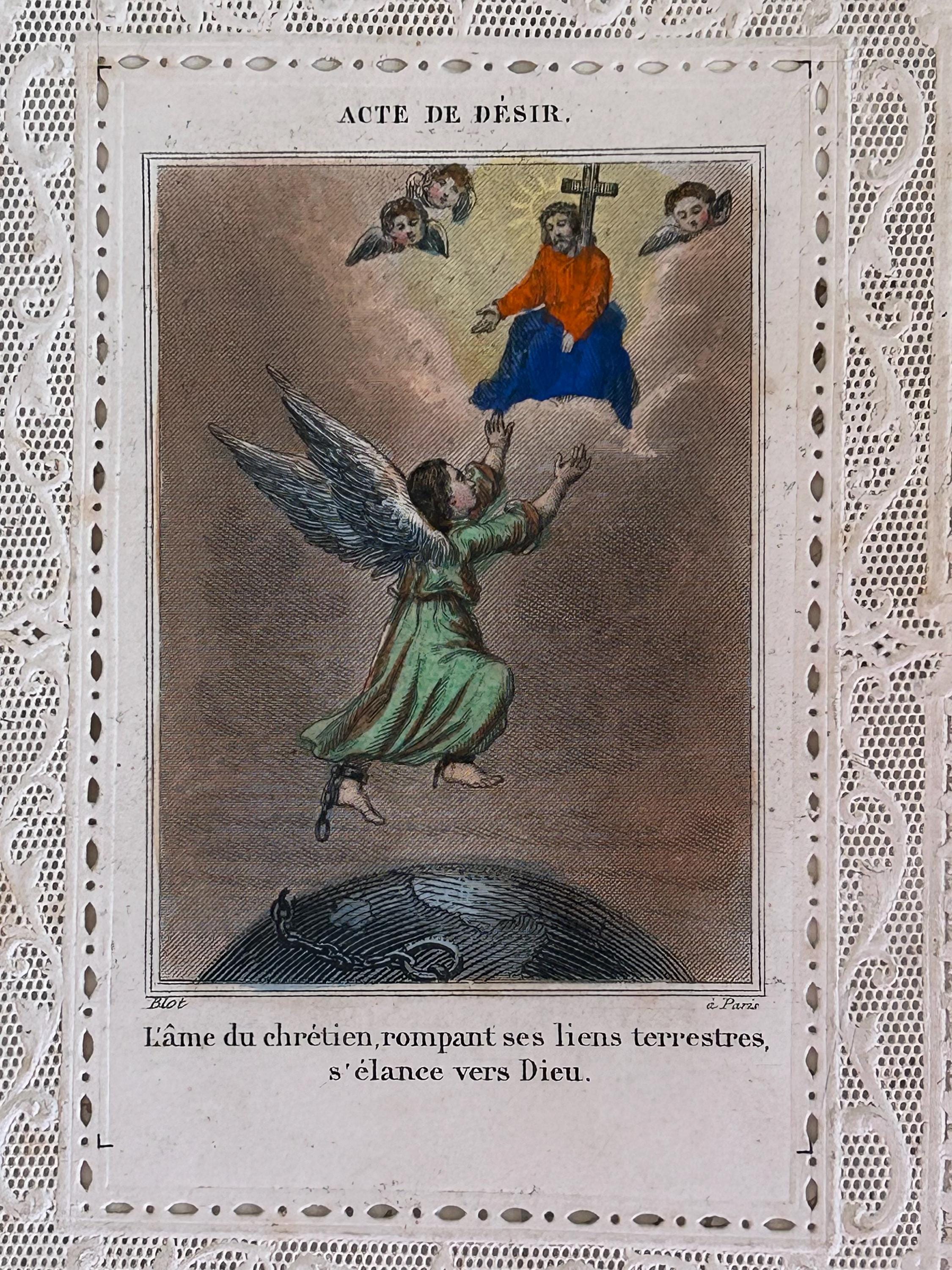 The face of the canivet has a phrase concerning the Christian soul breaking its earthly ties and soaring towards God, and the engraving depicts this action. The reverse of the canivet has the Acte de Désir prayer (in French).