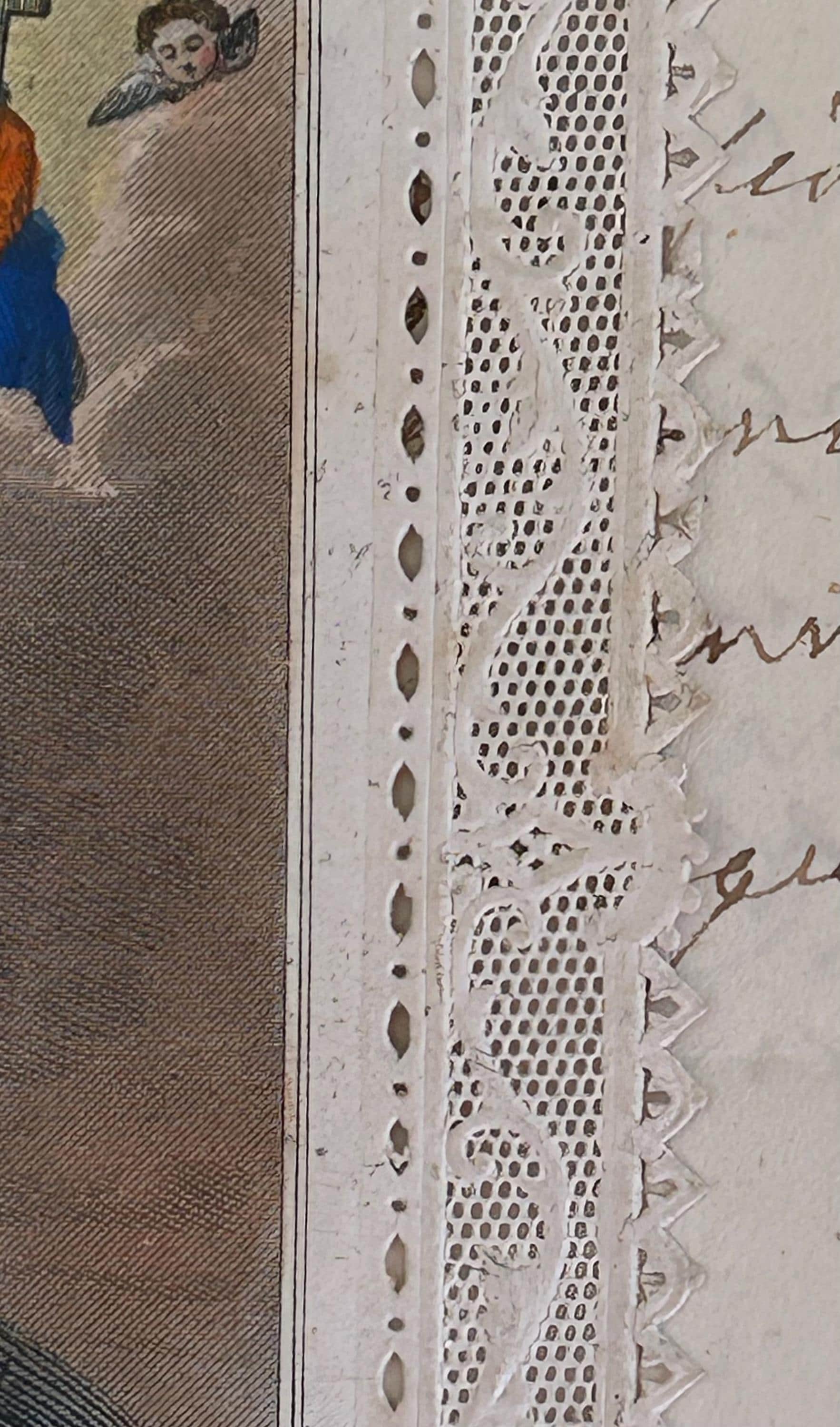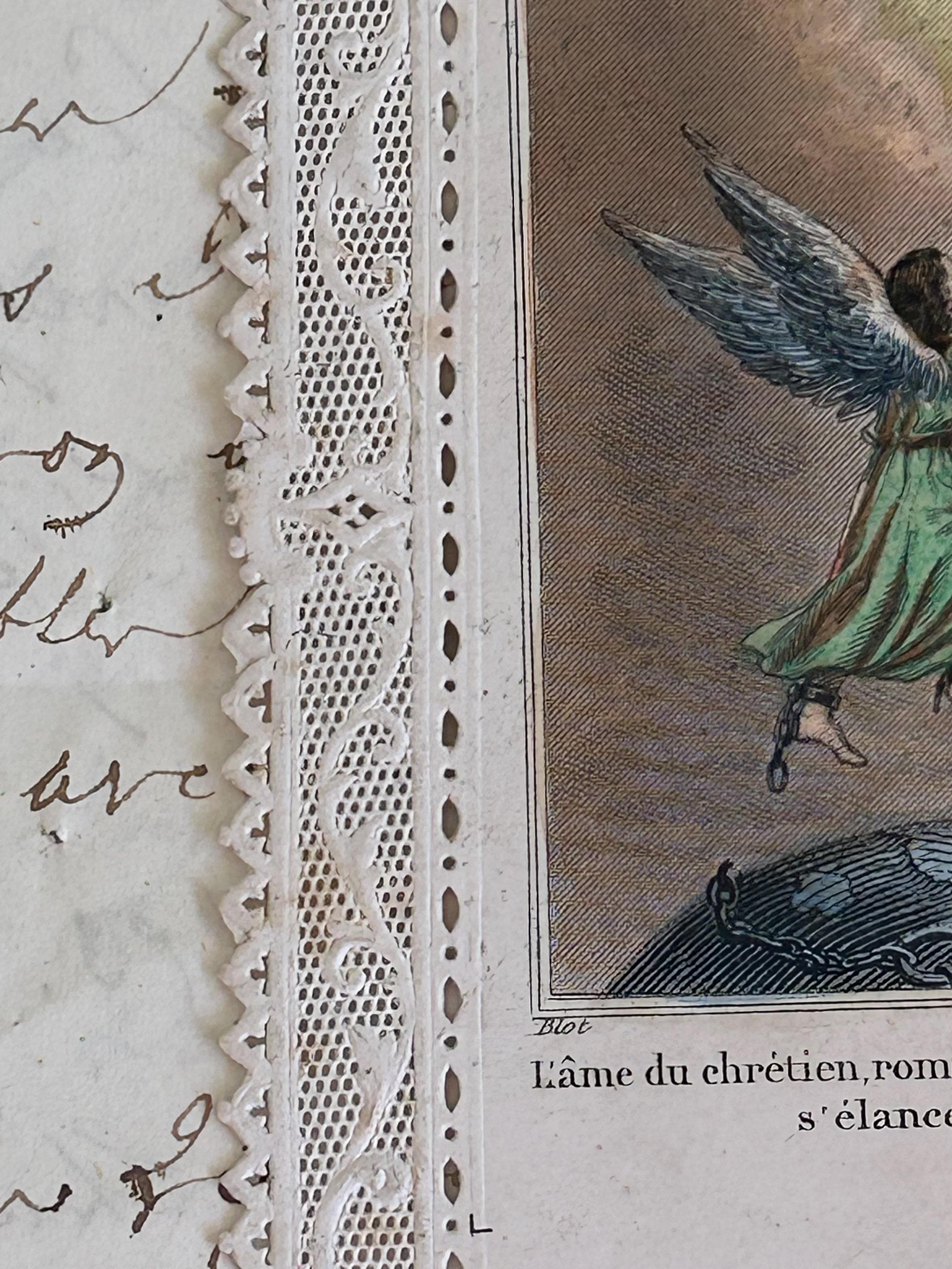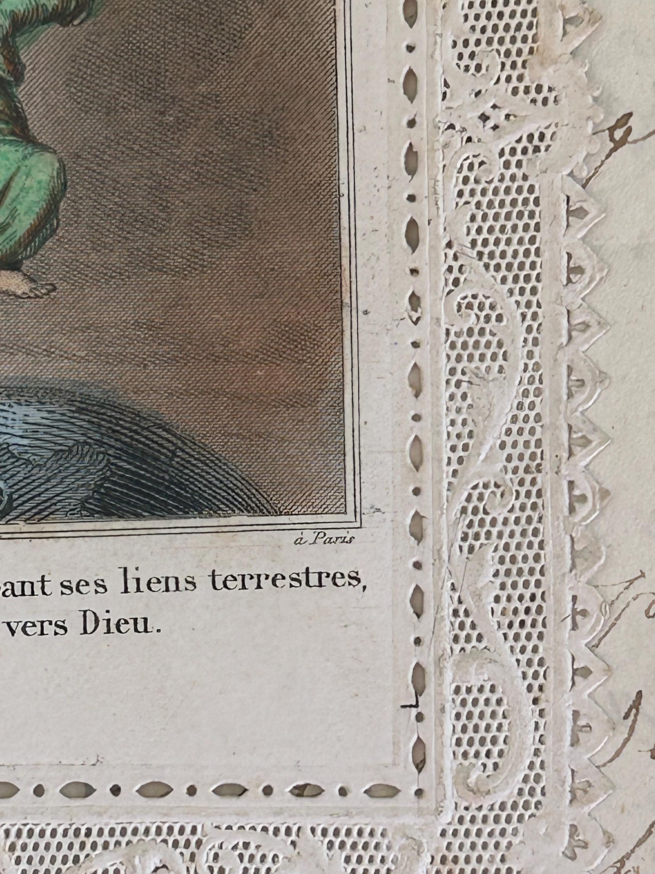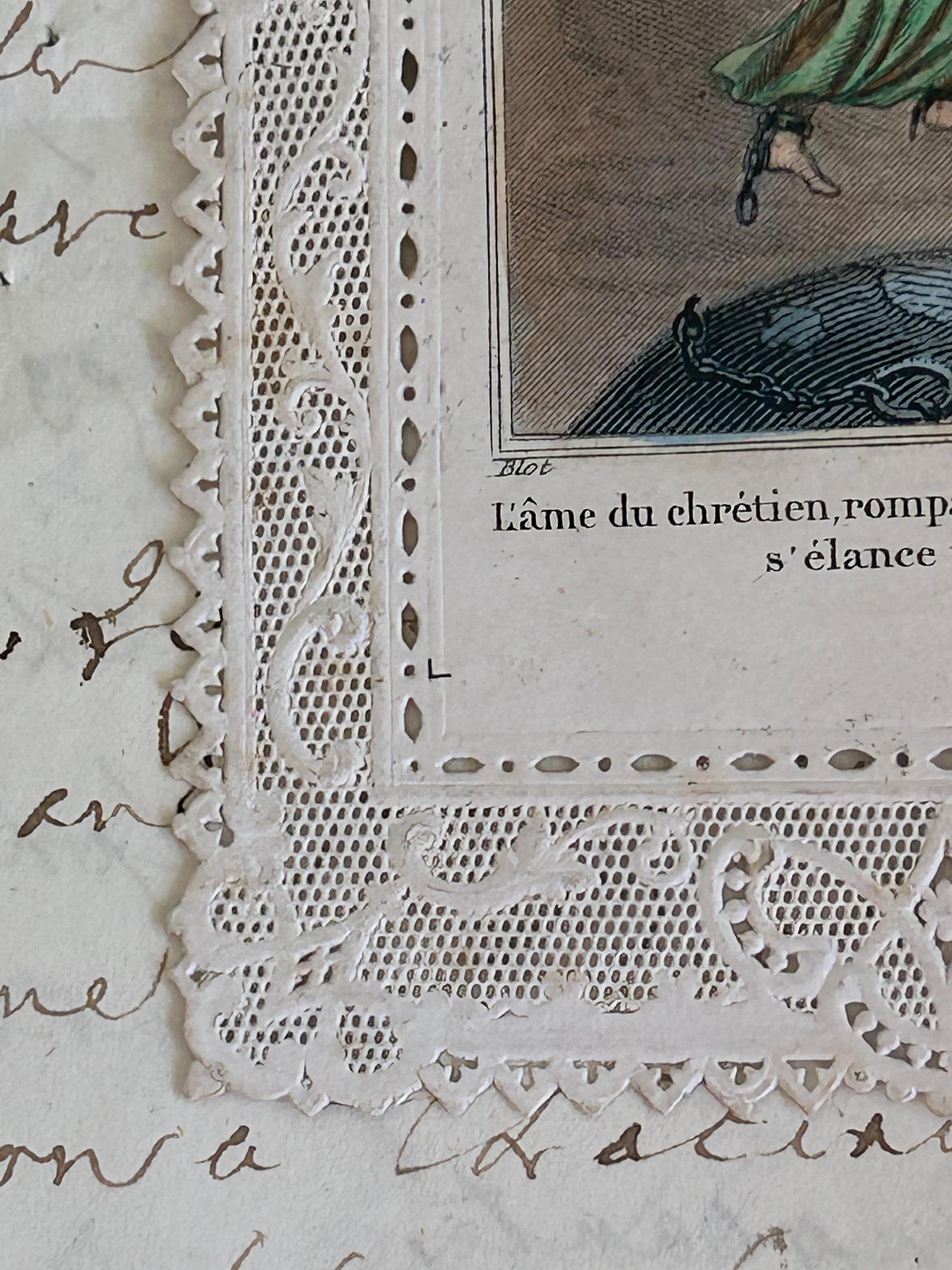 The face of the canivet has a phrase concerning the Christian soul breaking its earthly ties and soaring towards God, and the engraving depicts this action. The reverse of the canivet has the Acte de Désir prayer (in French).