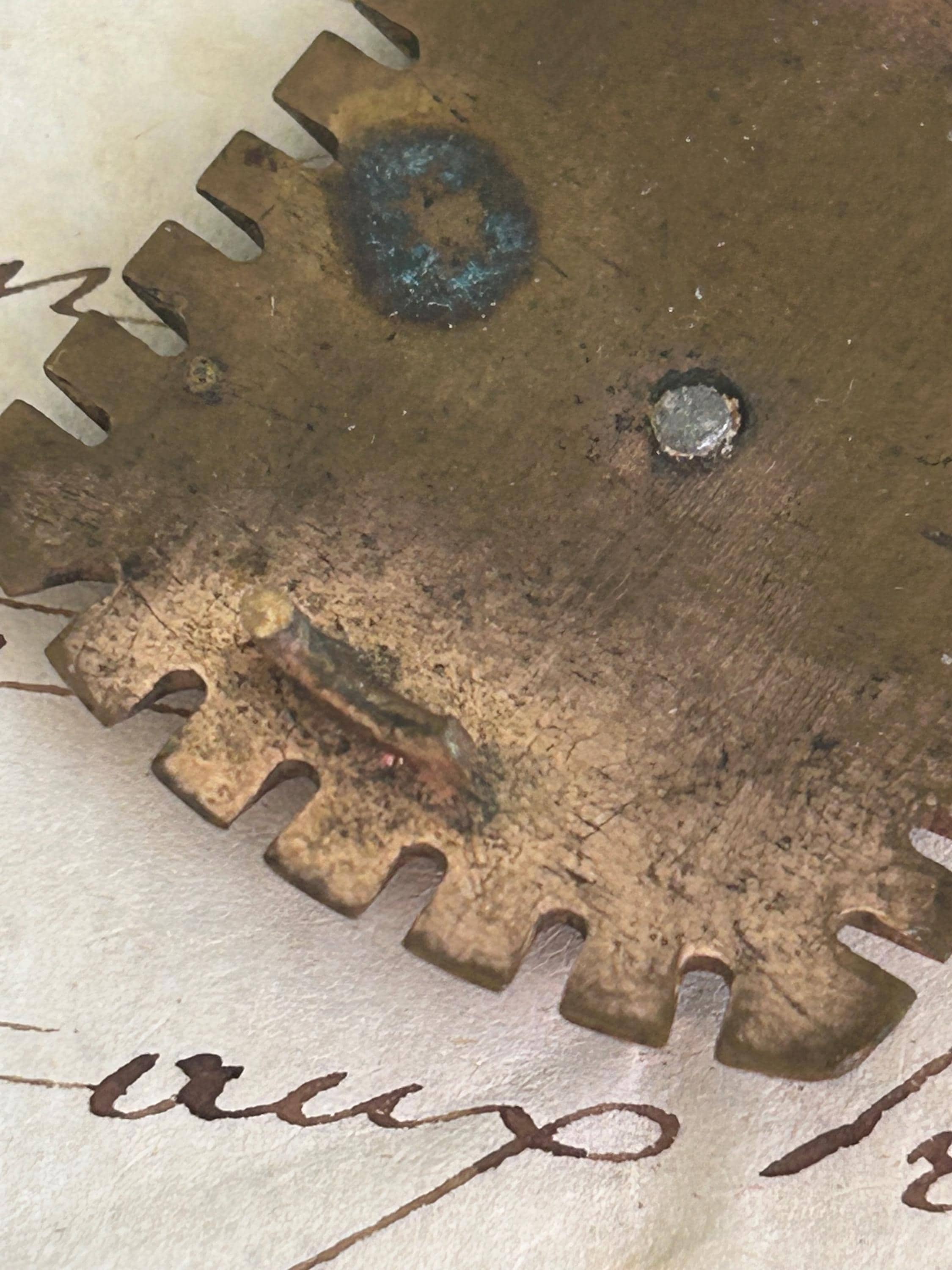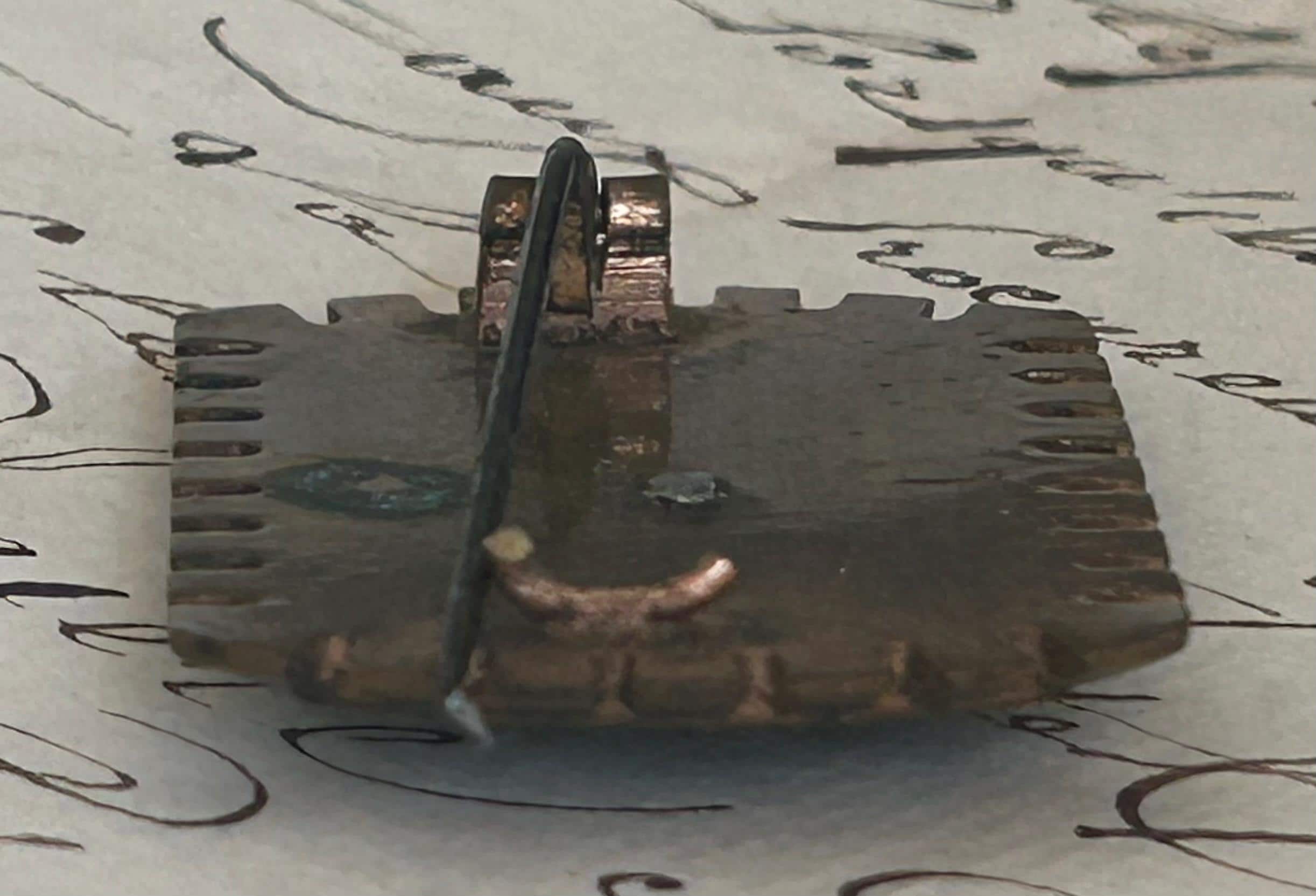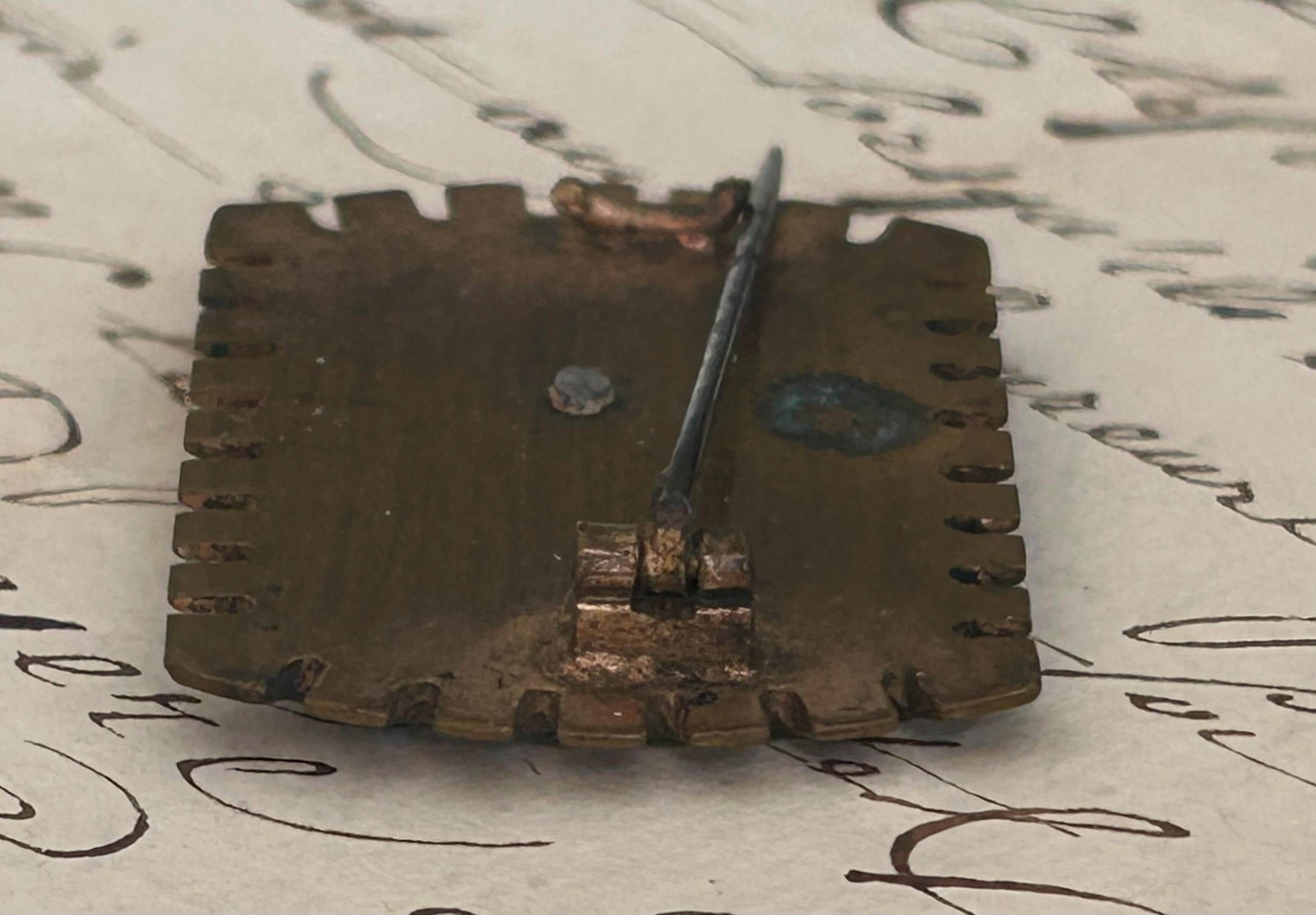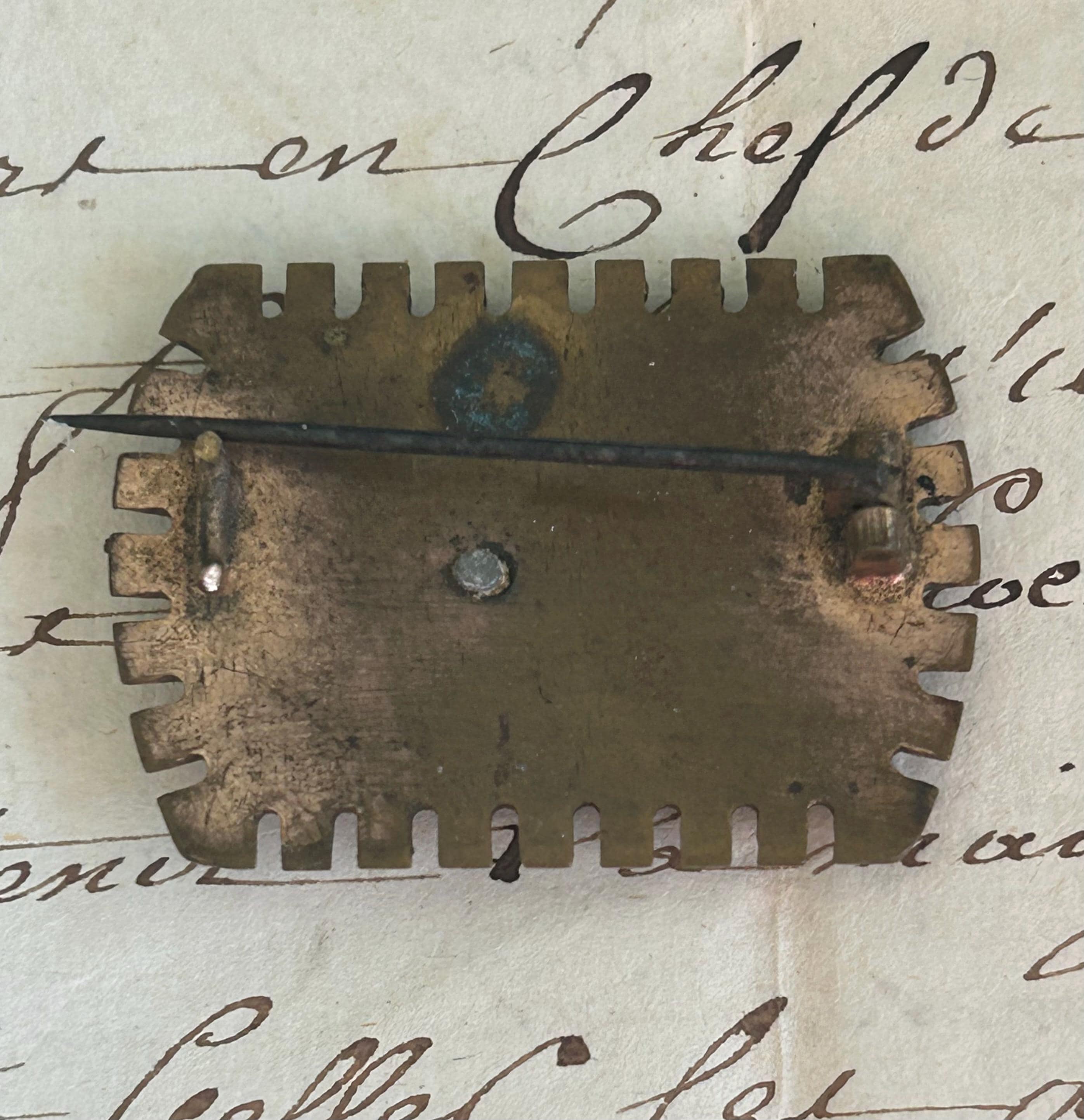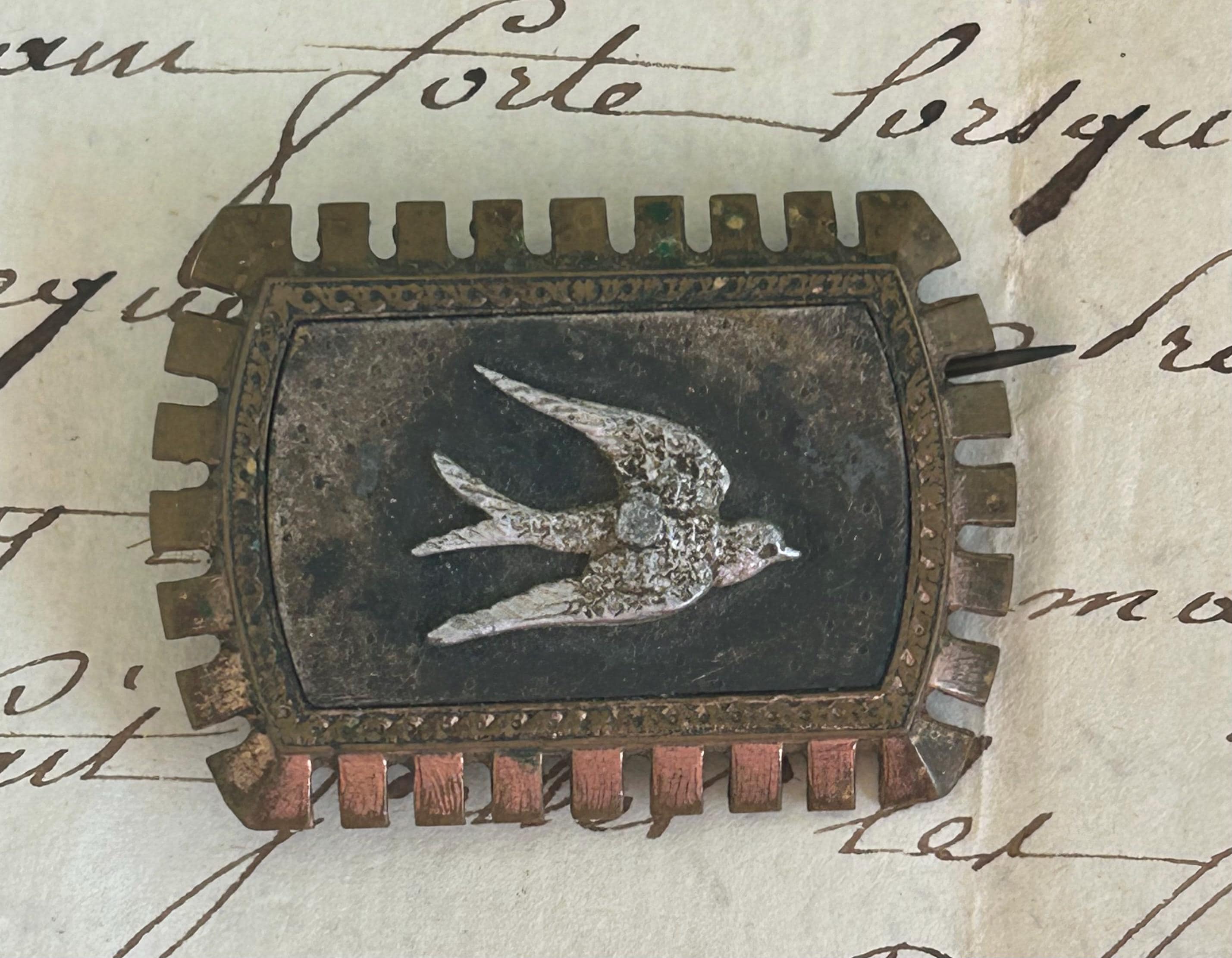 This former metal brooch from France depicts a swallow. The back was once a C clasp closure with the pin extended past the edge of the brooch. The closure and the pin's extension point to an early 1900s manufacture.