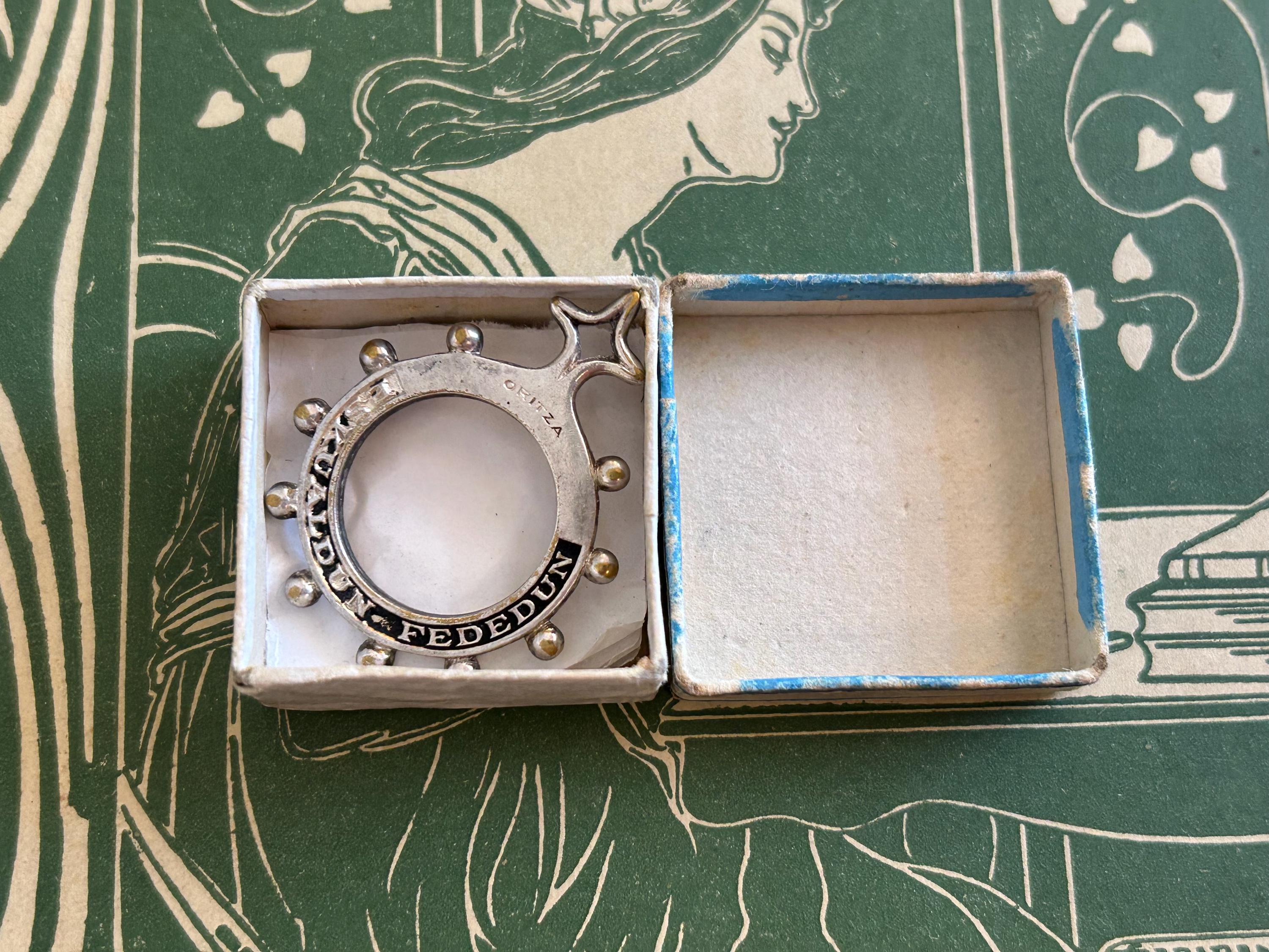 *****Condition: The ring has no hallmarks but is probably silver-plate over brass. One can see areas of the brass showing through the worn silver-plate on the ring itself and on the beads. Also, the phrases on either side of the ring are worn. Please examine the photos carefully and do let me know if you need more as I'll be happy to oblige.
