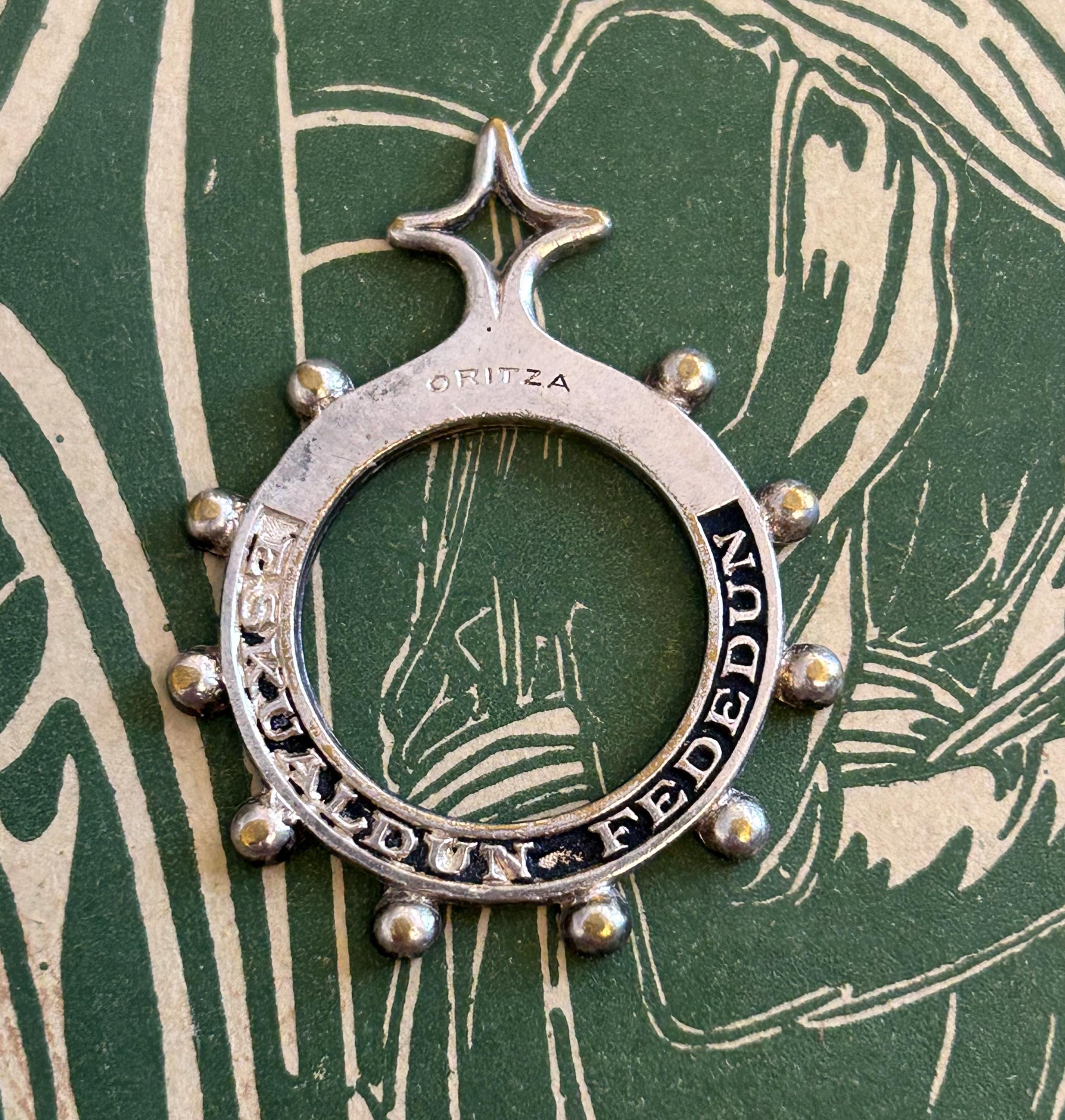 This dizainier or rosary ring is from the Basque Country, southern France and northern Spain. It is marked Oritza and has the phrase, "Eskualdun Fededun" on one side, meaning "faithful Basque." On the reverse, it reads, "Dit Basque Dit Croyant," meaning "Yes, a Basque is a believer."