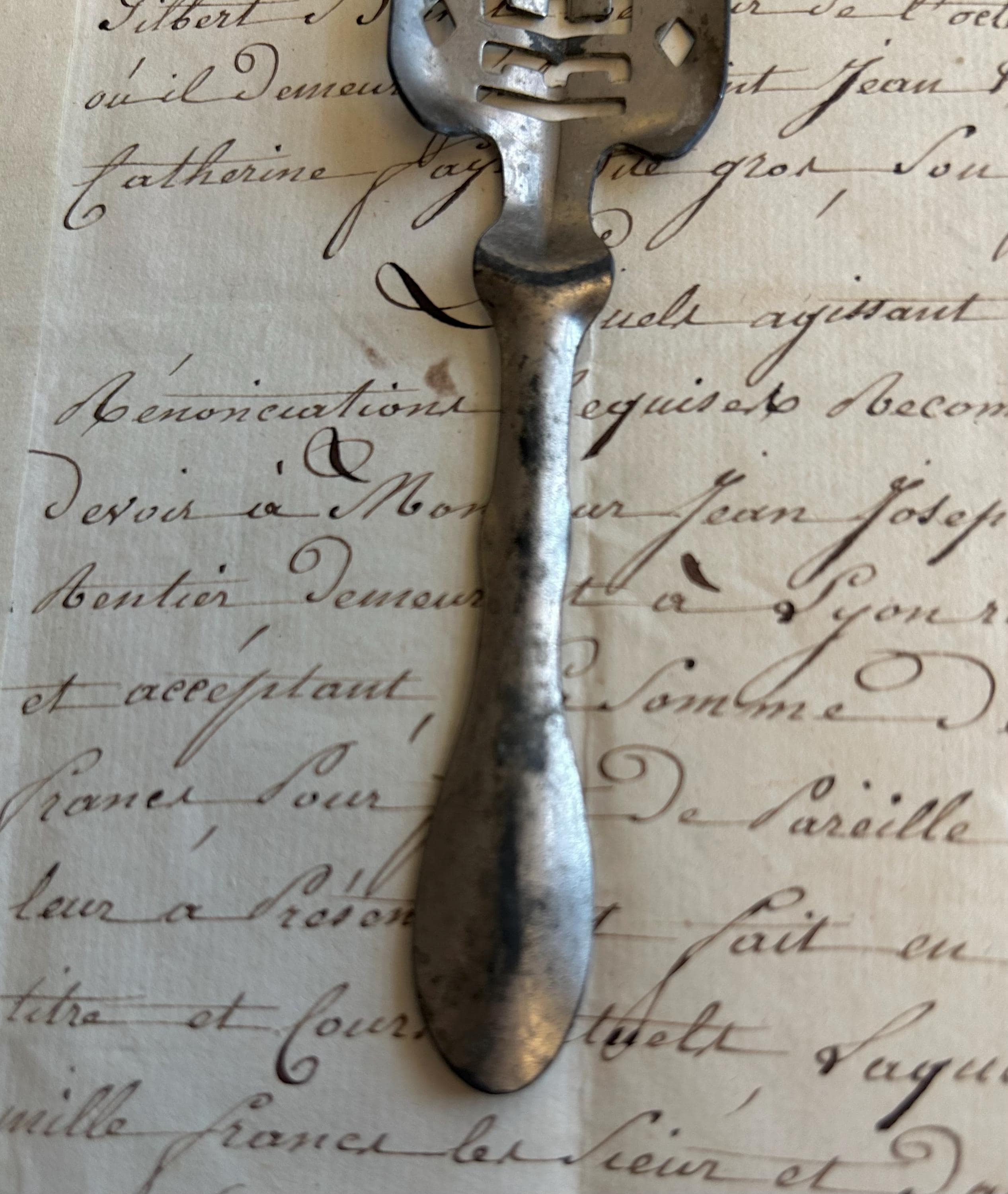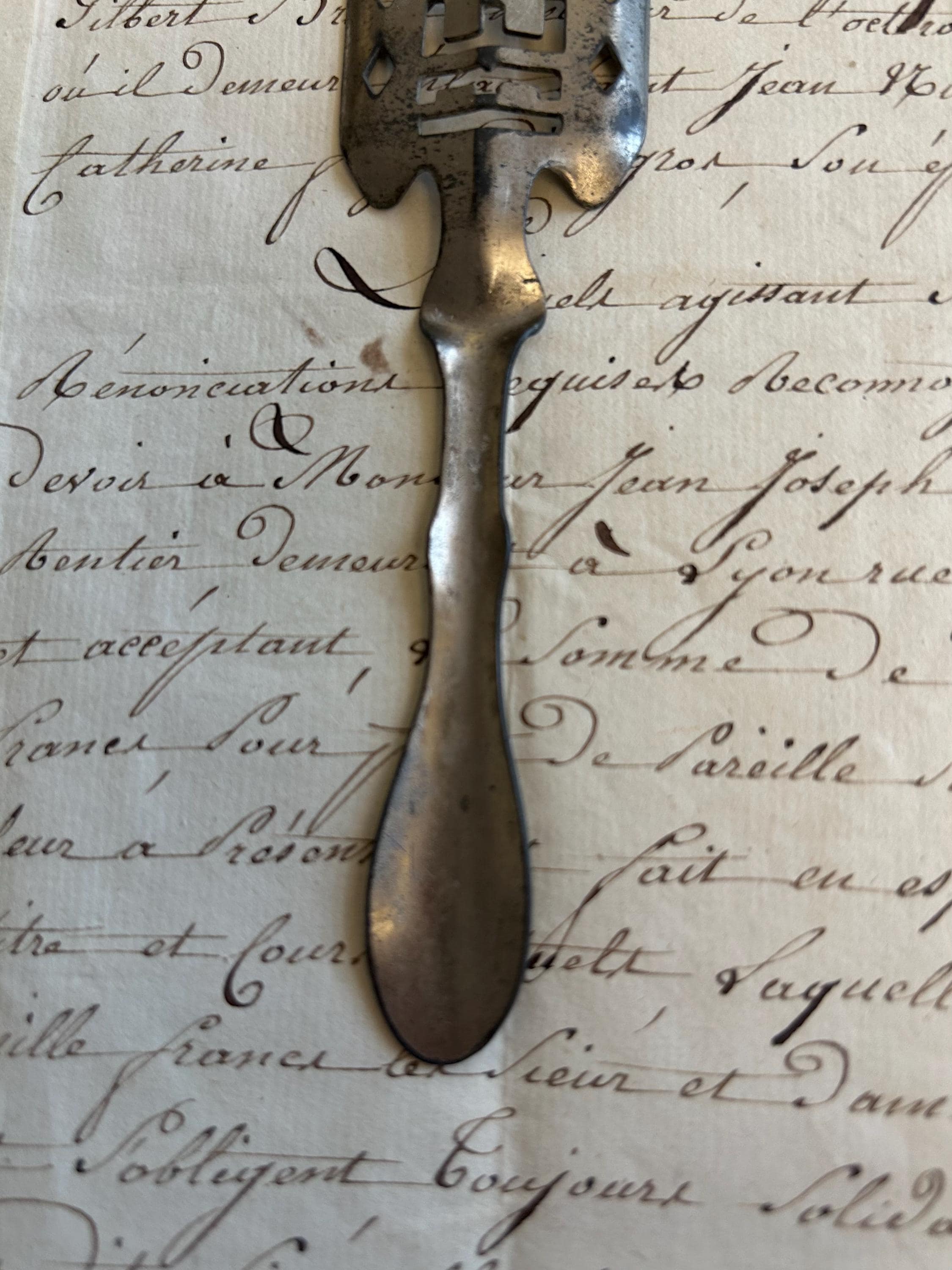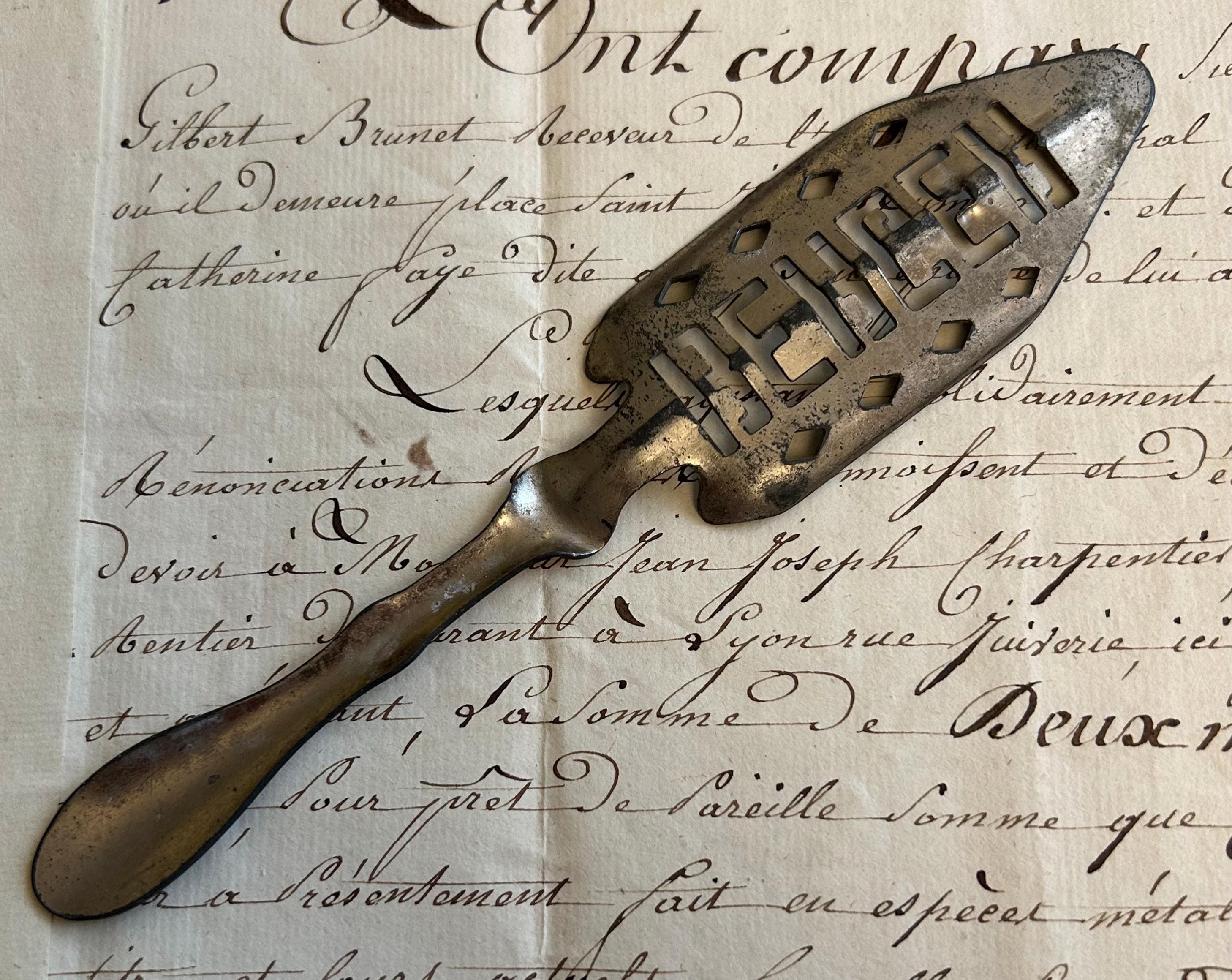 This French, Berger absinthe spoon is comprised of metal and measures 6.25" in length.