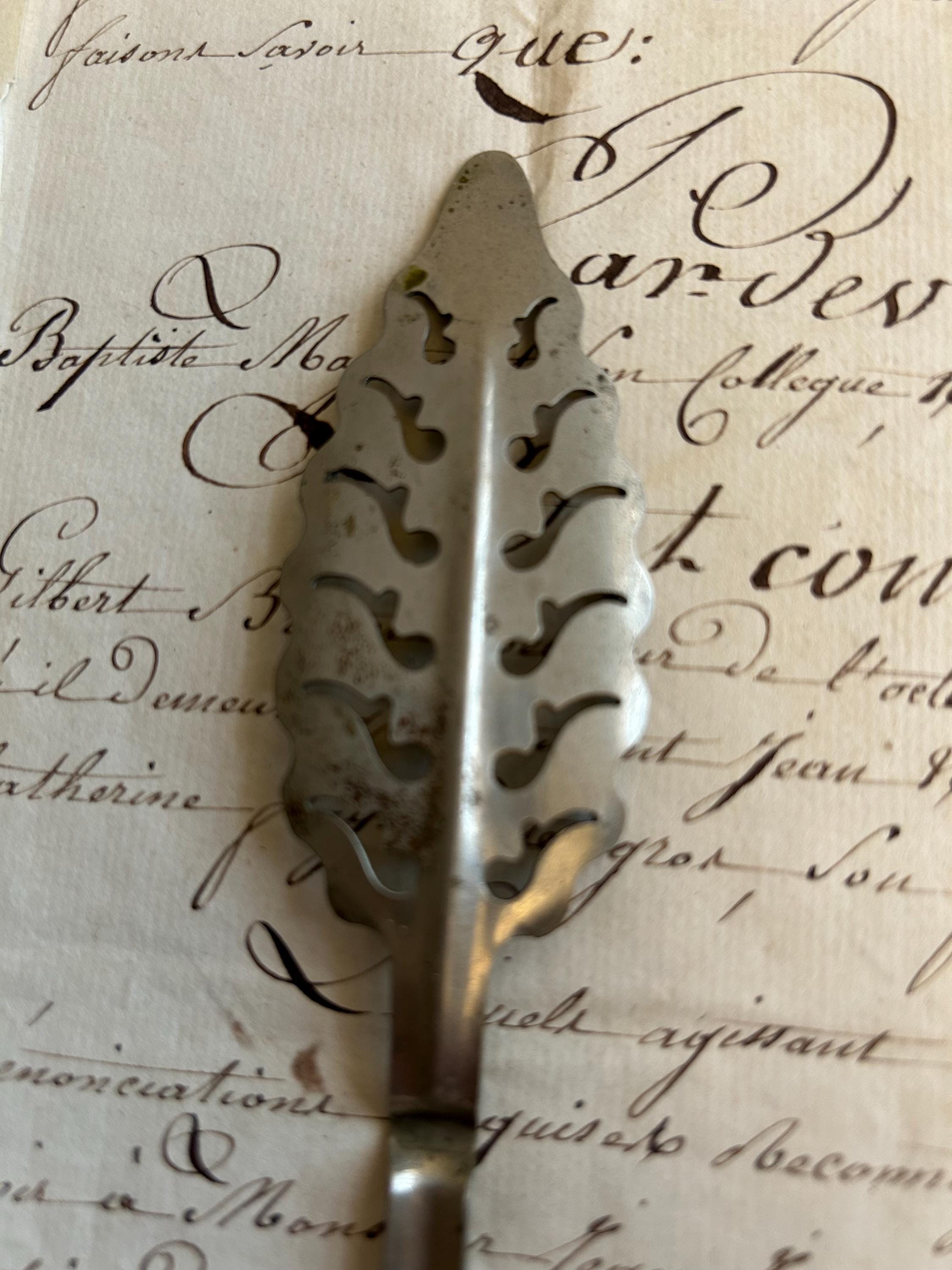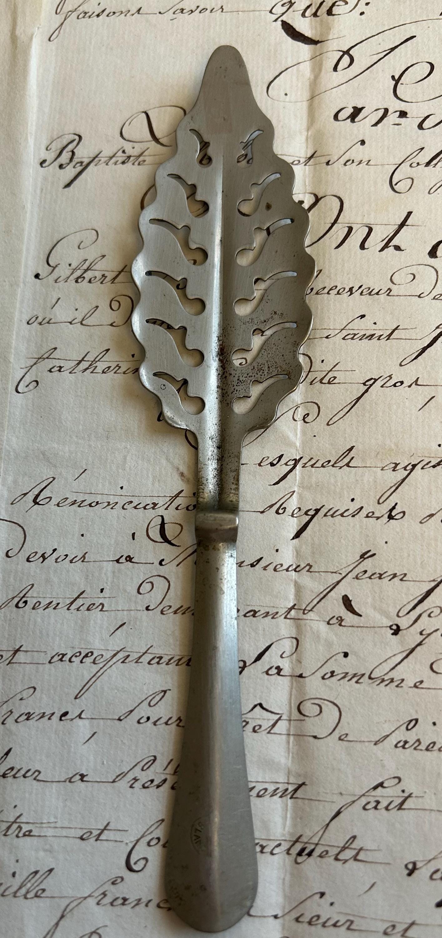 This French absinthe spoon is comprised of metal and measures 6.25" in length. It is shaped like a leaf from the wormwood tree. Wormwood is used to manufacture absinthe.