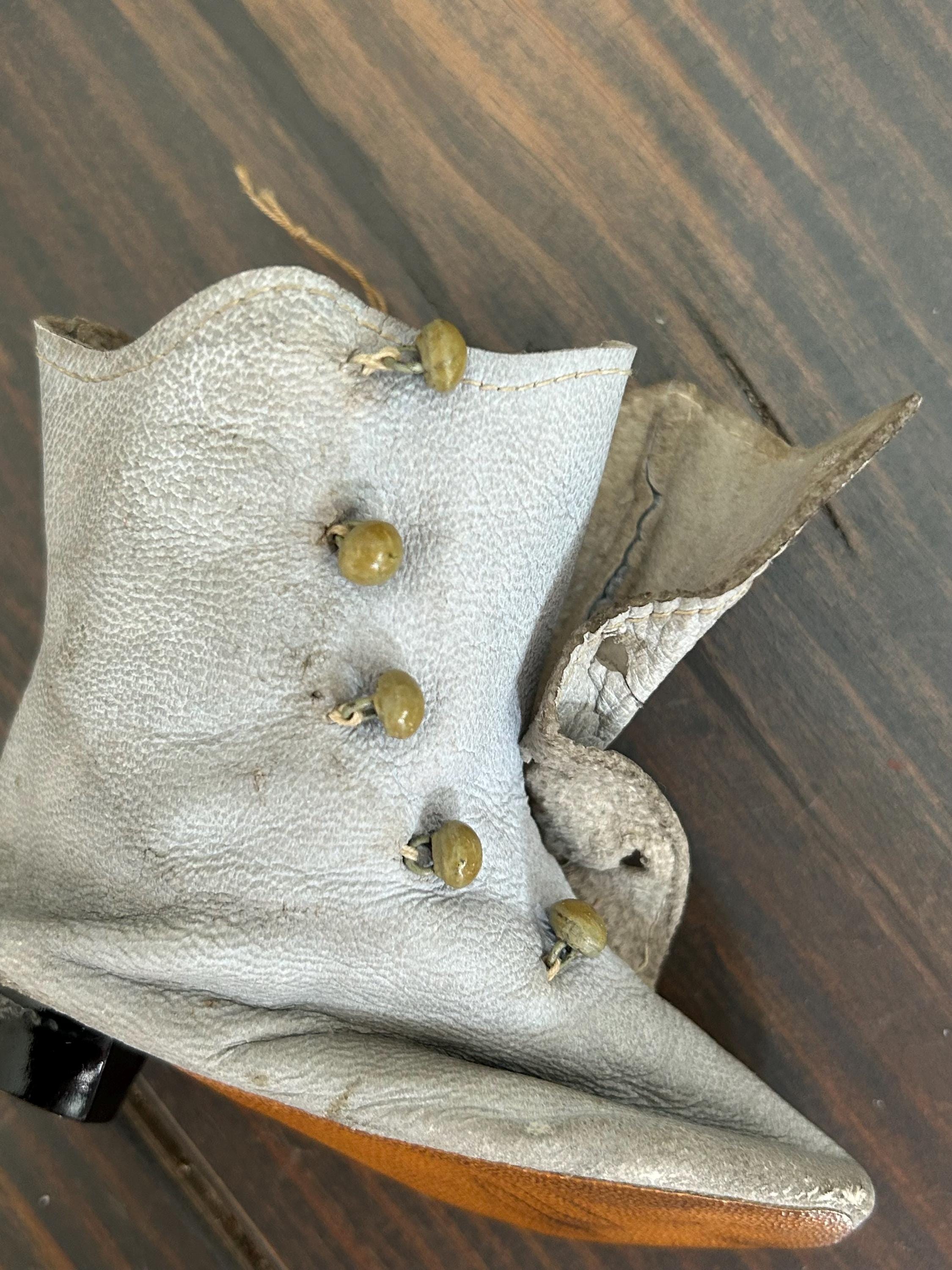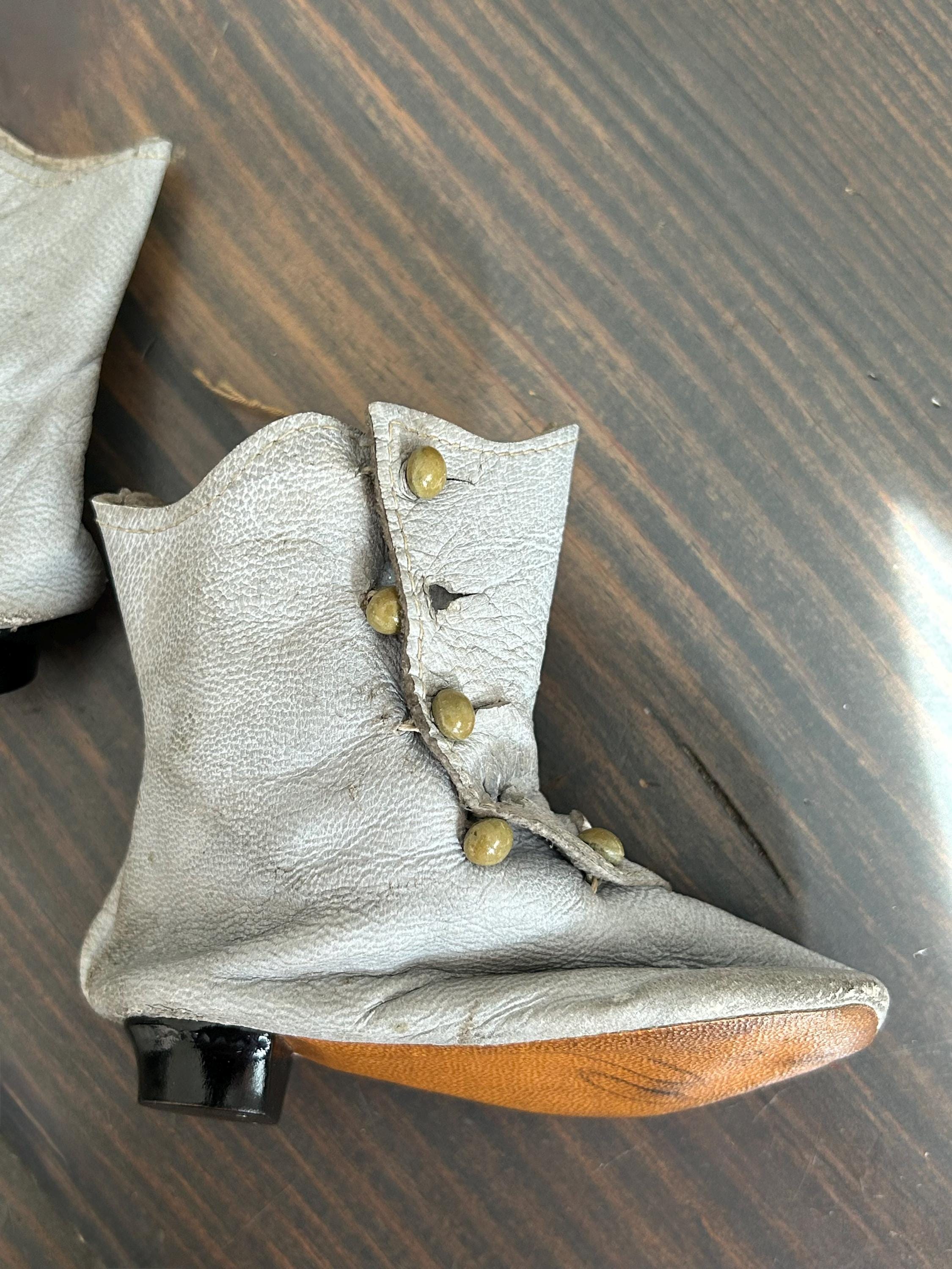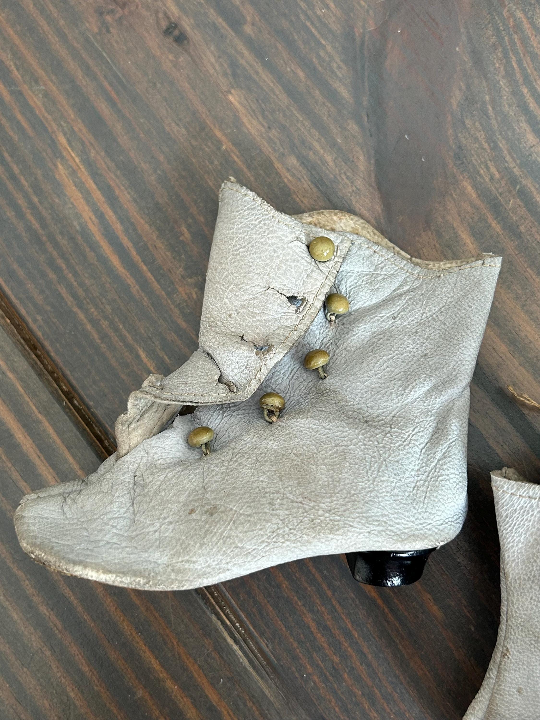 *****Condition: Please note the leather is very worn and discolored. I've wiped the boots with a lightly dampened paper towel but have not endeavored to clean them as I will leave this up to the discretion of the new owner. Additionally, I am not certain as to how clean one can get these boots owing to their fragility and age. All buttons, which I believe to be glass, are intact. Please examine all photos carefully and do let me know if you would like more as I'll be happy to oblige.
