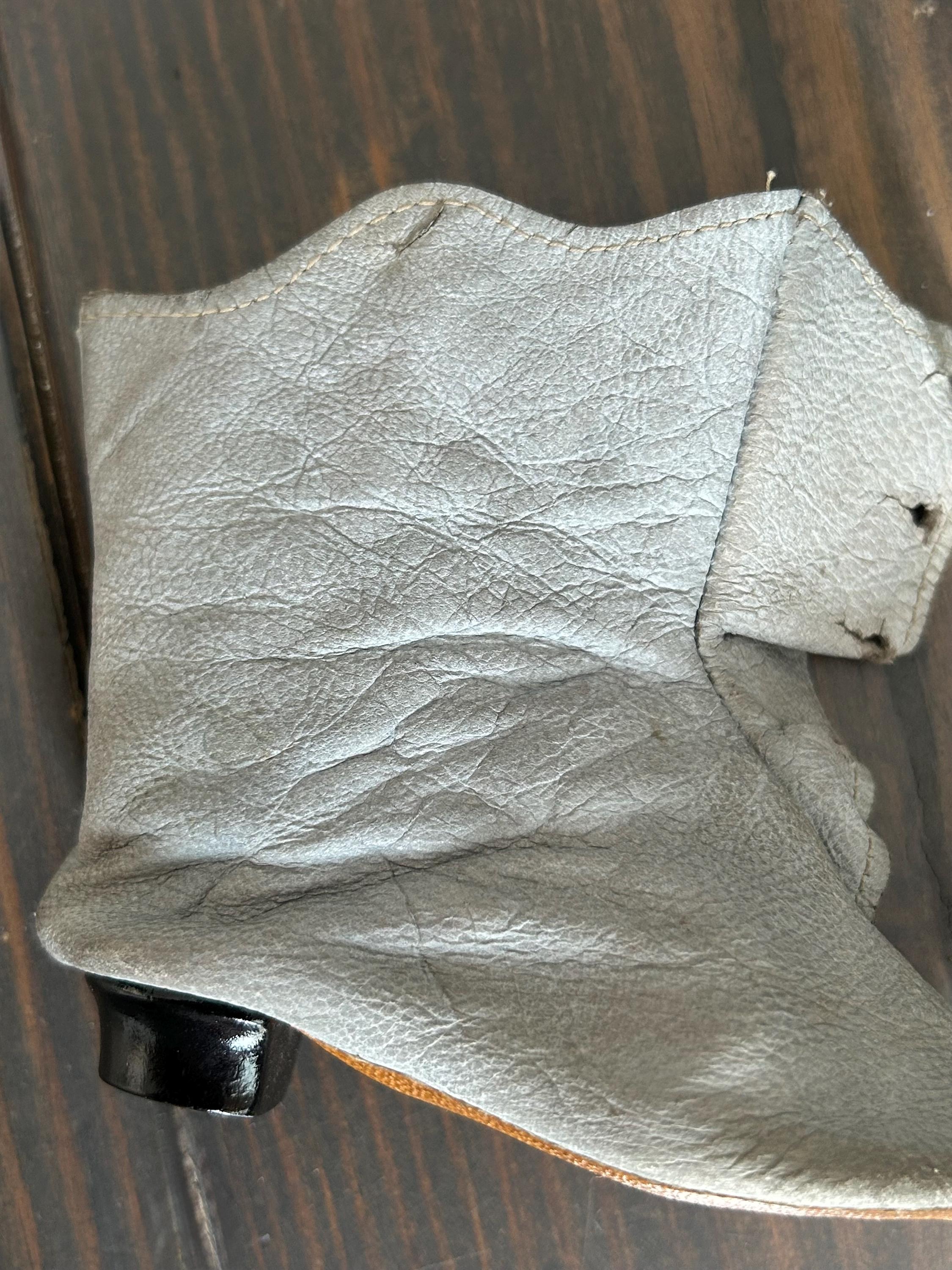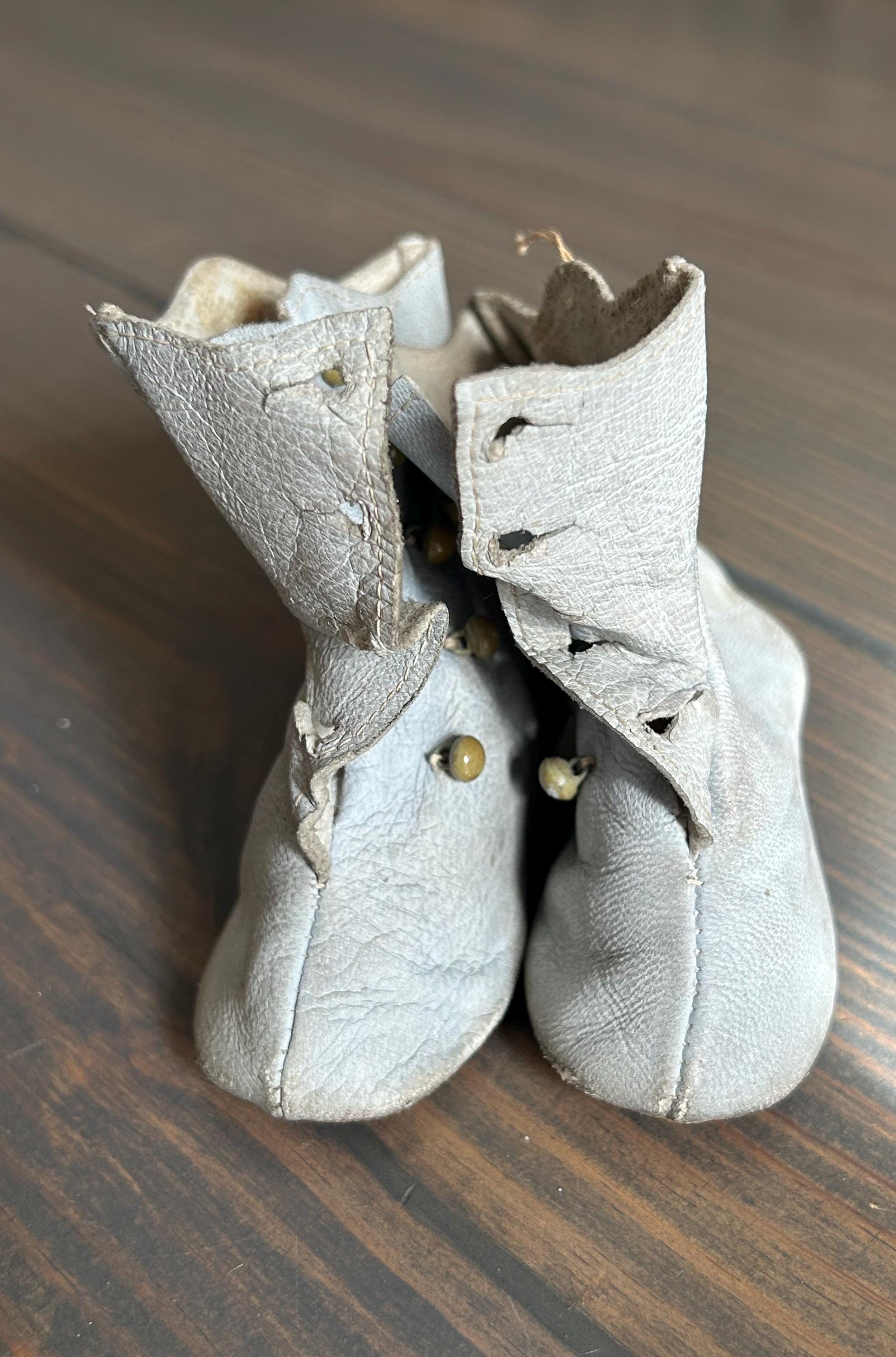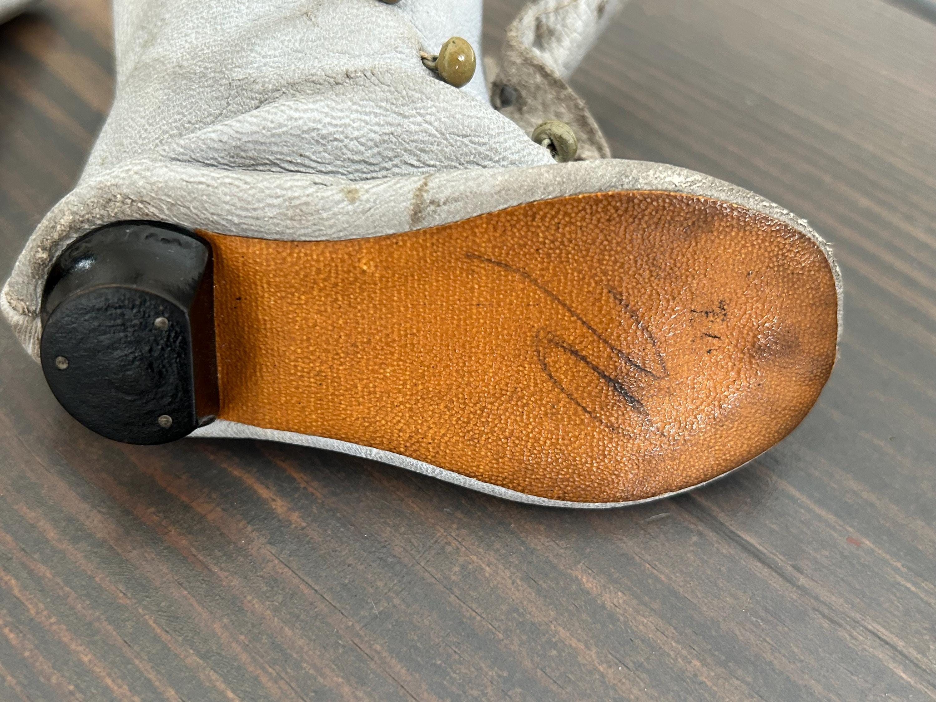 *****Condition: Please note the leather is very worn and discolored. I've wiped the boots with a lightly dampened paper towel but have not endeavored to clean them as I will leave this up to the discretion of the new owner. Additionally, I am not certain as to how clean one can get these boots owing to their fragility and age. All buttons, which I believe to be glass, are intact. Please examine all photos carefully and do let me know if you would like more as I'll be happy to oblige.
