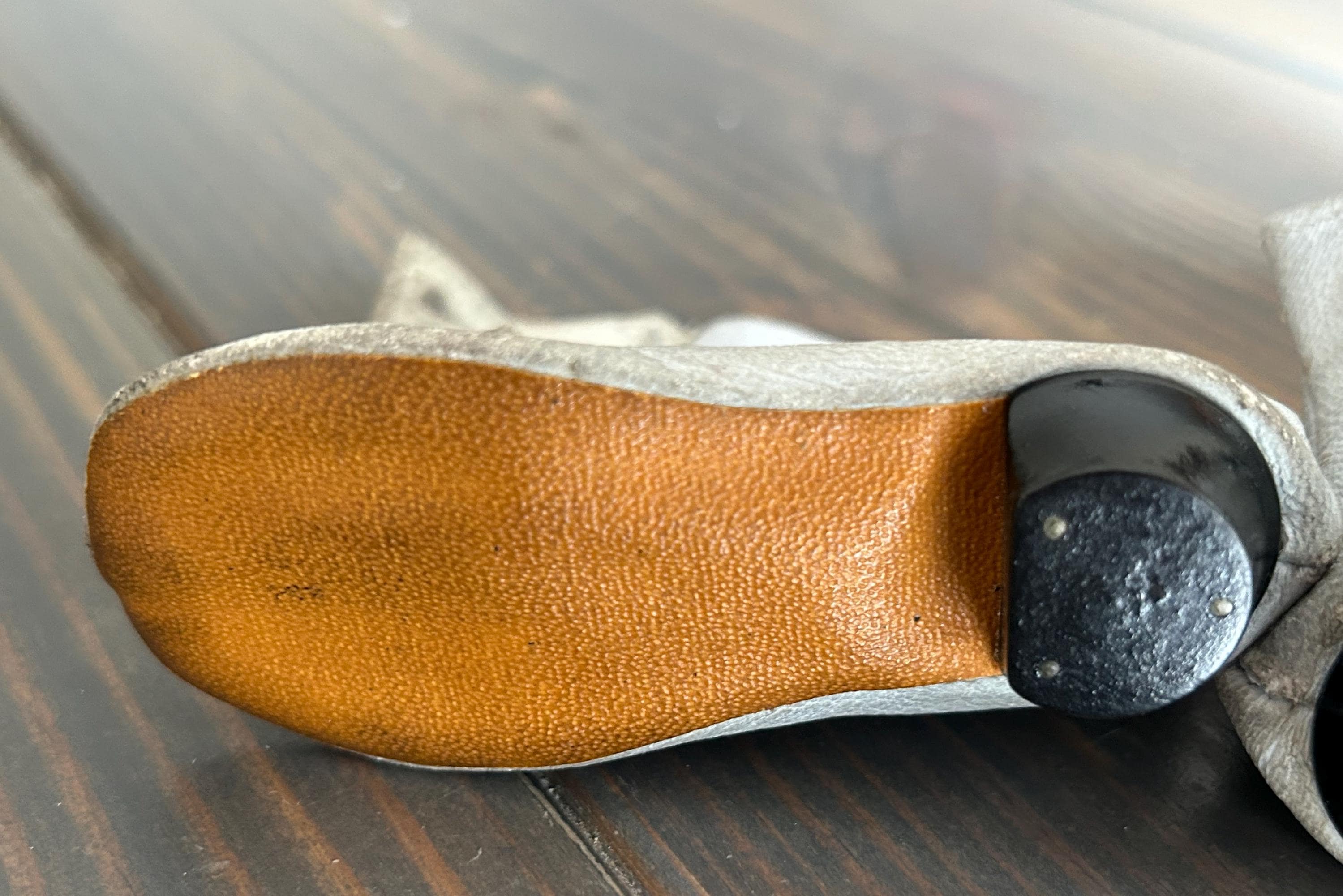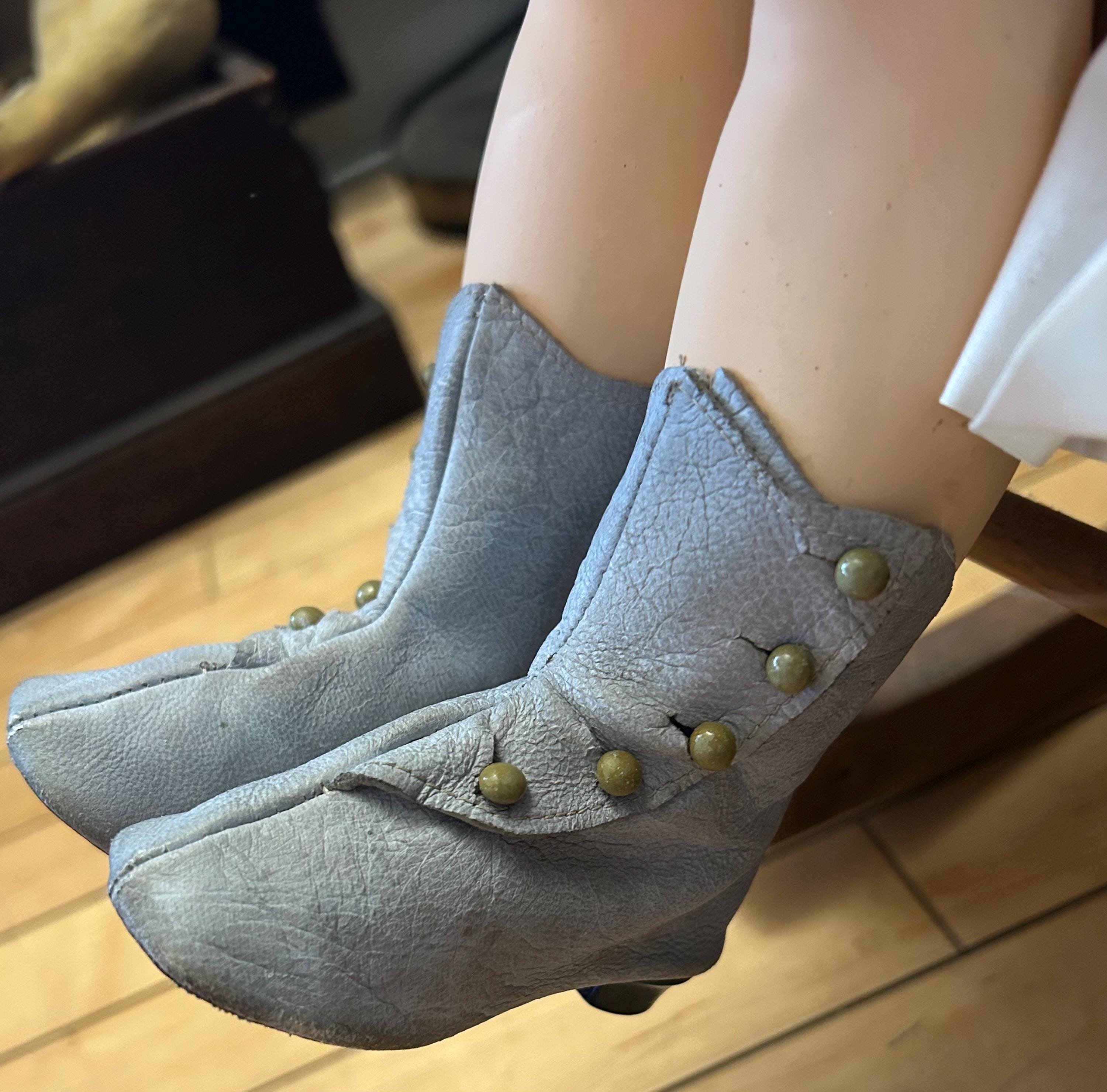 This pair of leather button-up doll boots is circa late 1800s. They are modeled by my Armand Marseille bisque and composition doll. The doll measures 22.5" in height, and the sole of her foot measures 2.25" in length. The leather boot sole measures 3.5" in length. The dimensions from the edge of the leather (beyond the heel, the composition of which I am unsure) to the uppermost edge of the back of the boot measure 2.5". From the front edge of the toe to the uppermost edge of the front of the boot measures 4". The heel is approximately ½" in height. The narrowest portion of the sole is 1" and 1.5" at its widest.