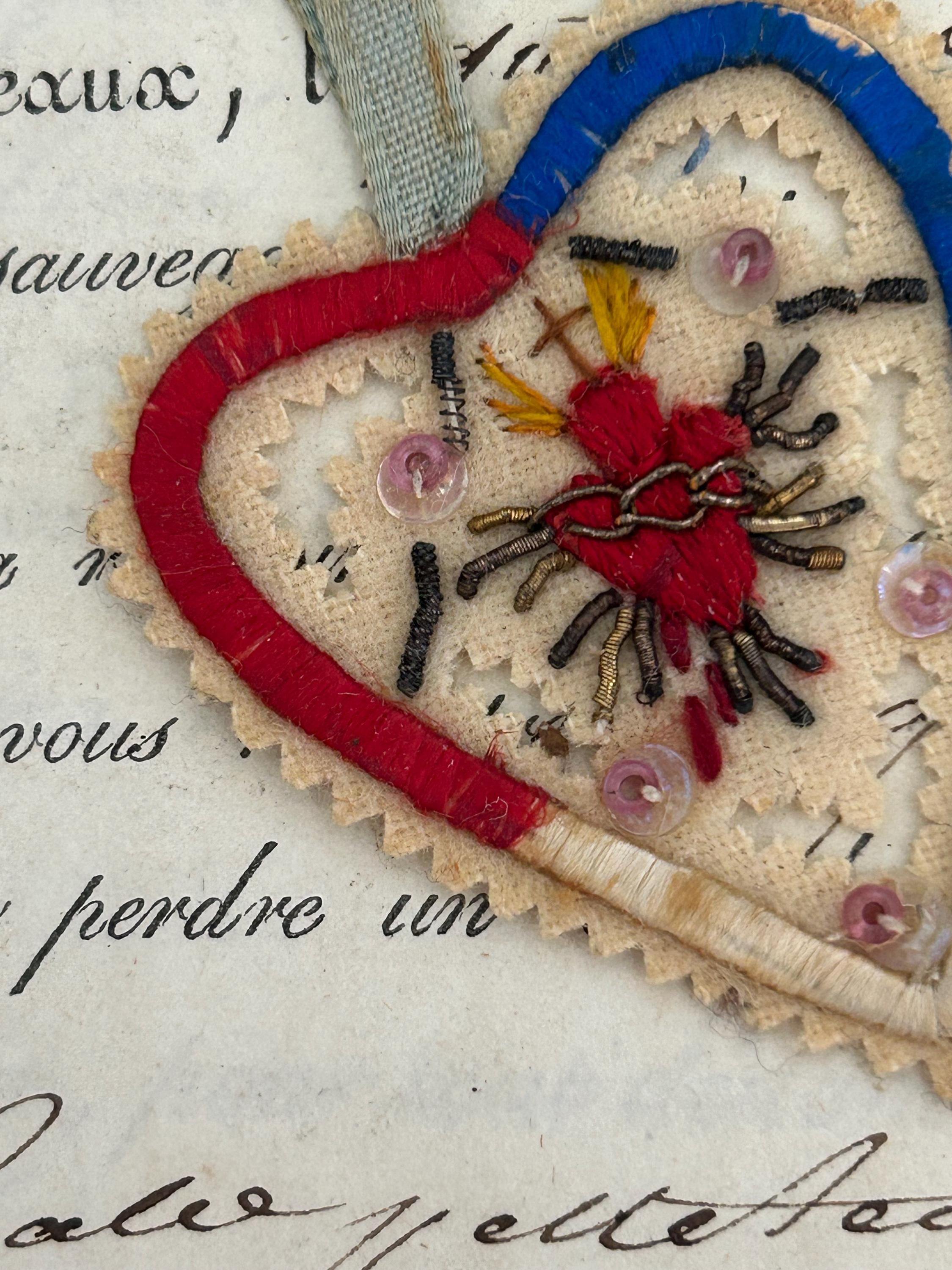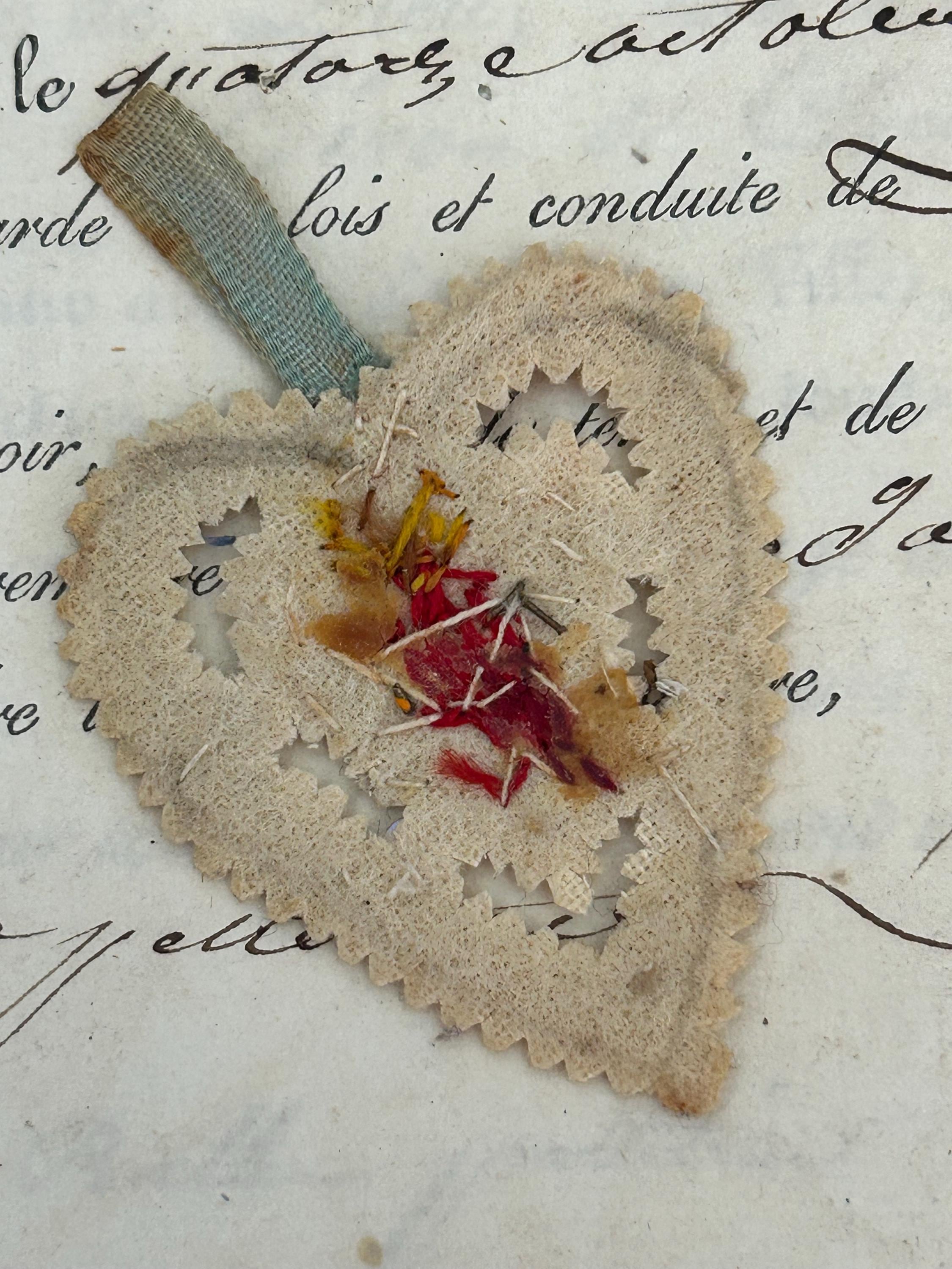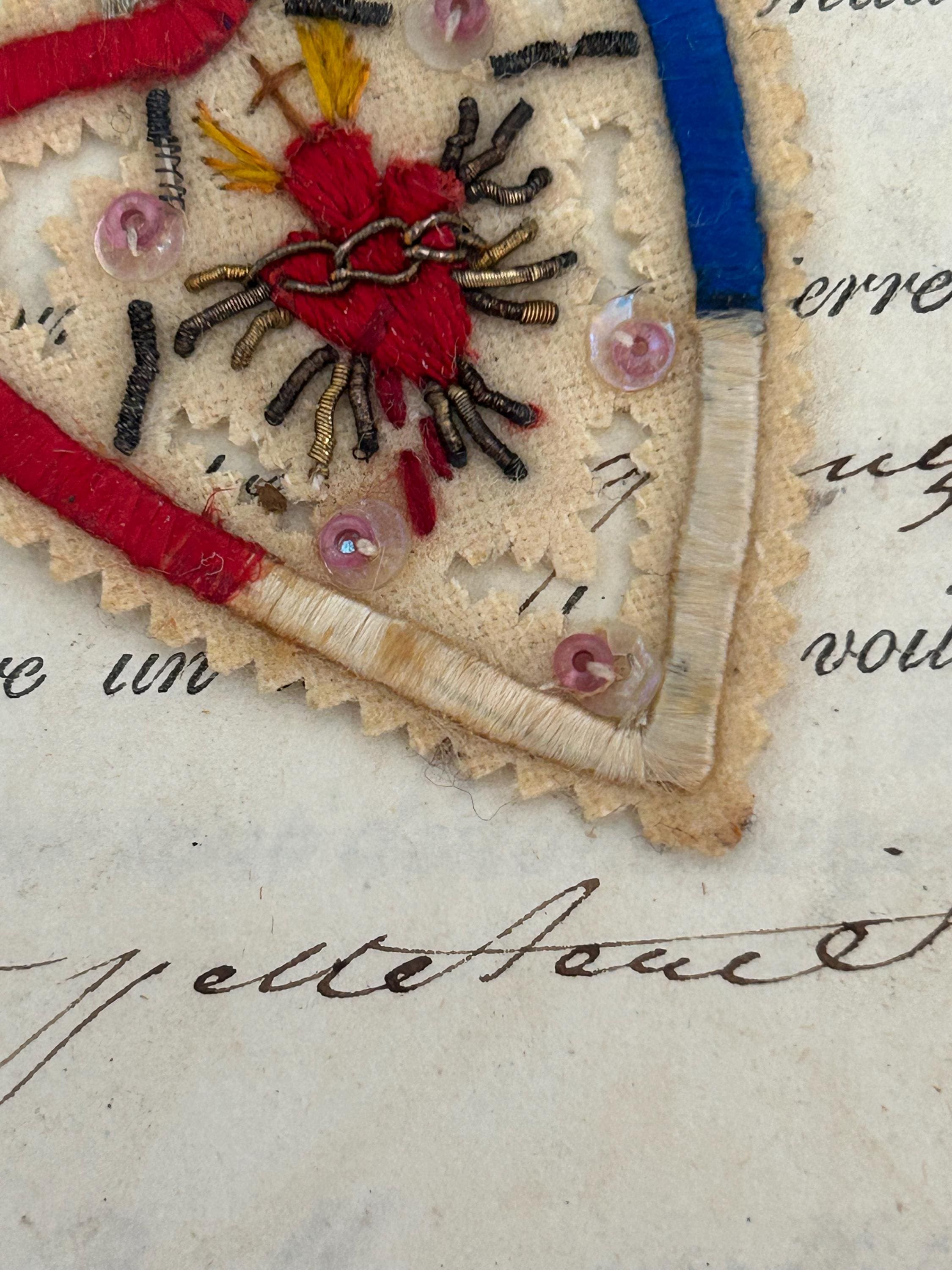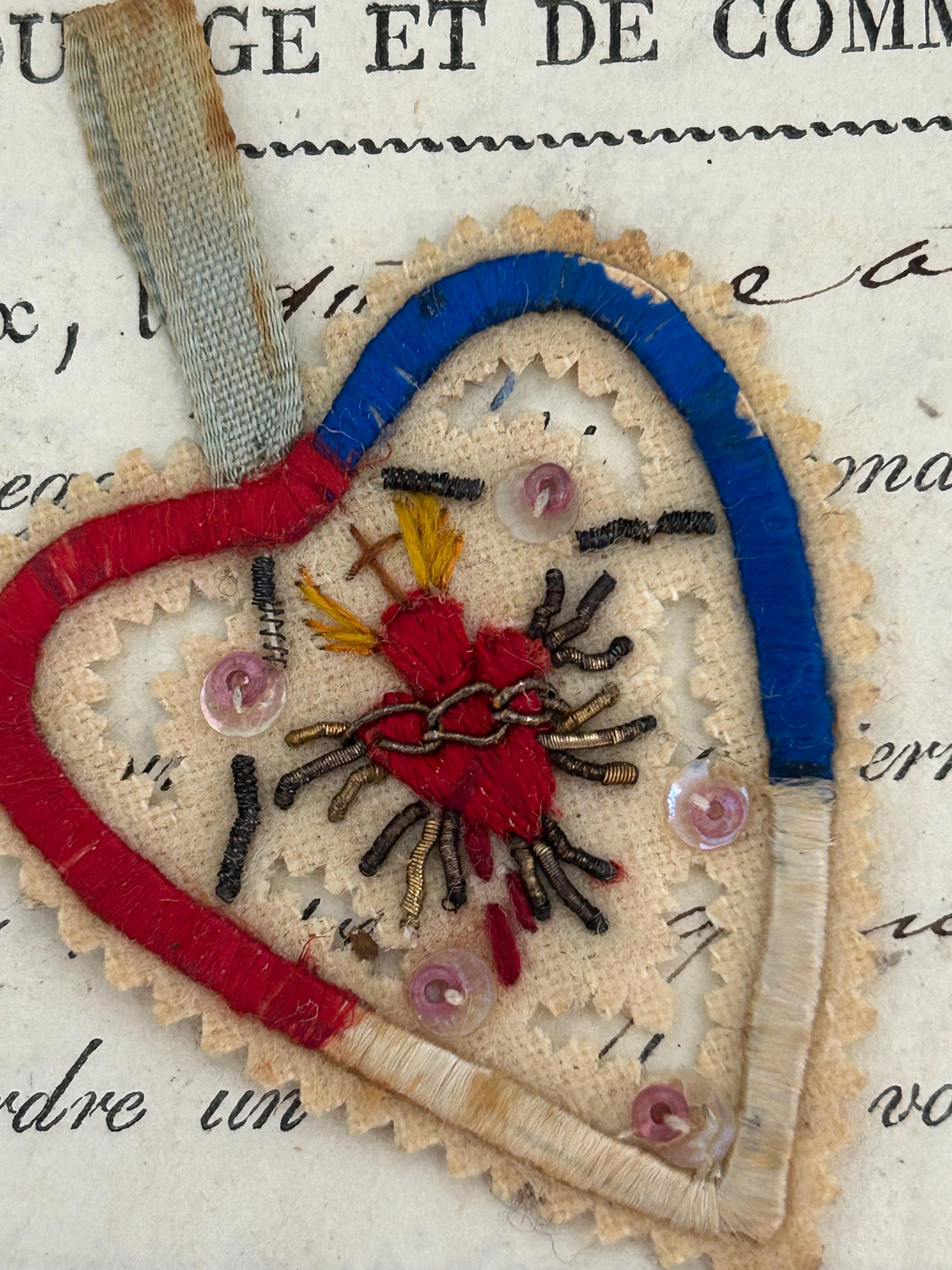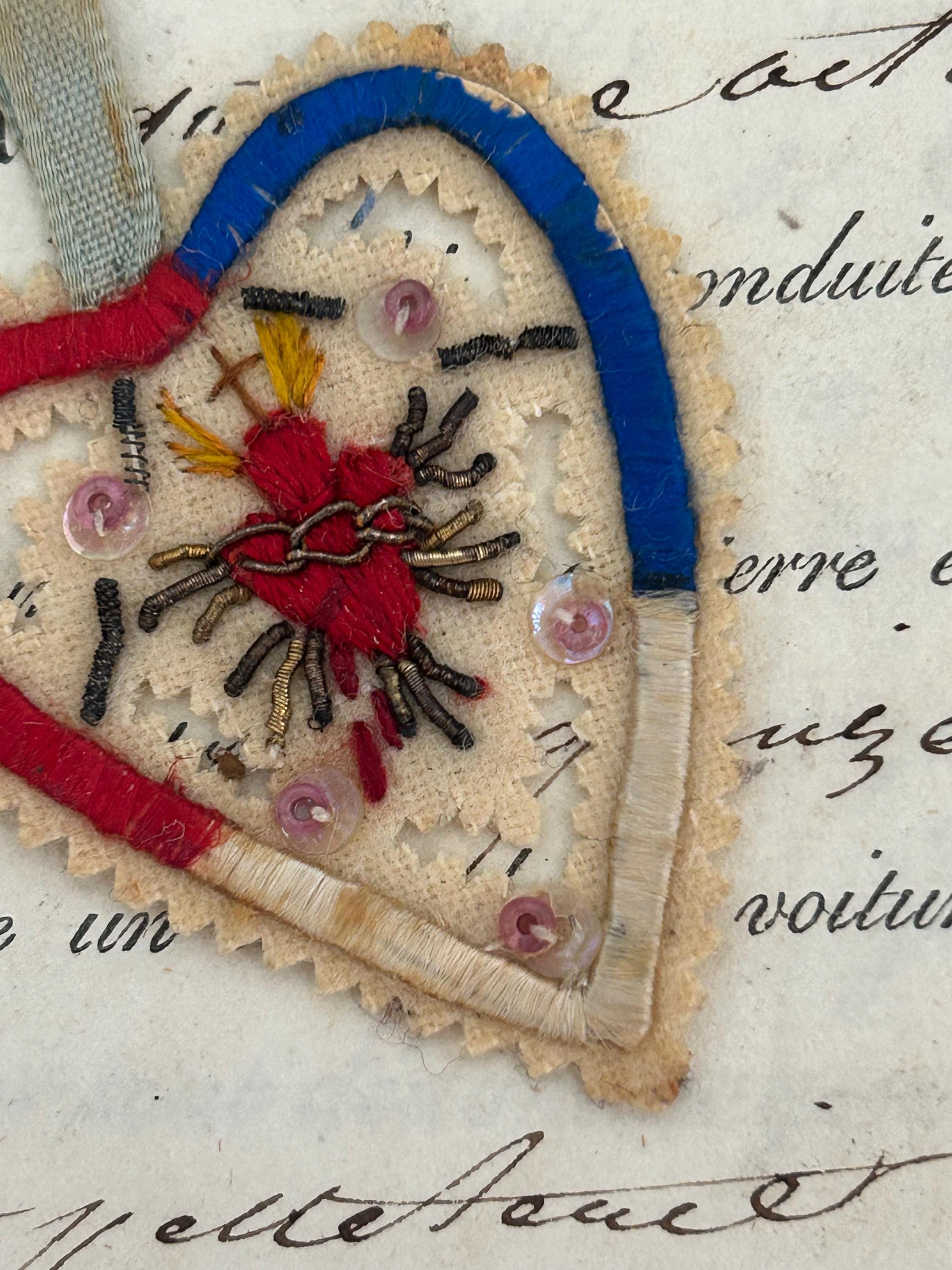 This antique (circa 1900s) Sacré Cœur détente from France is embroidered and embellished with beads and metal work. It measures approximately 1.5" x 1.5", not including the ribbon, which measures approximately ⅞" in length.
