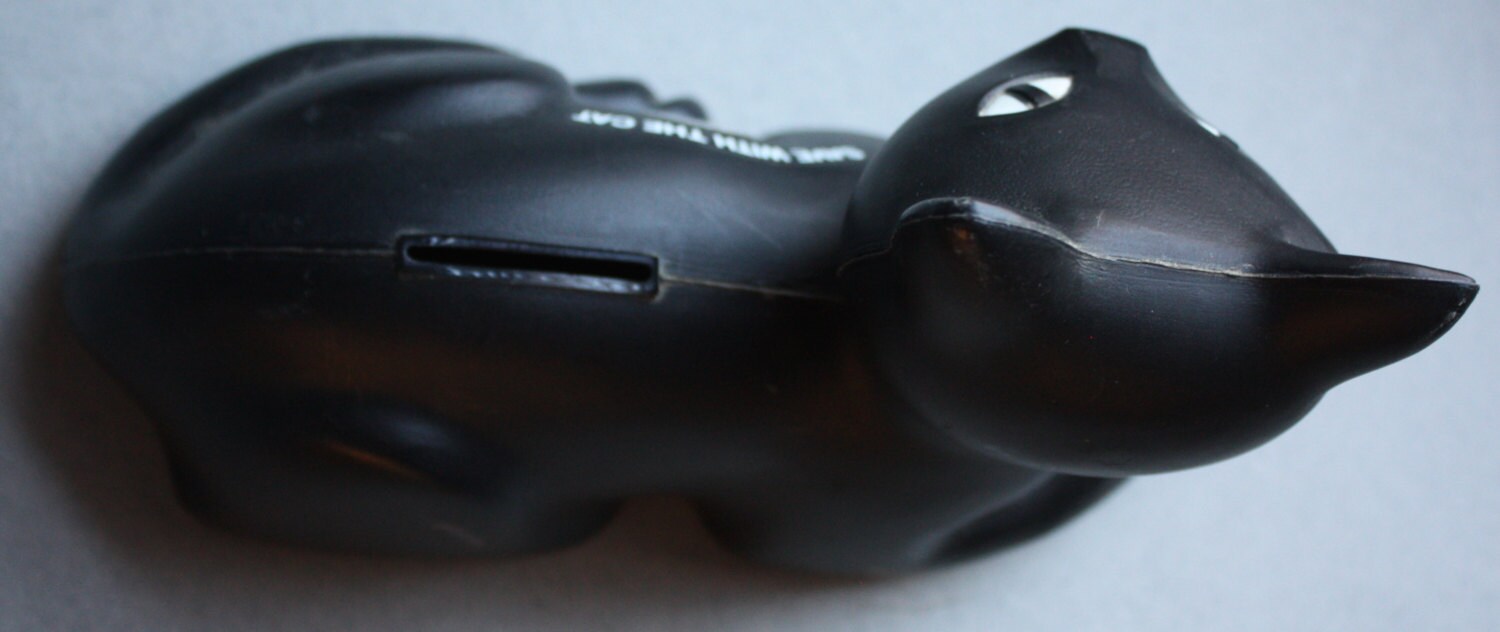 This Eveready black cat plastic bank has a copyright mark of 1981 on its base. Its base is 5 ½" across by 3 ¼". The cat is approximately 5 ½" in height, and measuring across from forepaws to hindquarters, it is approximately 8" in length.