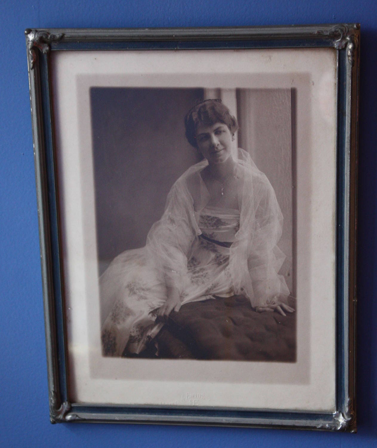 This framed photo of a woman leaning on a chaise or an ottoman is circa 1920s, based on her hairstyle as well as her dress (strapless gown and tulle stole) and the history of the Washington, D.C. firm Harris and Ewing, which began in 1905. In the late 1930s, the photographic firm was the largest of its kind in the U.S.