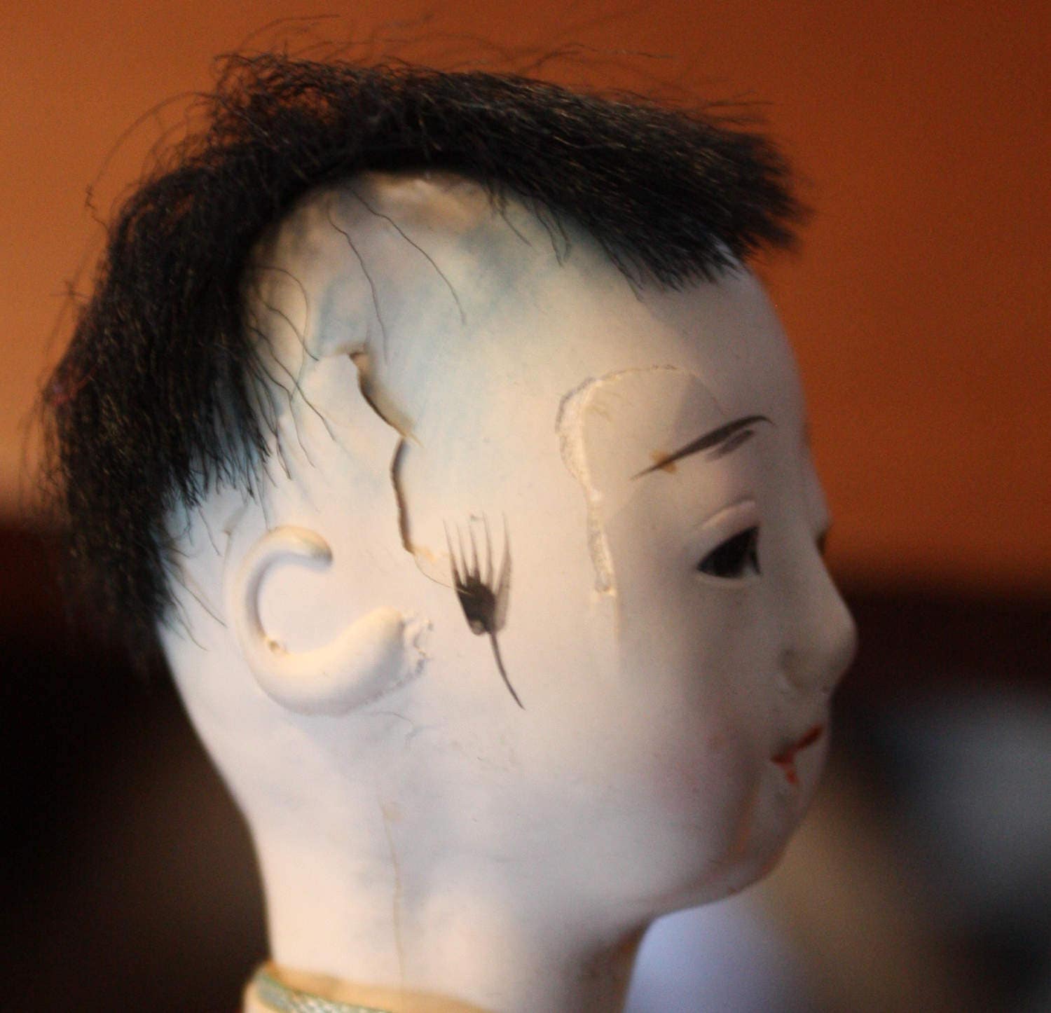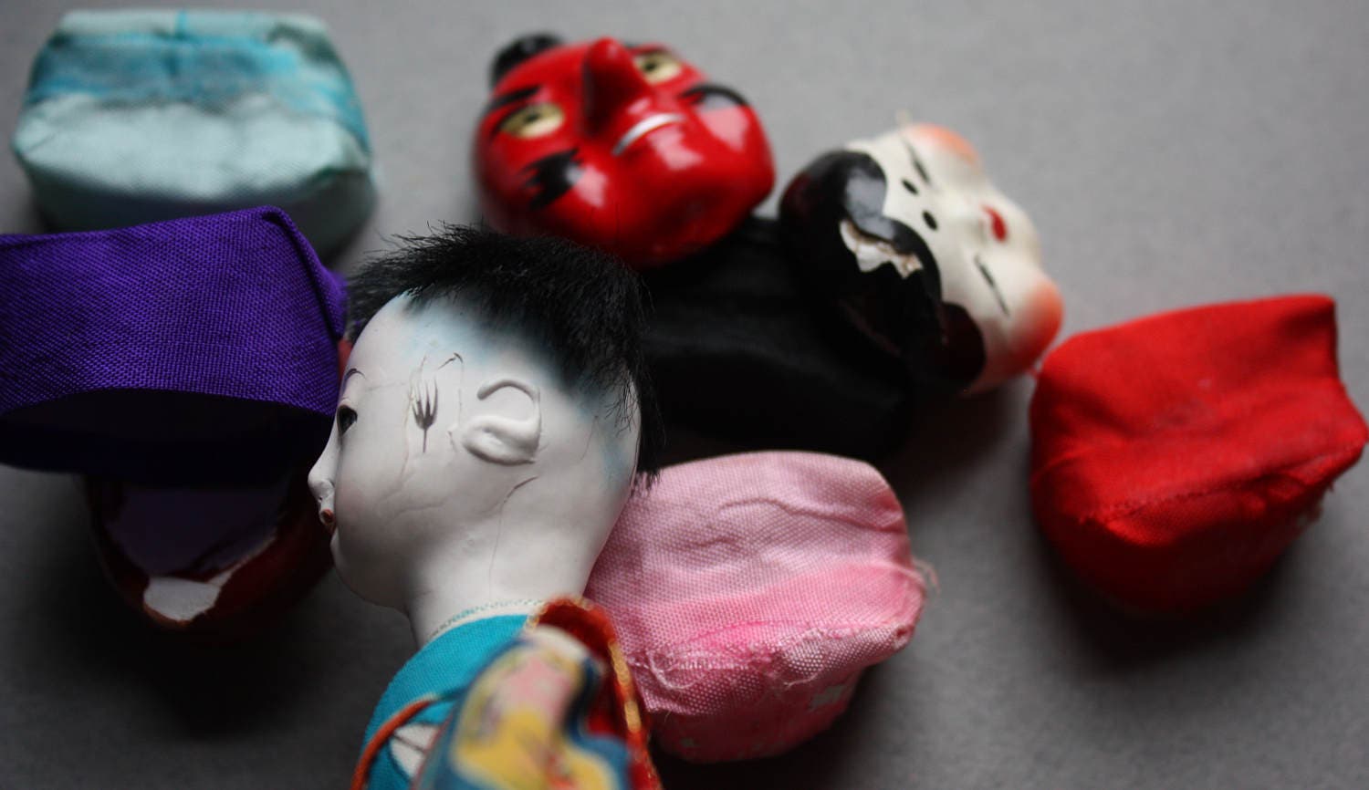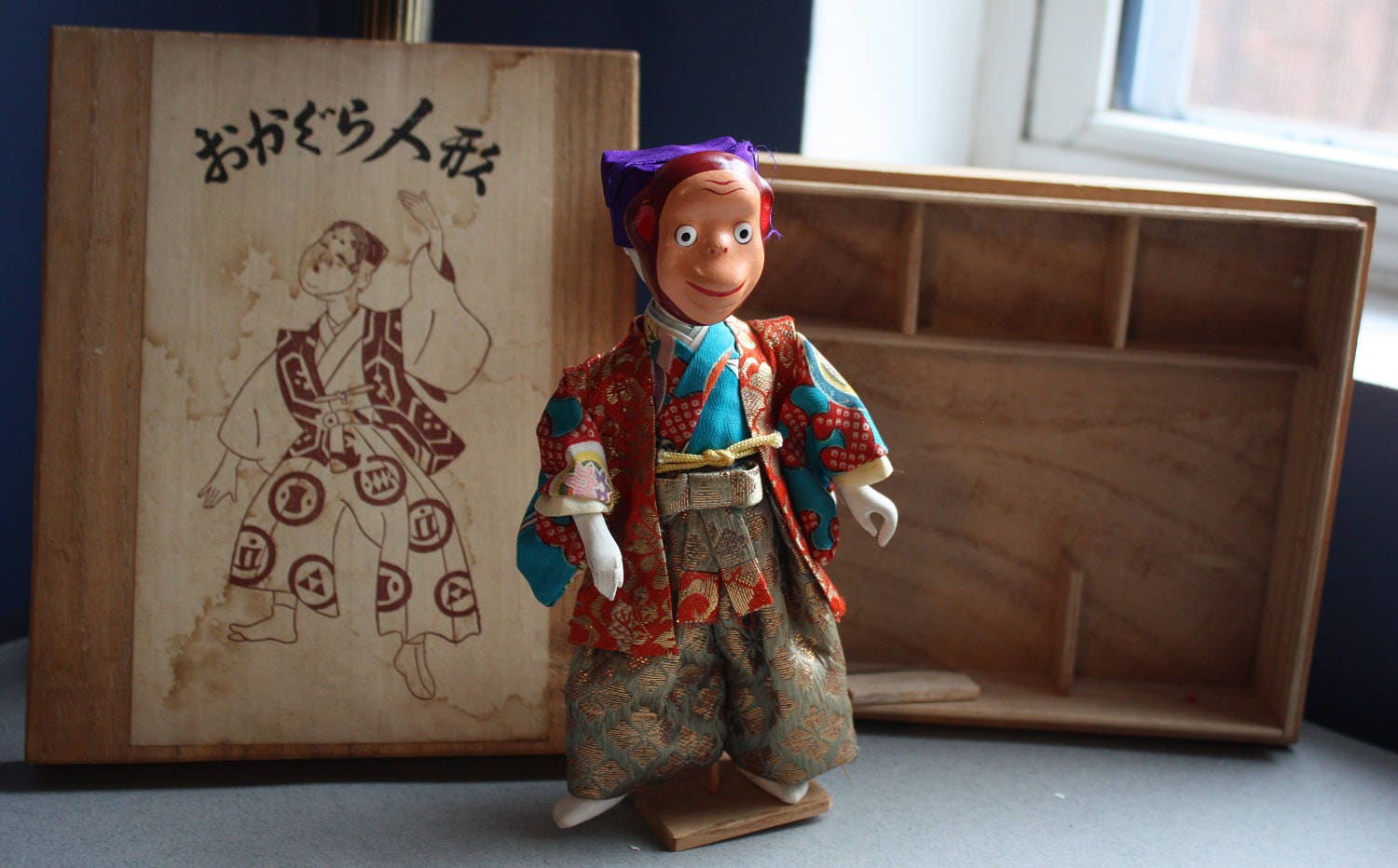Four of the six masks are in good condition although there is chipping, cracking and paint loss on the Okame. Also, the Tengu has some paint loss and flaking on his chin. The lid's paper label is wrinkled and stained in some areas. Also, three of the fabric caps that were once secured to the masks have come off. They are included in the sale, and can be re-attached. The caps slide onto the doll's head so that he wears the mask of your choice, as seen in the first photo. If you'd like more photographs, please let me know and I'll be happy to oblige.