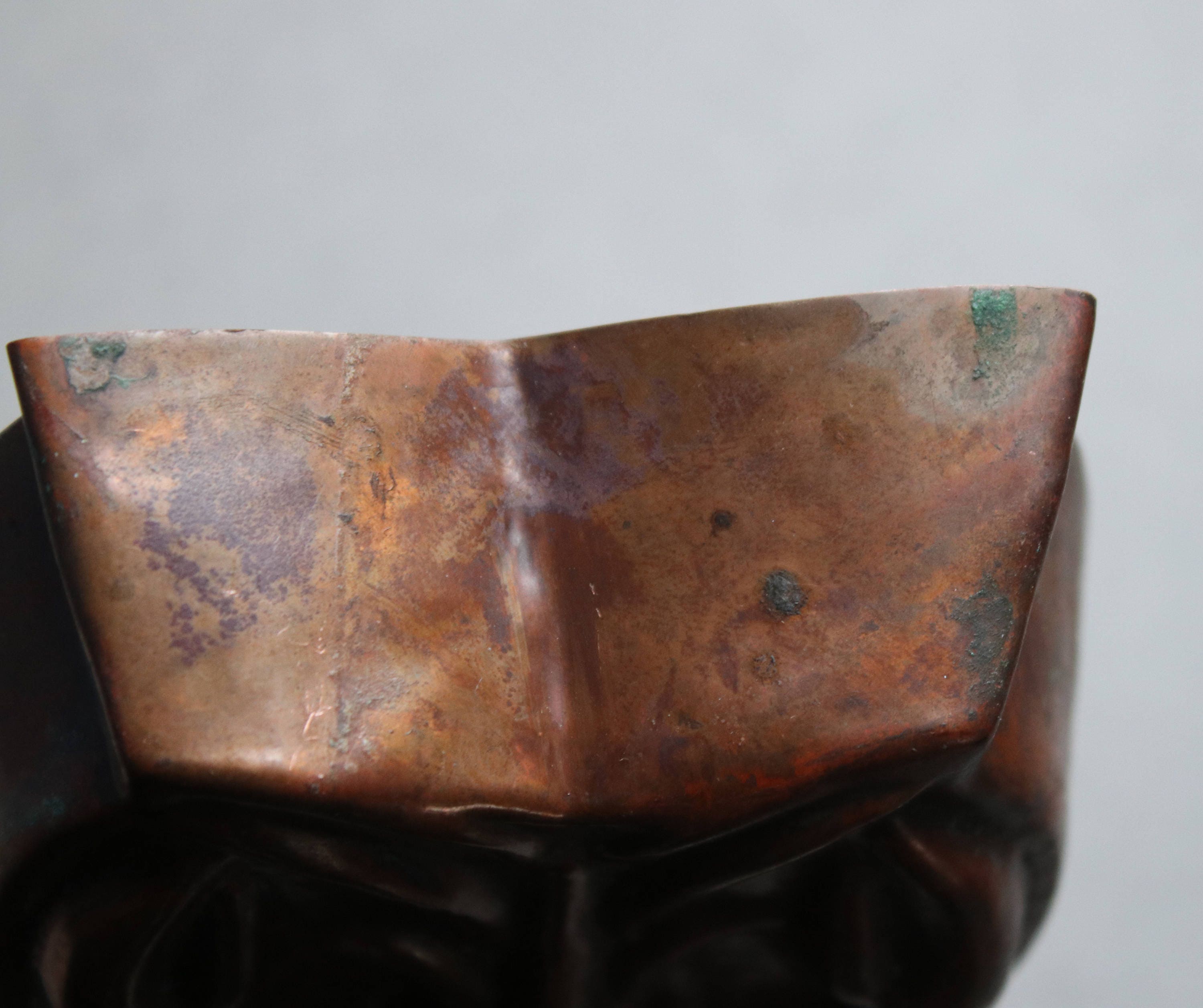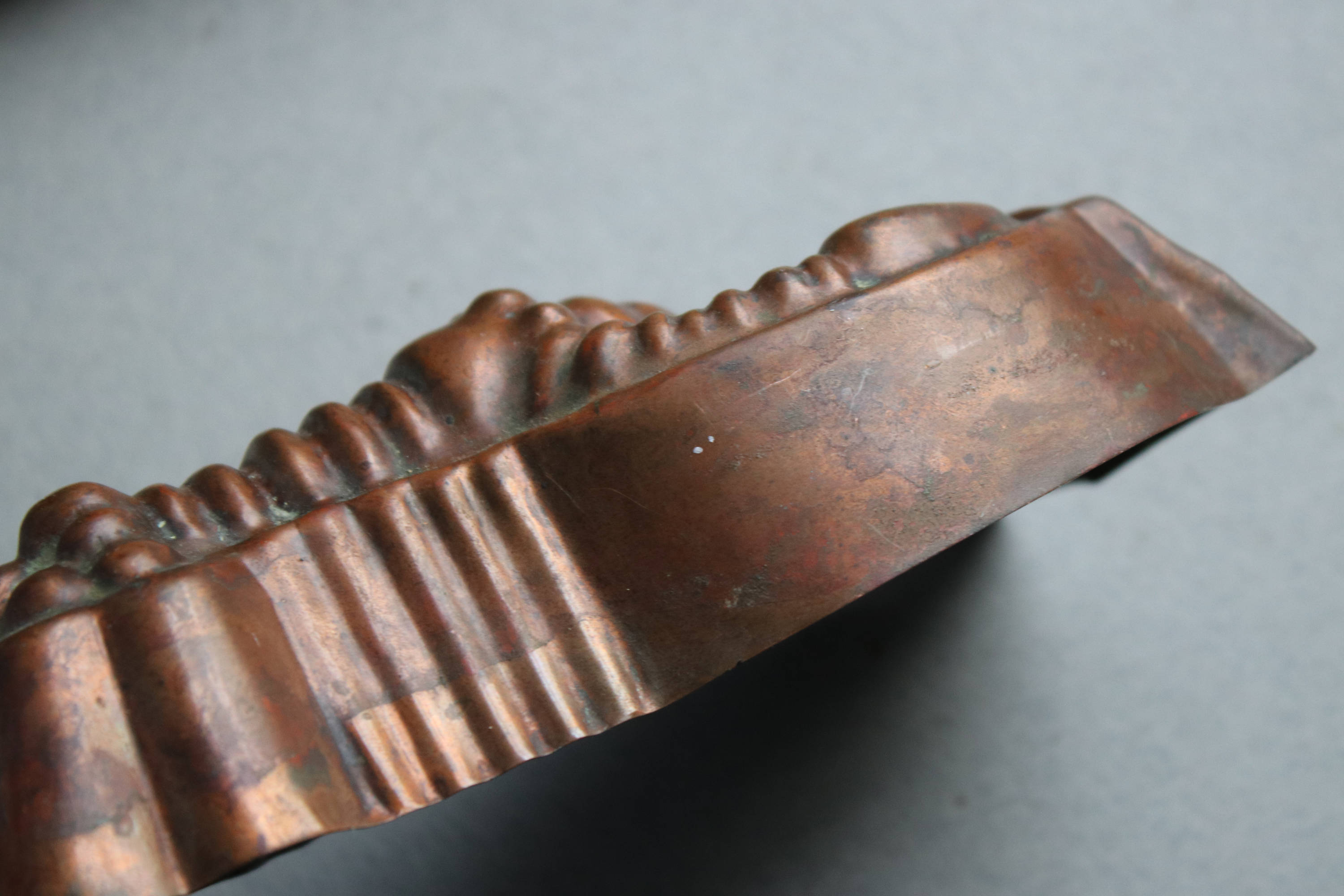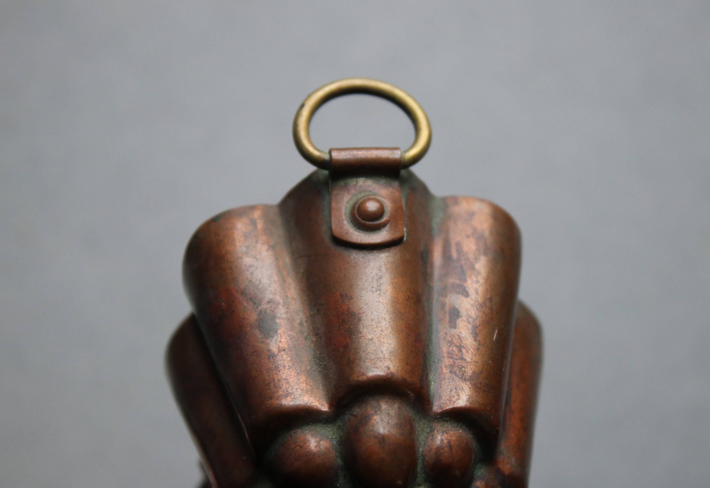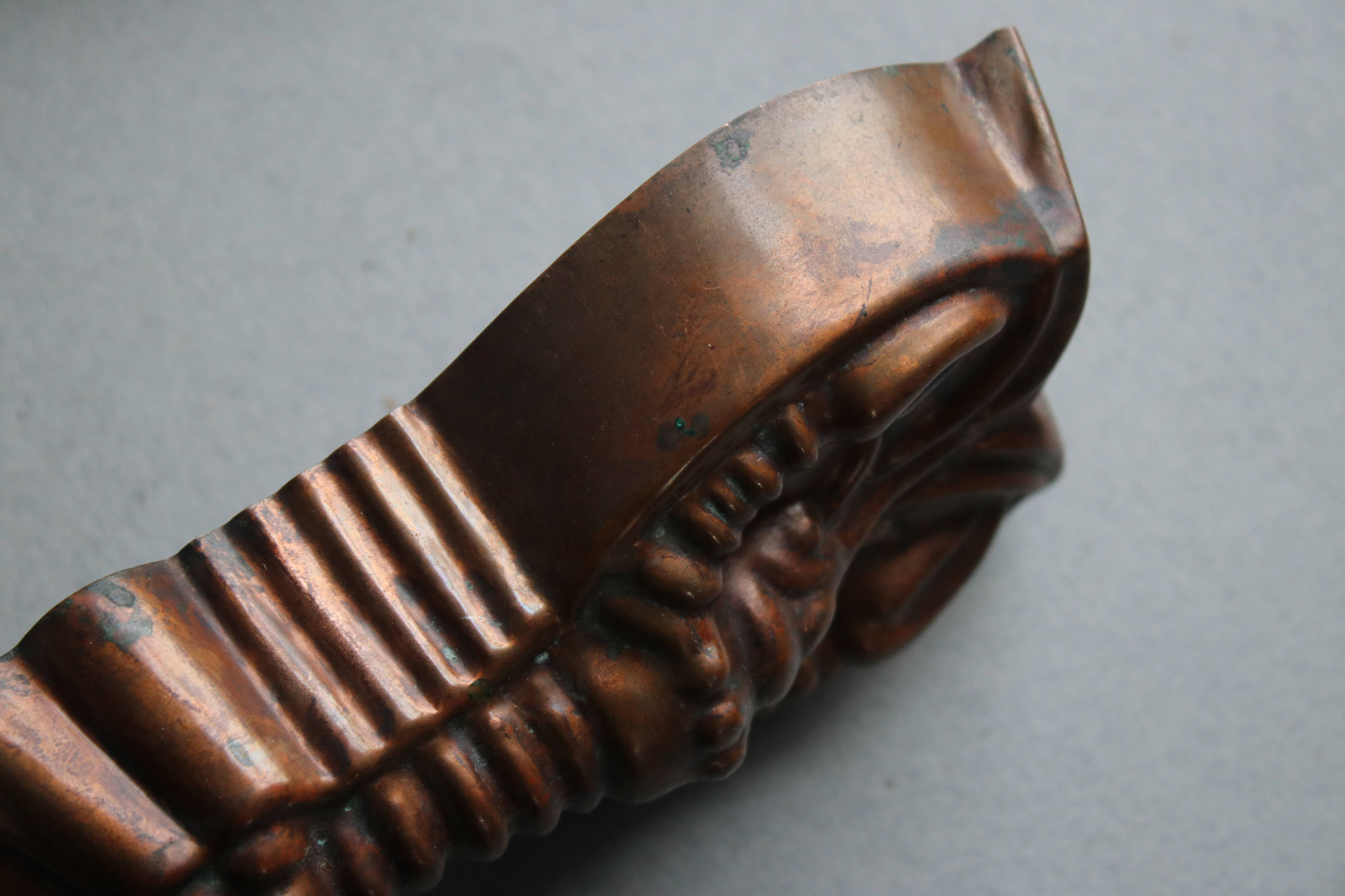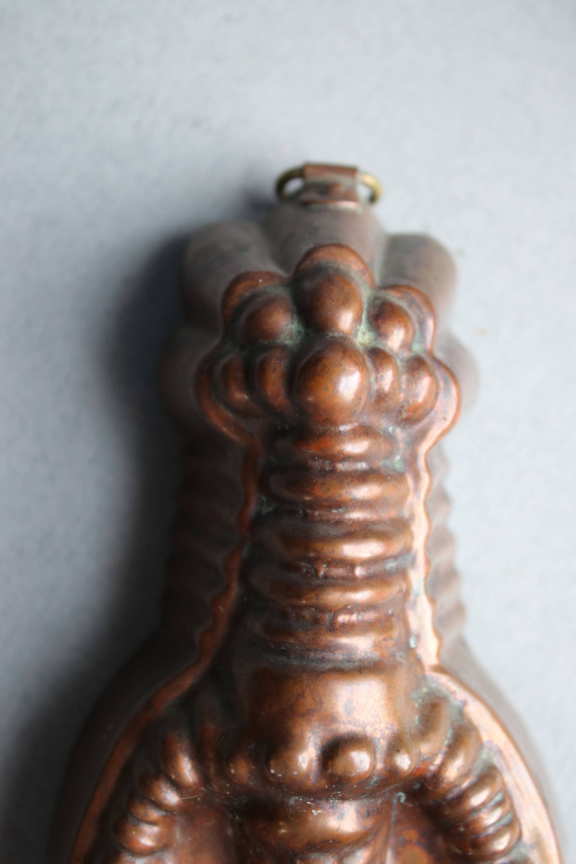 This copper lobster mold has a metal loop for hanging and a rich patina on its surface. Dimensions are 6 1/4" in length, 3 1/2" at its widest and 1 1/8" at its shallowest.