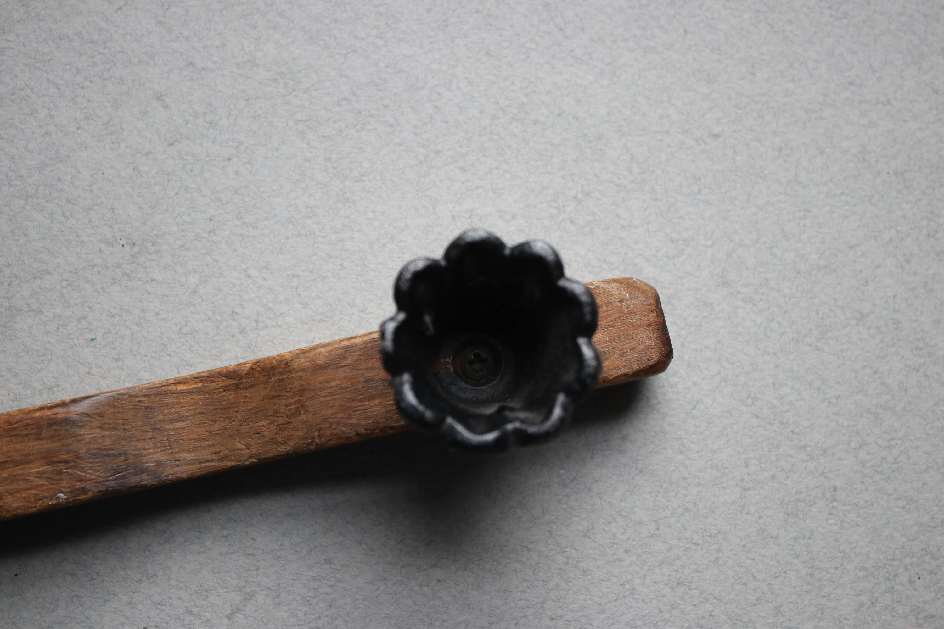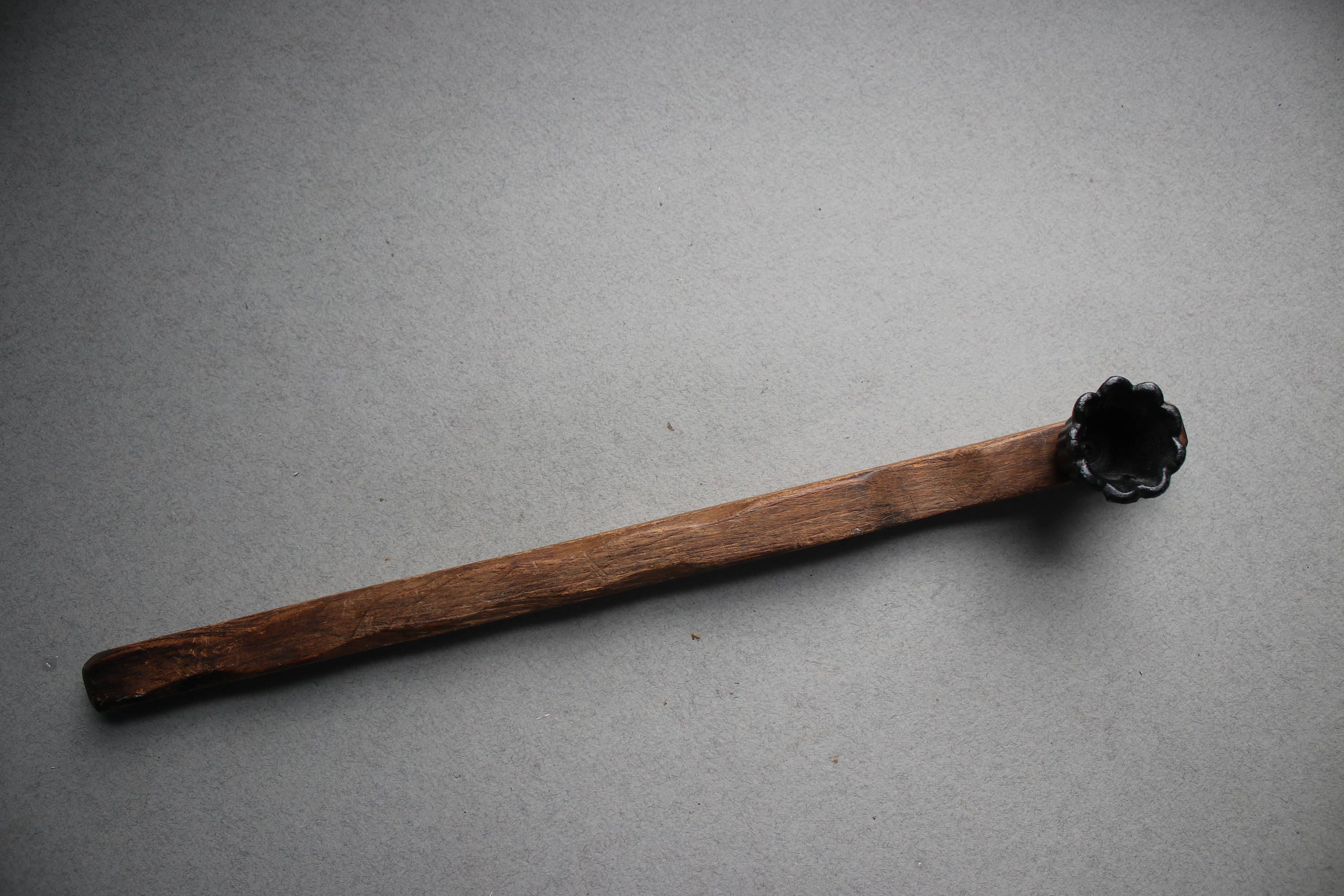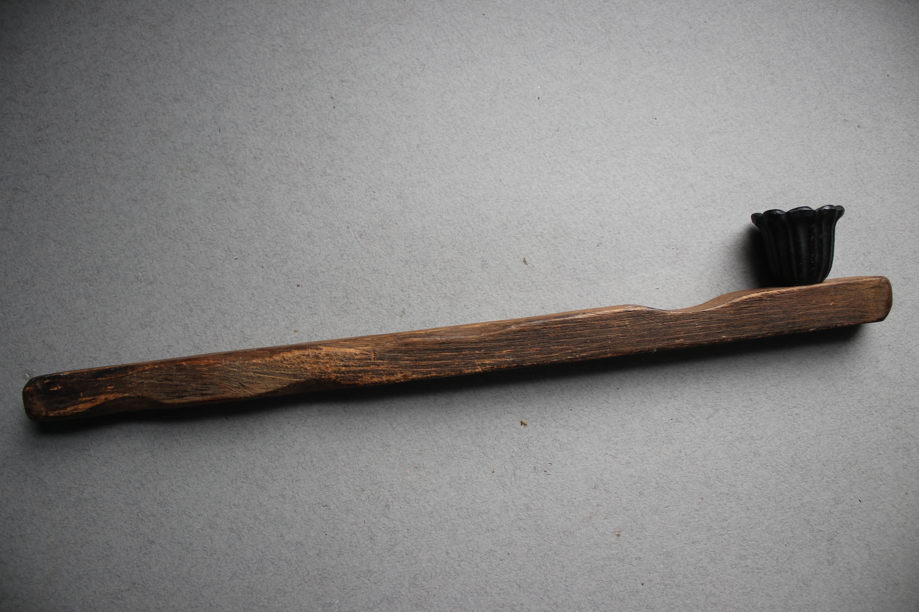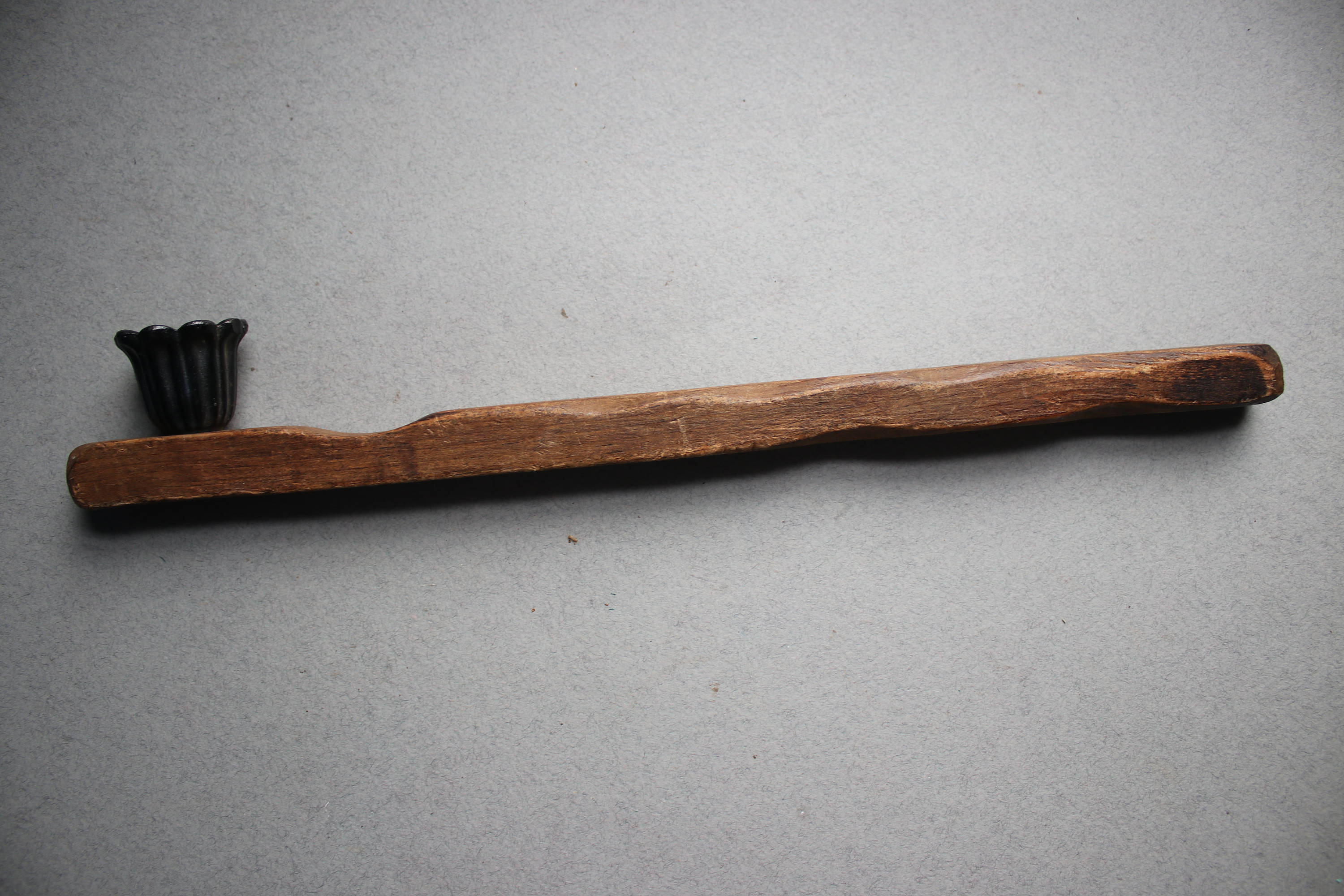 This primitive handmade candle snuffer is comprised of wood with a metal piece at the end to snuff the flame.
