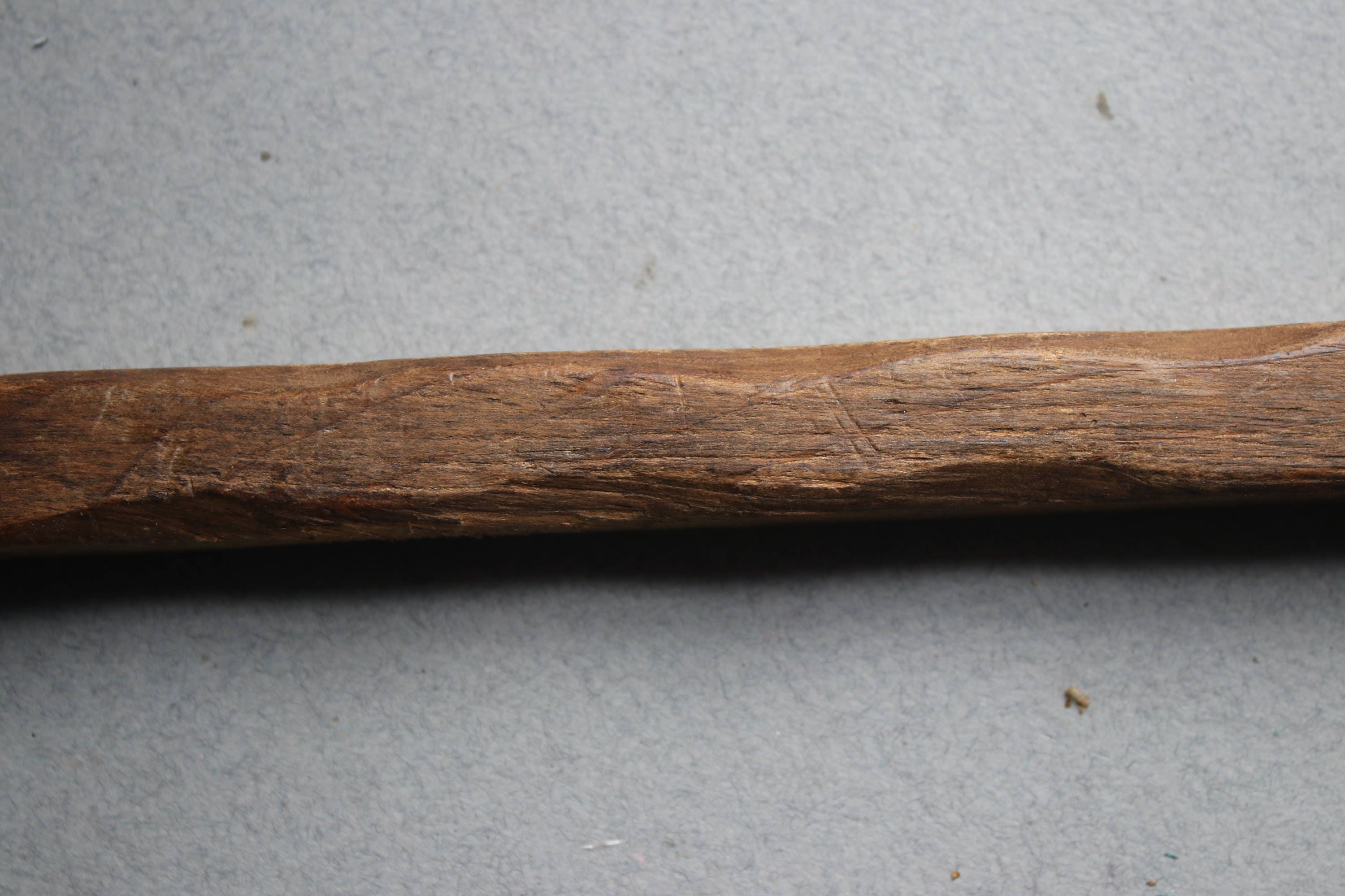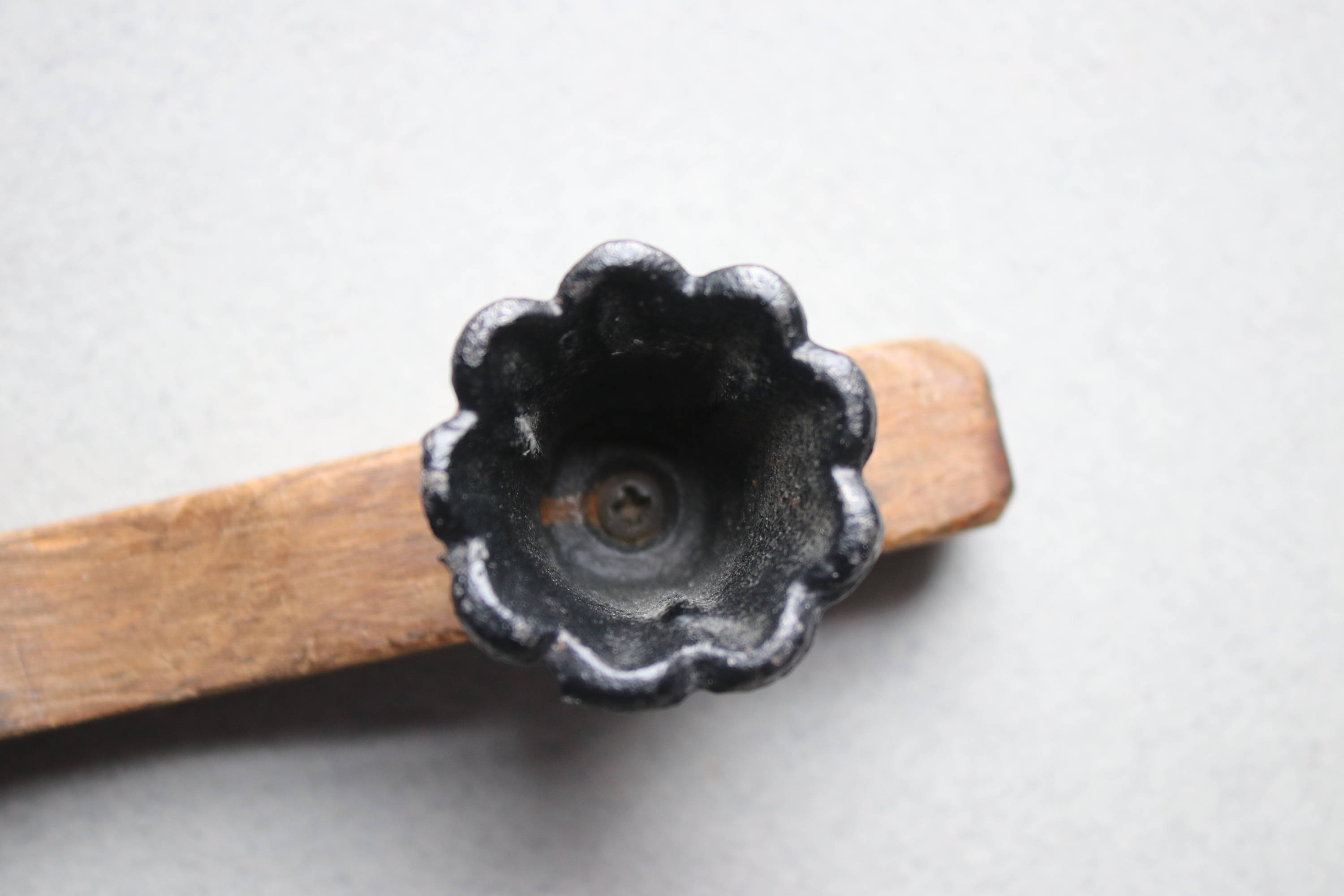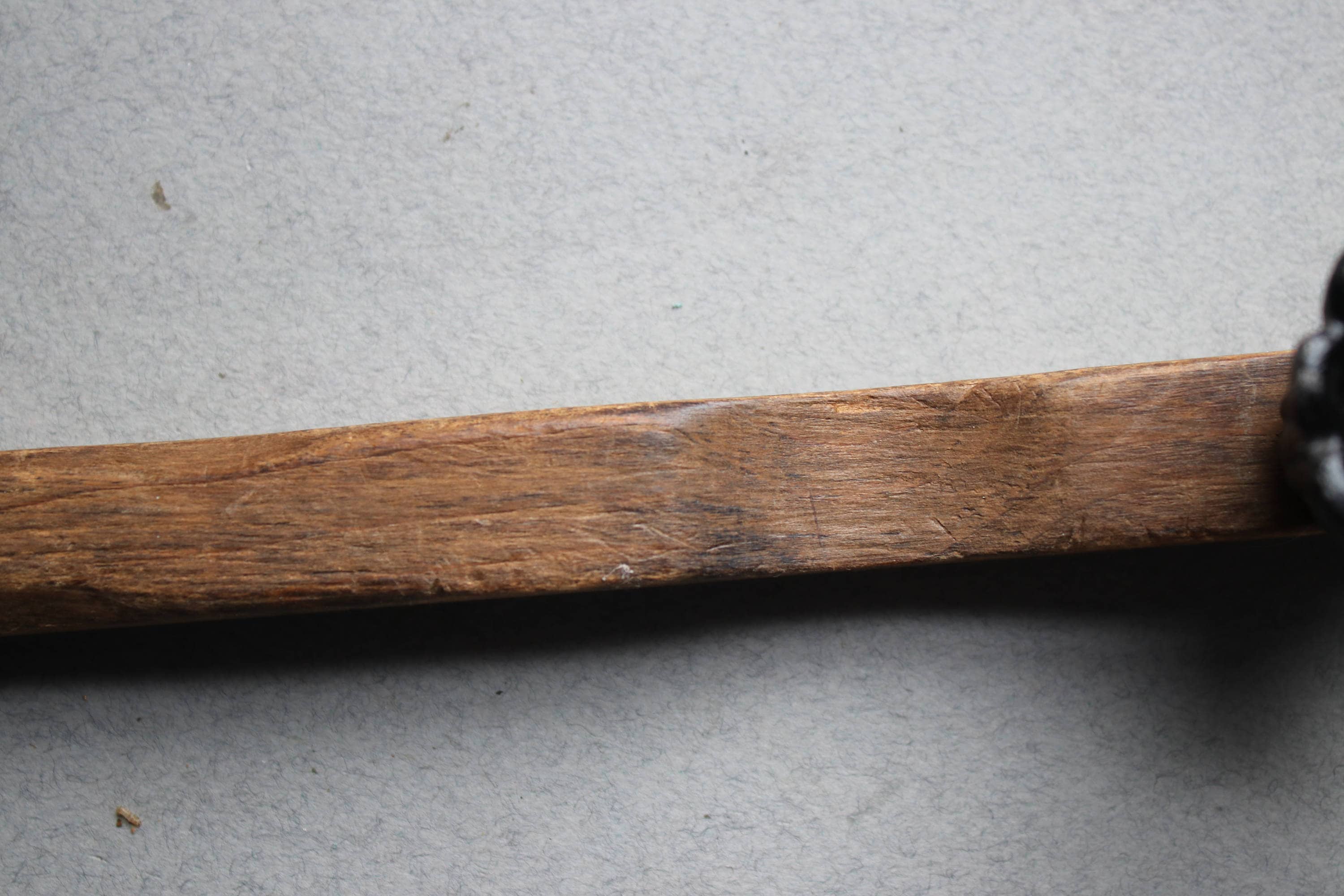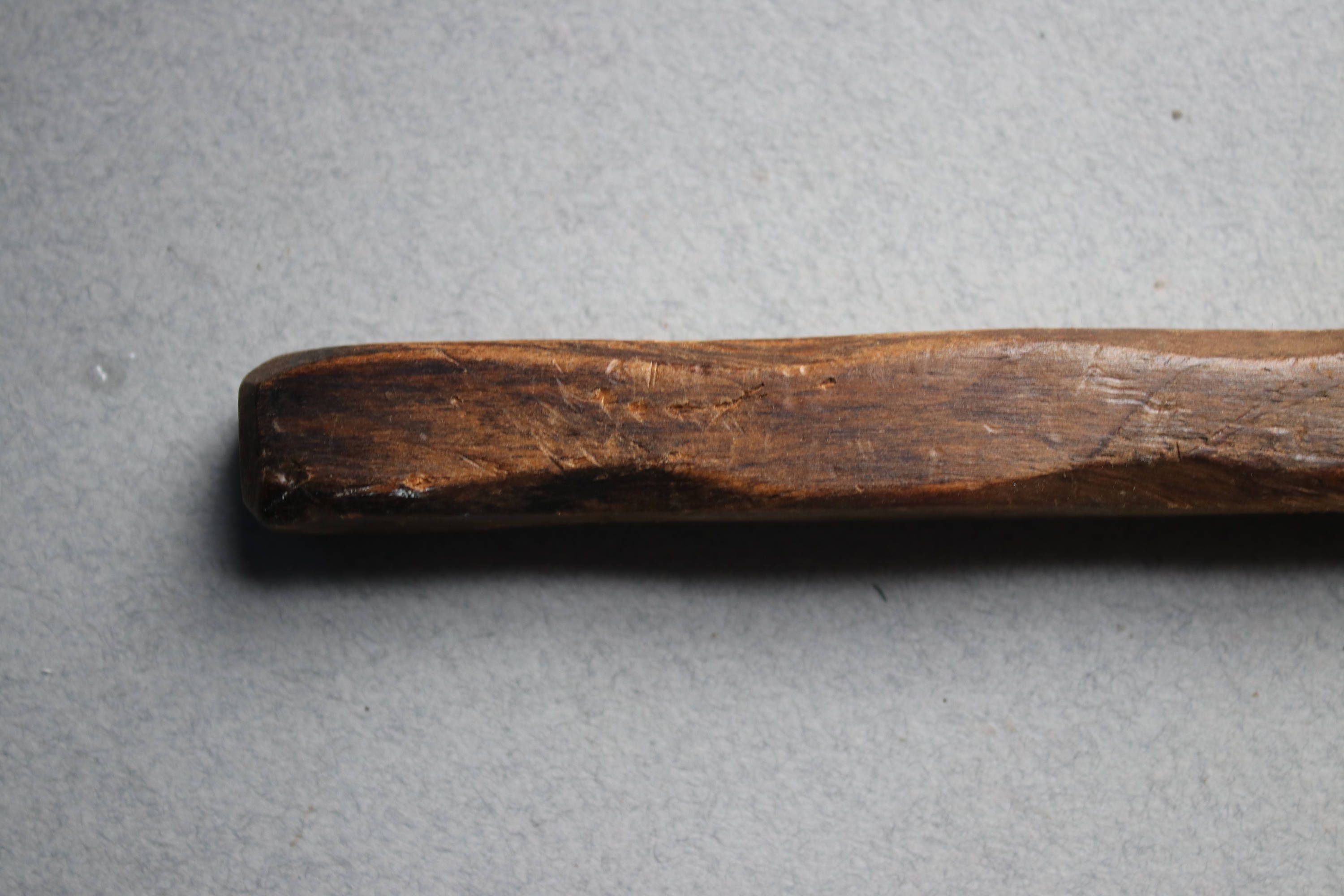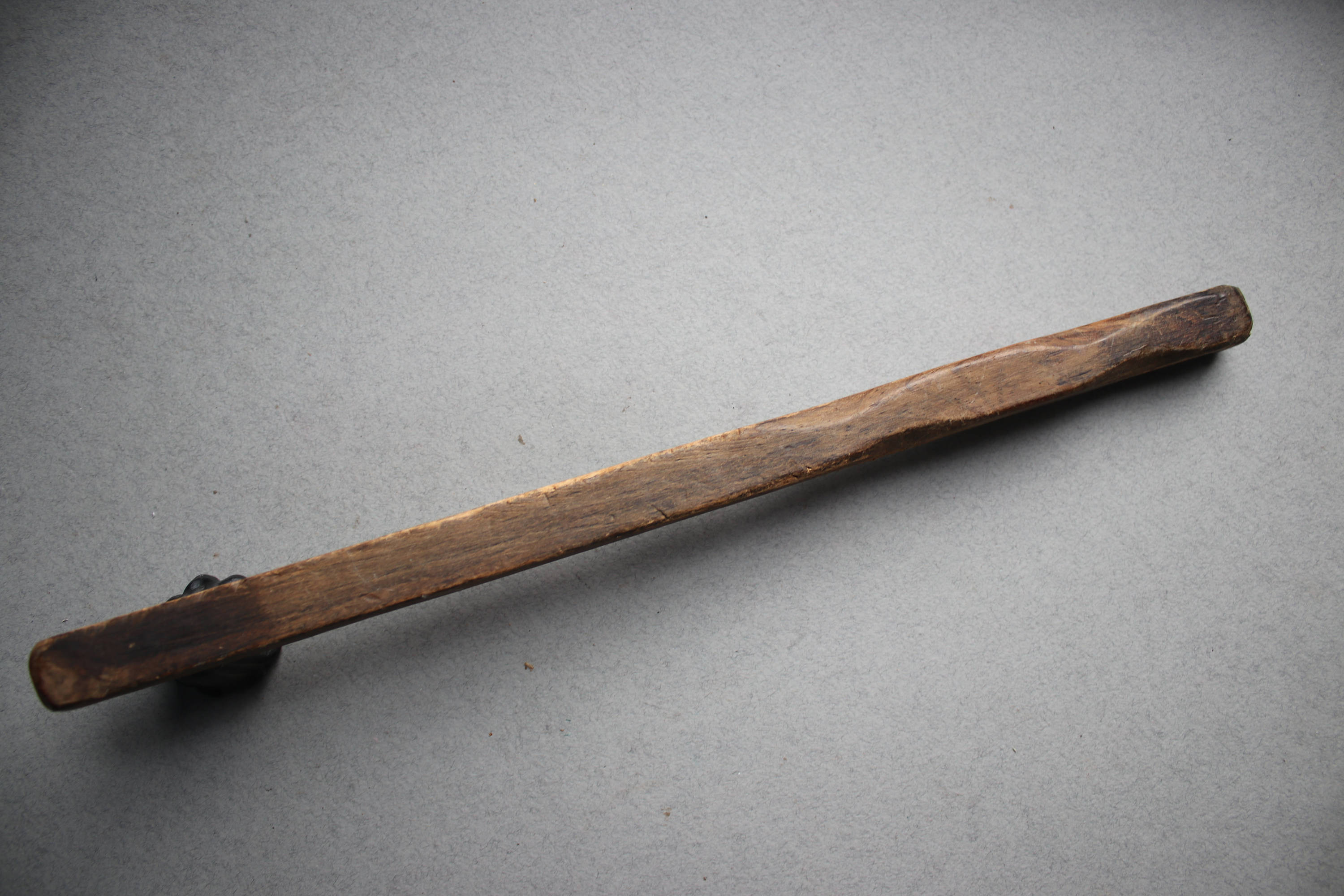 This primitive handmade candle snuffer is comprised of wood with a metal piece at the end to snuff the flame.