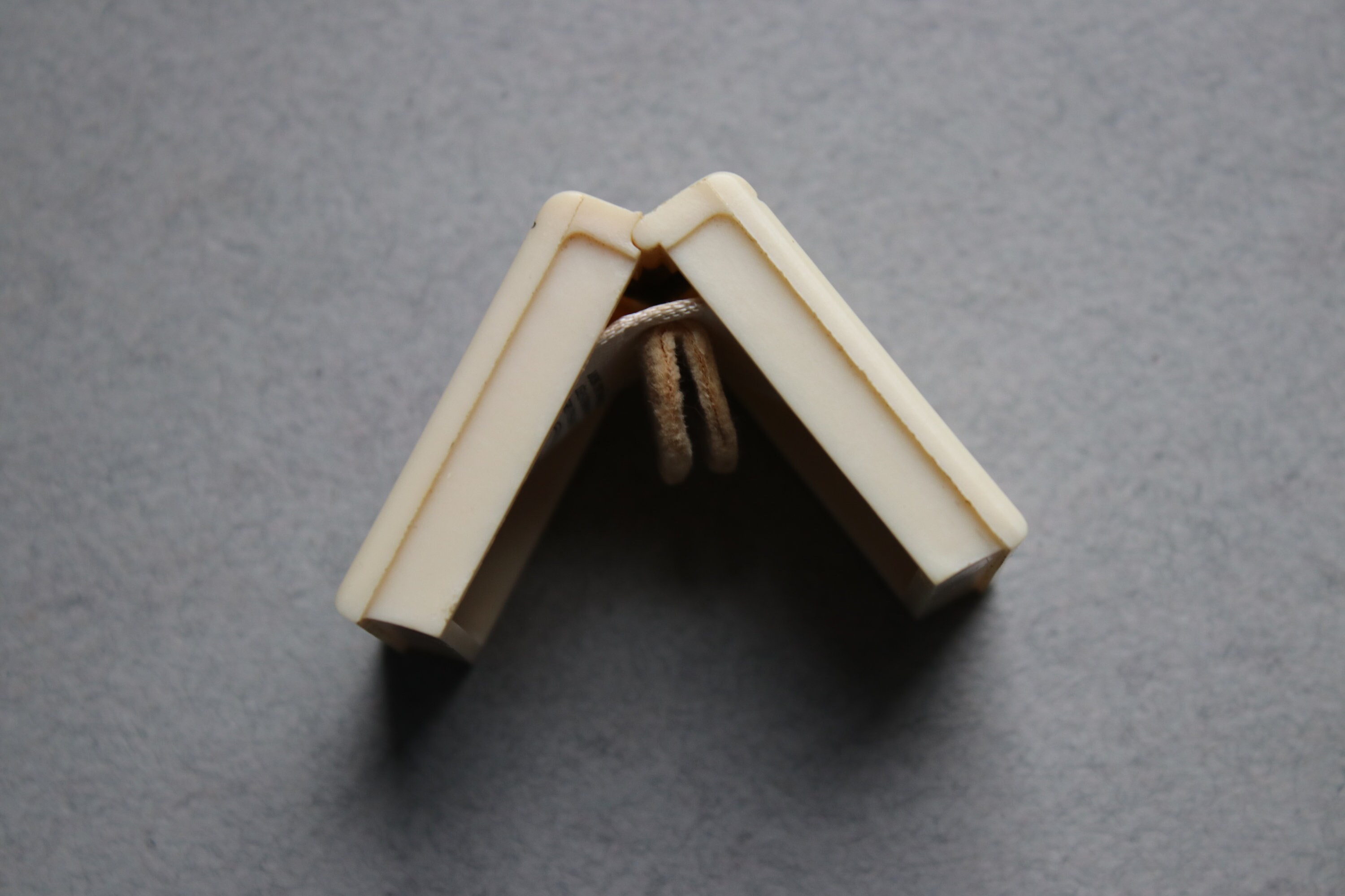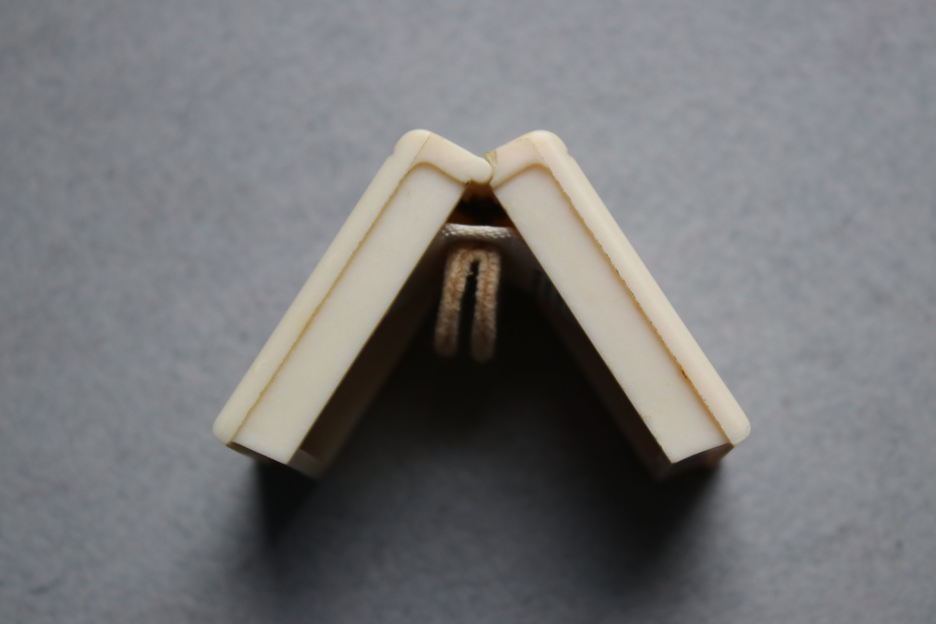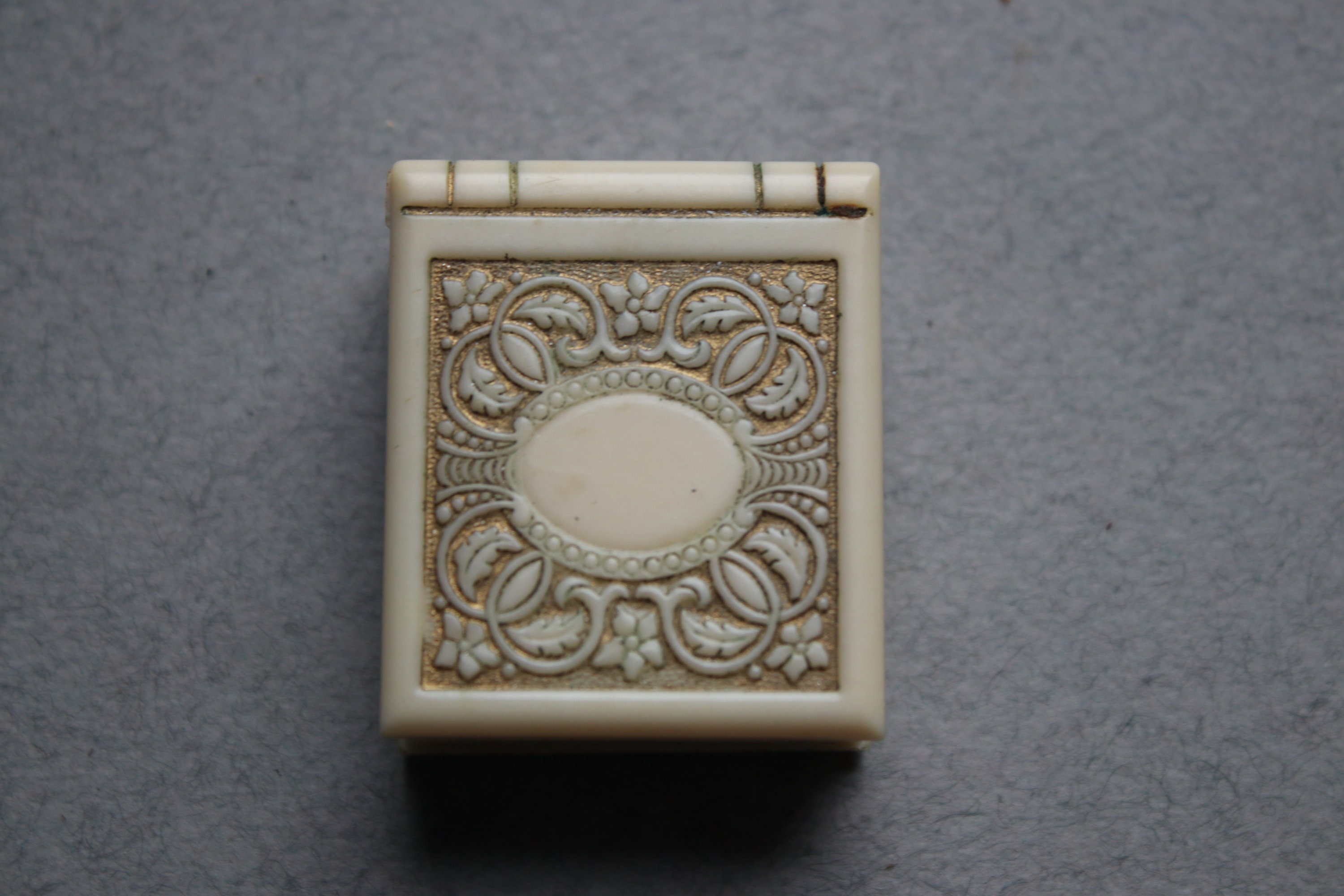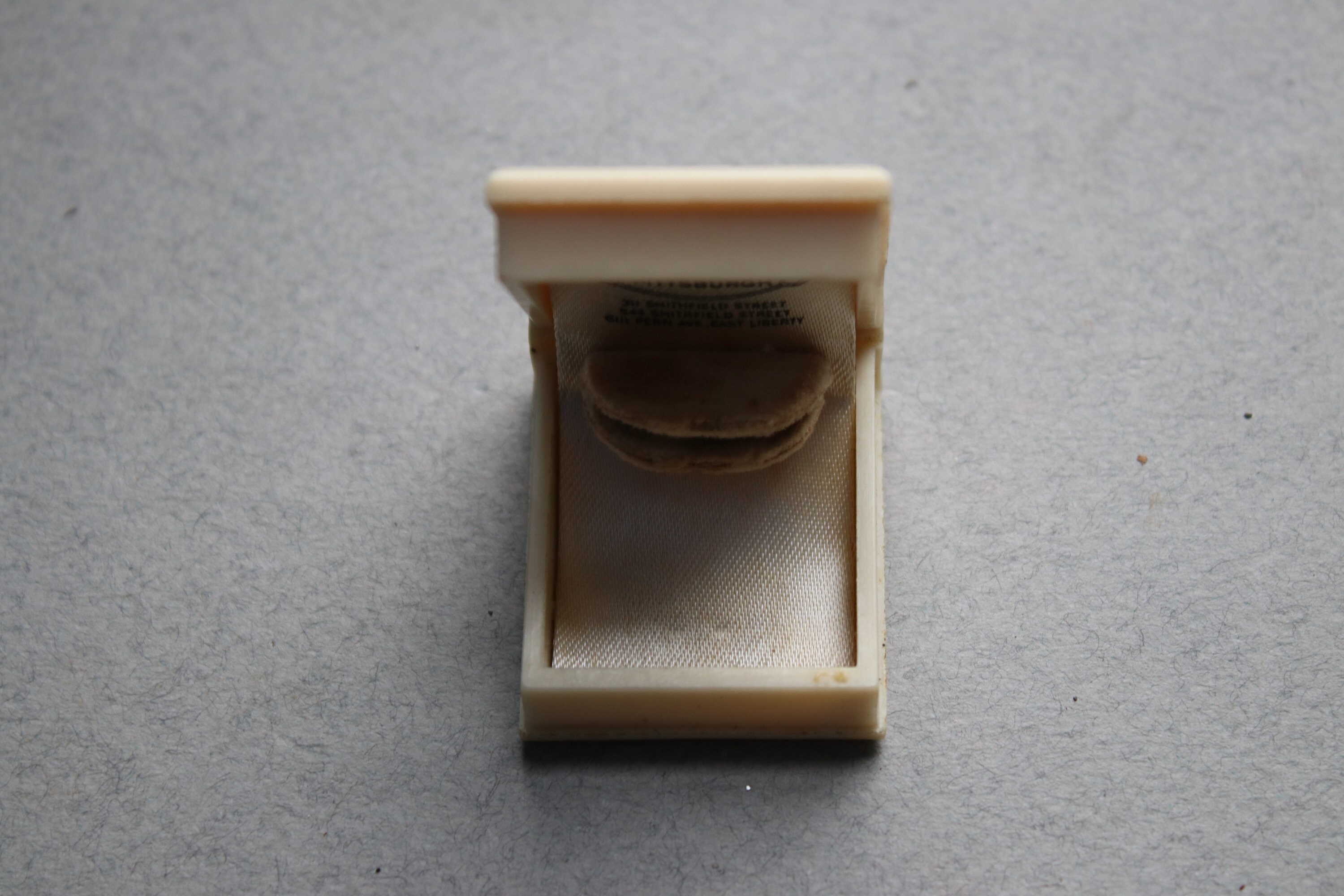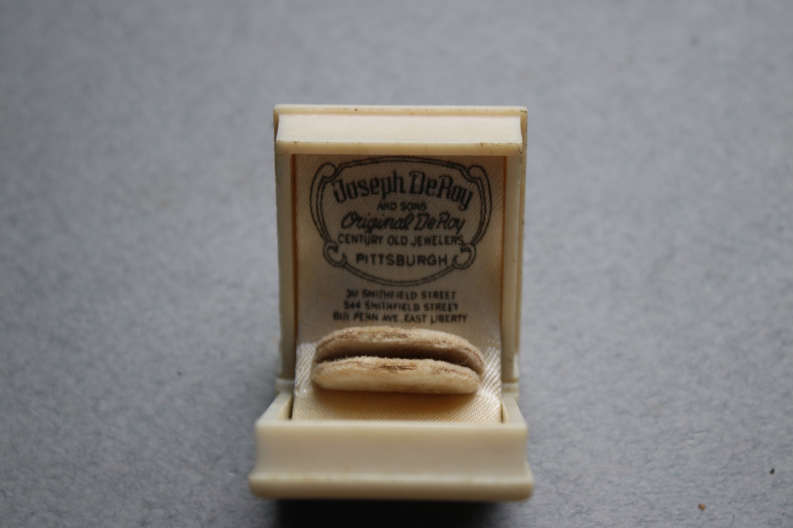 This celluloid ring box is in very good working order with a strong spring closure. Please note the greenish patina in certain places on the outside of the box. The inside is intact, but it is soiled. The jewelry stores of Joseph DeRoy and Sons were very well known and well established in late 1800s, early 1900s Pittsburgh.