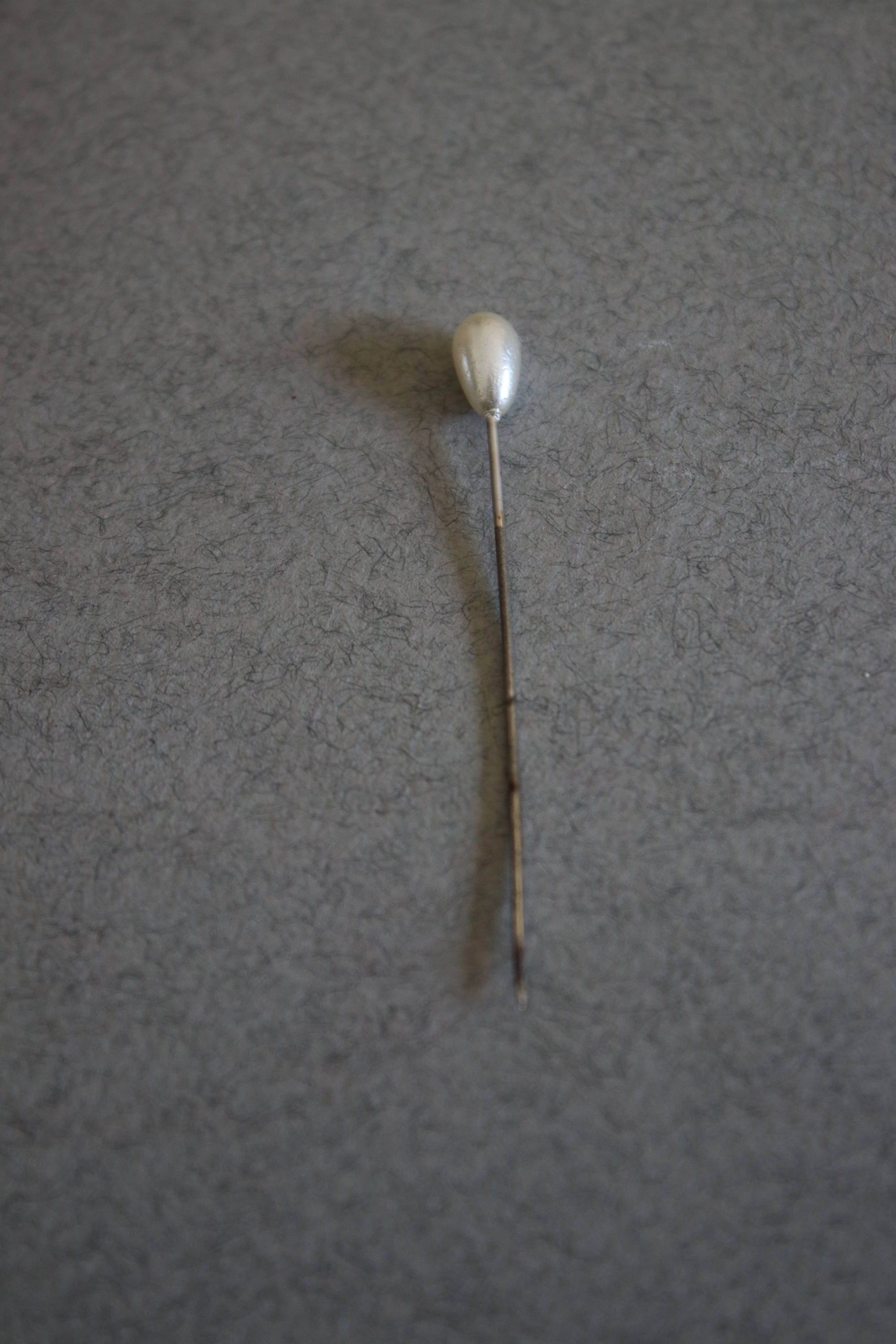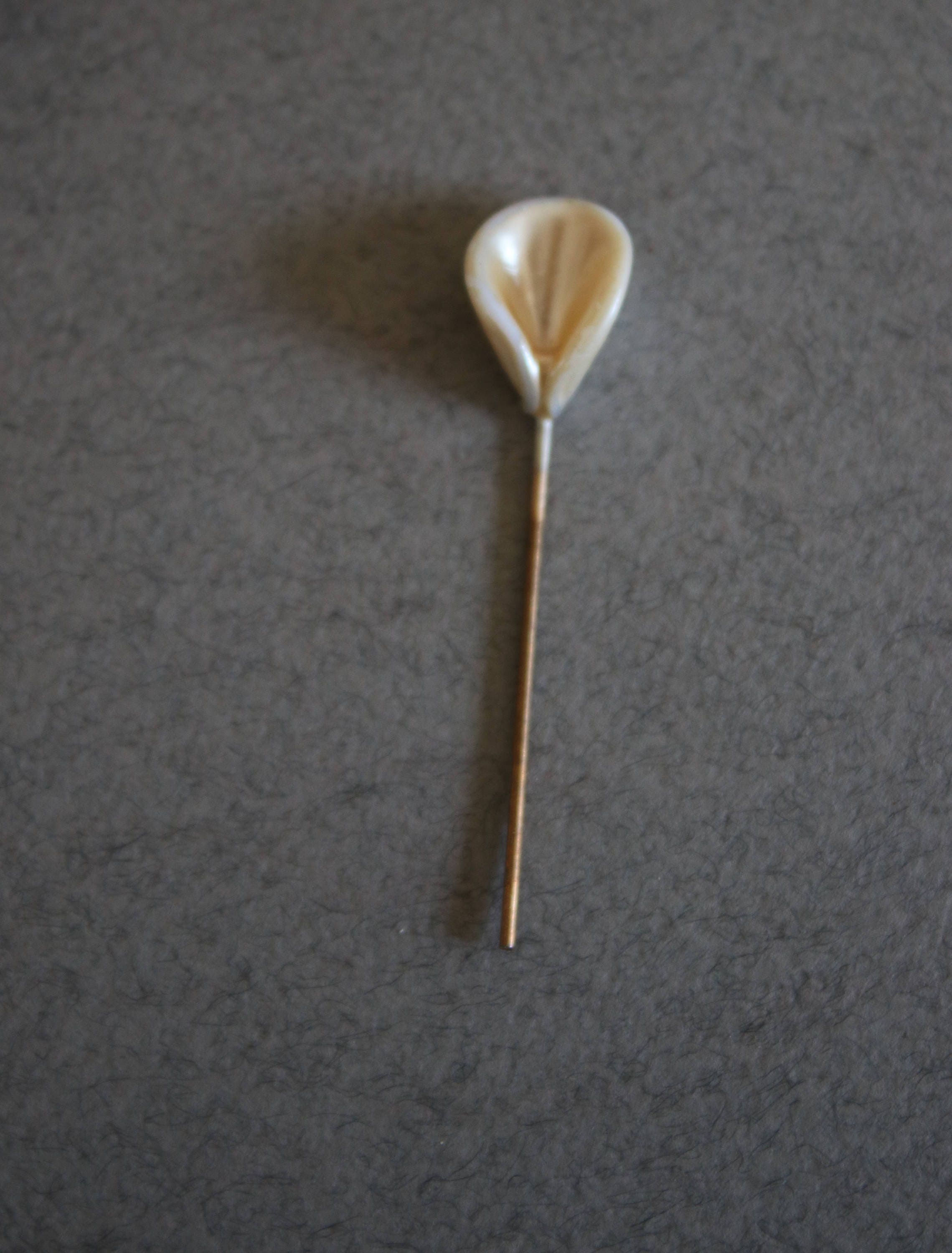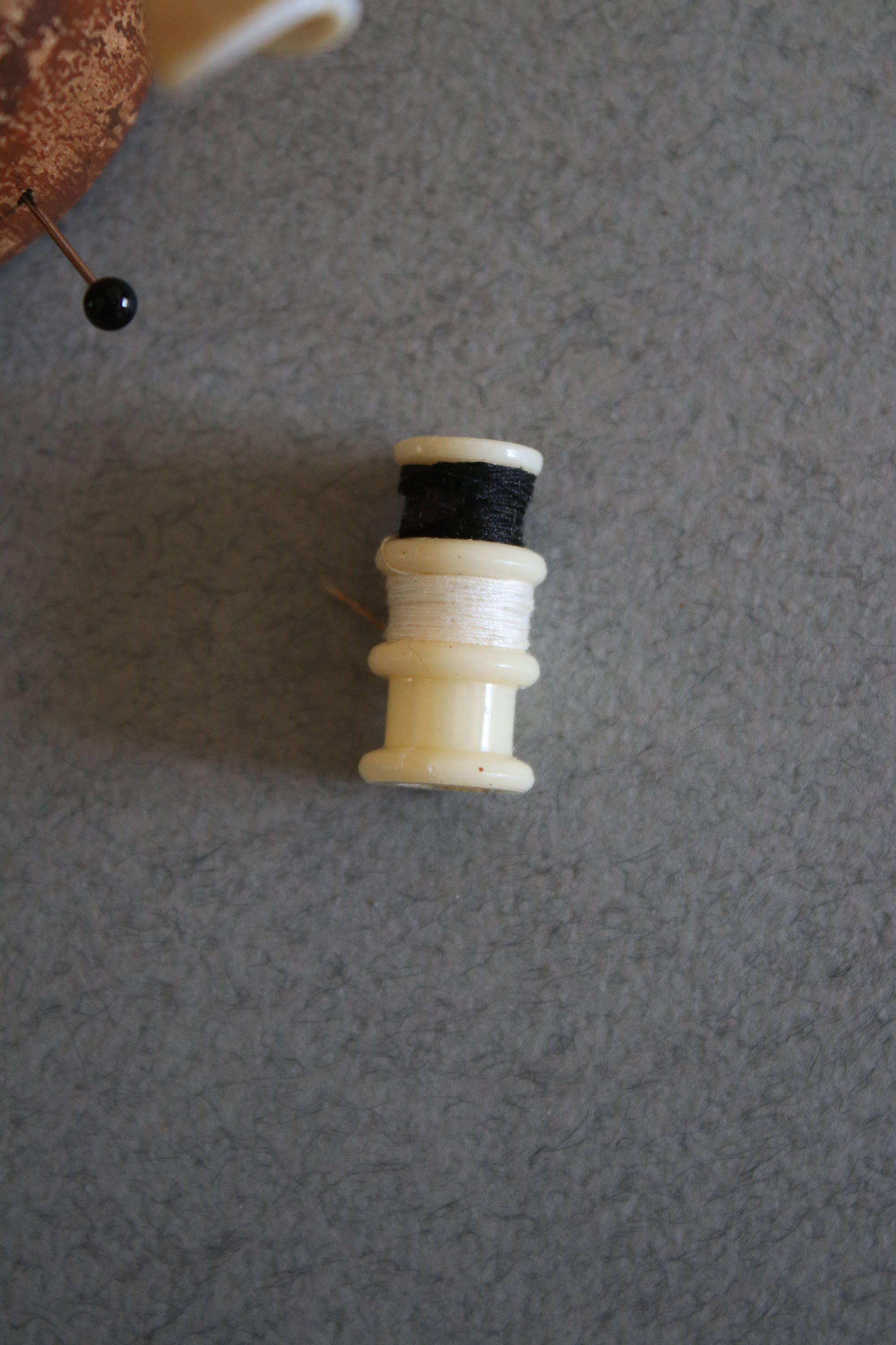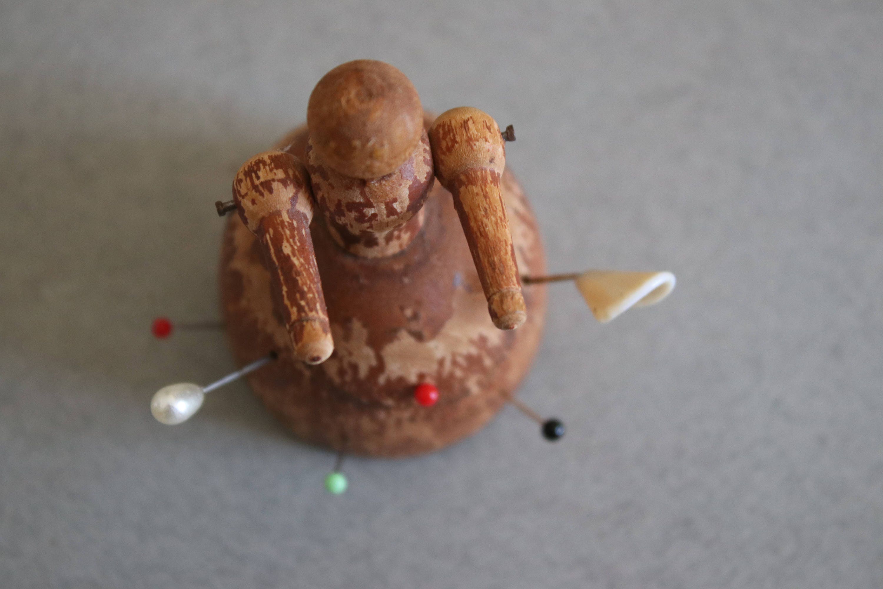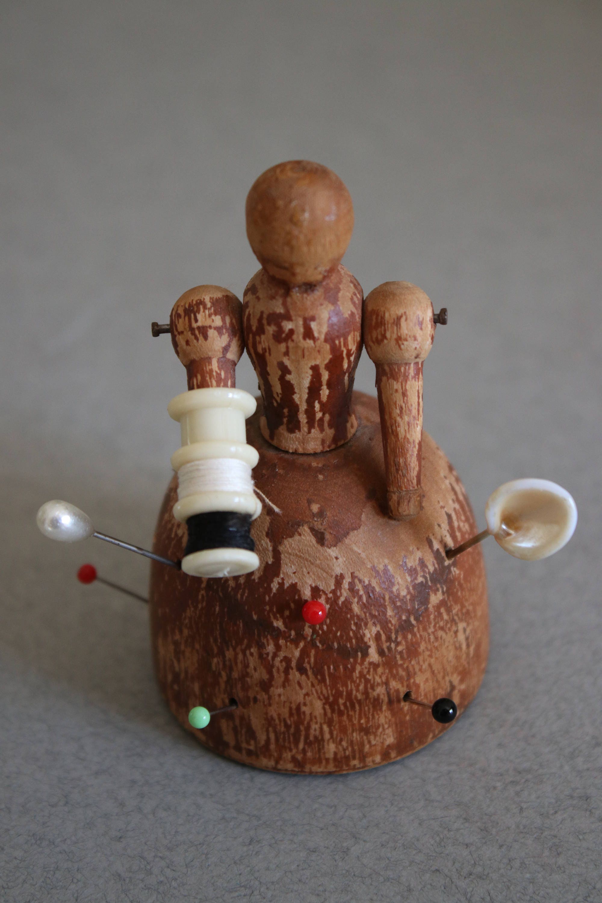 I believe this could very well be an antique. It is a wooden doll used to hold pins and tiny spools of thread. There are two pins nicer than the others, one that looks like a peace lily and another like a pearl. Although both have pearlized lusters, I do not believe they're made from sea or freshwater pearls.