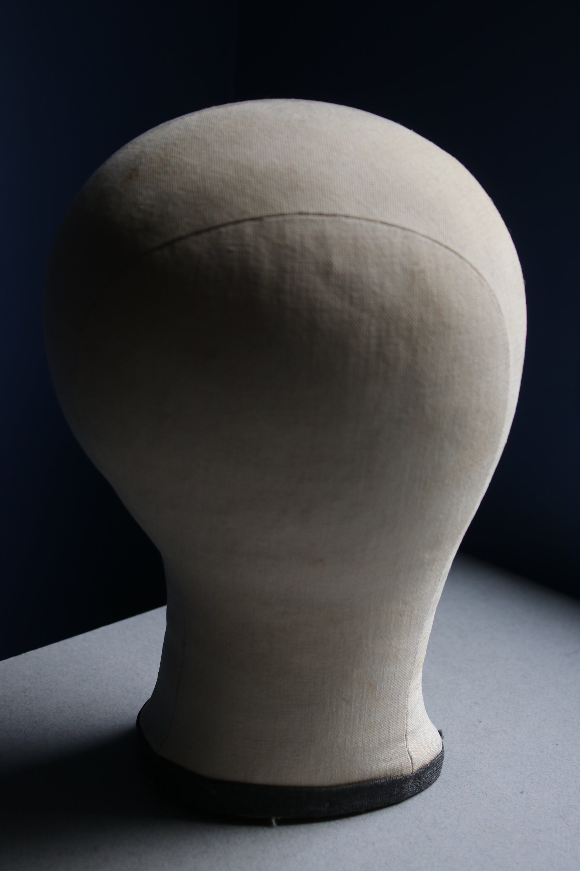This vintage millinery head is of unknown age. It is canvas covered and has a soft surface, possibly cork, through which pins can be placed. A pinned grey black trim adorns the neckline. The bottom of the form is wooden and has some damage. Please see ninth photo.