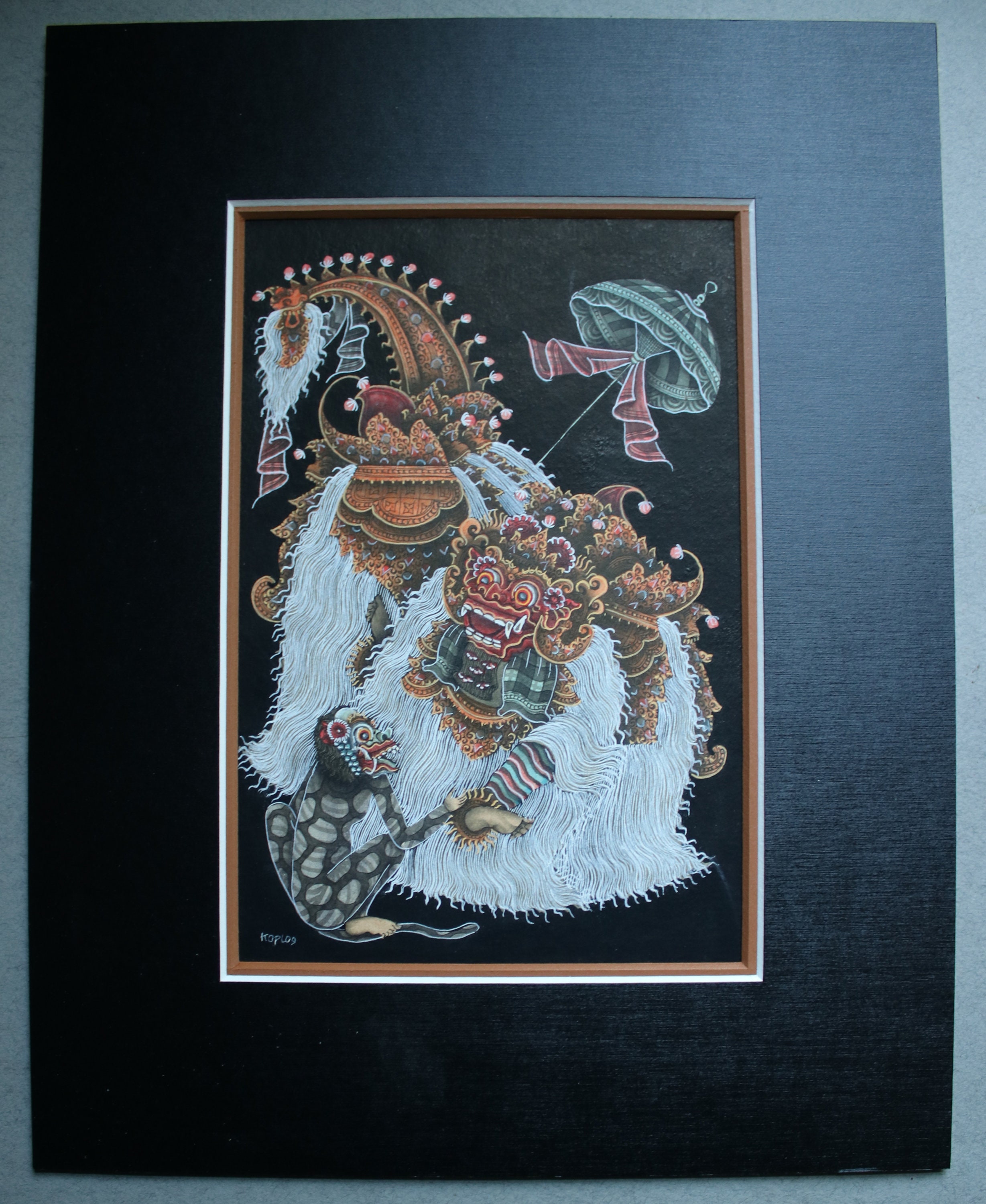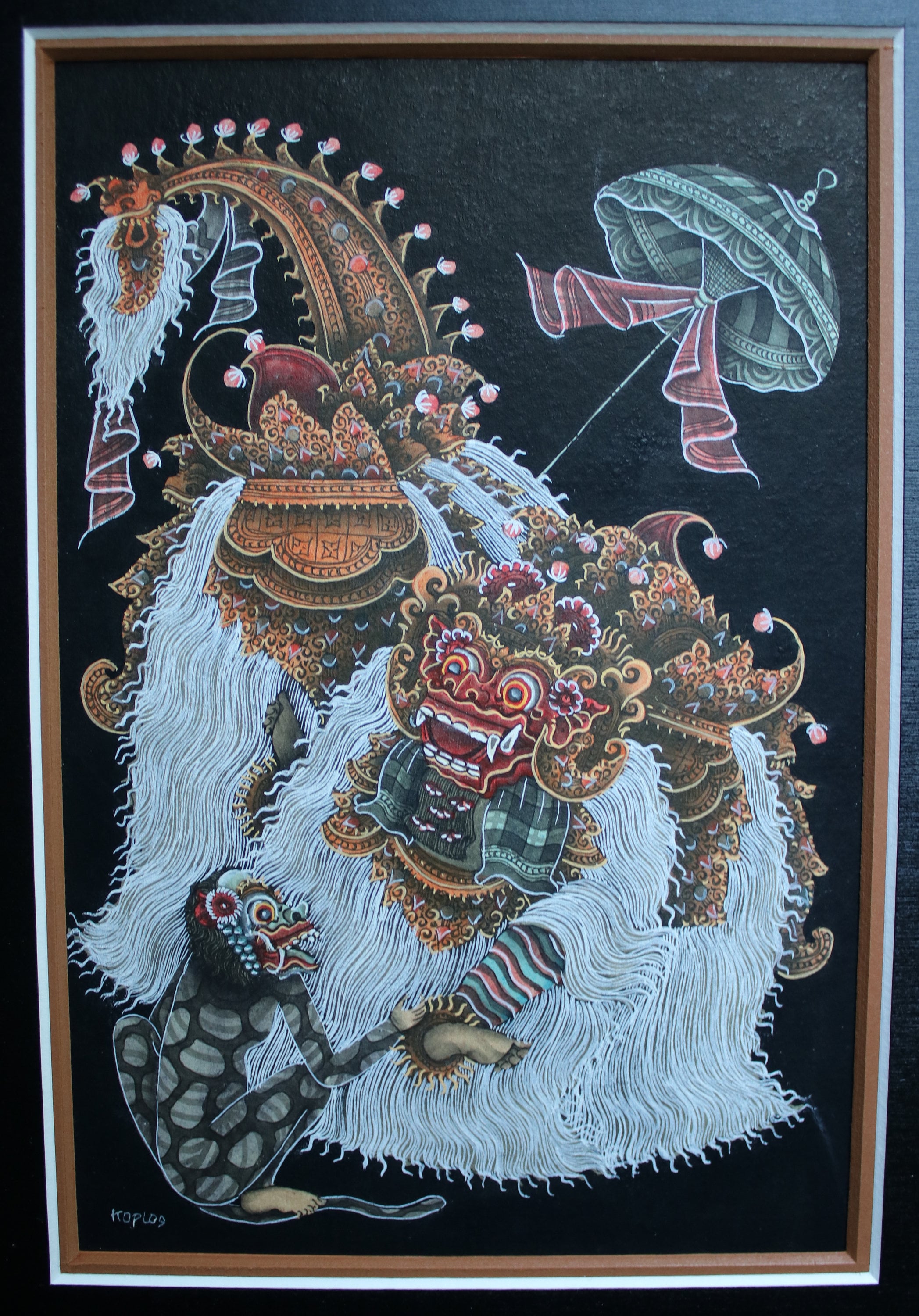 This painting depicts the Balinese Barong dance, a symbol of good vs evil with the lion depicting the forces of good. The monkey in the lower left is one of usually two accompanying the lion.